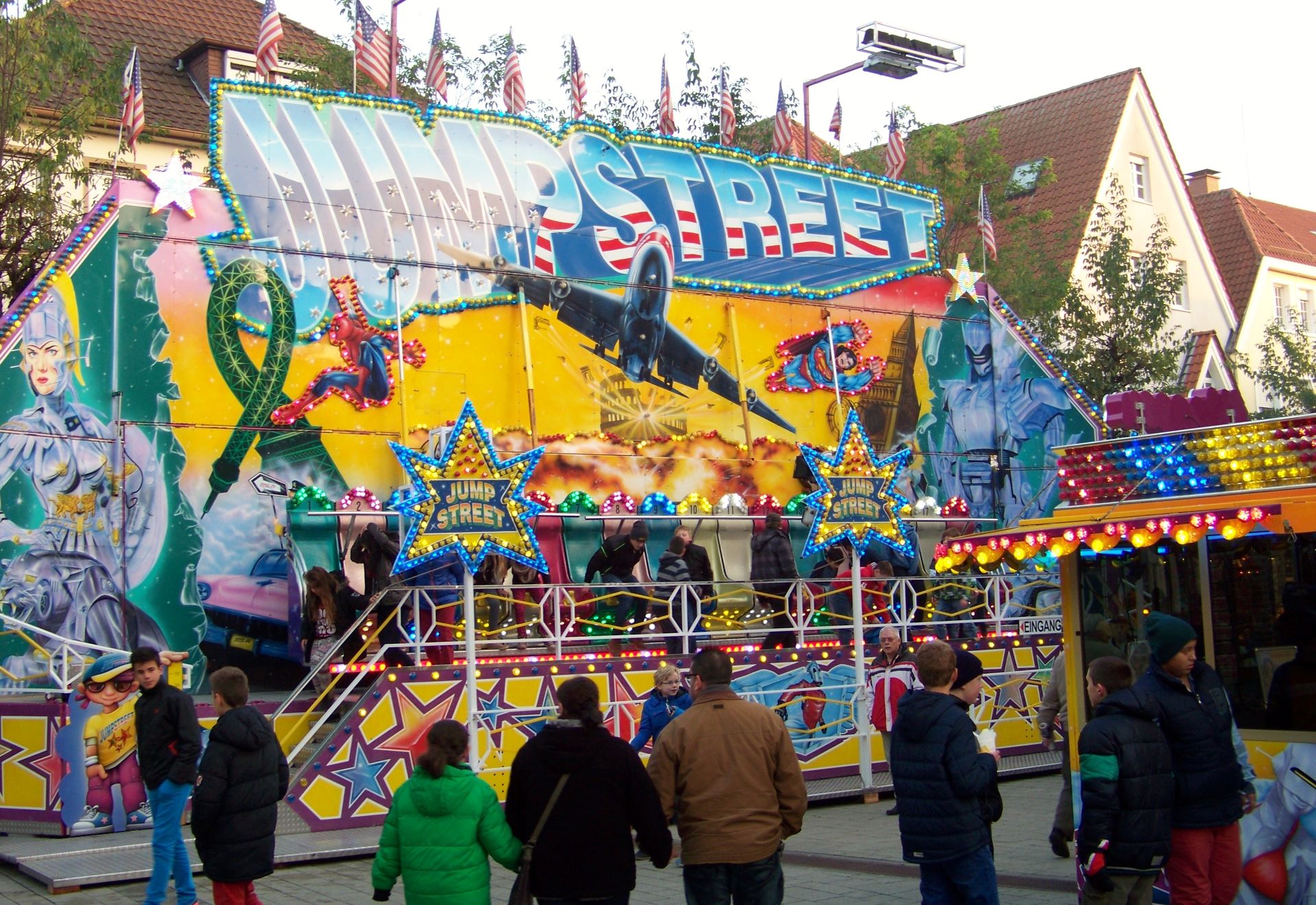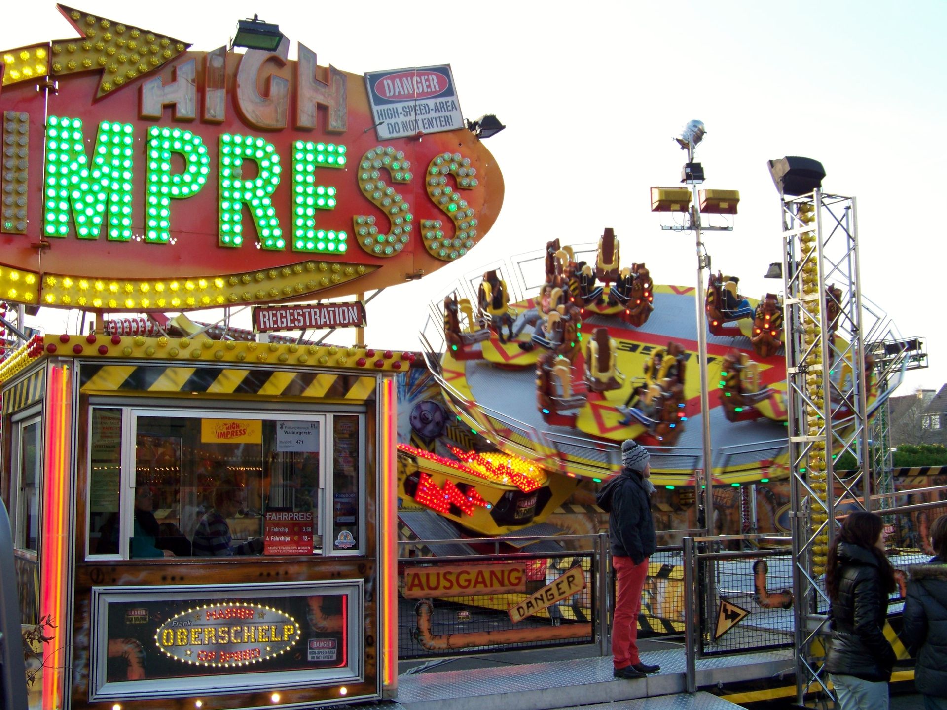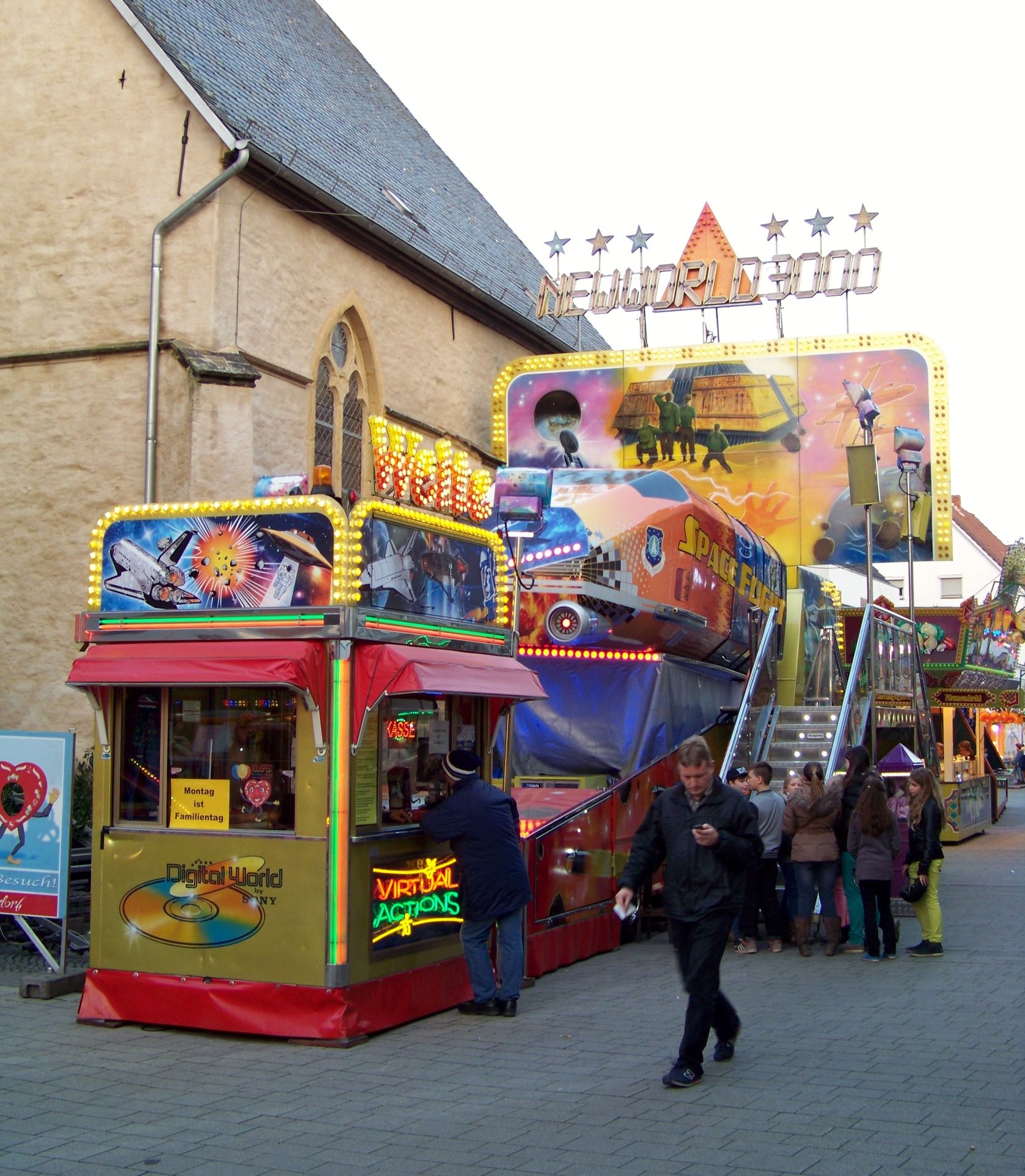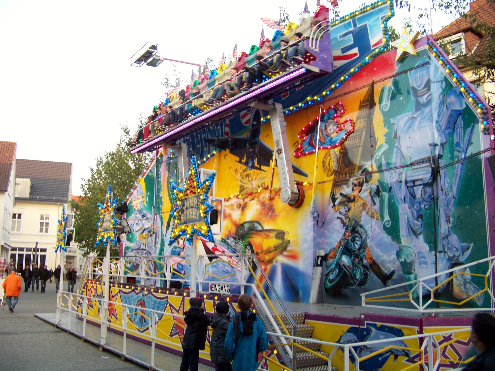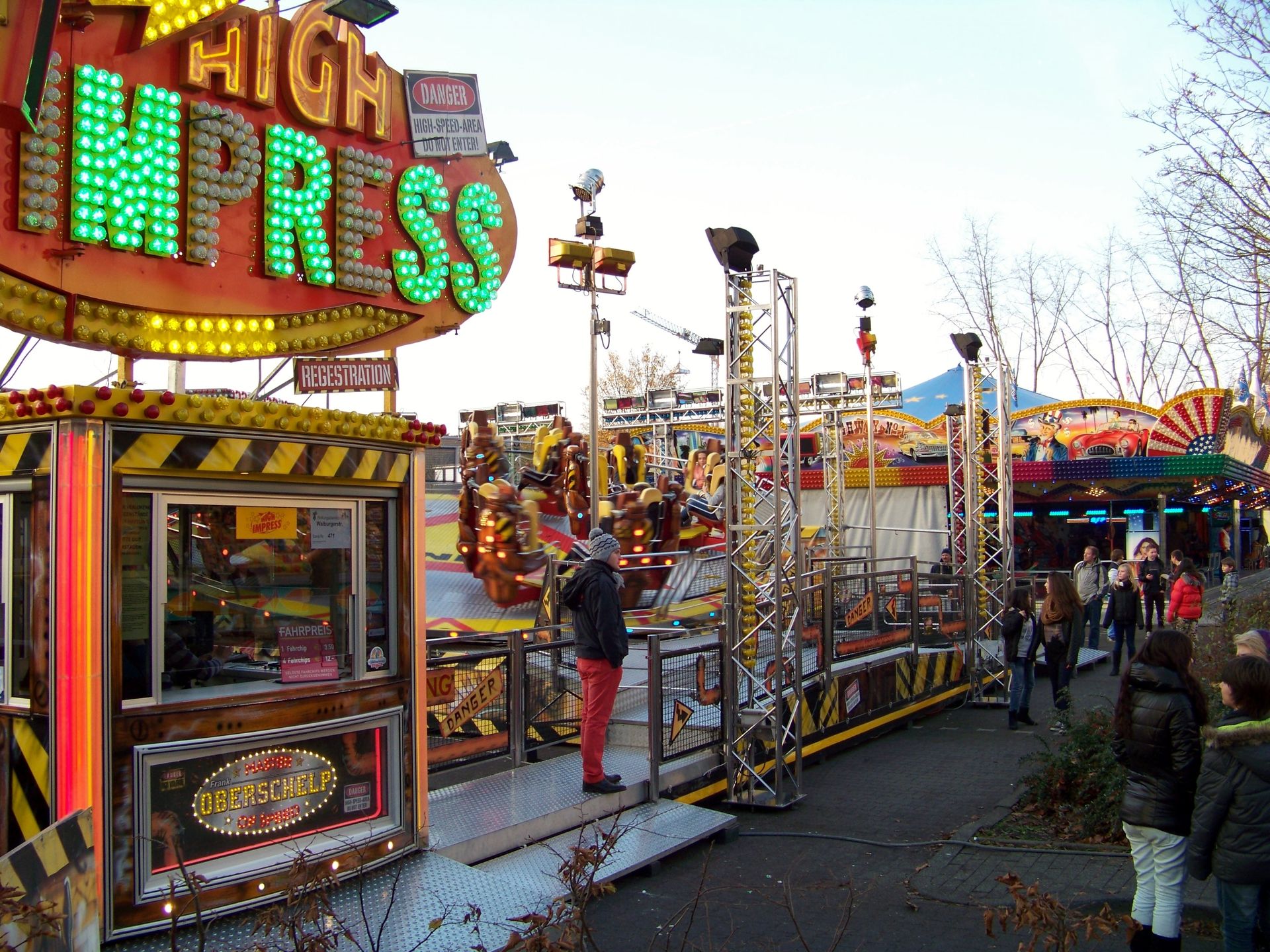 Den Anfang macht die Andreaskirmes in Rheda: Die etwas kleinere und - aufgrund der Jahreszeit - kühlere Kirmes in der Doppelstadt. Wie auch der Herbstmarkt in Wiedenbrück ist die Andreaskirmes eine Innenstadtkirmes, die leider in Sachen Kulisse und Flair nicht mit der Veranstaltung im anderen Stadtteil mithalten kann. Auch in Sachen Beschickung fällt Rheda gegenüber Wiedenbrück immer ein wenig ab, was auch daran liegt, dass einer der Festplätze mittlerweile nur noch für einen kleinen Krammarkt und nicht mehr für große Kirmesattraktionen genutzt wird. Auch sonst ist die Besetzung mit Fahrgeschäften doch sehr durch die Stammbeschicker Jumpstreet, Autoscooter, New World 3000, Star Club und Montgolfiere (die im Vorjahr aussetzte) geprägt, die auch in (fast) jedem Jahr die gleichen Plätze einnehmen. Übrig bleiben nur noch jeweils ein Wechselplatz für ein Fahrgeschäft, den bei der aktuellen Ausgabe High Impress einnahm, und einen für ein Laufgeschäft, der in diesem Jahr durch eine kurzfristige Absage nur noch mit einem Trampolin besetzt werden konnte. Sehr schade für die an sich ganz nette Veranstaltung, die dadurch in diesem Jahr verhältnismäßig schwach besetzt war.