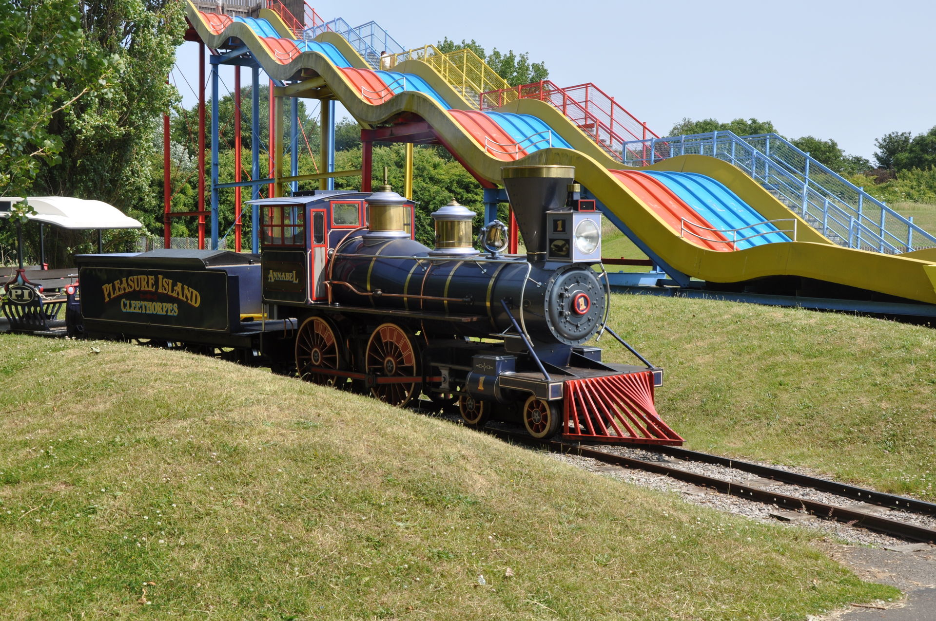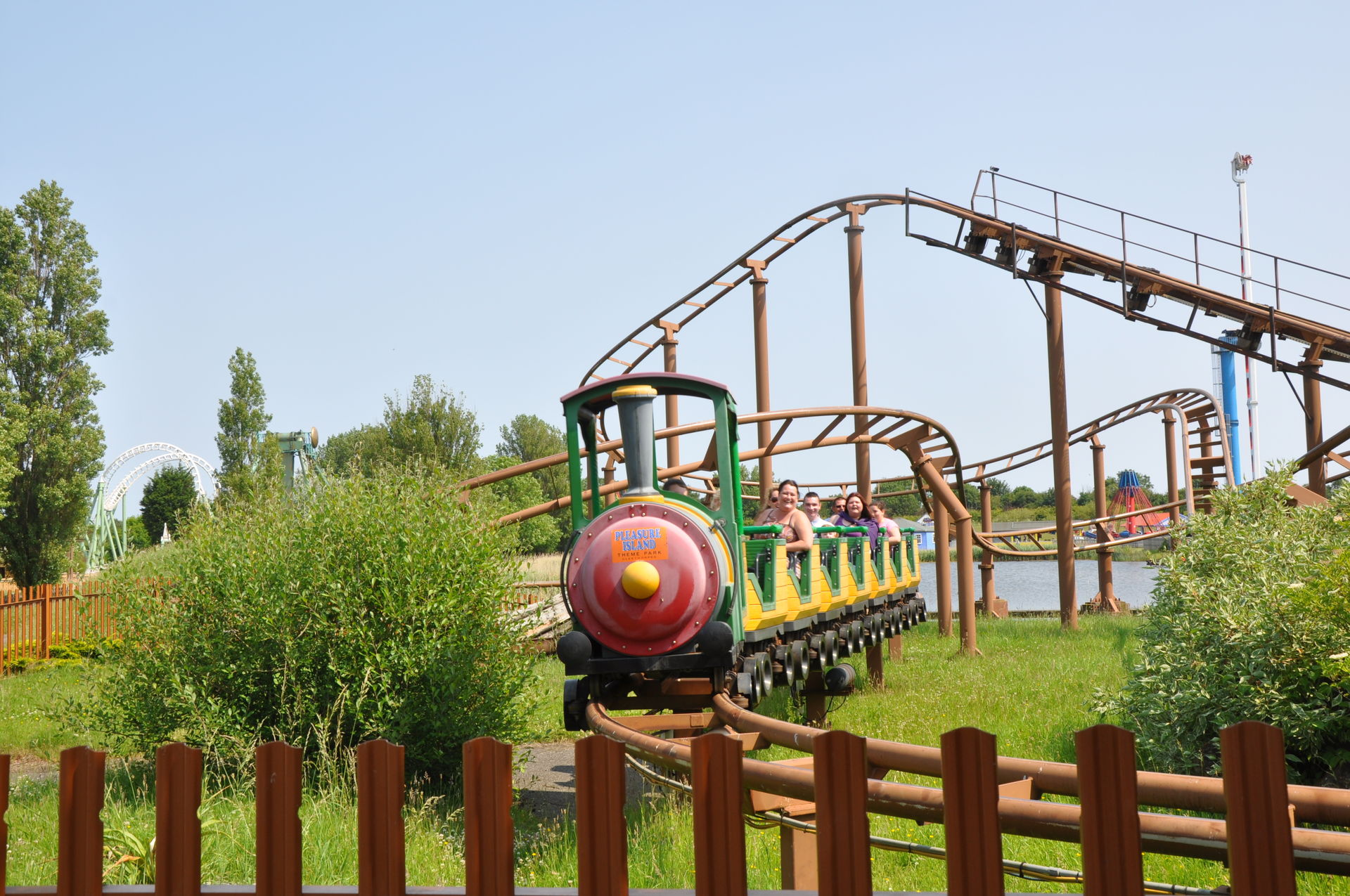 Den Weg vom Hotel zu unserem ersten Ziel Pleasure Island Family Theme Park kannten wir ja noch von gestern Abend. Während der Eingangsbereich und der darauf folgende Bereich noch ganz gut thematisiert sind, stehen die weiteren Attraktionen einfach nur noch auf der Wiese. Fangen wir den Parkbericht mal mit den Coastern an. Der Mini Mine Train von