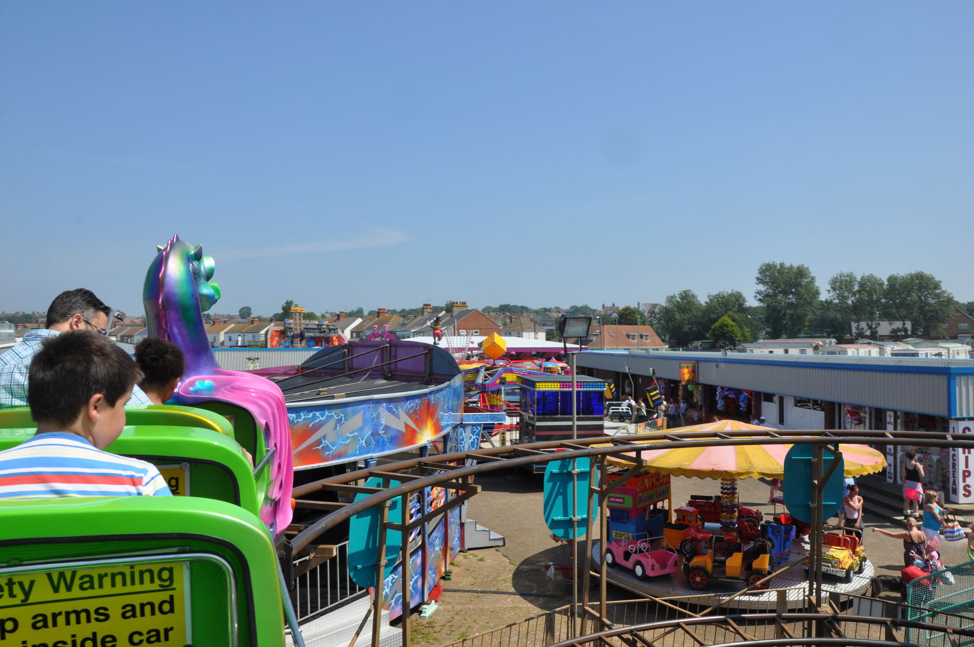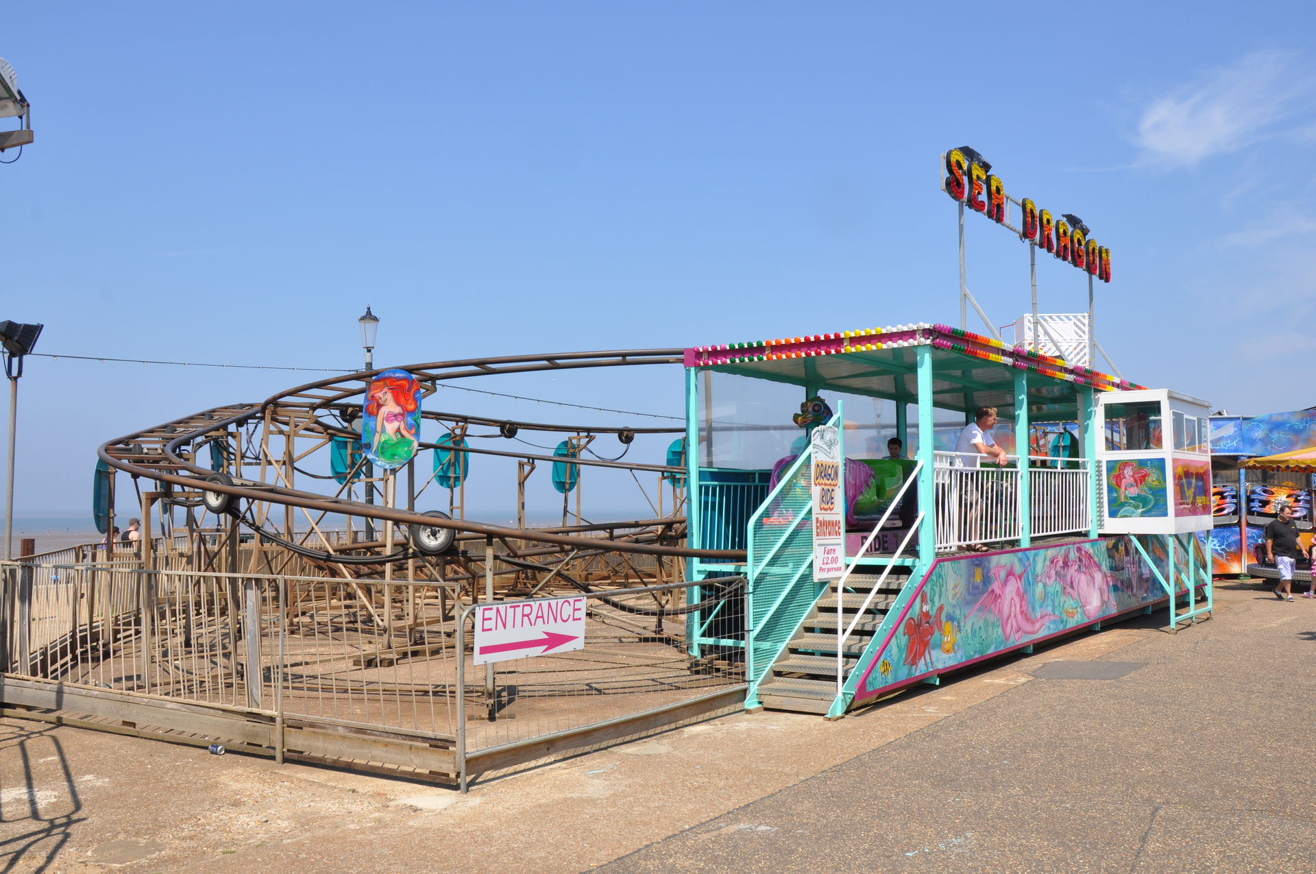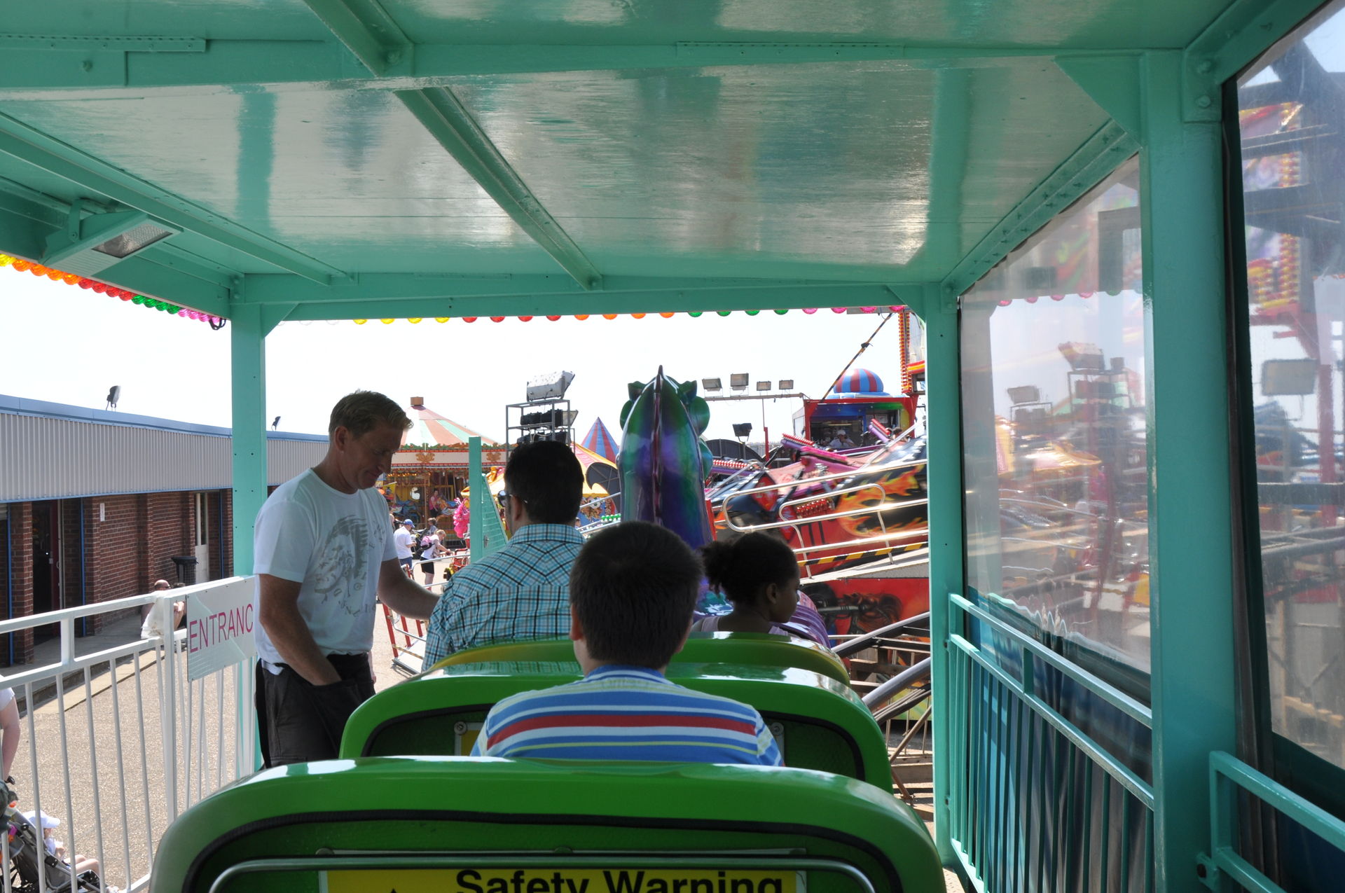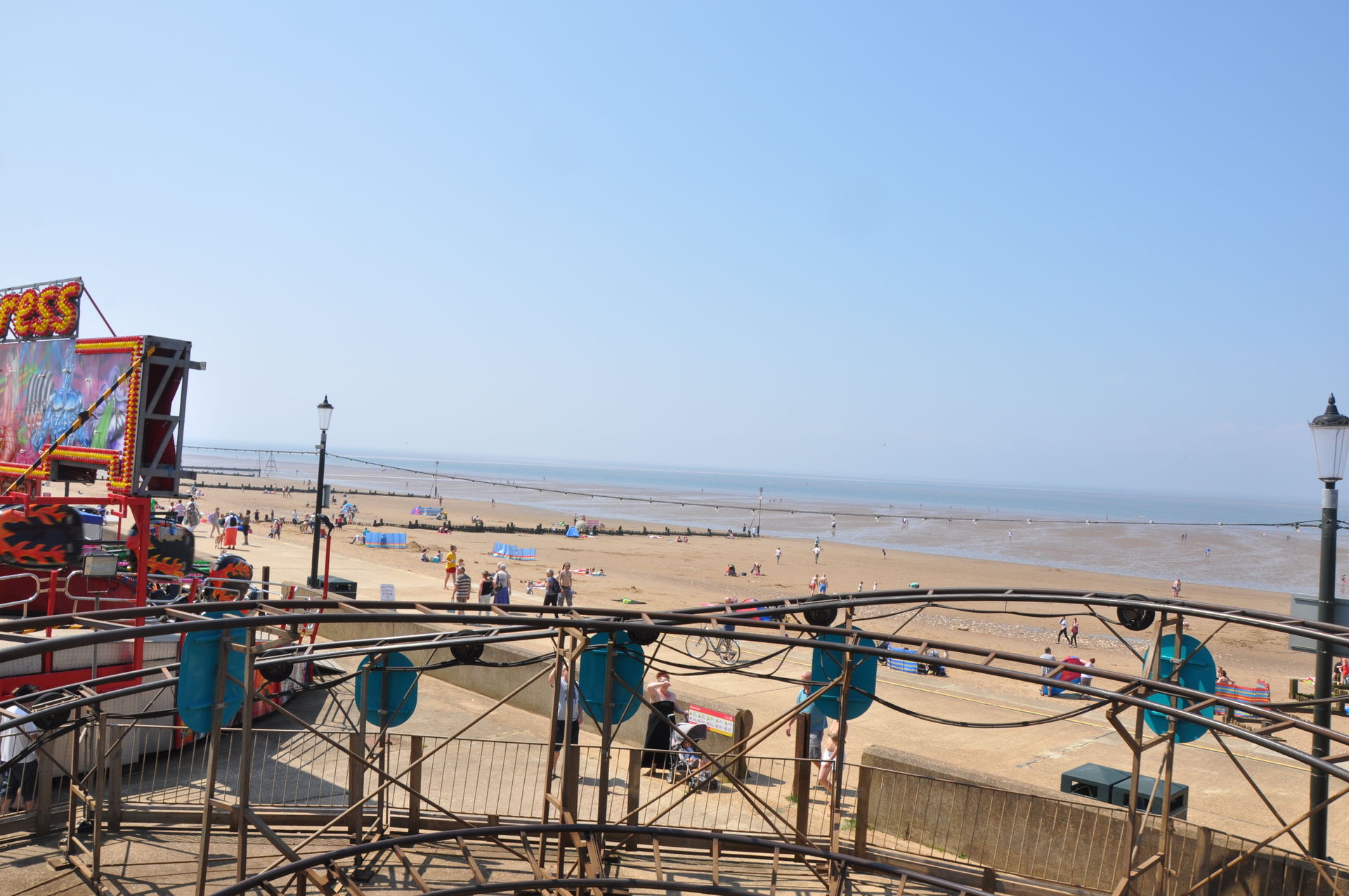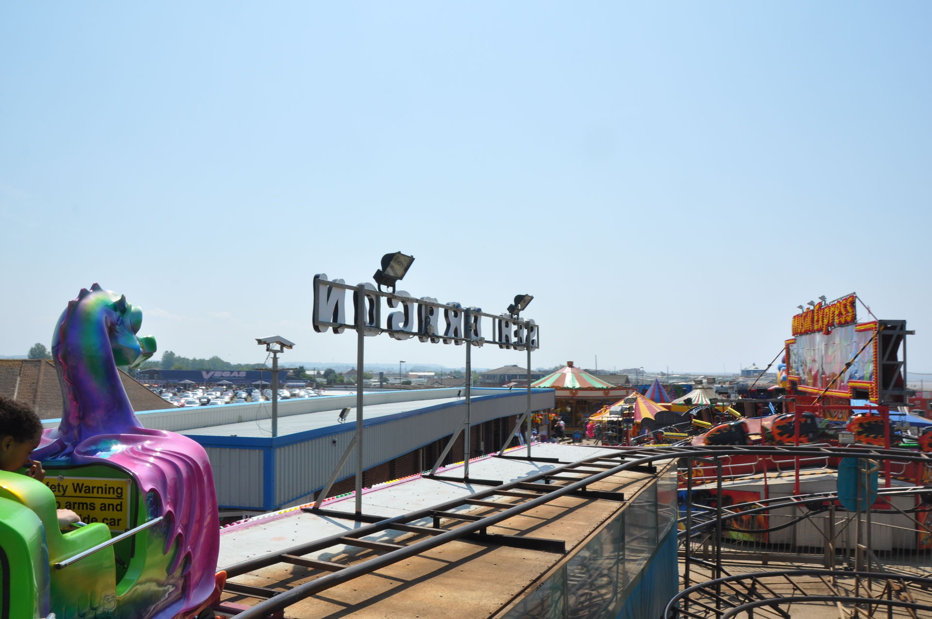 Der Himmel versprach an diesem Sonntag wieder einen sonnigen Tag. Heute ging es als erstes in den Rainbow Park in Hunstanton. Einem kleinen Küstenort in Norfolk. Diese Idee hatten aber nicht nur wir. So haben wir in diversen Staus ca. 50 Minuten verloren. Zum Glück gab es aber direkt am Park noch freie Parkplätze. Nur die Warteschlangen an den Parkautomaten waren genau so lang wie die auf der Straße. Der Park ist sehr übersichtlich und der Coaster sah nach einem typischen Kiddycoaster mit den typischen Fahreigenschaften aus. Aber weit gefehlt, das Teil lief butterweich. Natürlich sind die vier verrückten Deutschen auf dem Kiddy mit dem Besitzer ins Gespräch gekommen. Der erzählte mit Stolz, dass er den Coaster immer gut pflege und auf die Fahreigenschaften besonders achte. Der Mann leistet dort wirklich sehr gute Arbeit. Hier ein paar Bilder von seinem Schmuckstück.