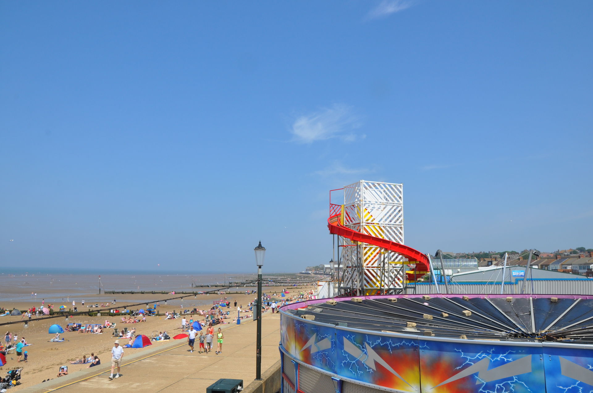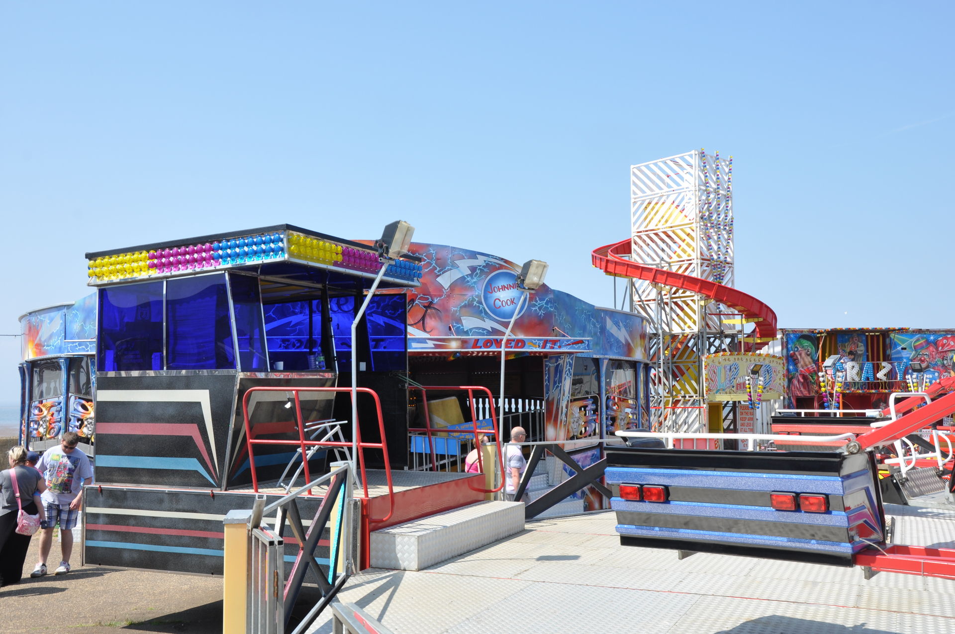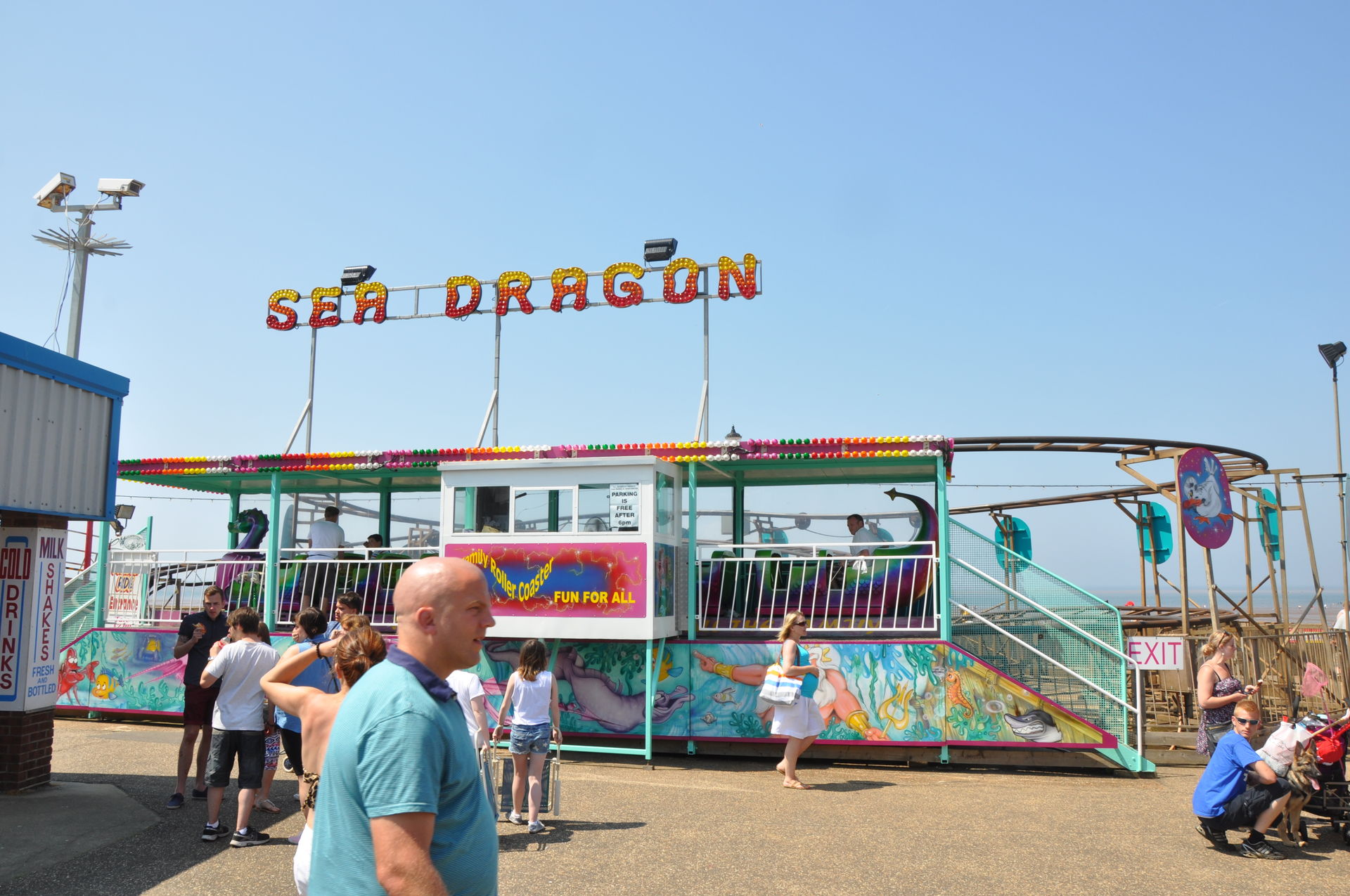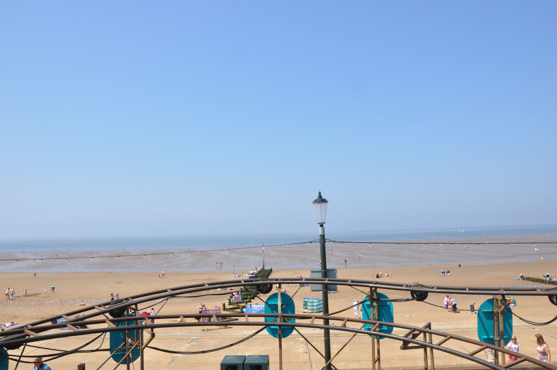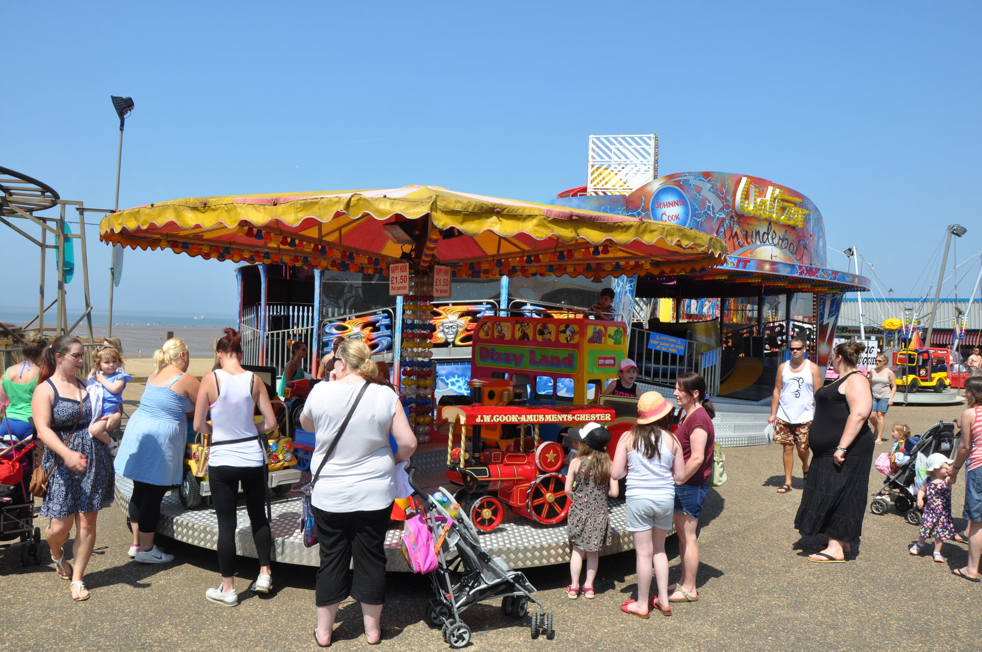 Der Himmel versprach an diesem Sonntag wieder einen sonnigen Tag. Heute ging es als erstes in den Rainbow Park in Hunstanton. Einem kleinen Küstenort in Norfolk. Diese Idee hatten aber nicht nur wir. So haben wir in diversen Staus ca. 50 Minuten verloren. Zum Glück gab es aber direkt am Park noch freie Parkplätze. Nur die Warteschlangen an den Parkautomaten waren genau so lang wie die auf der Straße. Der Park ist sehr übersichtlich und der Coaster sah nach einem typischen Kiddycoaster mit den typischen Fahreigenschaften aus. Aber weit gefehlt, das Teil lief butterweich. Natürlich sind die vier verrückten Deutschen auf dem Kiddy mit dem Besitzer ins Gespräch gekommen. Der erzählte mit Stolz, dass er den Coaster immer gut pflege und auf die Fahreigenschaften besonders achte. Der Mann leistet dort wirklich sehr gute Arbeit. Hier ein paar Bilder von seinem Schmuckstück.