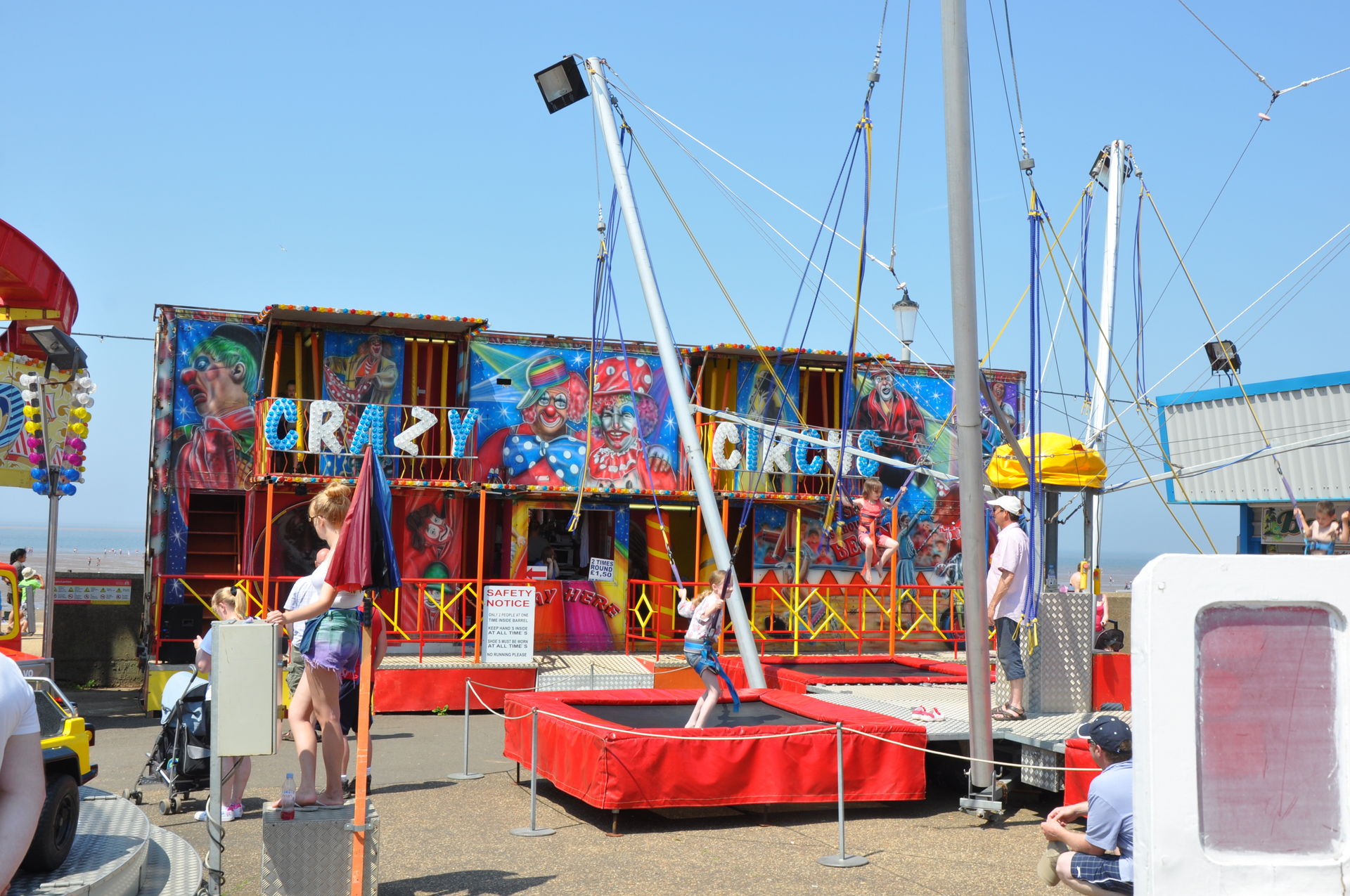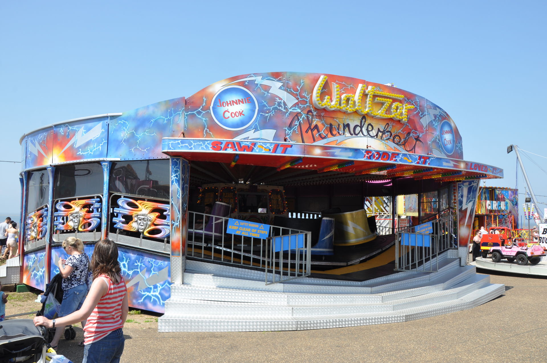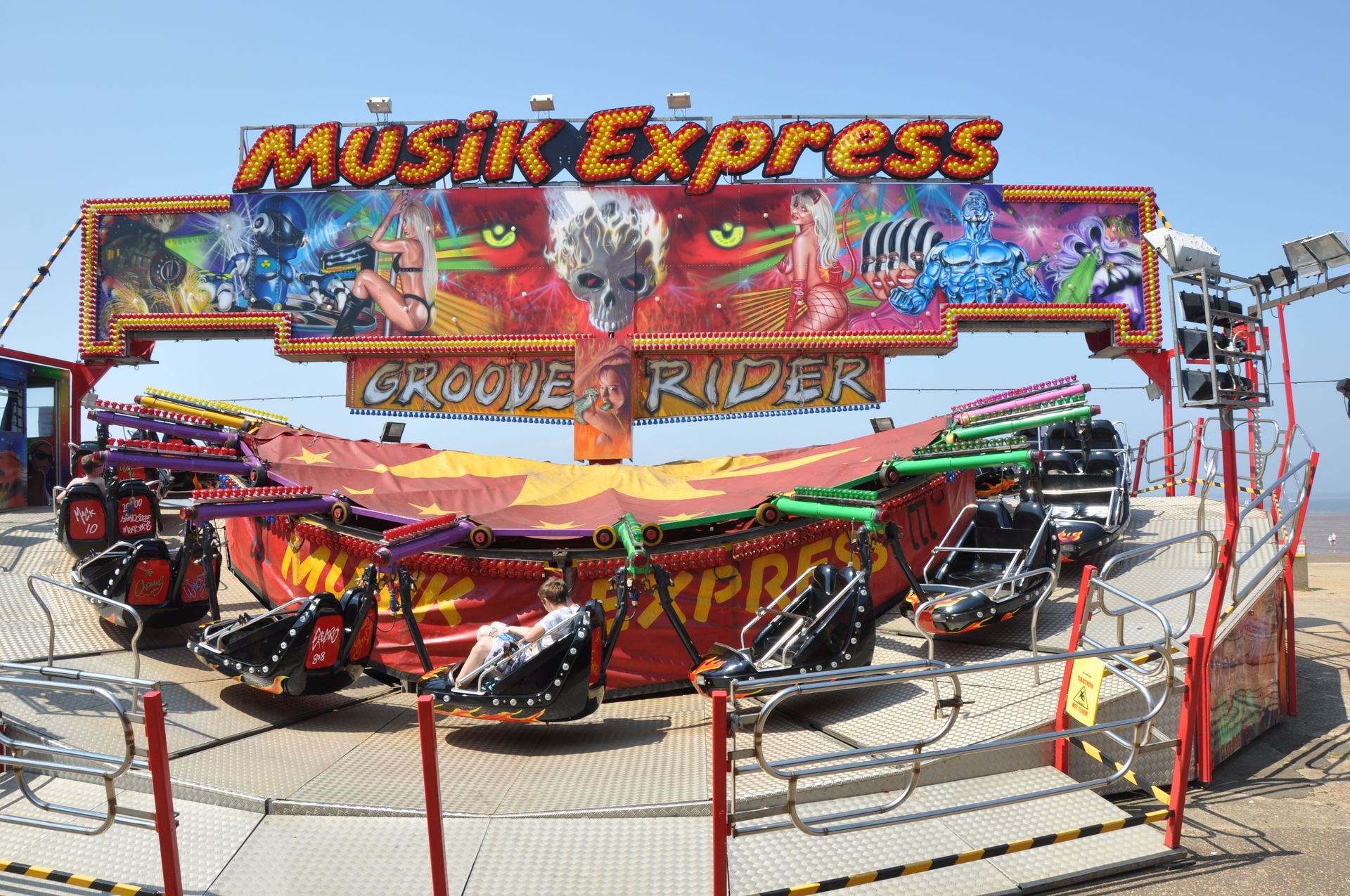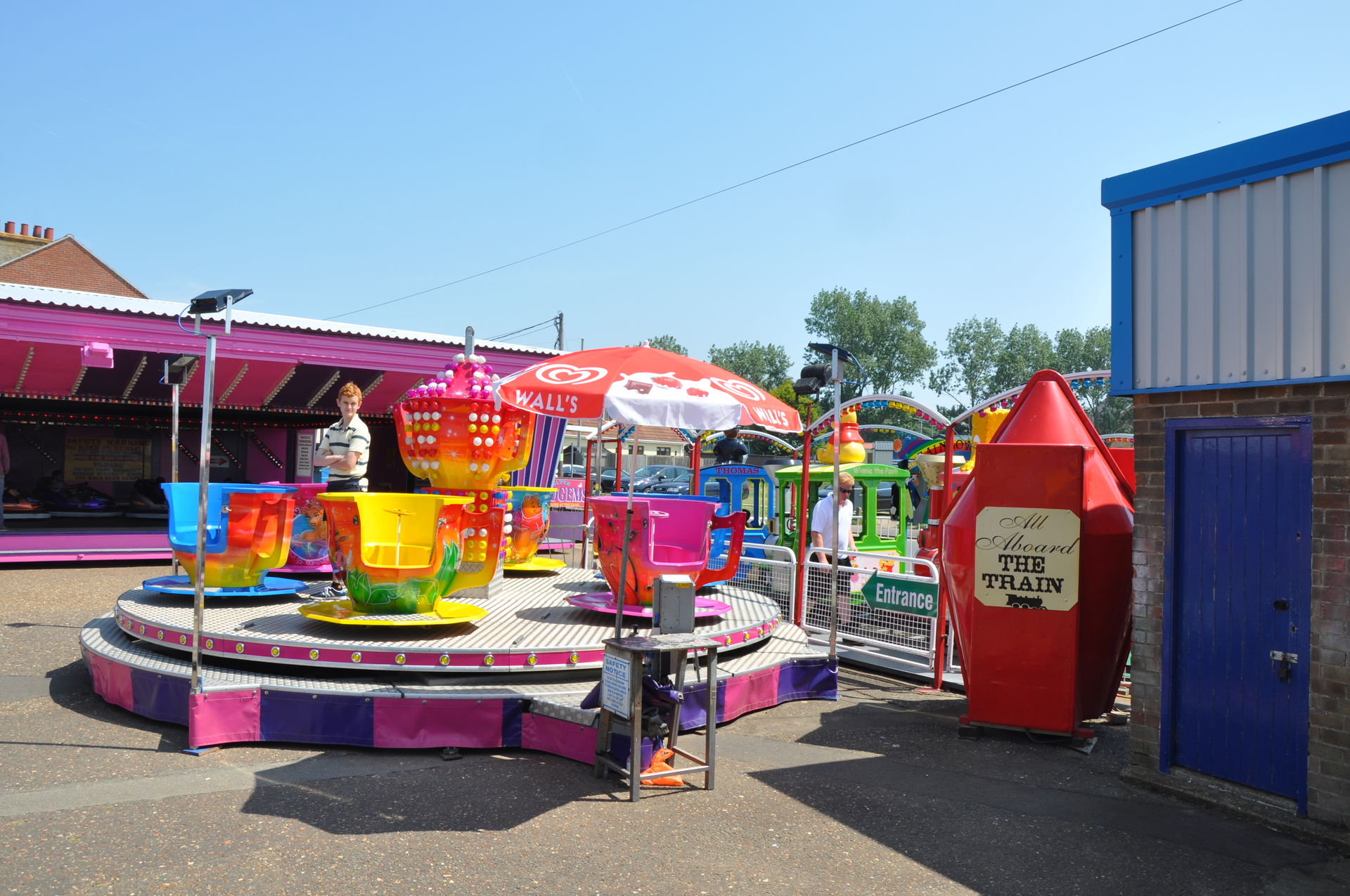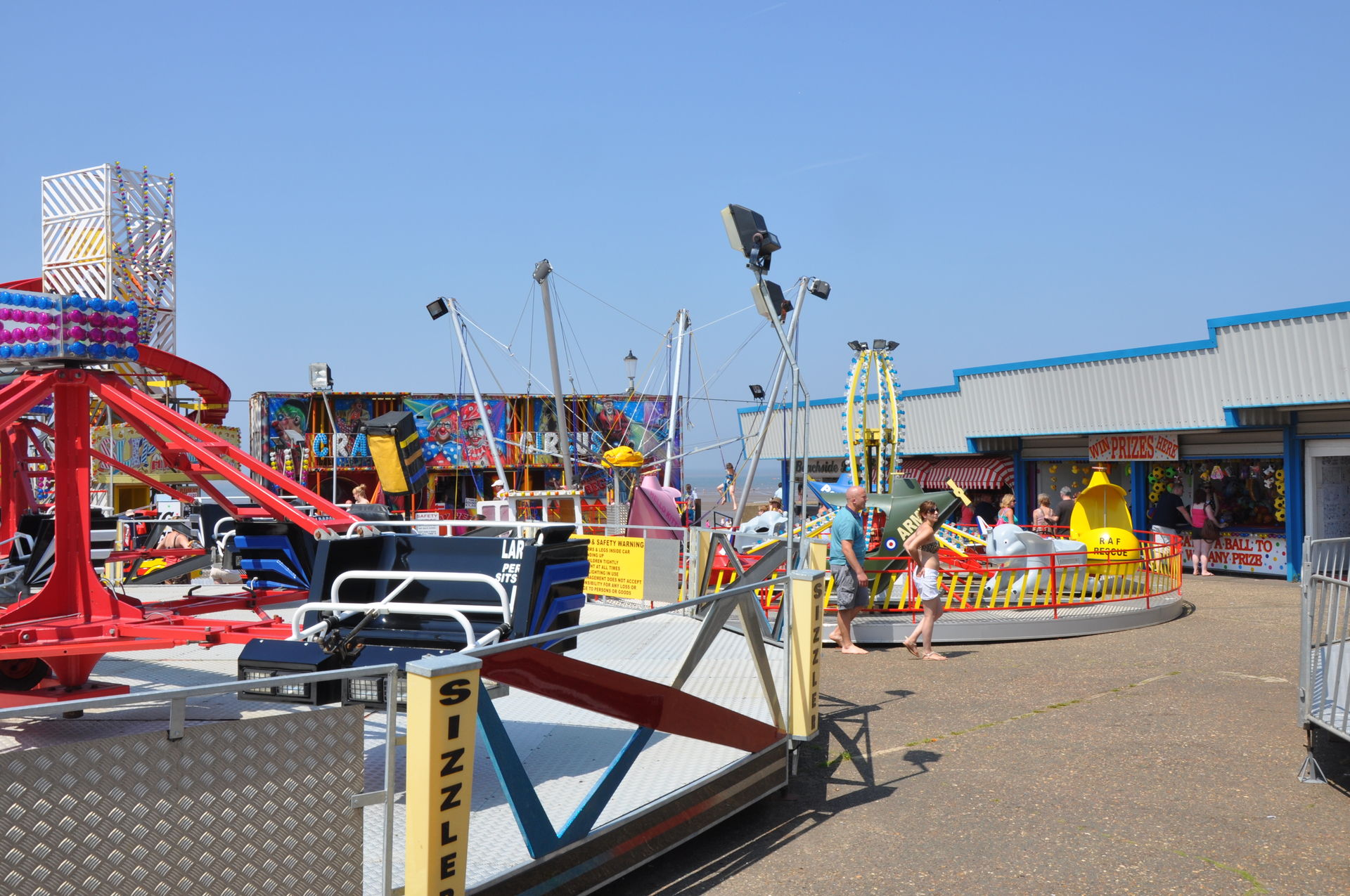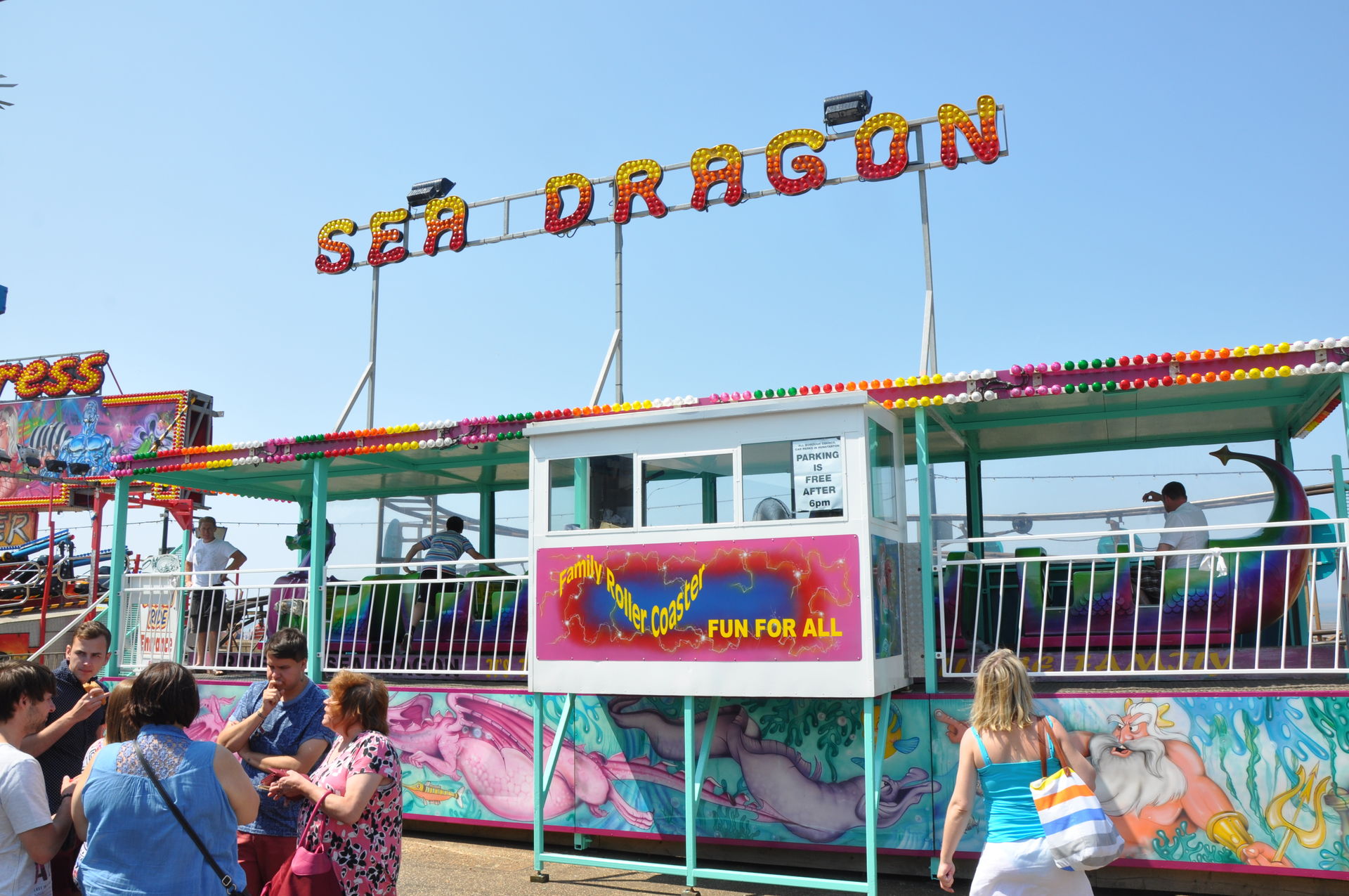 Der Himmel versprach an diesem Sonntag wieder einen sonnigen Tag. Heute ging es als erstes in den Rainbow Park in Hunstanton. Einem kleinen Küstenort in Norfolk. Diese Idee hatten aber nicht nur wir. So haben wir in diversen Staus ca. 50 Minuten verloren. Zum Glück gab es aber direkt am Park noch freie Parkplätze. Nur die Warteschlangen an den Parkautomaten waren genau so lang wie die auf der Straße. Der Park ist sehr übersichtlich und der Coaster sah nach einem typischen Kiddycoaster mit den typischen Fahreigenschaften aus. Aber weit gefehlt, das Teil lief butterweich. Natürlich sind die vier verrückten Deutschen auf dem Kiddy mit dem Besitzer ins Gespräch gekommen. Der erzählte mit Stolz, dass er den Coaster immer gut pflege und auf die Fahreigenschaften besonders achte. Der Mann leistet dort wirklich sehr gute Arbeit. Hier ein paar Bilder von seinem Schmuckstück.