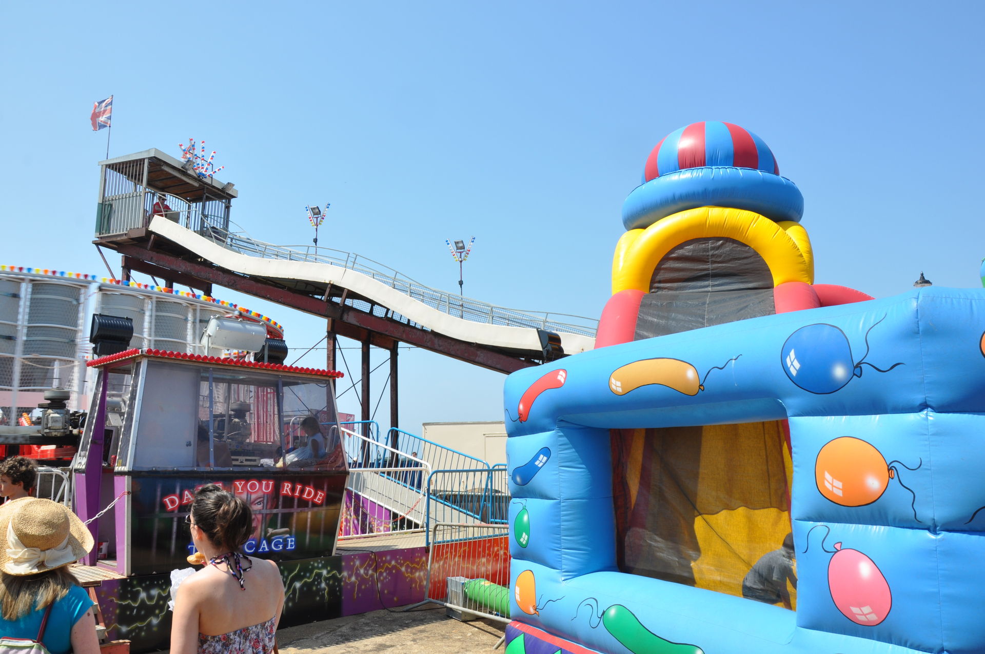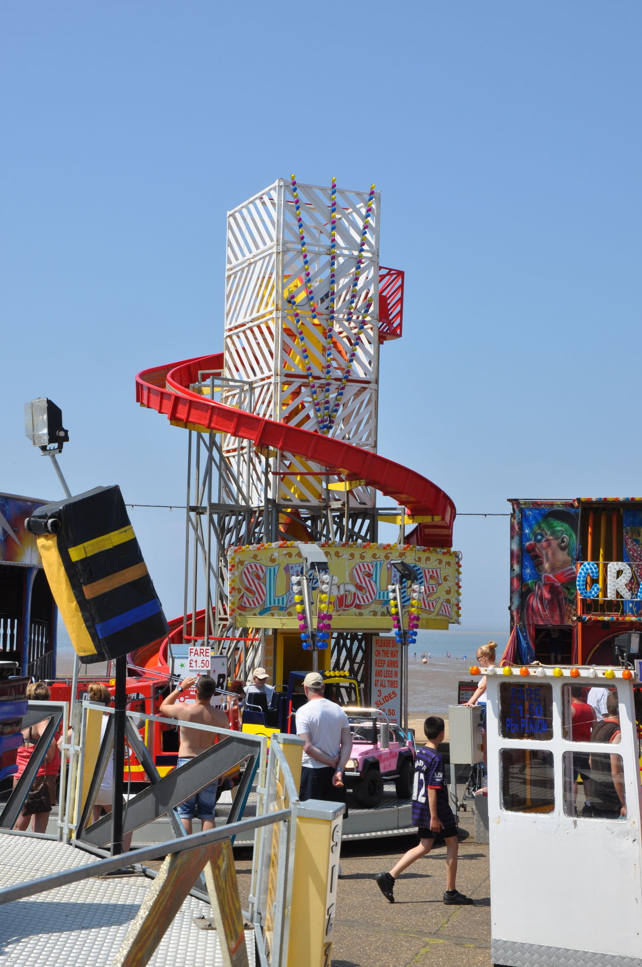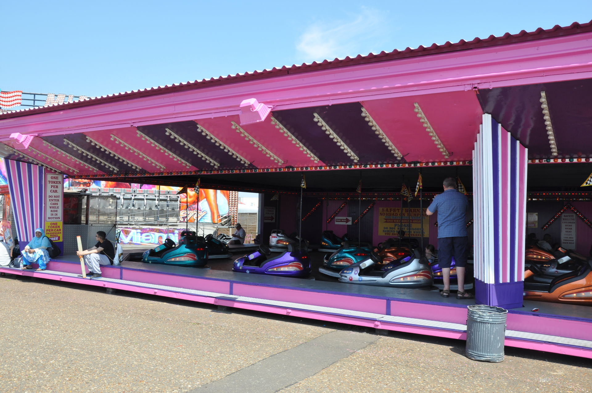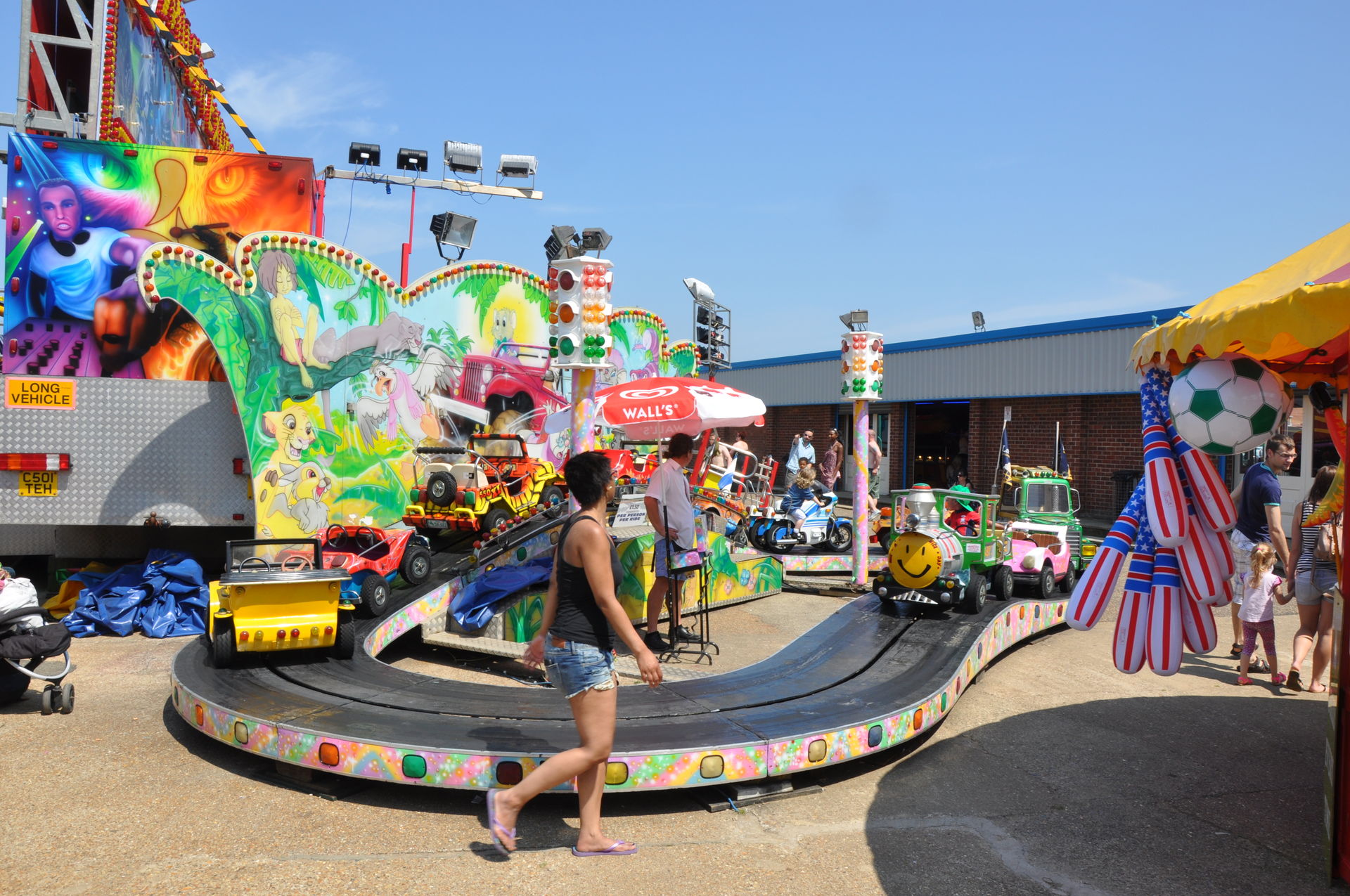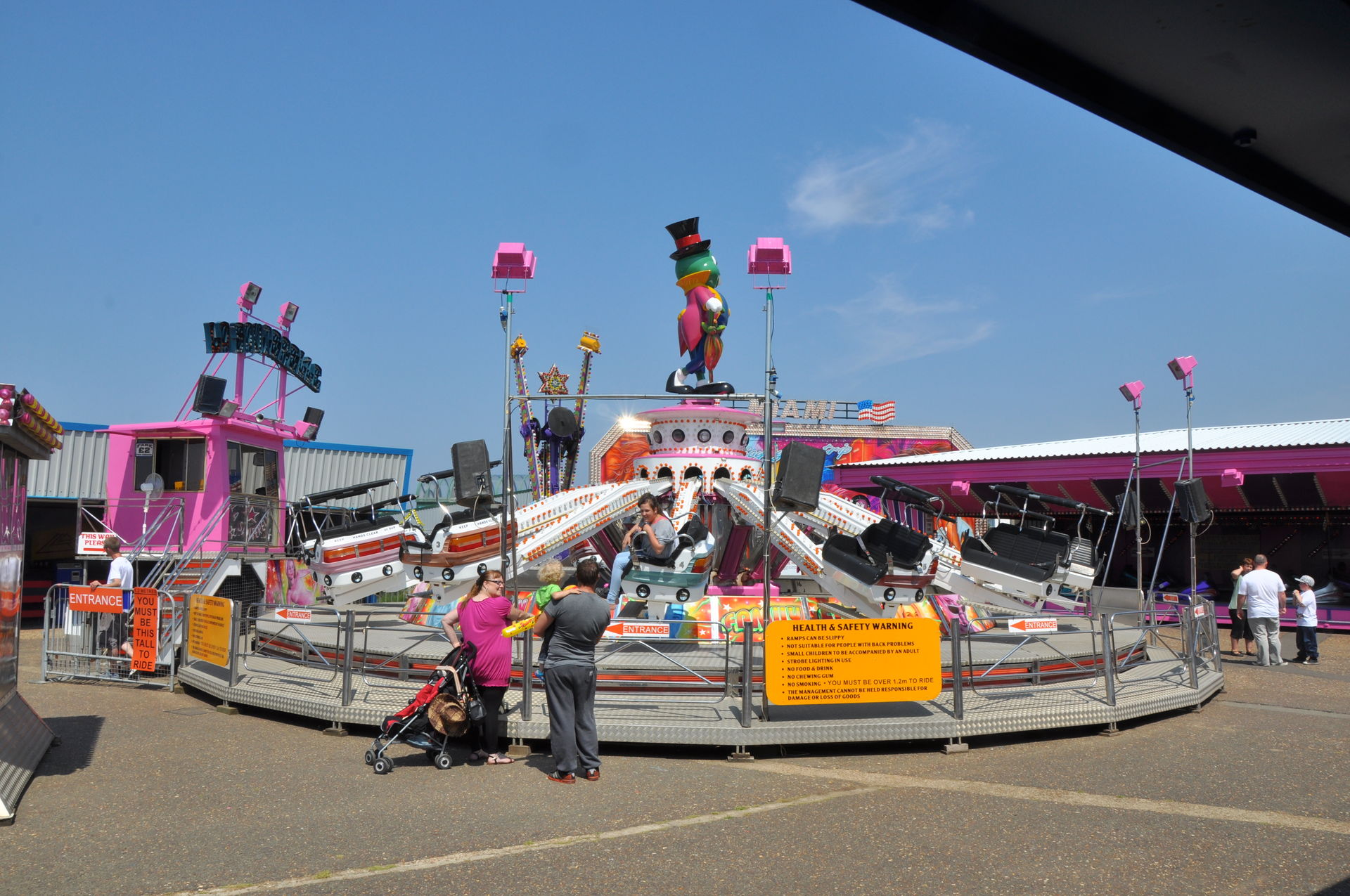 Der Himmel versprach an diesem Sonntag wieder einen sonnigen Tag. Heute ging es als erstes in den Rainbow Park in Hunstanton. Einem kleinen Küstenort in Norfolk. Diese Idee hatten aber nicht nur wir. So haben wir in diversen Staus ca. 50 Minuten verloren. Zum Glück gab es aber direkt am Park noch freie Parkplätze. Nur die Warteschlangen an den Parkautomaten waren genau so lang wie die auf der Straße. Der Park ist sehr übersichtlich und der Coaster sah nach einem typischen Kiddycoaster mit den typischen Fahreigenschaften aus. Aber weit gefehlt, das Teil lief butterweich. Natürlich sind die vier verrückten Deutschen auf dem Kiddy mit dem Besitzer ins Gespräch gekommen. Der erzählte mit Stolz, dass er den Coaster immer gut pflege und auf die Fahreigenschaften besonders achte. Der Mann leistet dort wirklich sehr gute Arbeit. Hier ein paar Bilder von seinem Schmuckstück.