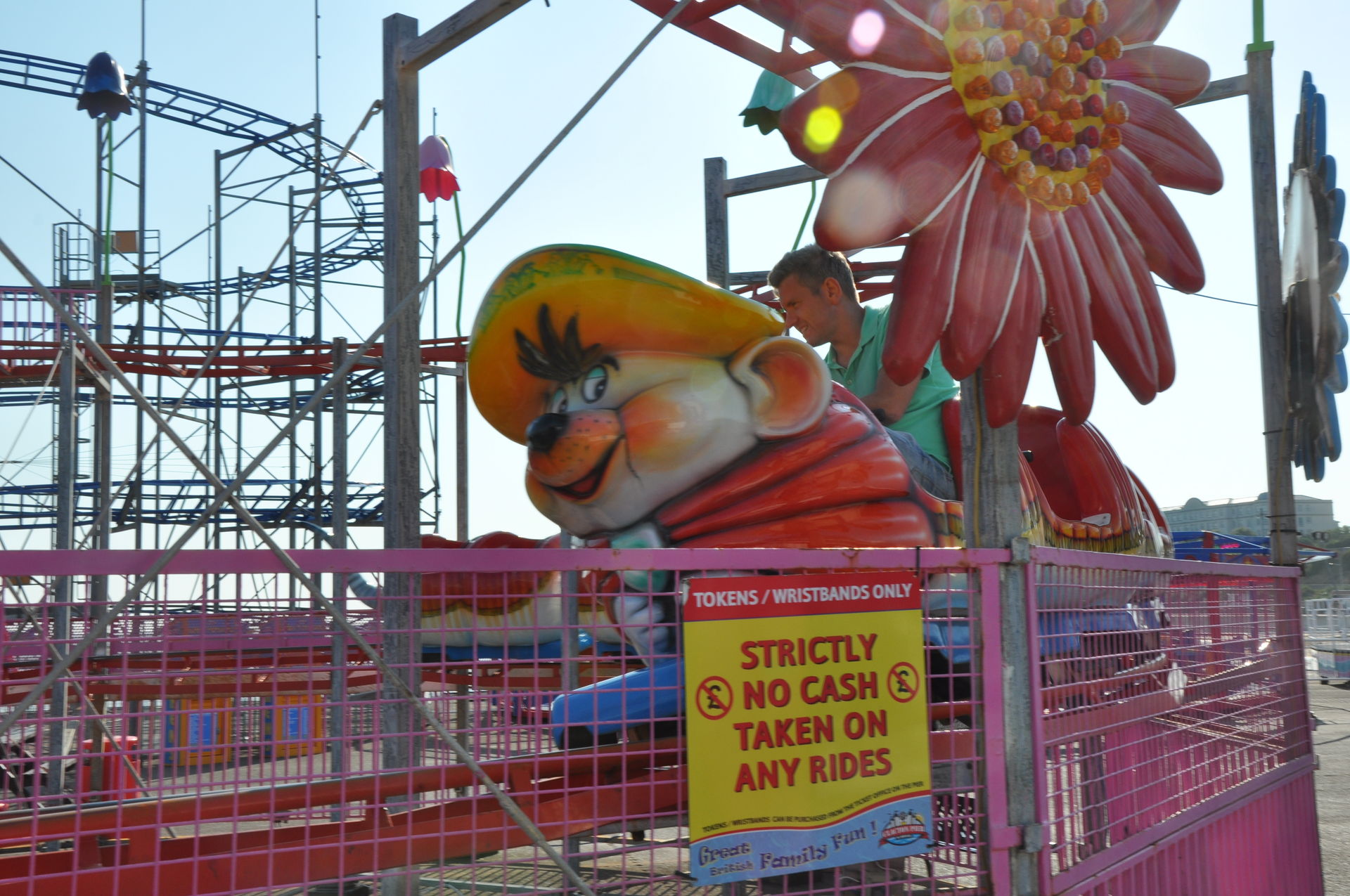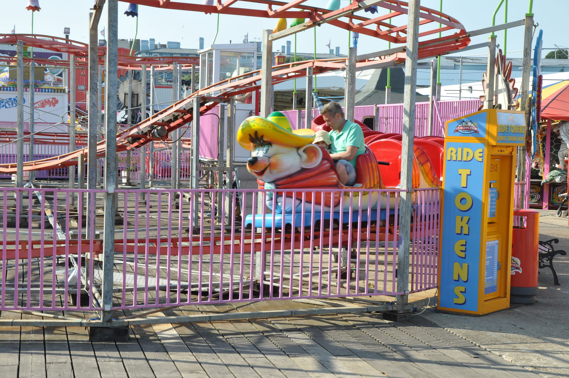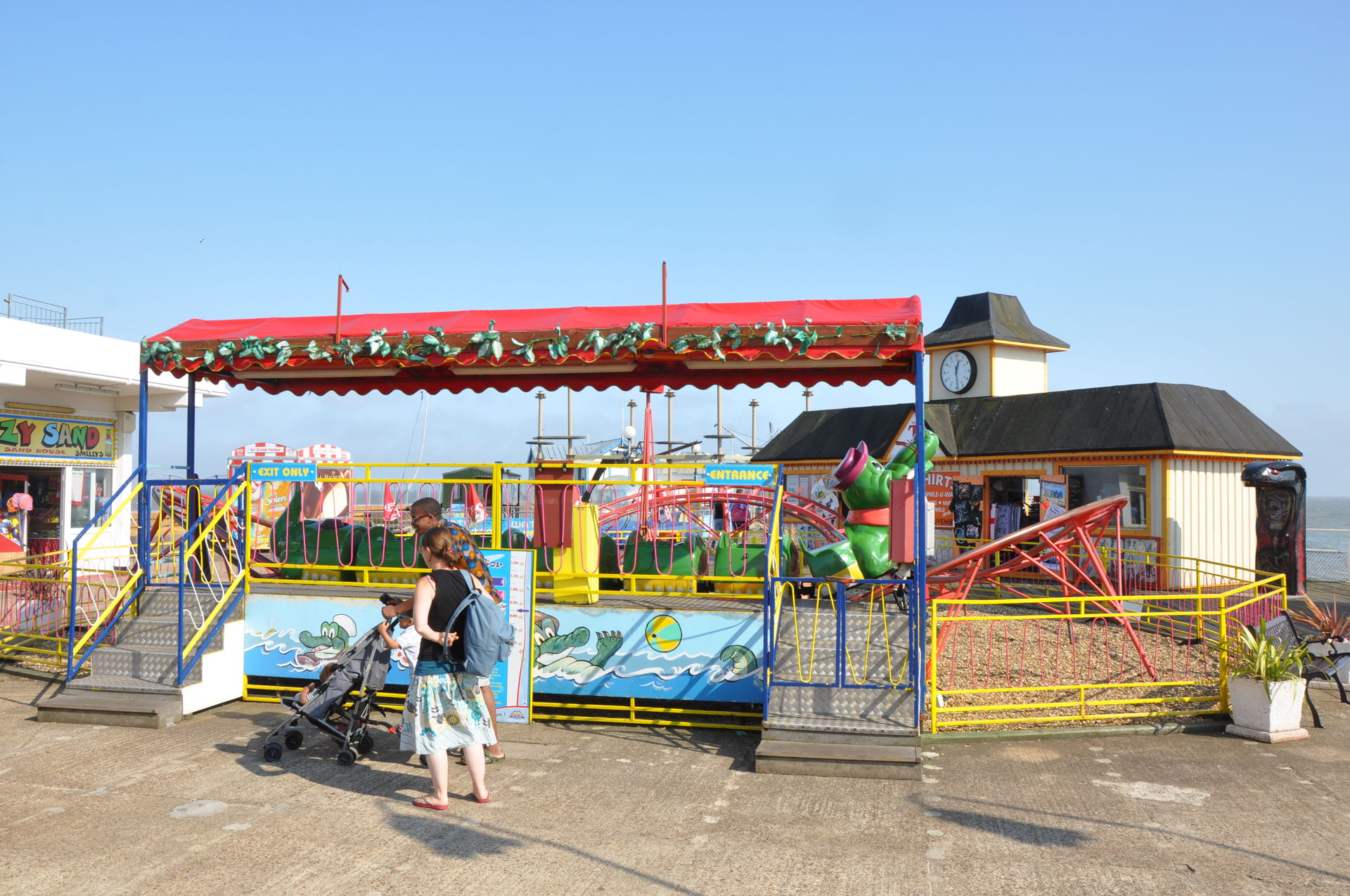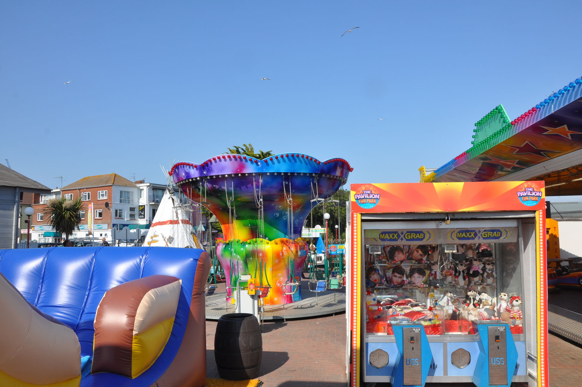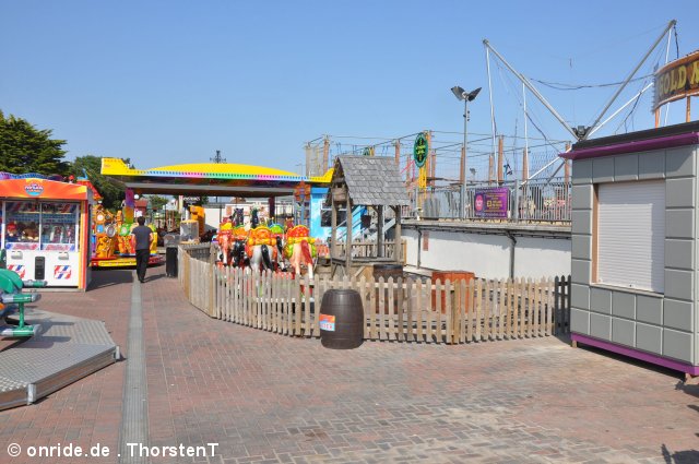 Zum Abschluss unseres Urlaubs ging es nun nach Clacton on Sea. Dieses liegt etwas unterhalb vom Fährhafen in Harwich. Hier waren wir bereits bei unserem letzten Besuch auf der Insel vor zwei Jahren, leider damals zu spät am Abend. In beiden Parks waren die Fahrgeschäfte schon geschlossen. Diesmal war die Reihenfolge also erst die Parks, dann Essen. Wobei „Parks“ natürlich übertrieben ist. Der neuere, der Pavilion Fun Park, eröffnet 2011, steht oben an der Promenade. Die Fahrgeschäfte hier richten sich nur an kleinere Fahrgäste. Das gab natürlich wieder verwunderte Blicke, als wir die Token für die Gold Mine gelöst haben. Aber man ließ uns fahren.