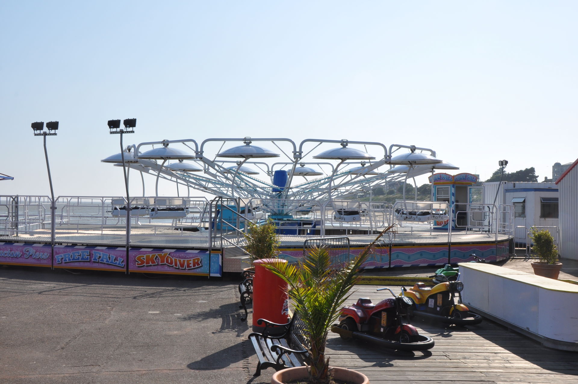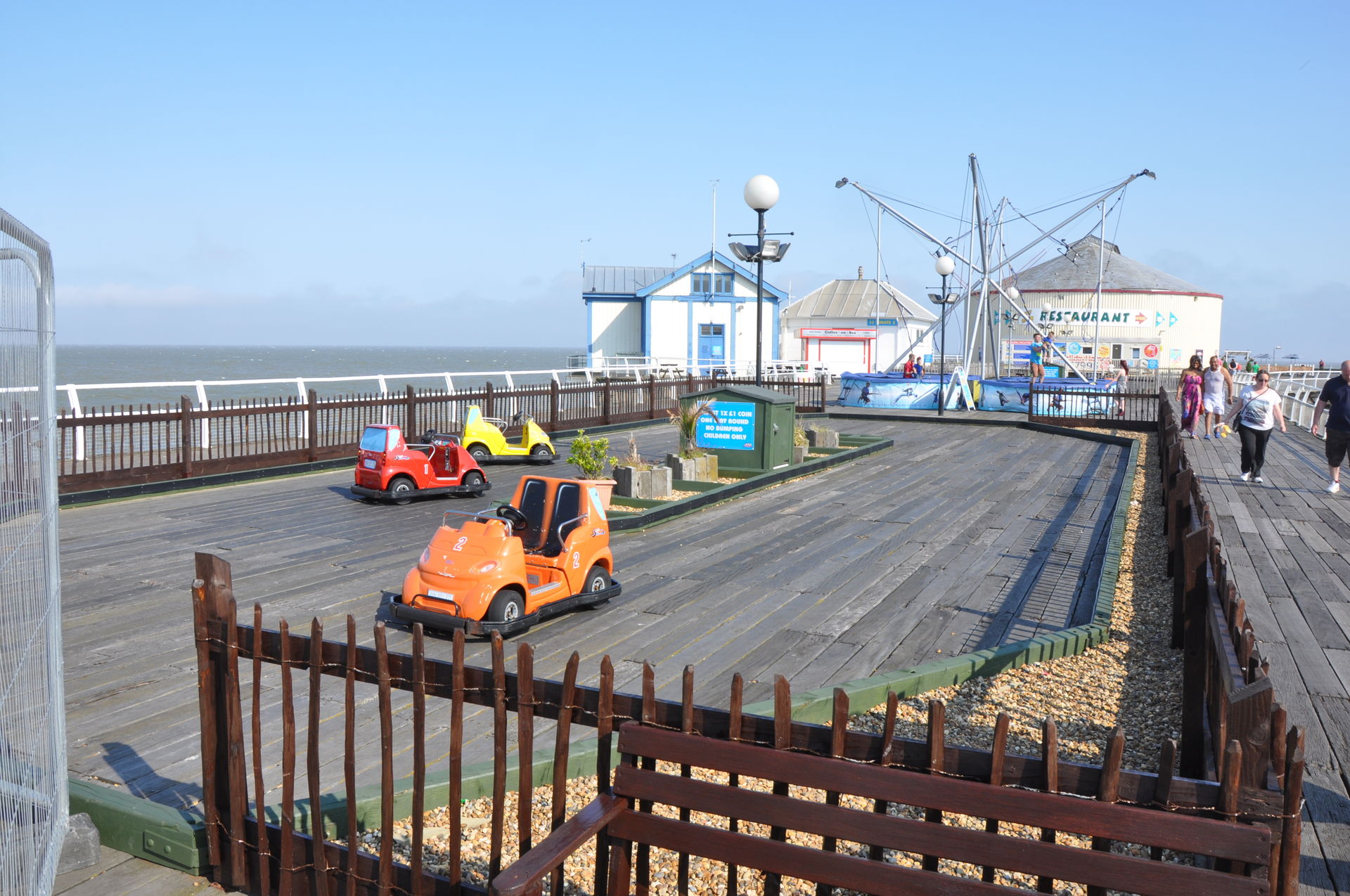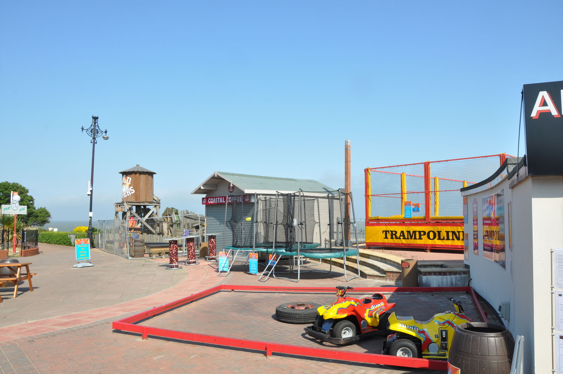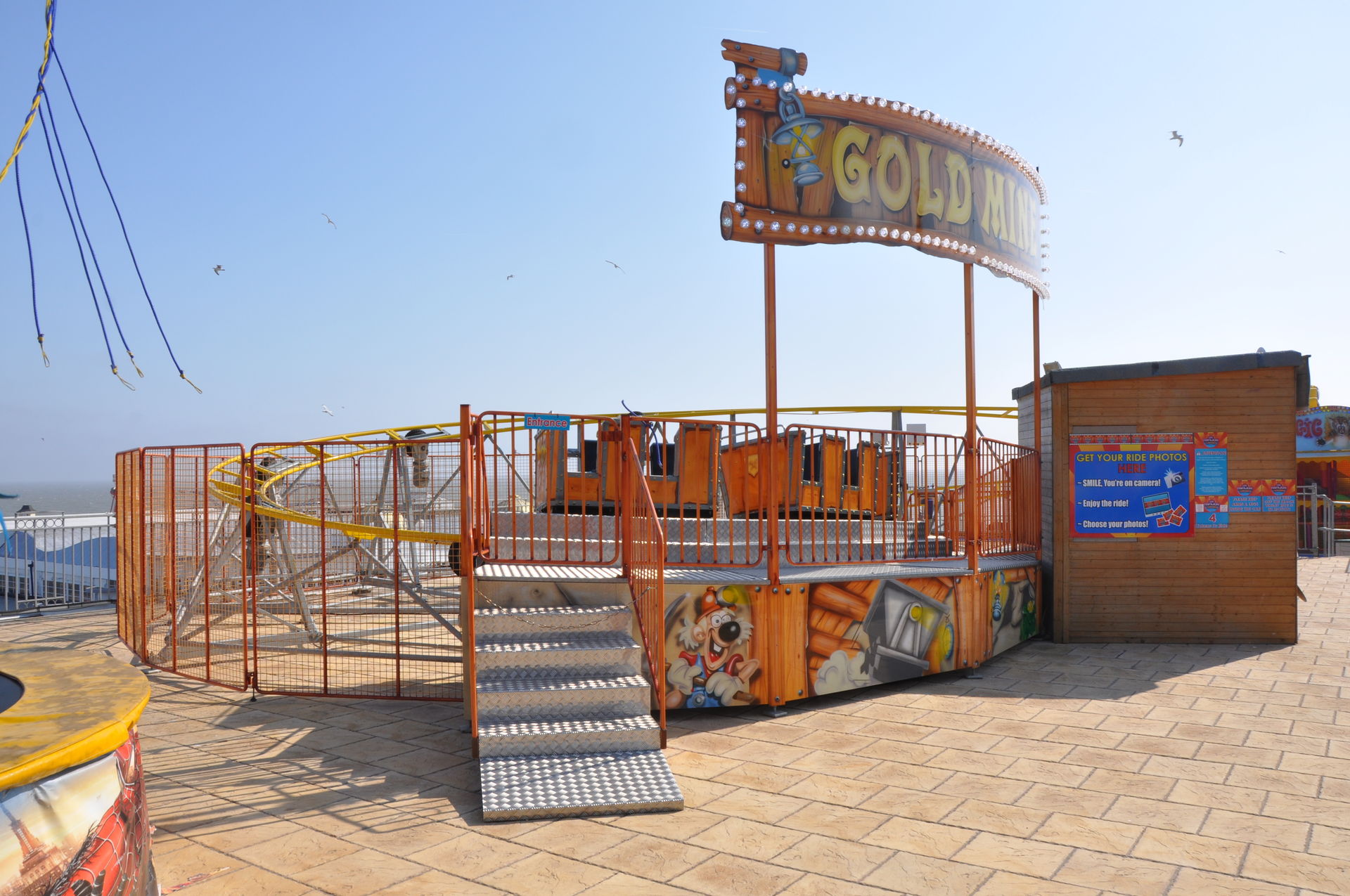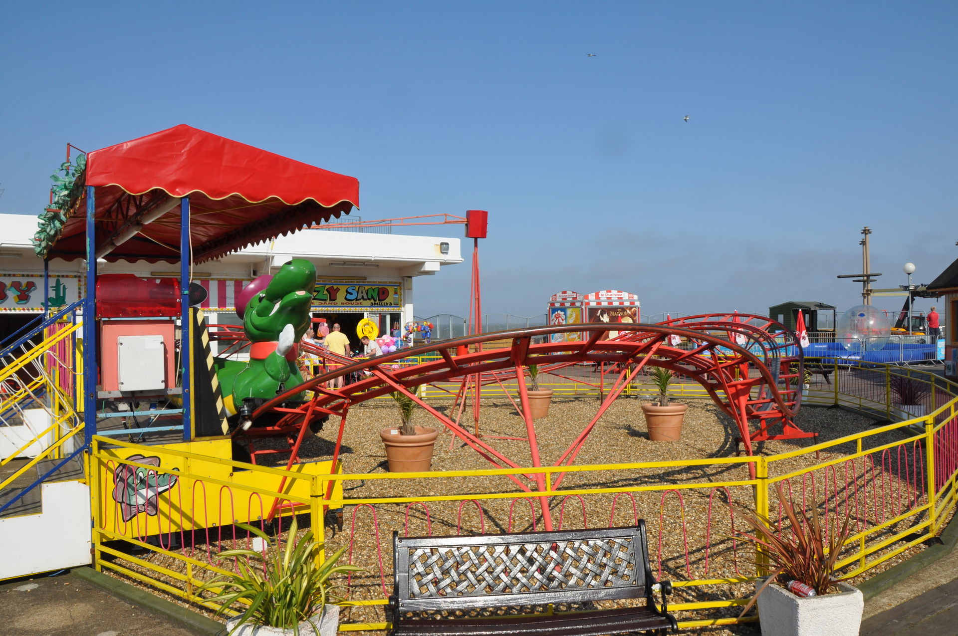Zum Abschluss unseres Urlaubs ging es nun nach Clacton on Sea. Dieses liegt etwas unterhalb vom Fährhafen in Harwich. Hier waren wir bereits bei unserem letzten Besuch auf der Insel vor zwei Jahren, leider damals zu spät am Abend. In beiden Parks waren die Fahrgeschäfte schon geschlossen. Diesmal war die Reihenfolge also erst die Parks, dann Essen. Wobei „Parks“ natürlich übertrieben ist. Der neuere, der Pavilion Fun Park, eröffnet 2011, steht oben an der Promenade. Die Fahrgeschäfte hier richten sich nur an kleinere Fahrgäste. Das gab natürlich wieder verwunderte Blicke, als wir die Token für die Gold Mine gelöst haben. Aber man ließ uns fahren.