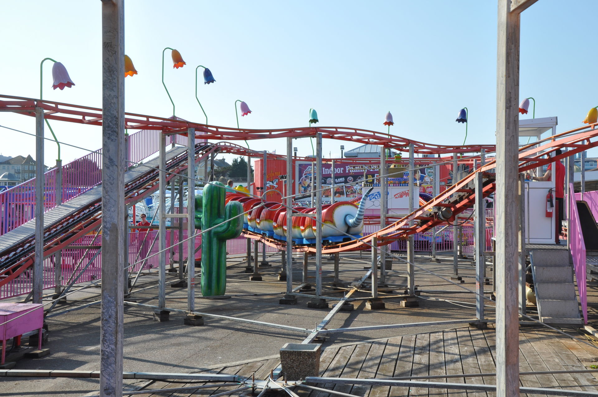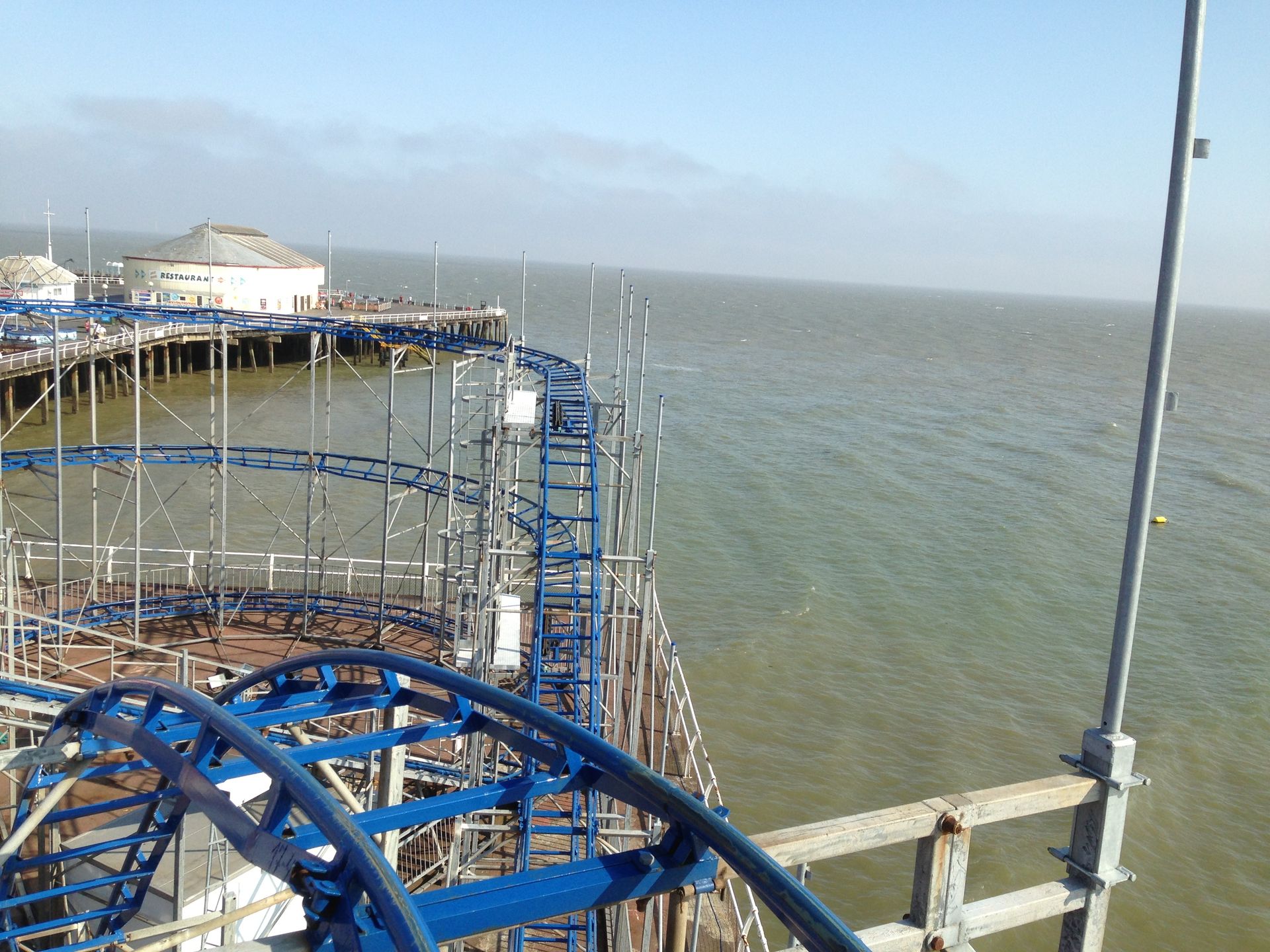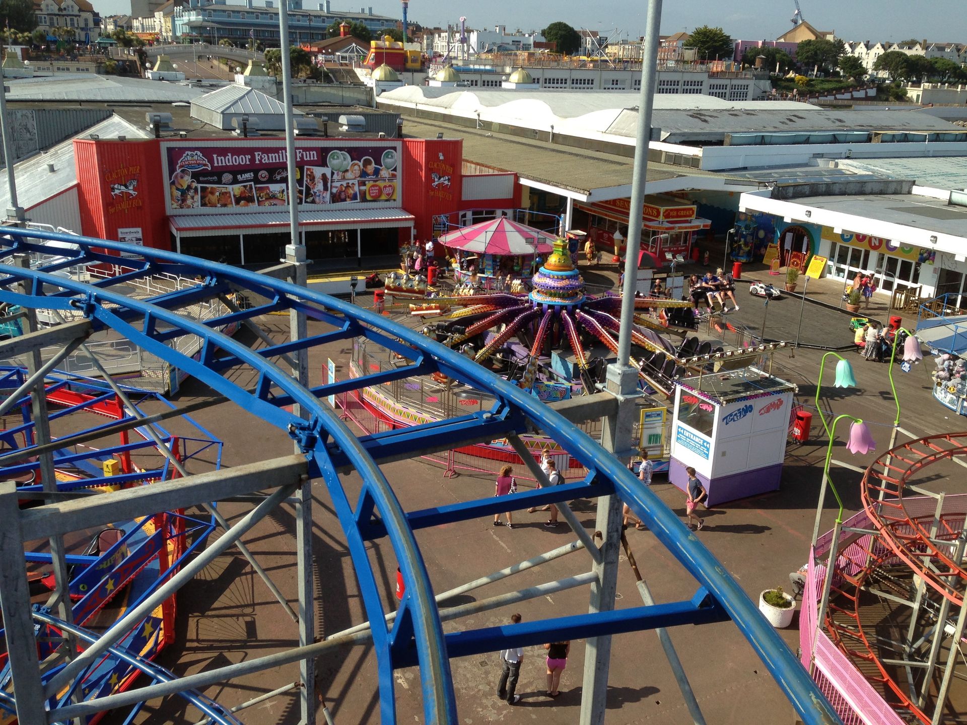 Zum Schluss fuhren wir noch Stellas Revenge. Diese Bahn kam 2011 aus dem Barry Island Pleasure Park in Wales auf den Pier. Bei unserem letzten Besuch war sie noch nicht vollständig aufgebaut. Es handelt sich um eine Bahn im klassischen 8-ter Layout. Hier kann man nicht viel falsch machen. Insbesondere auf einem Pier, direkt am Wasser, liebe ich diesen Typ. Die Fahrt hat etwas Nostalgisches.