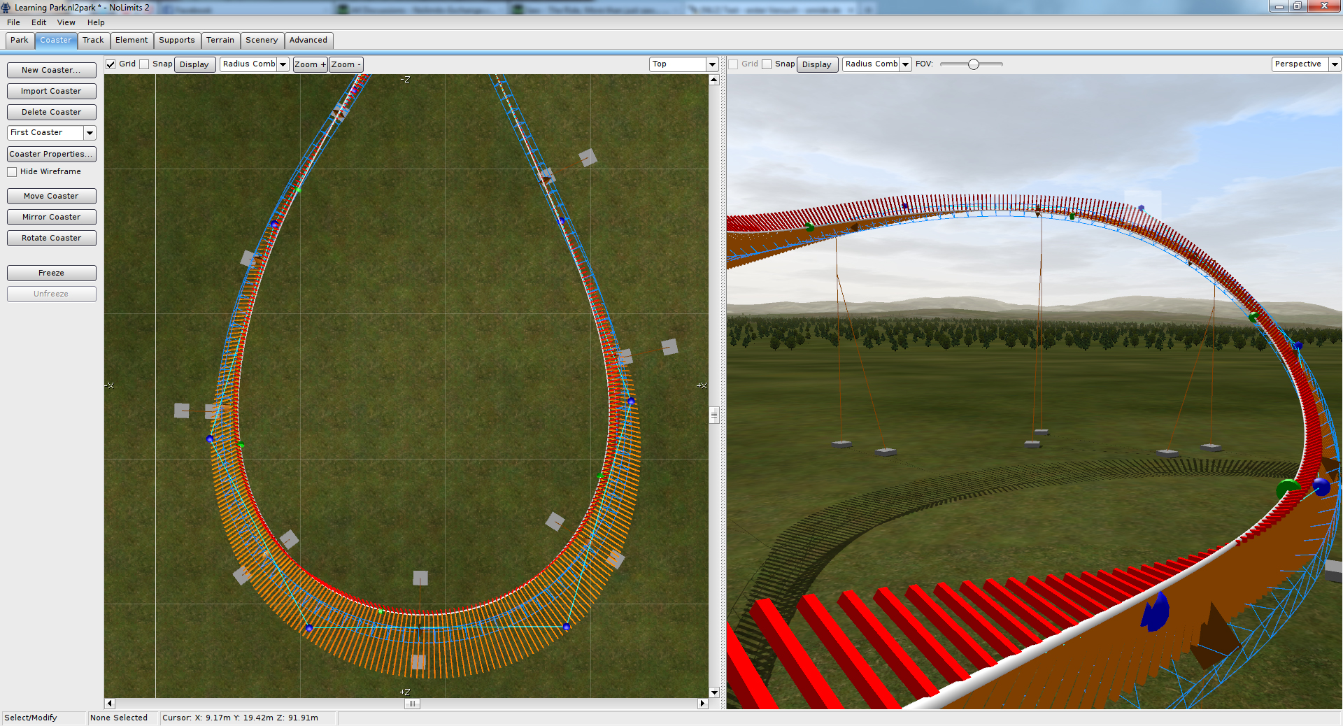 Was beim Kurven bauen hilft ist, sich die Spline auf die Herzlinie zu legen. Das geht über Coaster-> Coaster Properties -> Mode -> Spline Position . Muss man leider bei jedem Coaster neu einstellen, aber es hat zumindest mir ziemlich geholfen.