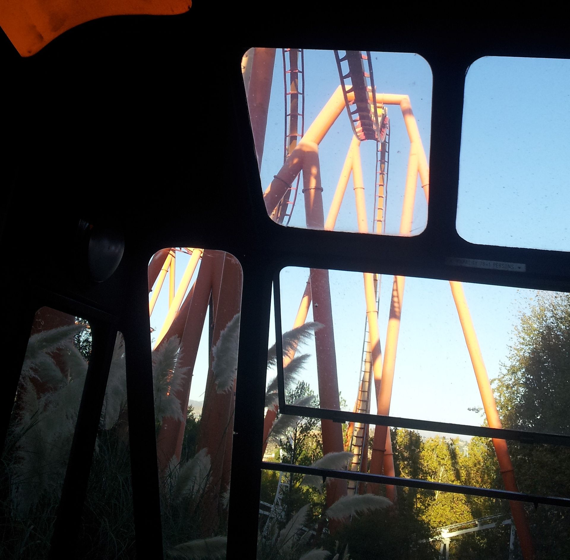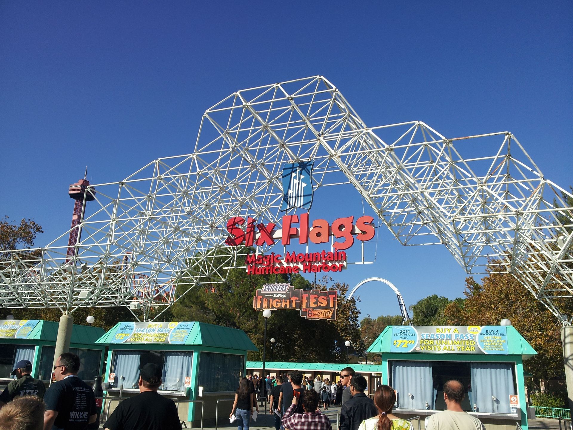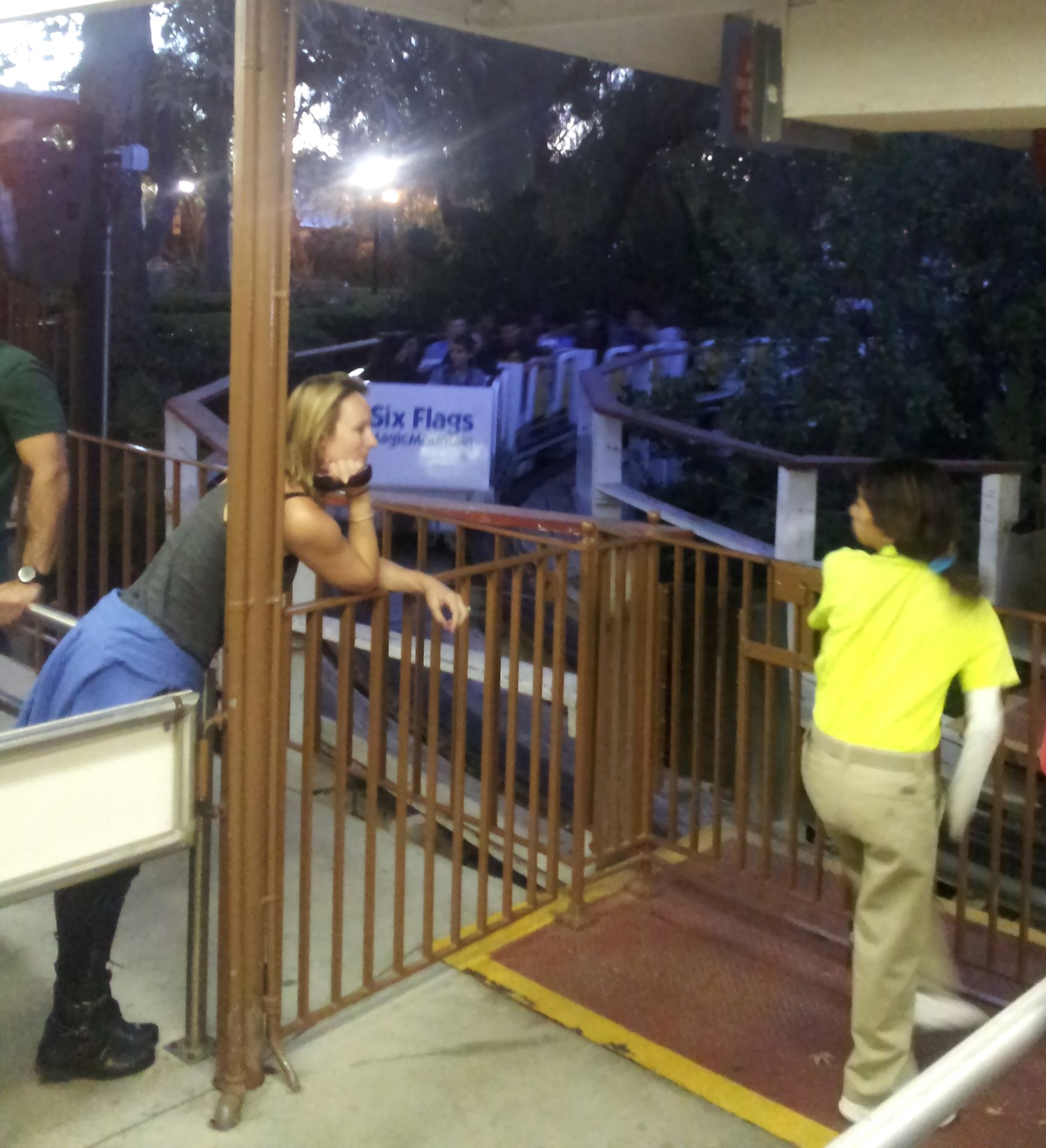 Nachdem wir nun also drüber hinweg gefahren waren, sollte es nun endlich zu Colossus gehen. Da die Bahn wie jedes Jahr zu Halloween und auch die komplette Saison 2014 rückwärts fährt, wollte Elke jedoch nicht mitfahren. Ich ging also alleine, zumal an diesem Tag auch nur eine der beiden Spuren in Betrieb war. Etwa eine halbe Stunde später stand ich dann fast am Gate, welches sich aber nicht öffnete. Etwas weiter hinten (bzw. auf den umgedrehten Zug bezogen vorne) hatte offenbar jemand seinen Mageninhalt nicht beisammen halten können. Mit Schrecken dachte ich daran, wie lange es im Discovery Kingdom gedauert hatte, bis die Reinigung abgeschlossen war. Doch hier ging alles ratz fatz, der leere Zug wurde auf die Reise geschickt, der zweite fuhr ein, wurde ganz normal abgefertigt und ebenfalls abgeschickt. Und bis der wieder zurück war, war der andere Zug auch schon gereinigt und wir hatten Platz genommen.