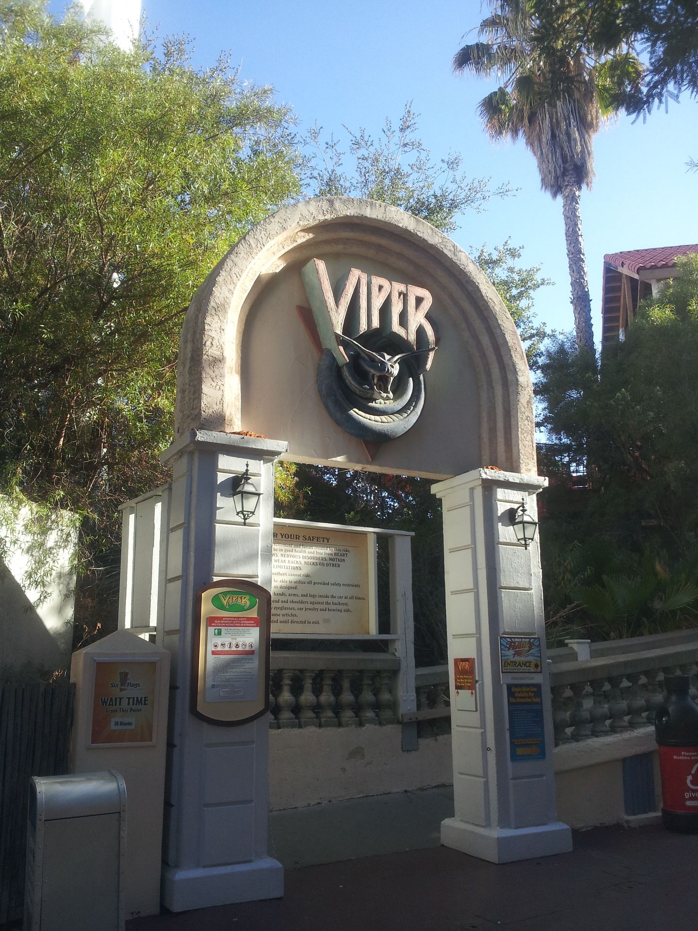 Nachdem der ganze Kinderkram nun auch abgearbeitet war, wurde es Zeit, die zweite Runde zu starten und die ausgelassenen Bahnen nachzuholen. Vorbei an Full Throttle und Revolution ging es daher zum Arrow-Looper mit dem bissigen Namen Viper. Auch hier war die Station quasi leer und wir mussten uns lediglich entscheiden, in welcher Reihe wir fahren wollten. Der Lifthill zieht den Zug haarscharf an zwei Loopings vorbei bis auf fast 60 Meter hinauf, um in schließlich in einer 180°-Kurve gen Erdboden zu schicken. Und nach einer Auffahrt folgt der kurioseste