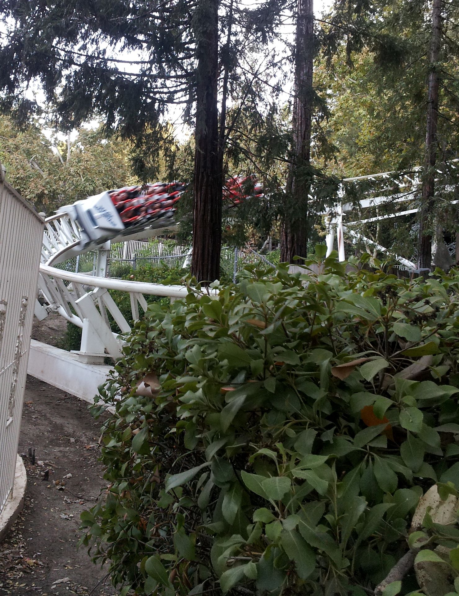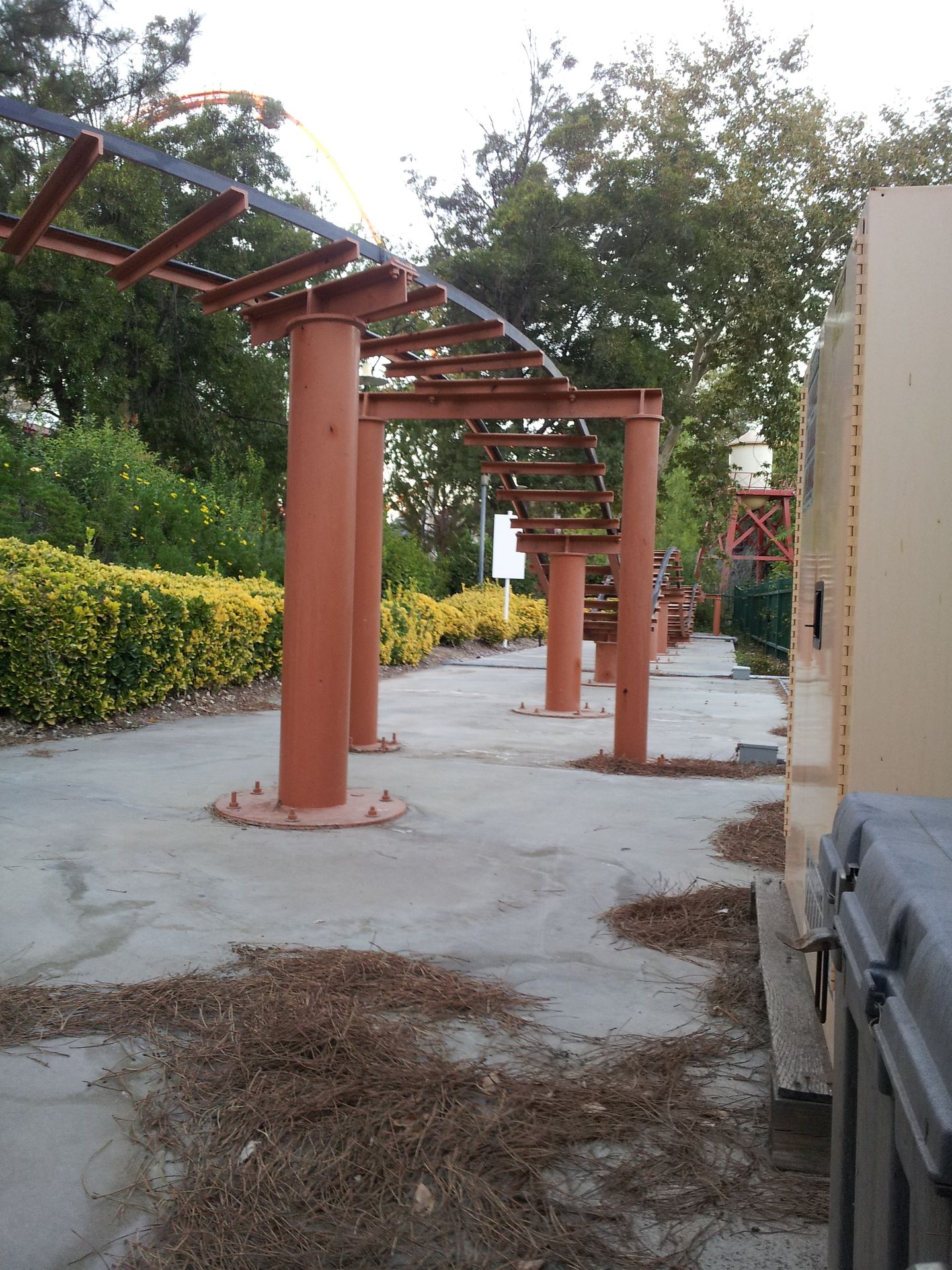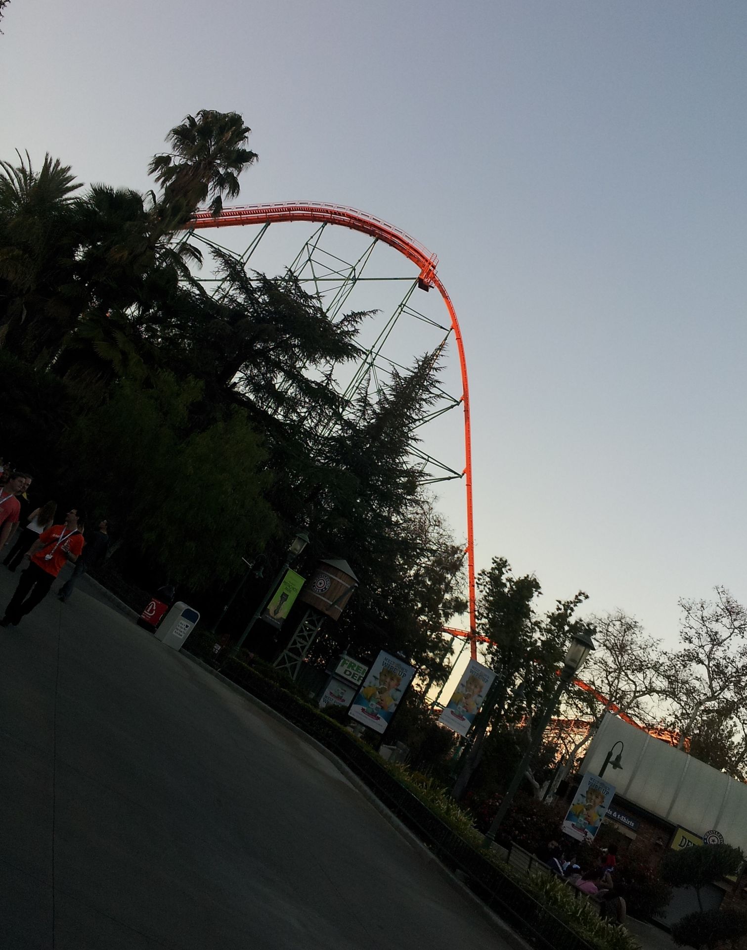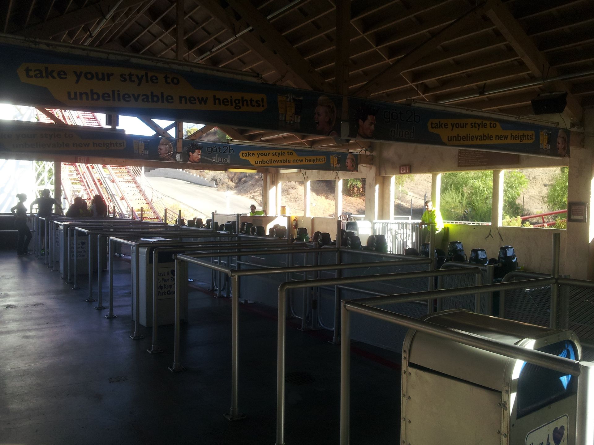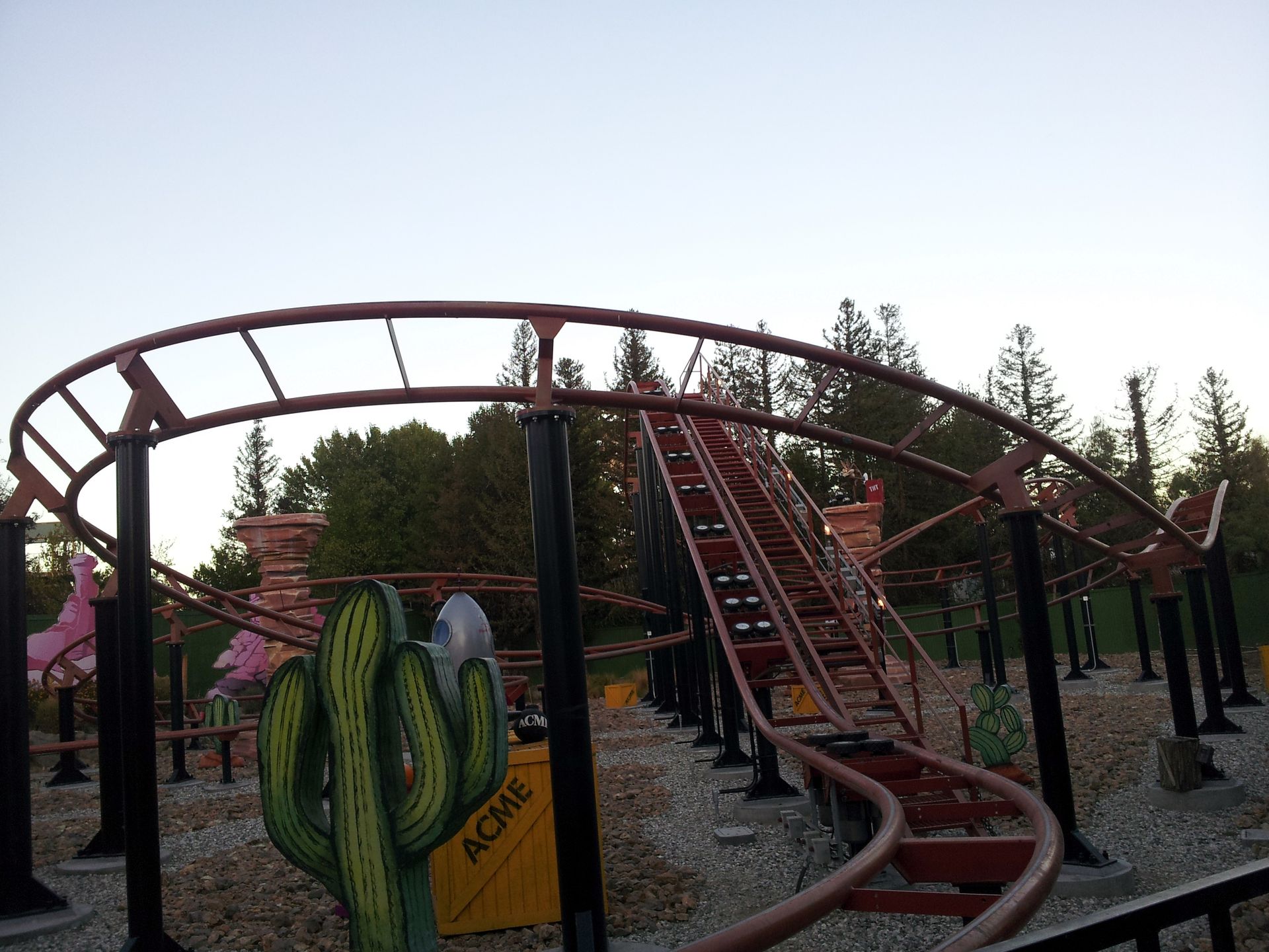 Nach der Fahrt sammelte ich Elke wieder ein und gemeinsam ging es weiter. Leider hatten wir es versäumt, uns einen Parkplan zu besorgen. An der Weggabelung entschieden wir uns daher, zunächst um den Berg herum zu gehen, bevor wir in die Mitte zu Ninja vorstoßen wollten. Ein Fehler, denn von hier wäre der Weg dorthin deutlich einfacher und kürzer gewesen als später. So kamen wir als nächstes zum wohl einsamsten Coaster in diesem Park. Zuvor besorgte ich mir hier aber wieder einen ReFill-Becher für 15$, denn nach den Erfahrungen im Discovery Kingdom hatte ich meinen Rucksack an diesem Tag zuhause gelassen. Obwohl auch hier an jeder Bahn der Zutritt zur Station mit Rucksack laut Schildern verboten war, konnte man seine Taschen überall problemlos mitnehmen und in der Station ablegen.