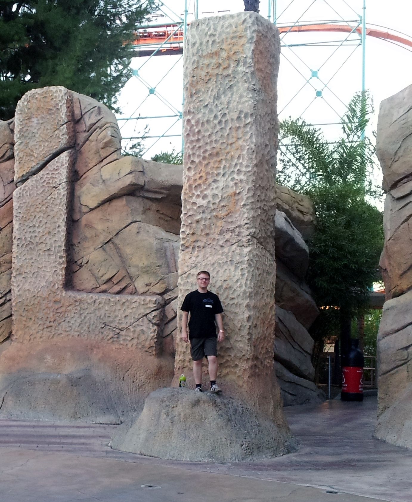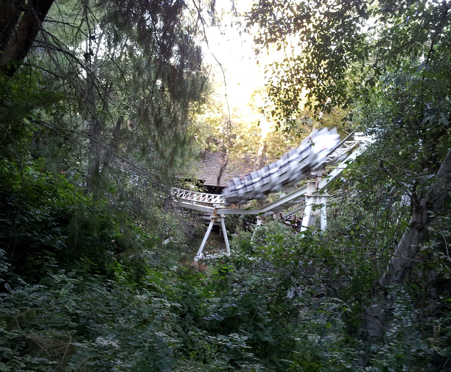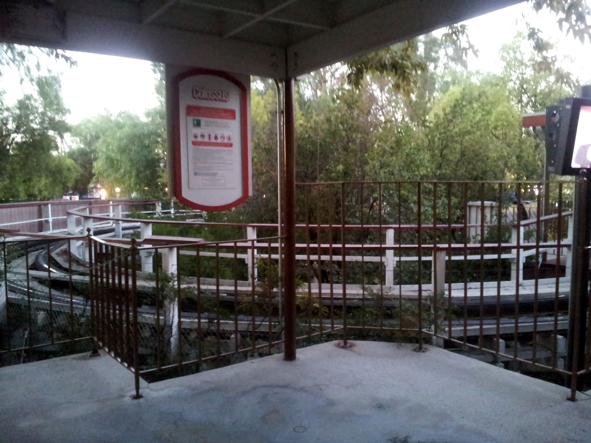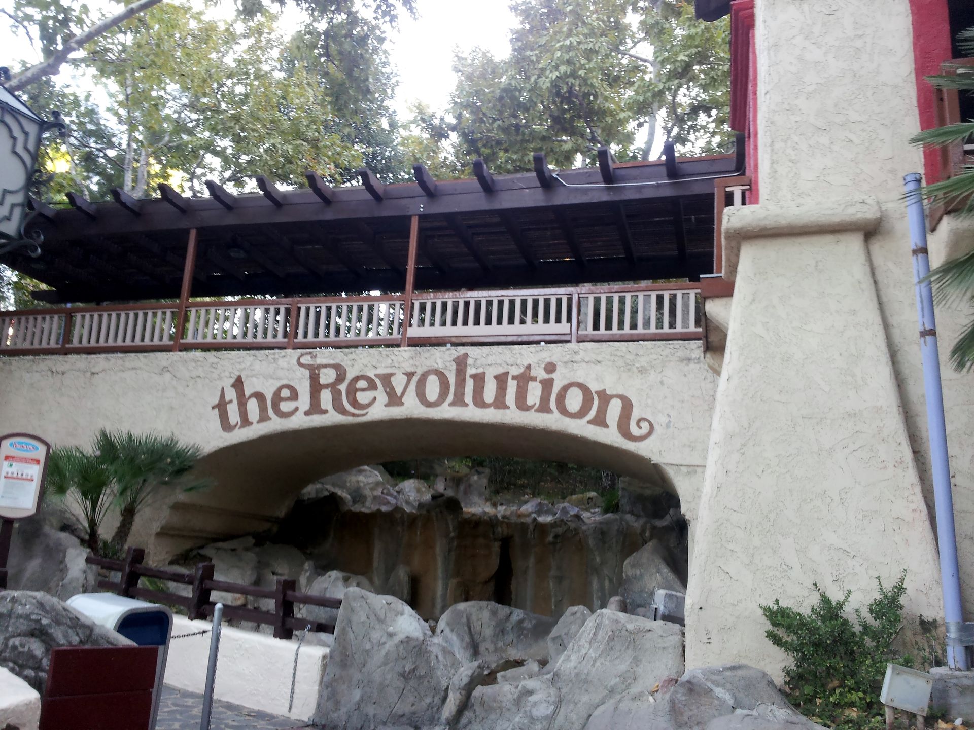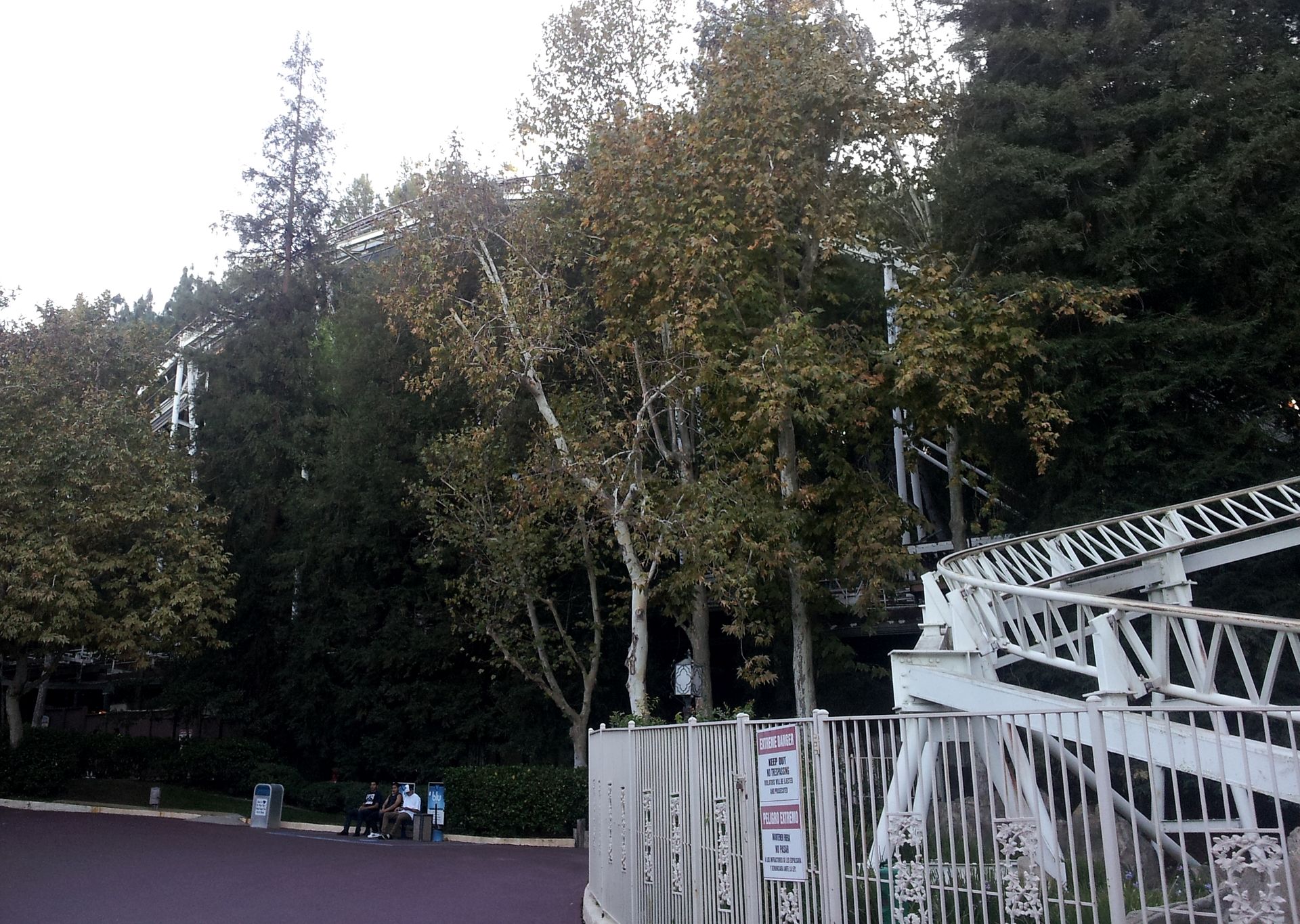Nach der Fahrt sammelte ich Elke wieder ein und gemeinsam ging es weiter. Leider hatten wir es versäumt, uns einen Parkplan zu besorgen. An der Weggabelung entschieden wir uns daher, zunächst um den Berg herum zu gehen, bevor wir in die Mitte zu Ninja vorstoßen wollten. Ein Fehler, denn von hier wäre der Weg dorthin deutlich einfacher und kürzer gewesen als später. So kamen wir als nächstes zum wohl einsamsten Coaster in diesem Park. Zuvor besorgte ich mir hier aber wieder einen ReFill-Becher für 15$, denn nach den Erfahrungen im Discovery Kingdom hatte ich meinen Rucksack an diesem Tag zuhause gelassen. Obwohl auch hier an jeder Bahn der Zutritt zur Station mit Rucksack laut Schildern verboten war, konnte man seine Taschen überall problemlos mitnehmen und in der Station ablegen.