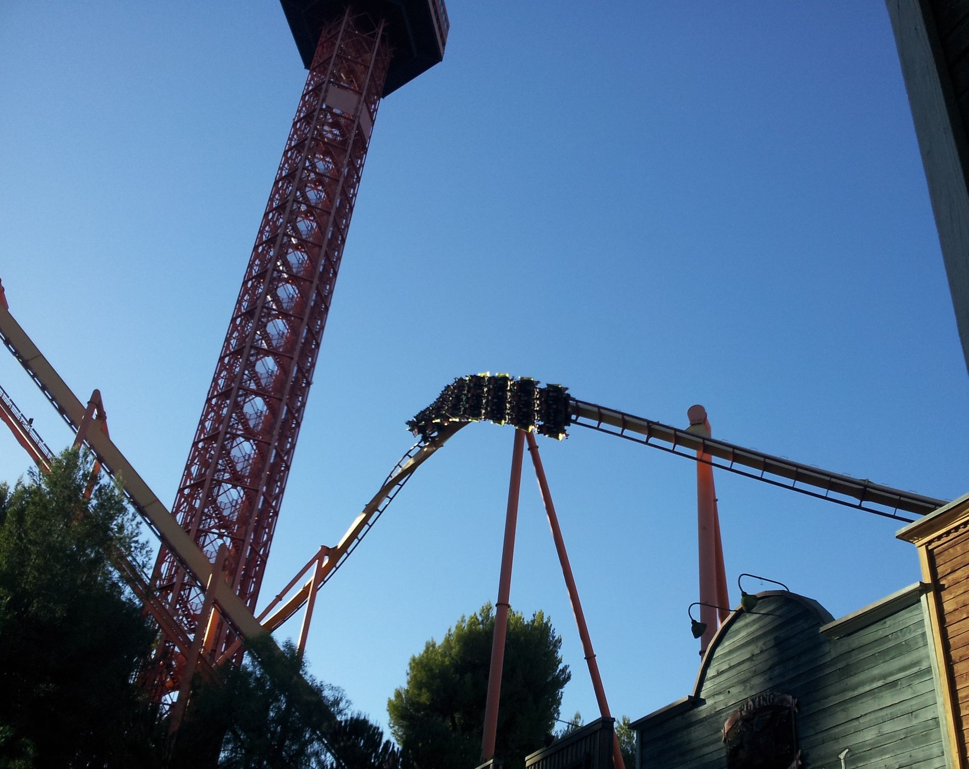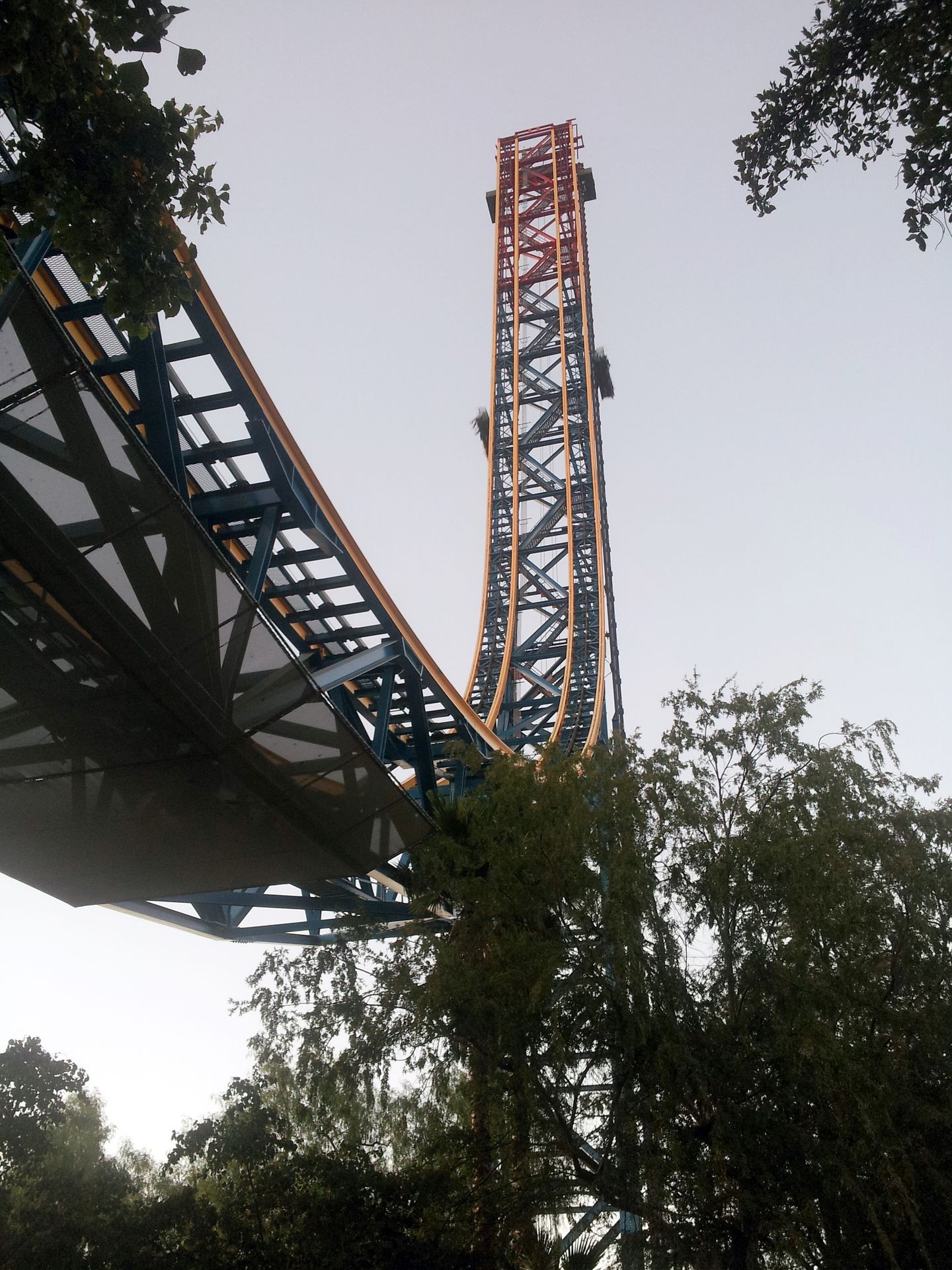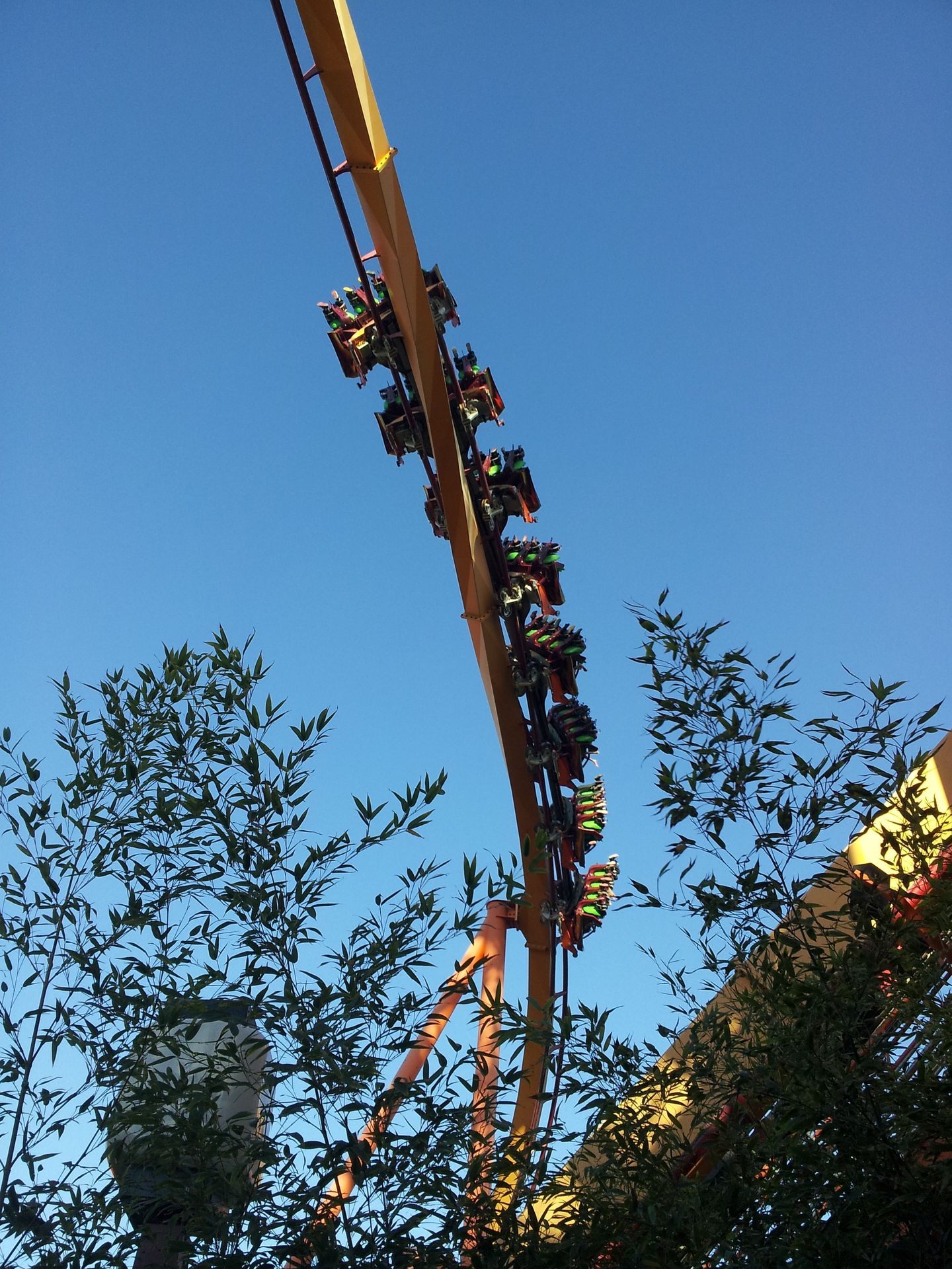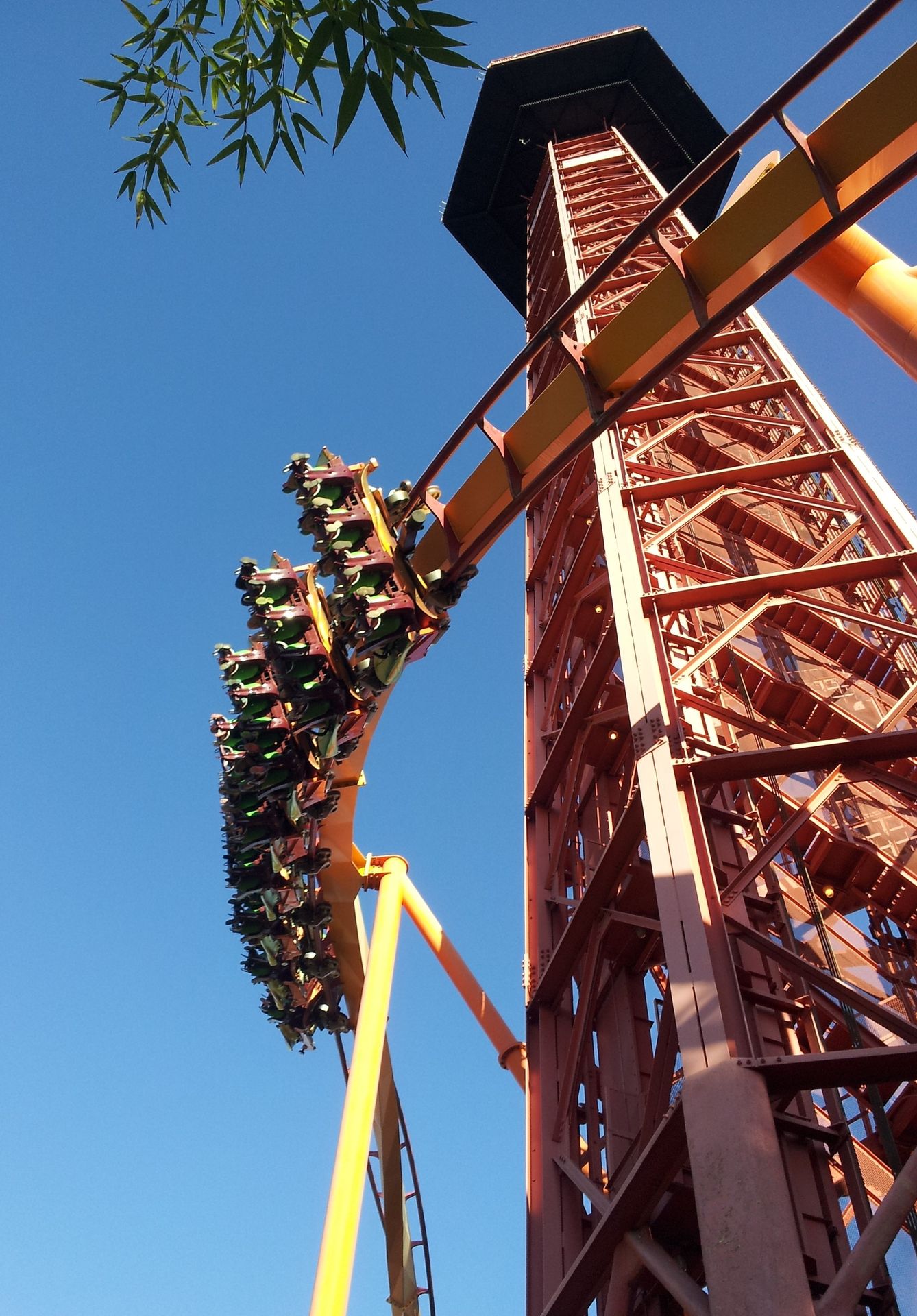 LSM-Antrieb auf die lange Gerade hinaus. Ganze 7 Sekunden braucht der Wagen, um die Zielgeschwindigkeit von 160 km/h zu erreichen. Damit wäre mein persönlicher Geschwindigkeitsrekord vom Vortag schon wieder gebrochen, auch wenn die Beschleunigung bei weitem nicht an die Kraft von Xcelerator herankommt. Schließlich geht es auf den senkrechten, über 120 Meter hohen Turm hinauf, wo der Wagen langsam ausrollt und man mit dem Blick gen Erdboden wieder in die Tiefe rauscht, wo die