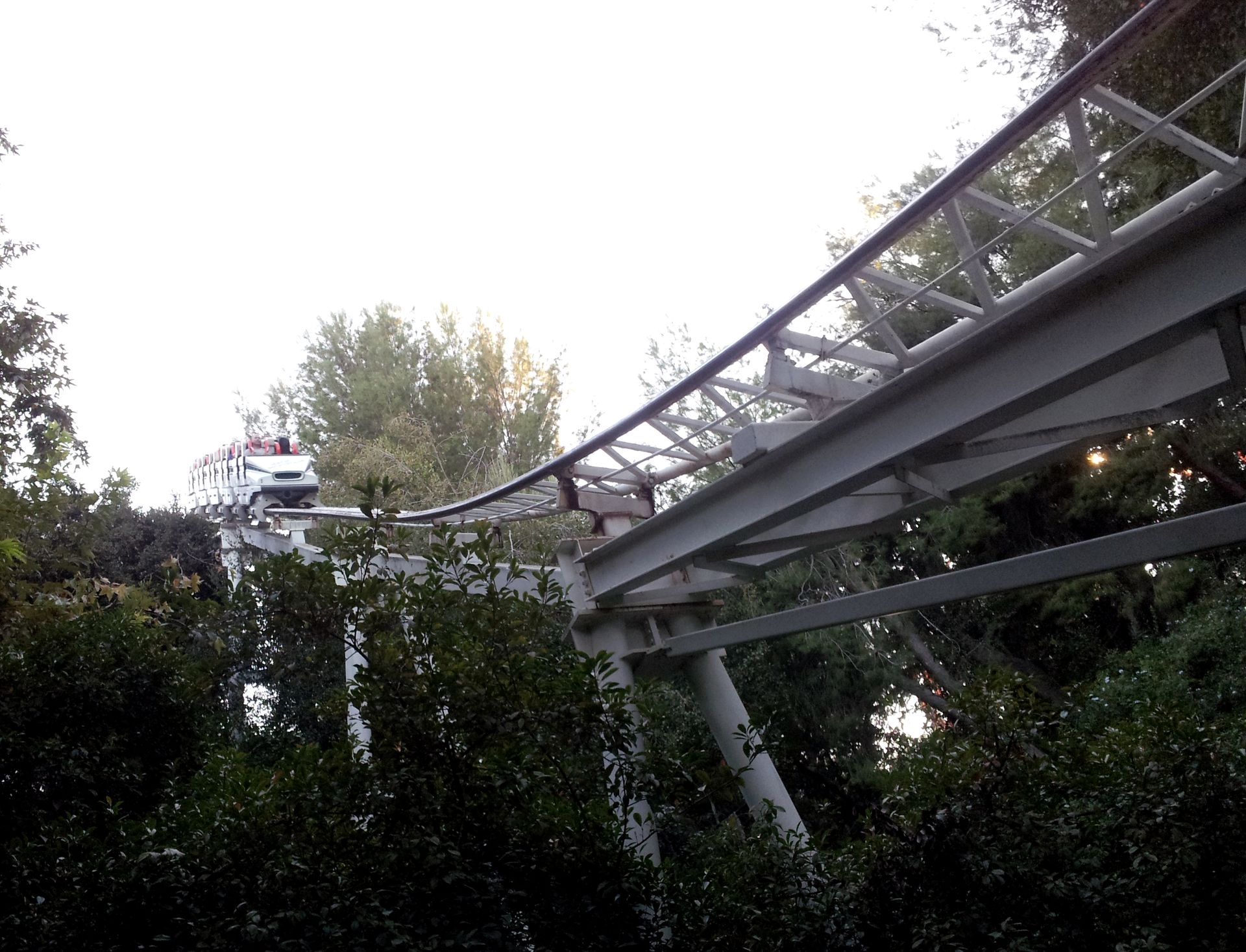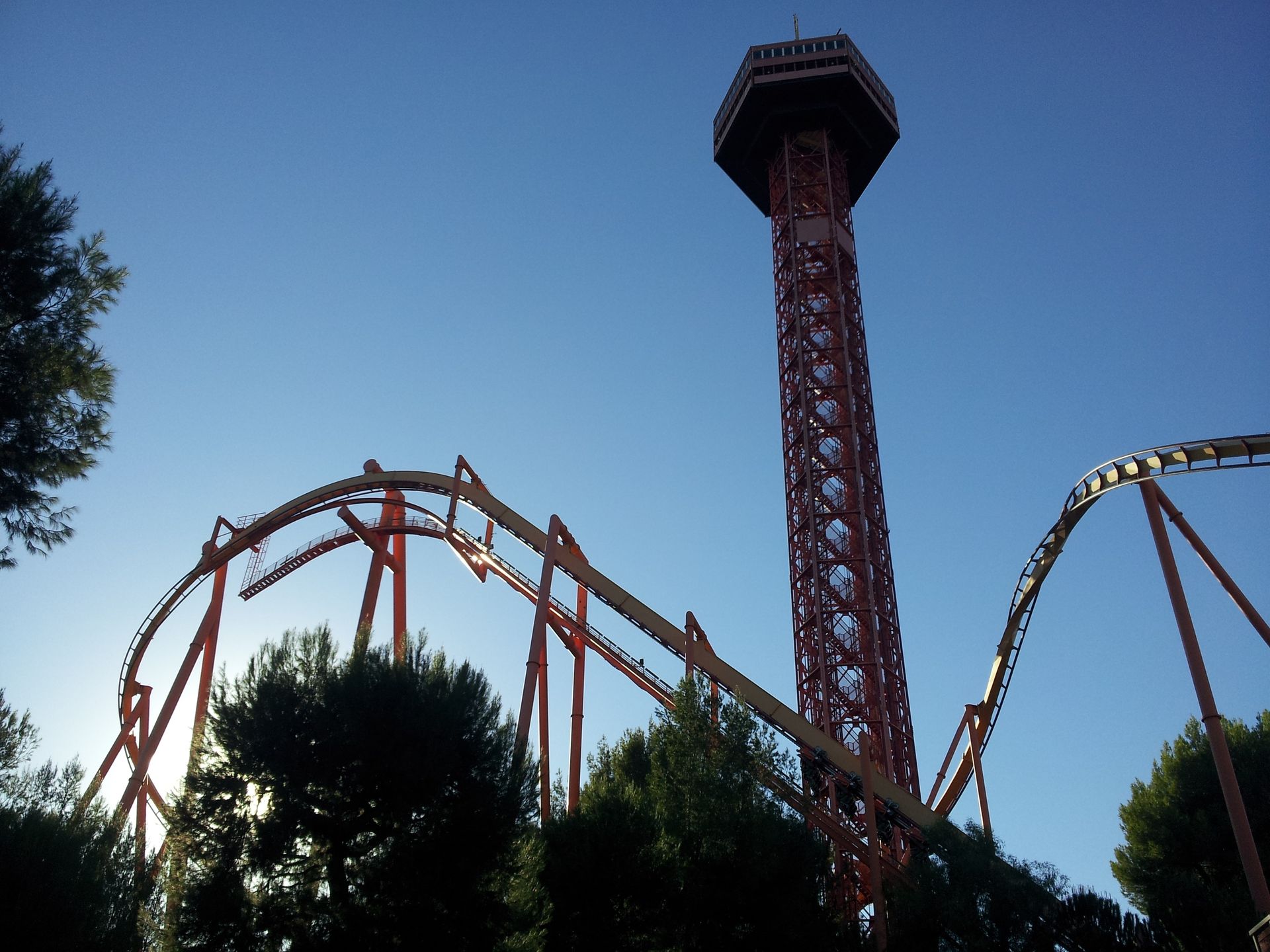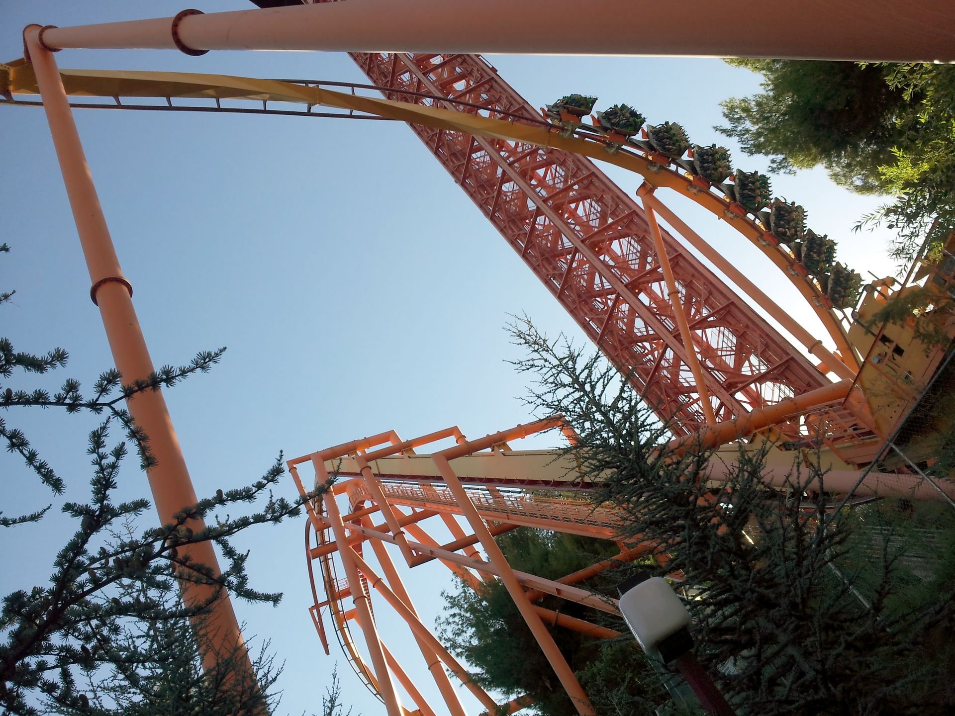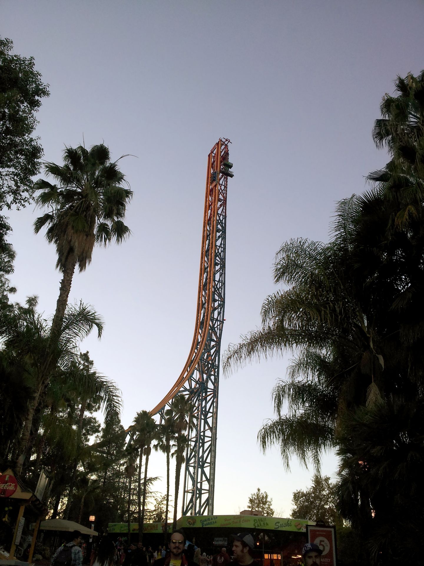 LSM-Antrieb auf die lange Gerade hinaus. Ganze 7 Sekunden braucht der Wagen, um die Zielgeschwindigkeit von 160 km/h zu erreichen. Damit wäre mein persönlicher Geschwindigkeitsrekord vom Vortag schon wieder gebrochen, auch wenn die Beschleunigung bei weitem nicht an die Kraft von Xcelerator herankommt. Schließlich geht es auf den senkrechten, über 120 Meter hohen Turm hinauf, wo der Wagen langsam ausrollt und man mit dem Blick gen Erdboden wieder in die Tiefe rauscht, wo die