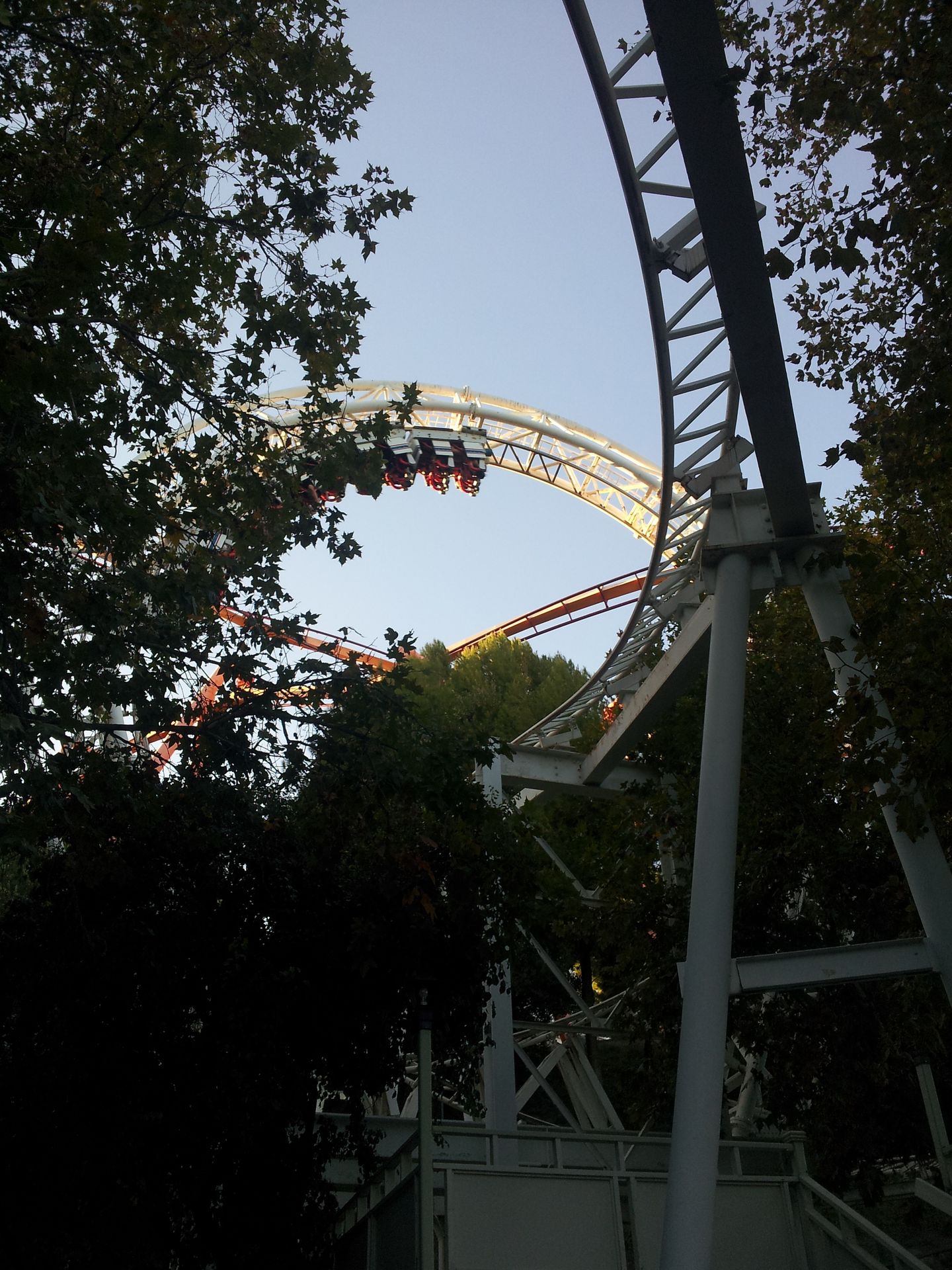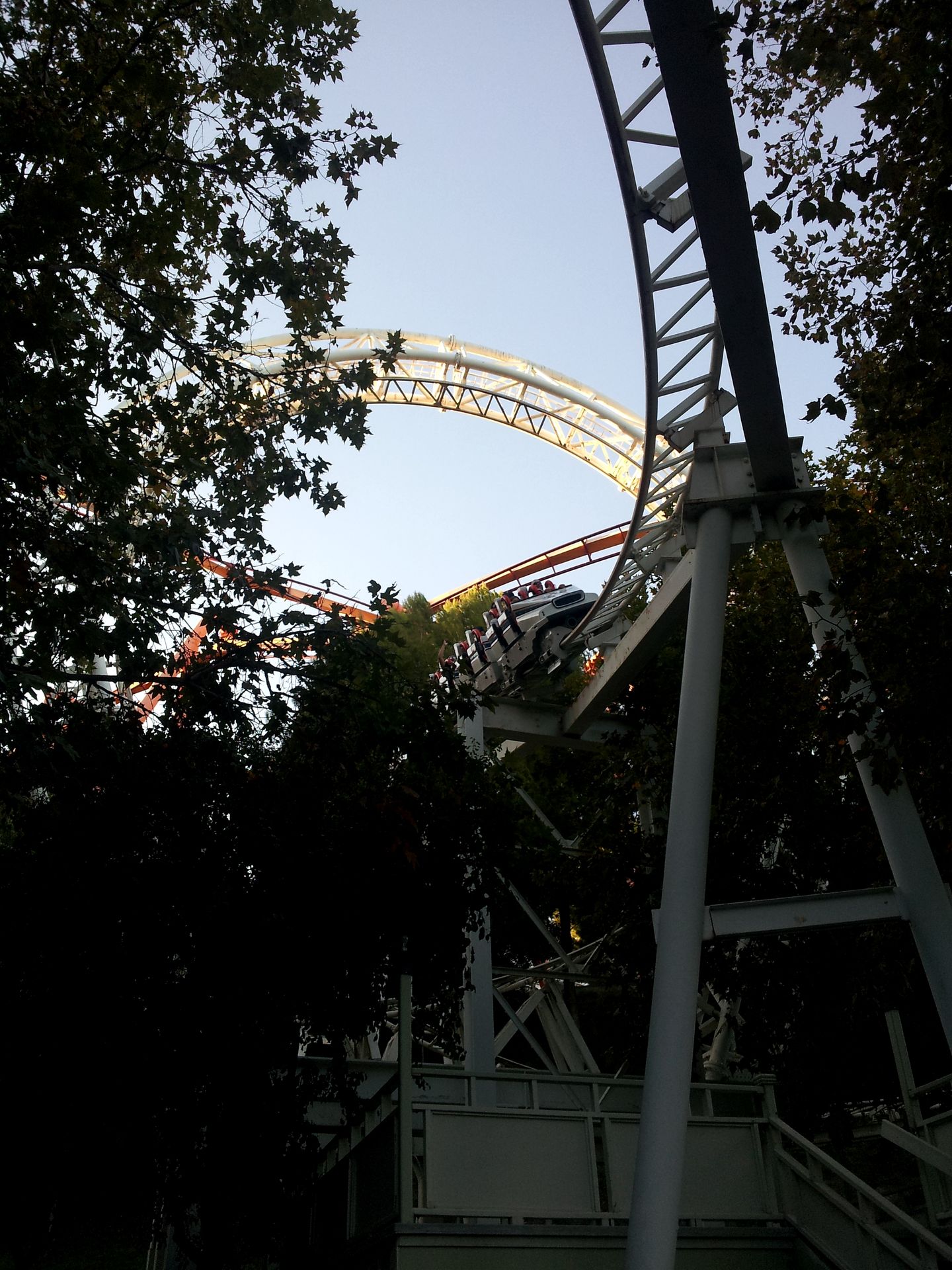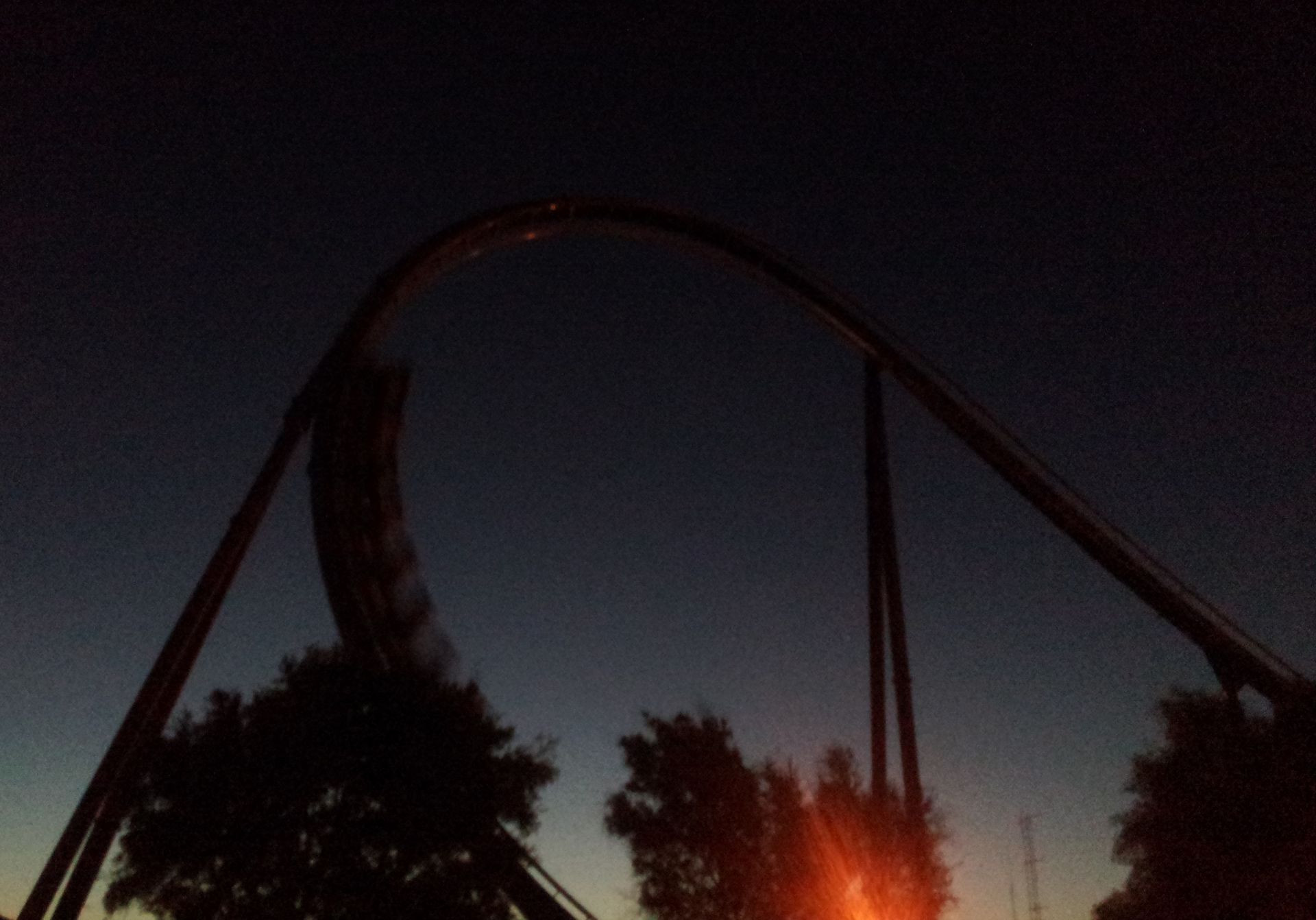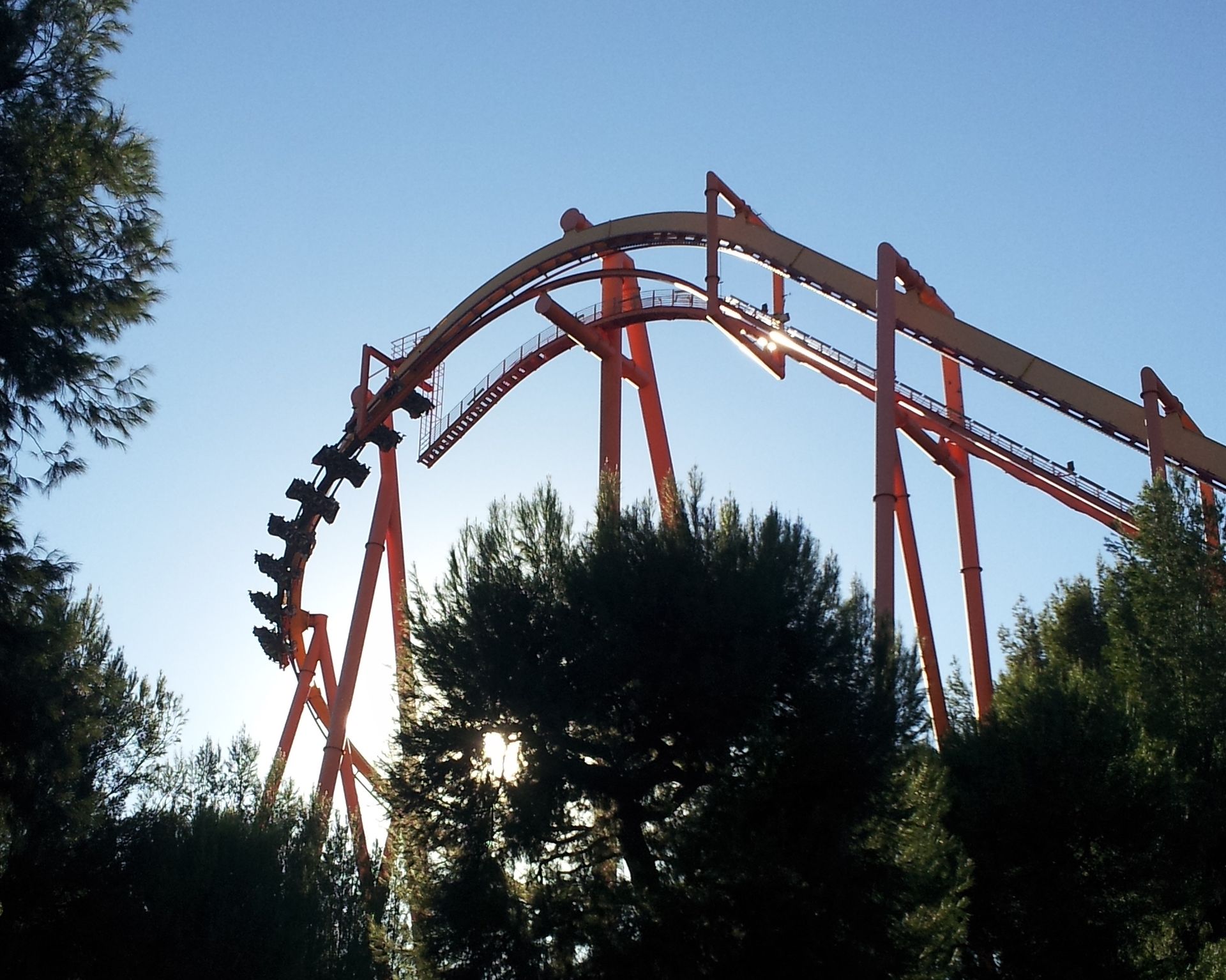 Looping, den ich bisher gefahren bin. Sein Scheitelpunkt befindet sich in einer Höhe von 44 Metern, der Durchmesser entspricht aber denen eines normalen Arrow-Loopings. Über eine hochgelegene Kurve geht es in die beiden Loopings neben dem Lifthill, ehe auch schon die