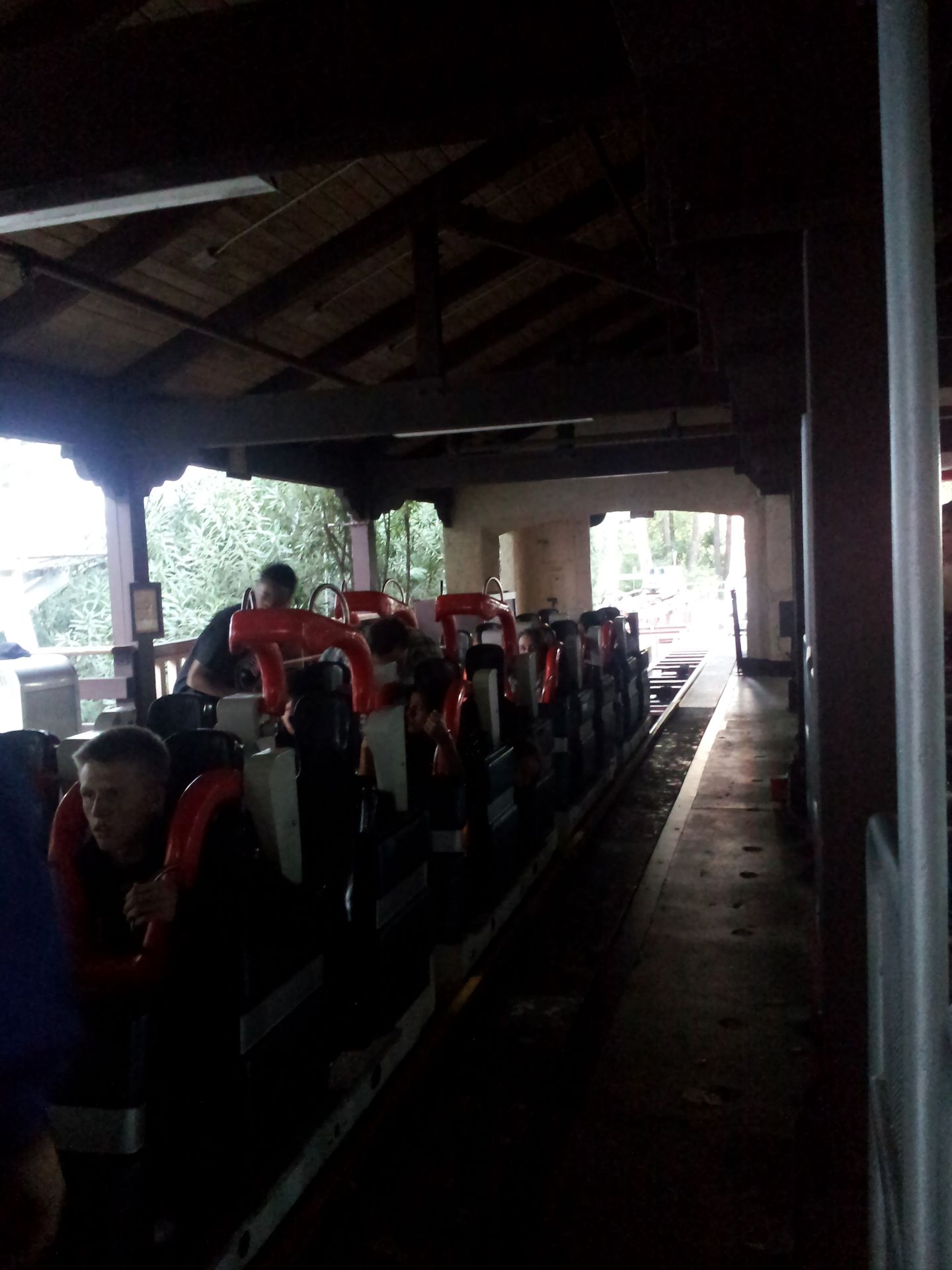 B&M in diesem Park. Nach Flyer, Stand-Up und Inverted wurde hier ein Floorless mit dem Namen Scream! auf einen ehemaligen Parkplatz gestellt. Das ist auch schon einer der Kritikpunkte, denn abgesehen von einigen "Ausbuchtungen" für die "tiefergelegten" Schienenabschnitte ist dieser samt Markierungen noch original erhalten. Auch die Fahreigenschaften empfand ich eines B&Ms nicht mehr so ganz angemessen. Auch wenn das Layout absolut in Ordnung geht und die Wartezeiten wiederum traumhaft waren. Zusammen mit einigen anderen onridern, die wir in der Station getroffen hatten, konnten wir sofort in den beiden hinteren Reihen des Zuges Platz nehmen.