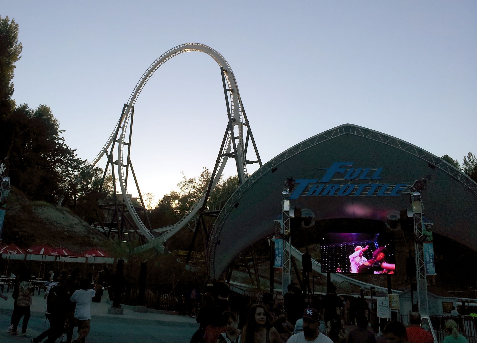 Blockbremse führt. Ein weiterer unvermittelter Drop führt wieder nach vorne, und gleich in den nächsten Drop. Und dann folgt das Finale, bei dem sich die frei schwingende Gondel endlich auch mal überschlägt, ehe die Magnetbremsen sie wieder auf den Boden der Tatsachen zurückholen. Das Konzept dieses Rides ist ja im Grunde recht simpel, aber dennoch genial. Gerade wenn man rückwärts auf die Drops zufährt, kommen diese ohne Vorwarnung und sehr intensiv. Da kann sich so mancher Free Fall Tower ne Scheibe von abschneiden. Nur die Kapazität ist für einen Park wie diesen natürlich absoluter Murks - ebenso wie bei Full Throttle. Aber man braucht ja ein Verkaufsargument für den FlashPass.