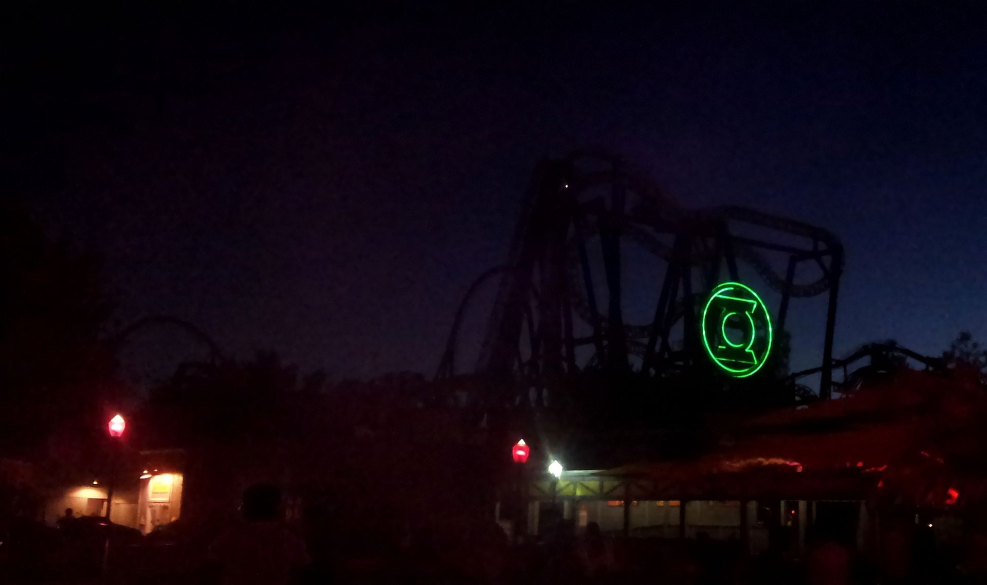 Intamin Ball Coaster Green Lantern war, den Elke auslassen wollte. Und dank der gut einstündigen Wartezeit hatte sie auch genug Zeit, sich in aller Ruhe zu verpflegen. Das Fahrgefühl dieser Bahn - natürlich meine erste dieses Typs - ist wirklich ungewöhnlich. Nach dem Lift fuhr ich das erste Stück rückwärts. Die kleine Senke spürt man noch nicht richtig, aber nach der langen Geraden geht es dann plötzlich ohne Vorwarnung in die Tiefe. Zwei Wellen vorwärts und schon folgt der nächste Sturz mit Richtungswechsel, der in eine