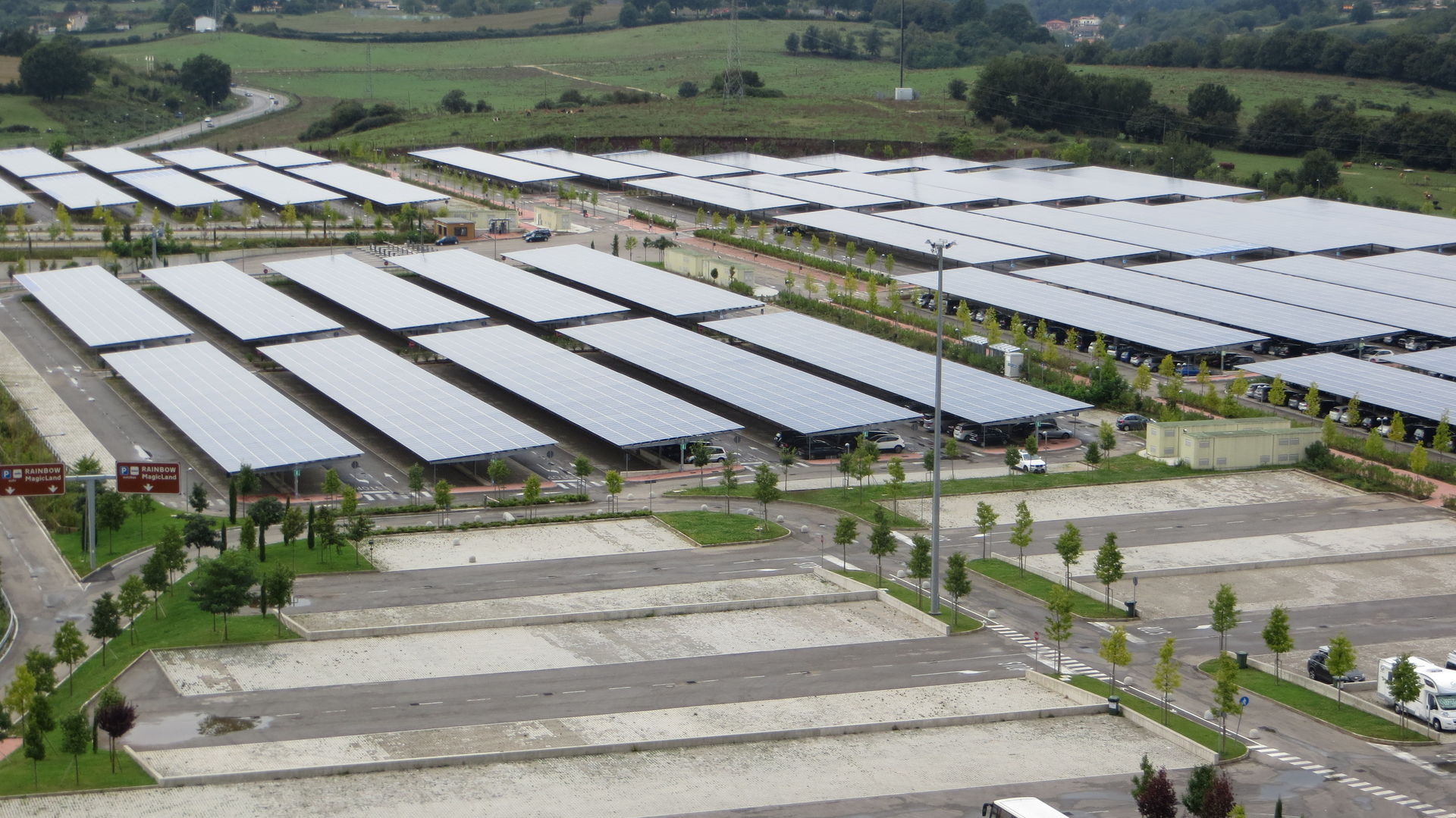 Das Innovativste am Park ist ganz klar der Parkplatz. Man stellt hier sein Auto nämlich unter Photovoltaikmodulen ab. Die Vorteile liegen klar auf der Hand. Sofern man welches hatte, ist auch nach dem Parkbesuch noch Eis in der Kühlbox. Für die PV-Anlage müssen keine zusätzlichen Grünflächen verbaut werden und das Ganze dürfte für den Park einen netten Marketingeffekt haben. Ansonsten fand man hier das gleiche Bild vor wie auf allen anderen italienischen Parkplätzen abseits der von Deutschen besuchten Touristenregionen. Die Rede ist von beschädigten Autos, wo man auch hinschaut, einschließlich der meisten Neuwagen. Man könnte fast meinen, dass in Italien das Auto vor Auslieferung schon einmal gegen die Wand gesetzt wird, als Händlerservice sozusagen.
