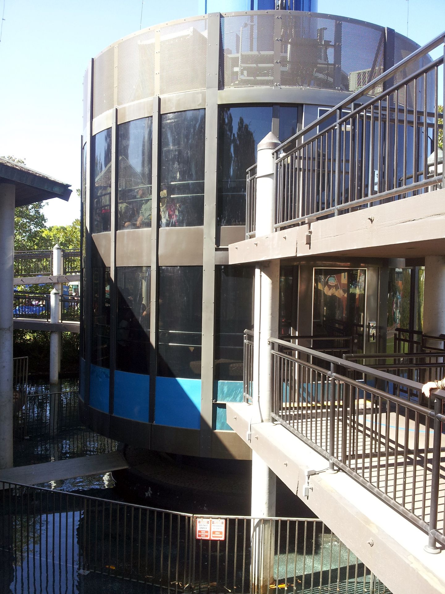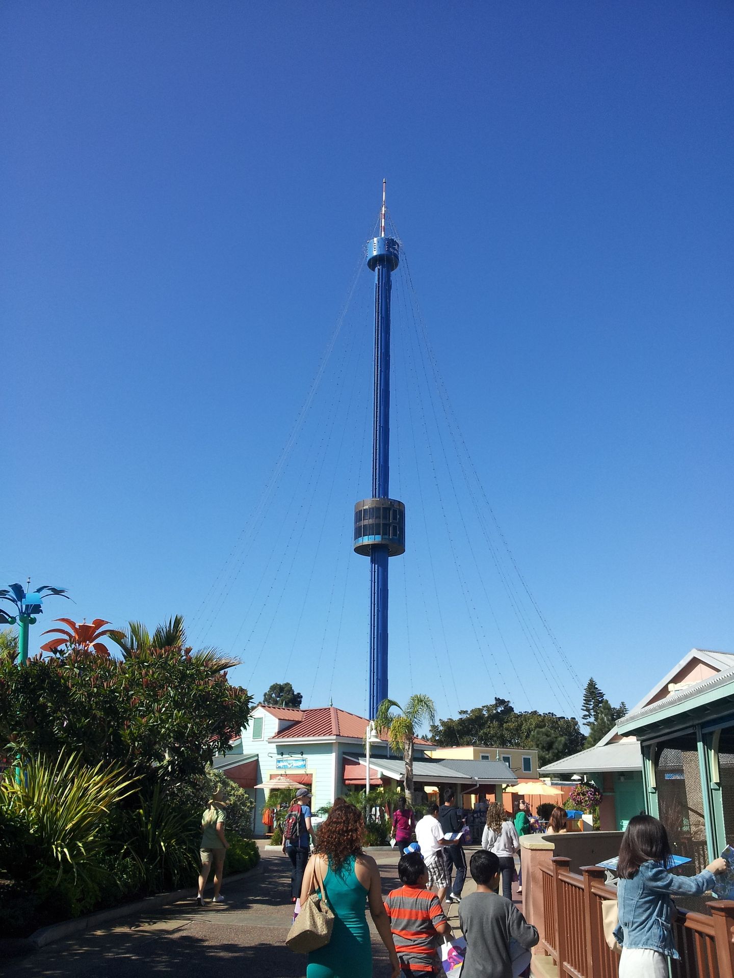 Inzwischen war Elke auch mit dem Mittagessen fertig, und so konnte die Entdeckungstour durch den Park weiter gehen. Weil er gerade in Reichweite war, ich gerne Übersichtsbilder von oben schieße und ich schon immer mal einen doppelstöckigen Aussichtsturm fahren wollte, stellten wir uns beim Skytower an.