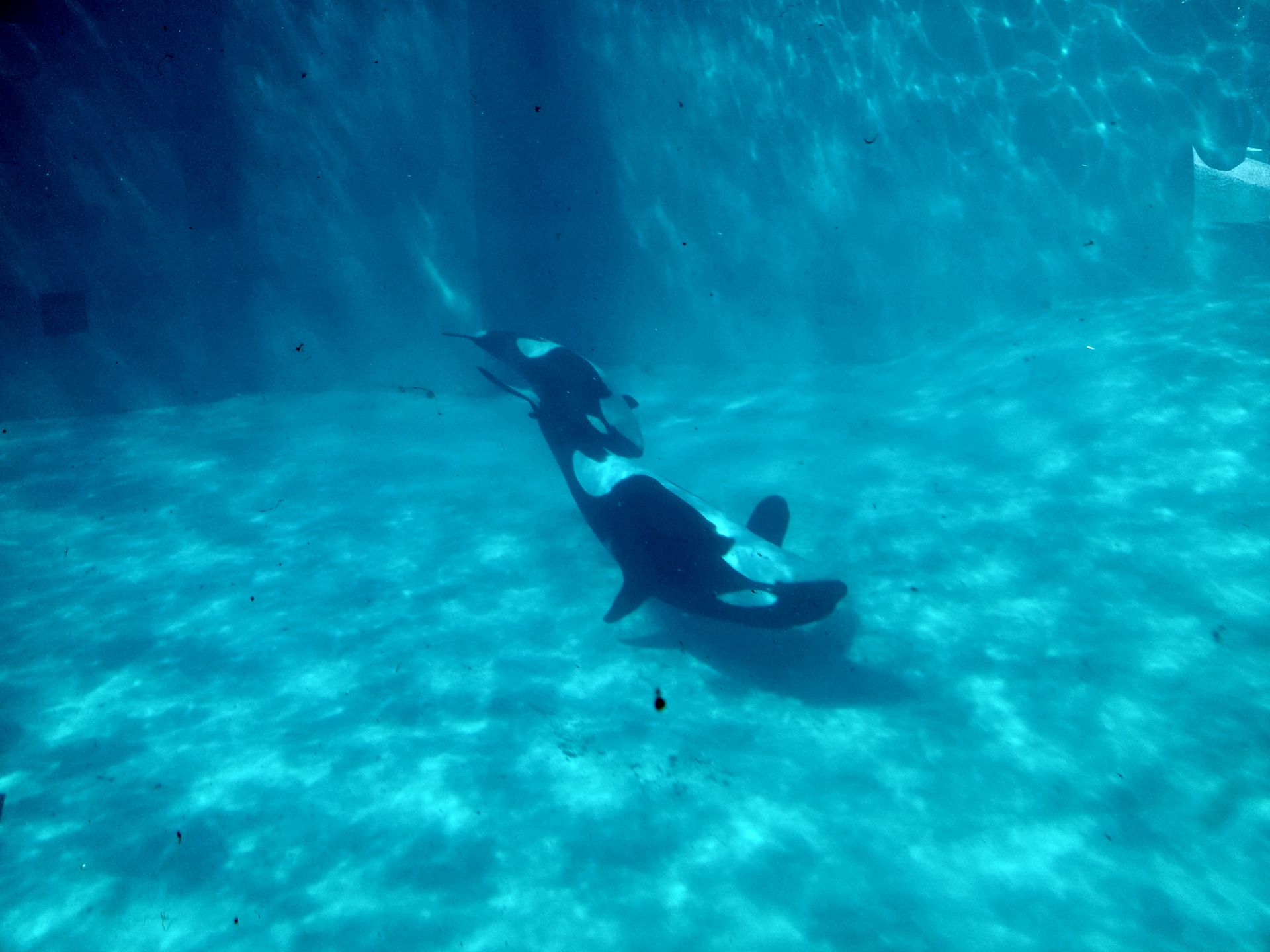 Erst beim Eintauchen ins Wasser zeigen sich Größe und Gewicht der Orcas wieder.