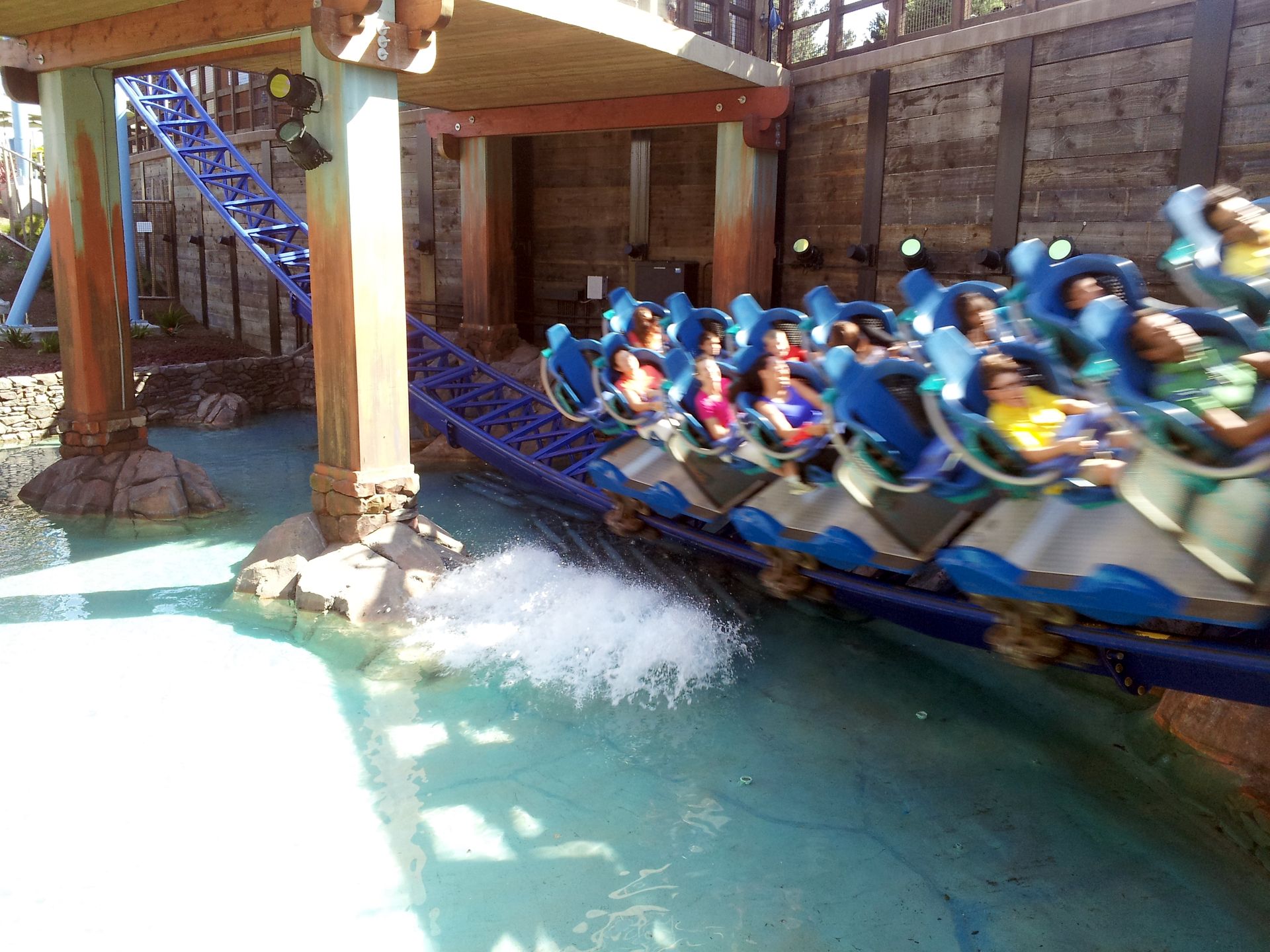 Wartezeit war kaum vorhanden und so stand ich schon bald mit Elke und Michael direkt vor dem Einweiser, der uns natürlich für die Reihen 1 und 2 einteilte. Auf Wasserbahnen bevorzuge ich ja eher die hinteren Plätze, nahm dementsprechend also die zweite Reihe. Michael hatte noch Elektronik bei sich, ging also direkt durch, sodass die erste Reihe an ein Pärchen weitergegeben wurde. Zum Glück, denn nach dem Lifthill und einer langsamen Kurve geht es auch schon in den ersten Drop.