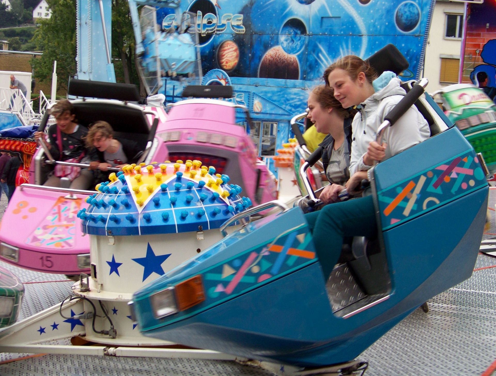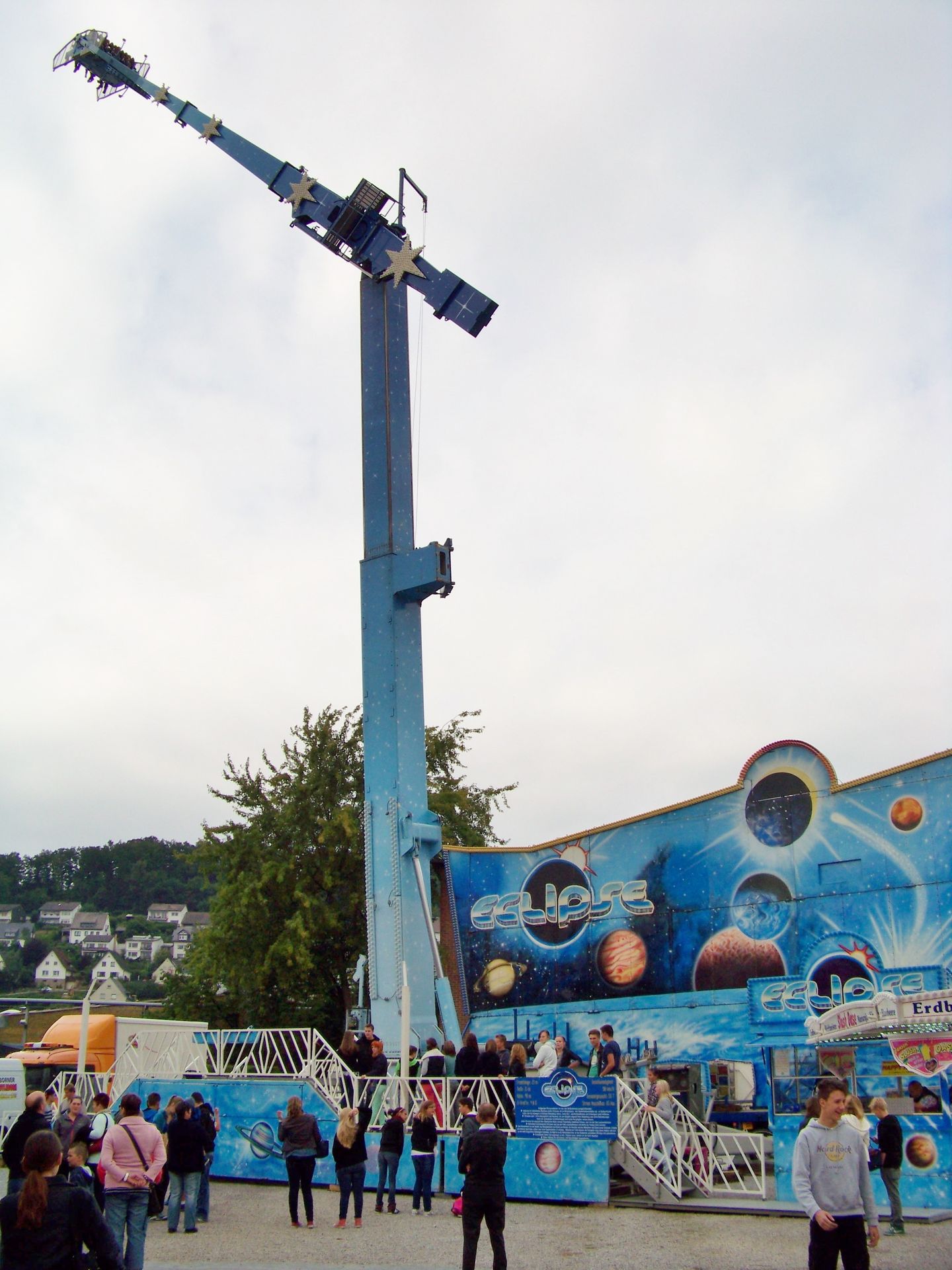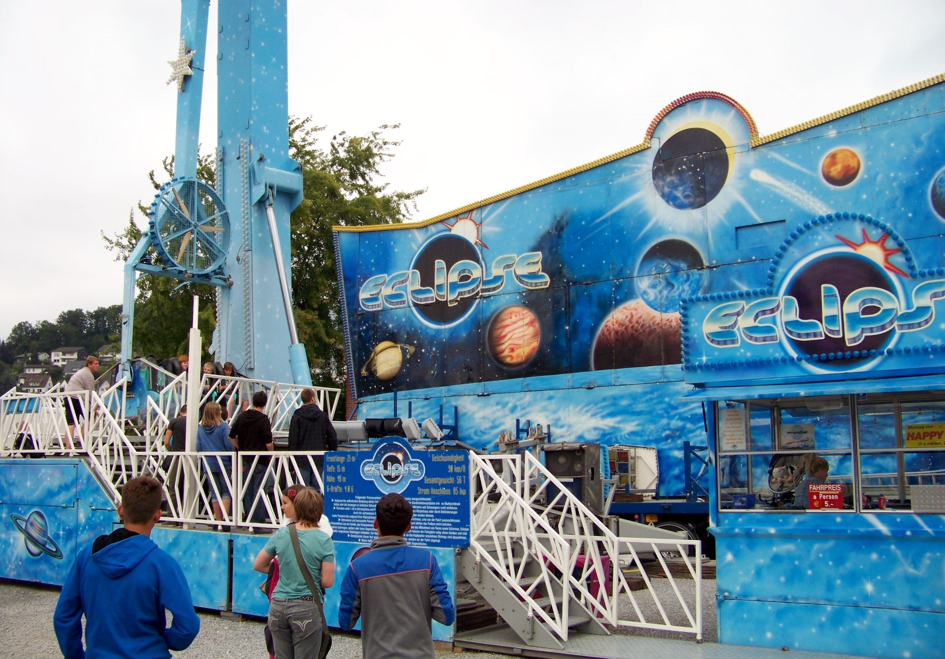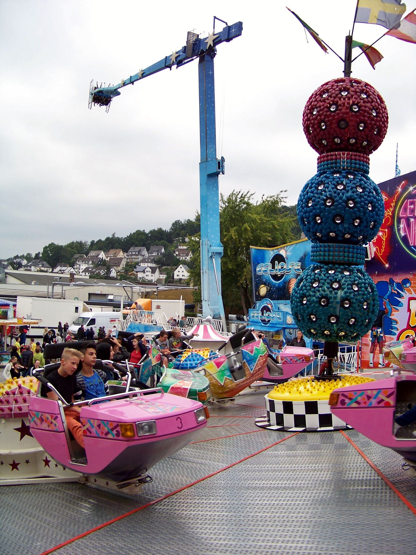 Für die zweite Ausgabe der neuen St.-Georgs-Kirmes konnten ordentliche Zugnummern gewonnen werden, so dass der Wegfall eines langjährigen Stammgeschäftes (Schneiders Flipper) gar nicht so schwer ins Gewicht fiel. Optisches Highlight war natürlich die Eclipse von Korten. Daneben stand als weiterer Gast der Break Dance aus dem Hause Jansen. Schneiders Star Club und der Autoscooter von Isken sind Stammgäste in der Kreisstadt. Leider – wie in Meschede am letzten Kirmestag üblich – war an den Geschäften bereits vieles vorgebaut. Aber immerhin fand der Familientag trotz eher diesigen Wetters guten Publikumszuspruch.