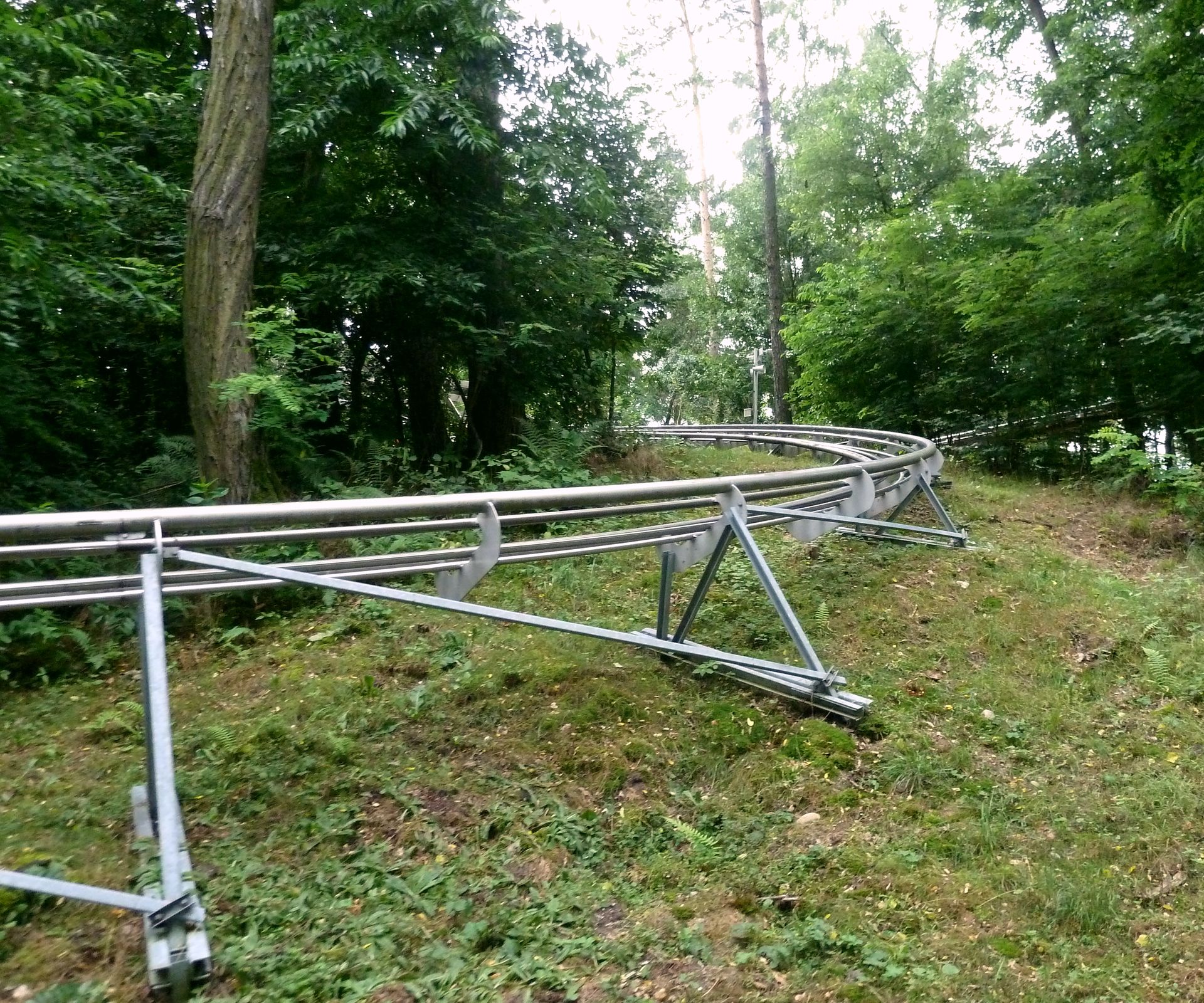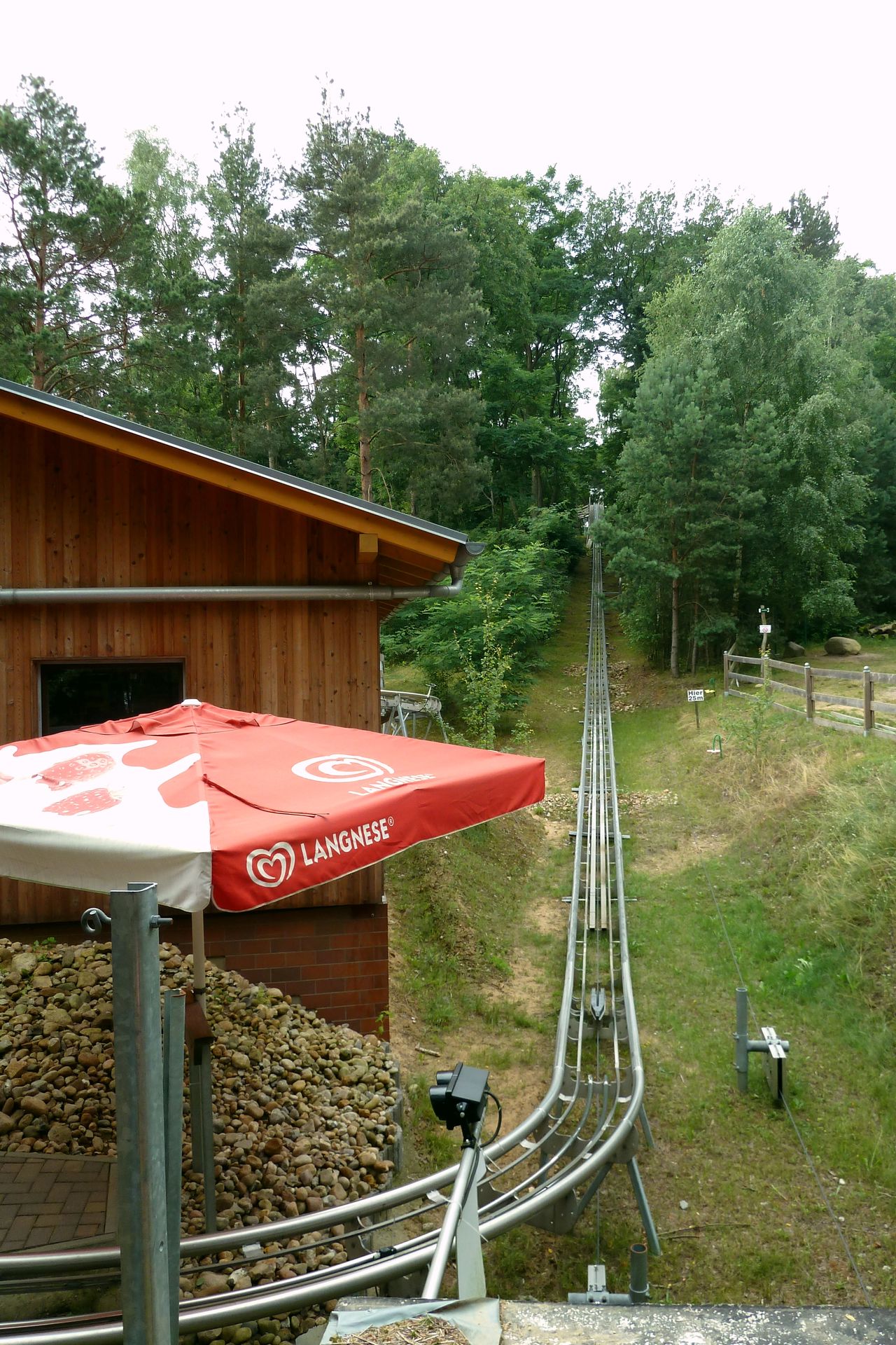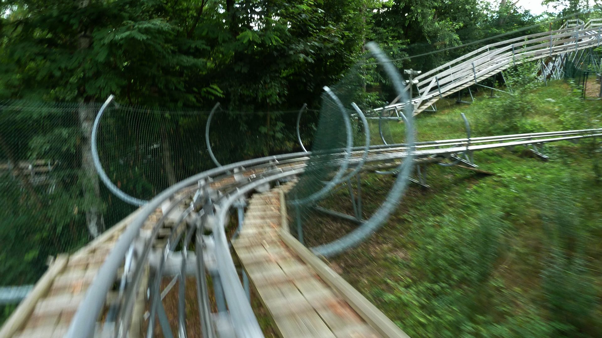Der Hügel, an den die Bahn gebaut ist, ist weder hoch noch steil. Man darf also nicht zu viel erwarten. Die Streckenführung ist trotzdem recht lustig und beinhaltet die Eigenheit, dass man nachdem man quasi wieder unten angekommen ist, nochmal hochgezogen wird. Hierdurch wird die Strecke natürlich doppelt so lang. Außerdem gibt es stellenweise sogar Duelling- und Racing-Elemente. Wirklich nett wenn neben einem öfters die andere Abfahrt auftaucht und dann wieder verschwindet.