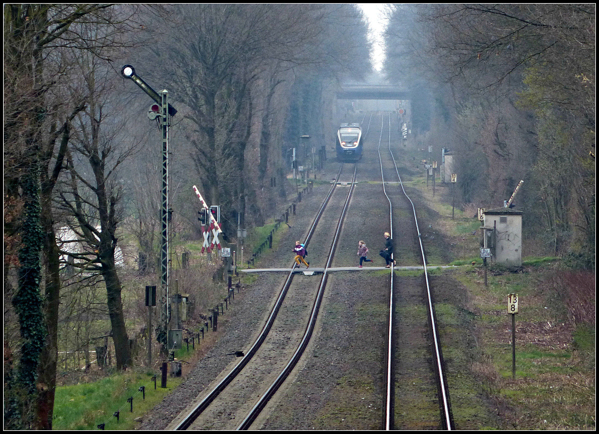 Zum Schluss noch ein Bild, bei dem ich mich frage, in welcher Zeit wir eigentlich leben. Da warte ich bloß auf ein schönes Bahnmotiv und auf einmal huscht noch eine Familie über die Gleise. Dazu vergebe ich die tolle Auszeichnung: Vater des Monats!