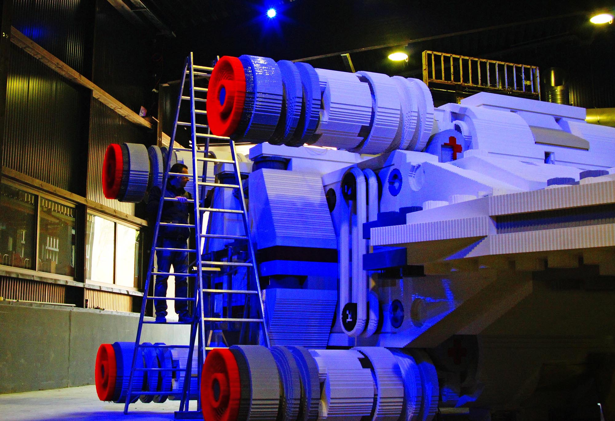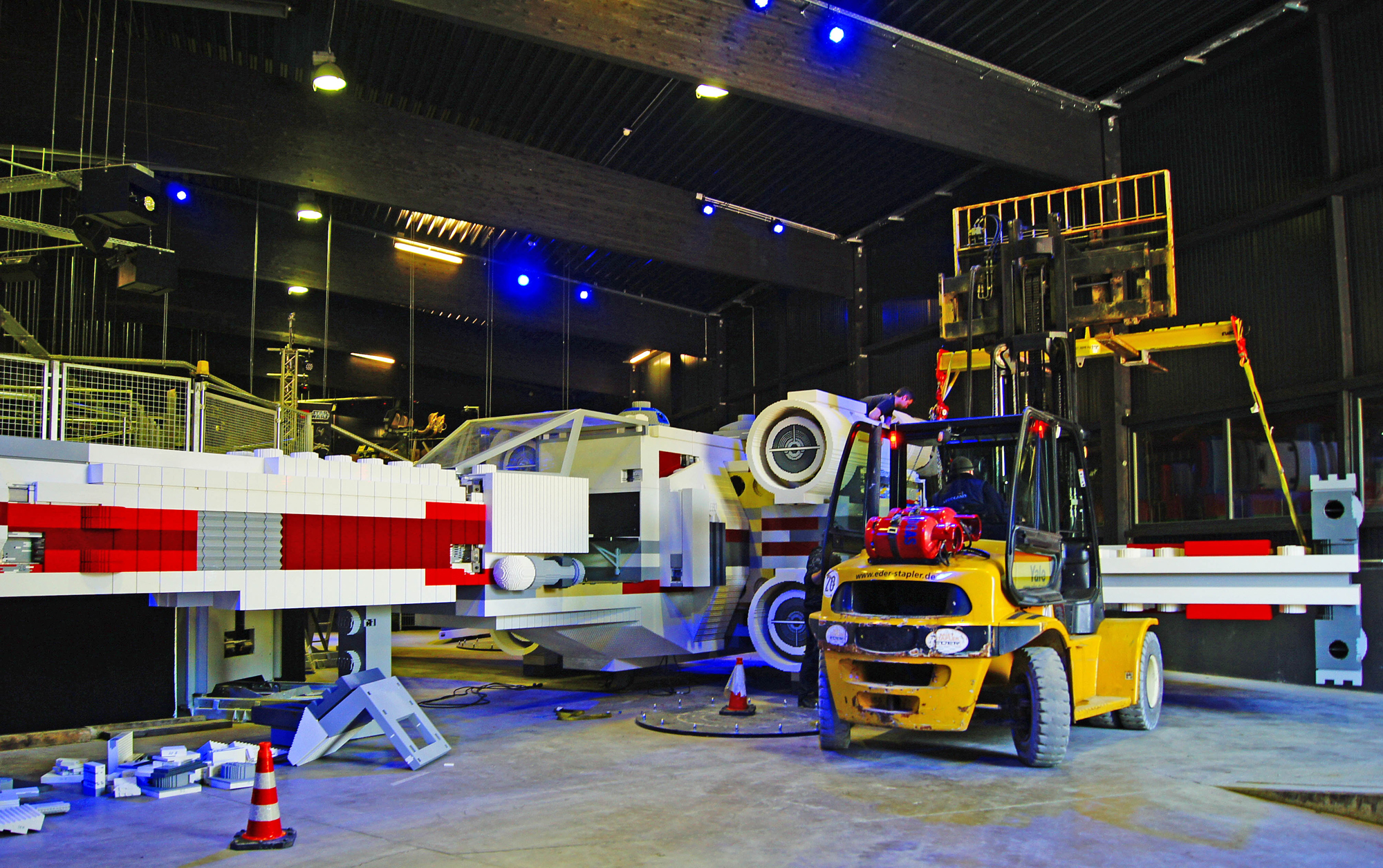 Die Turbinen des LEGO STAR WARS X-Wing Starfighter werden mit dem Gabelstapler in Position gebracht.