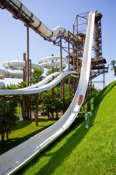 "Sin se auch Deutsche?" in Richtung der anderen gefühlt 17 Menschen im Park, konnten wir zwei absolute Pros für unser Team gewinnen, die praktisch schon ihr ganzes Leben darauf verschwendet haben den Sommerurlaub auf einem der Jesolo-Campingplätze zu verbringen und das vermutlich auch die nächsten Jahrzehnte tun werden. Nachdem man sich seine Fahrt durch das Hinaufbefördern(lassen) des Viererbootes schweißtreibend erarbeitet hat, öffent sich am höchsten Punkt eine Schranke und man wird langsam gen Abgrund geschoben. Was dann folgt ist ein für Wasserrutschen unvergleichliches Erlebnis, ein Drop von dem man meint, dass es ihn eigentlich gar nicht geben kann und darf! Insbesondere auf dem hintersten Sitz wird man durch die vorderen, der Erdanziehungskraft erliegenden Fleischberge ordentlich in die Tiefe gerissen und hebt dabei vielleicht sogar ein bisschen mehr vom Sitz ab als einem lieb ist. Geil!