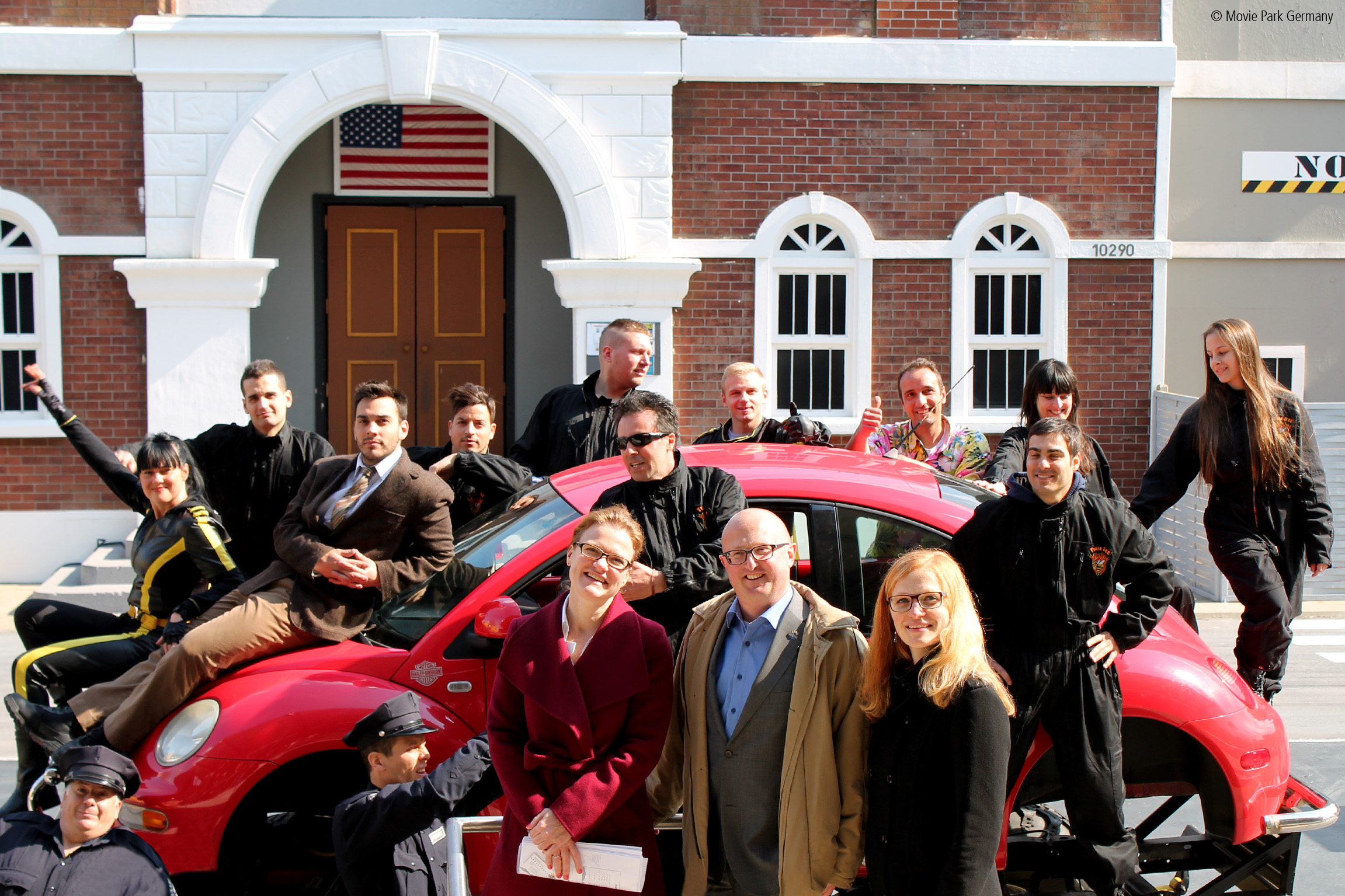 Die neue Stuntcrew „Stuntmanshow“ sowie (vorn v.l.) Moira Casey (Director Marketing & Sales), Geschäftsführer Wouter Dekkers und Pressesprecherin Jessica Demmer freuen sich auf die kommende Saison von Movie Park Germany.