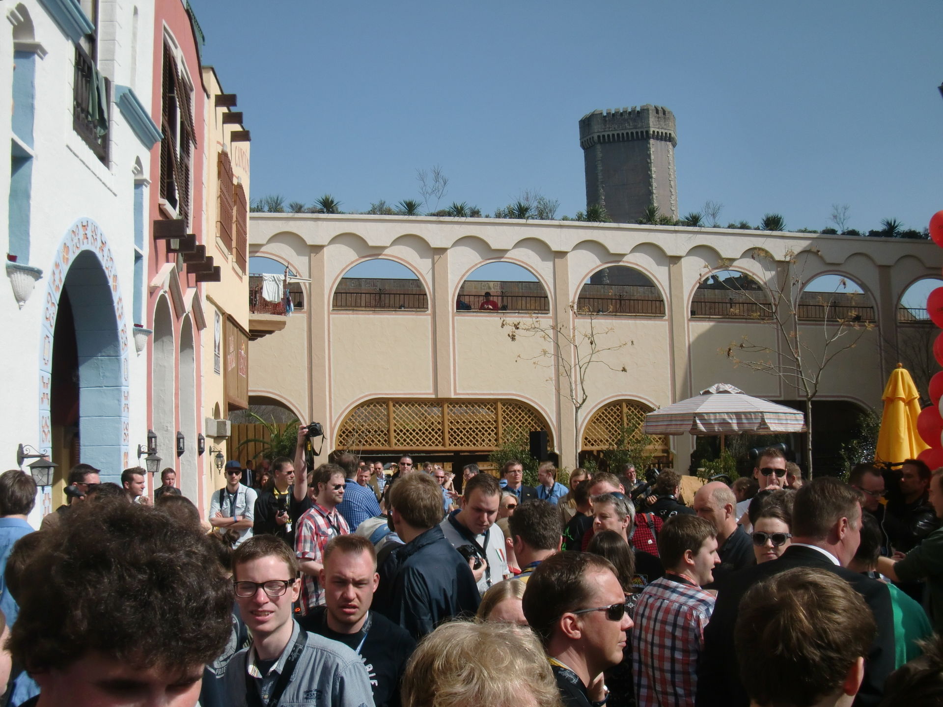 Gleich nach Öffnen des Tores strömen die Massen gen Eingang und in die Warteschlange, welche zunächst über den großen Drop führt