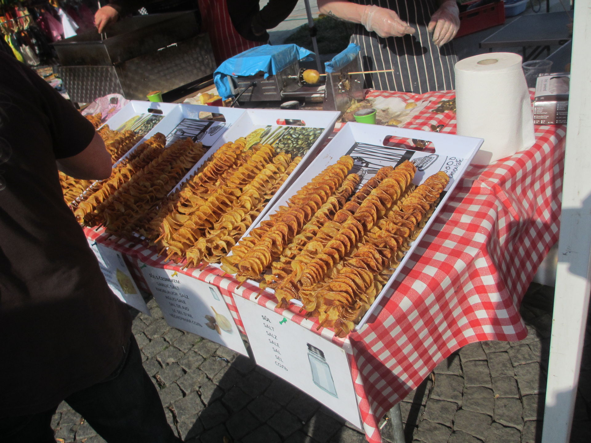 Zwischendurch überall Fressstände, wie hier die frisch produzierten und auf Spiessen aufgereihten Kartoffelchips. Pommes Frites sucht man auf dieser Kirmes vergeblich.