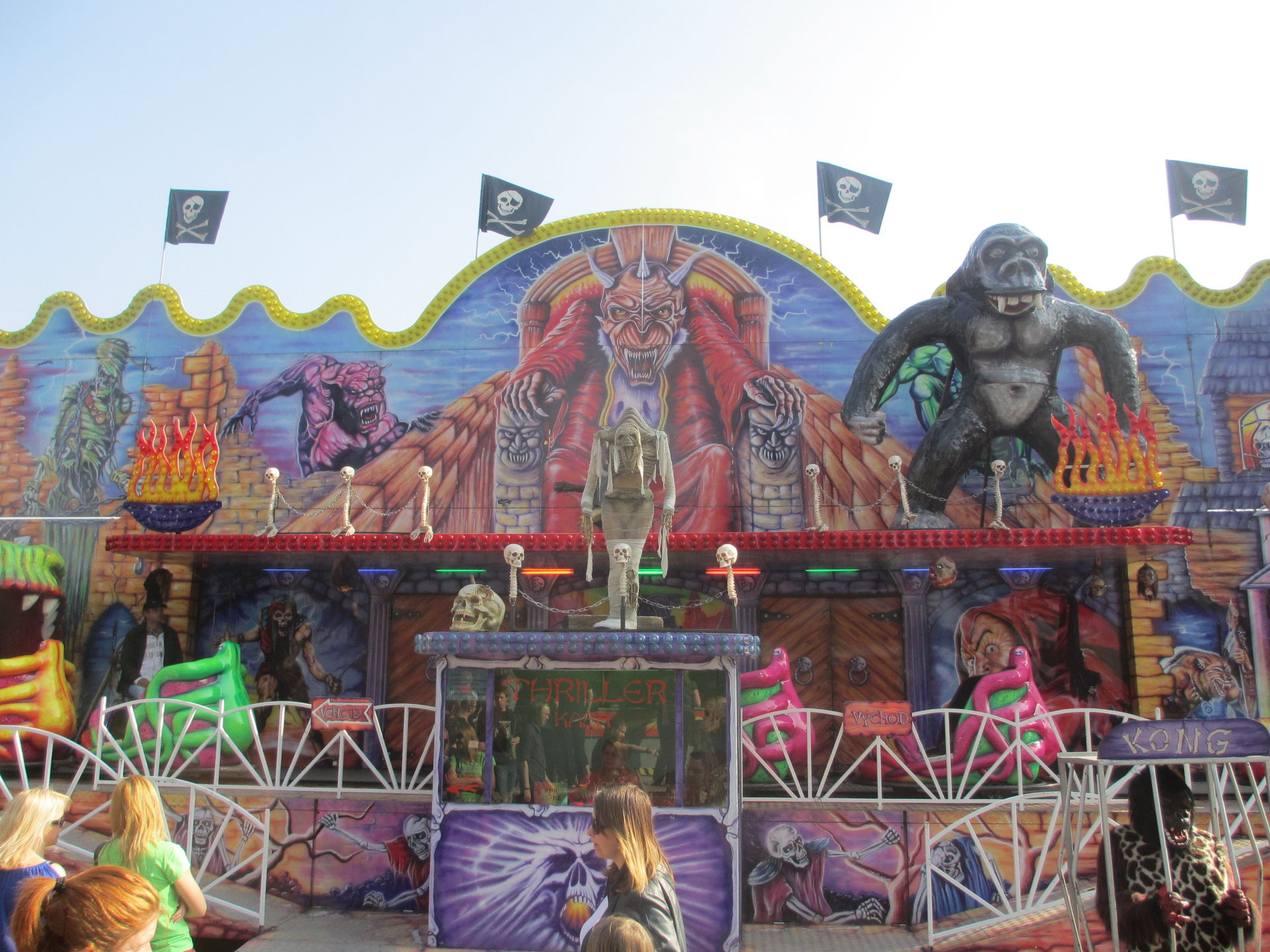 Die Geisterbahn finden wir zu klein, um ihr einen Besuch abzustatten. Hinter der Front befindet sich ein Raum von der Größe eines Containers. Da bleiben wir lieber draußen und strahlen mit der Sonne um die Wette ob der fantastischen Stimmung, die diese Kirmes in uns erzeugt.