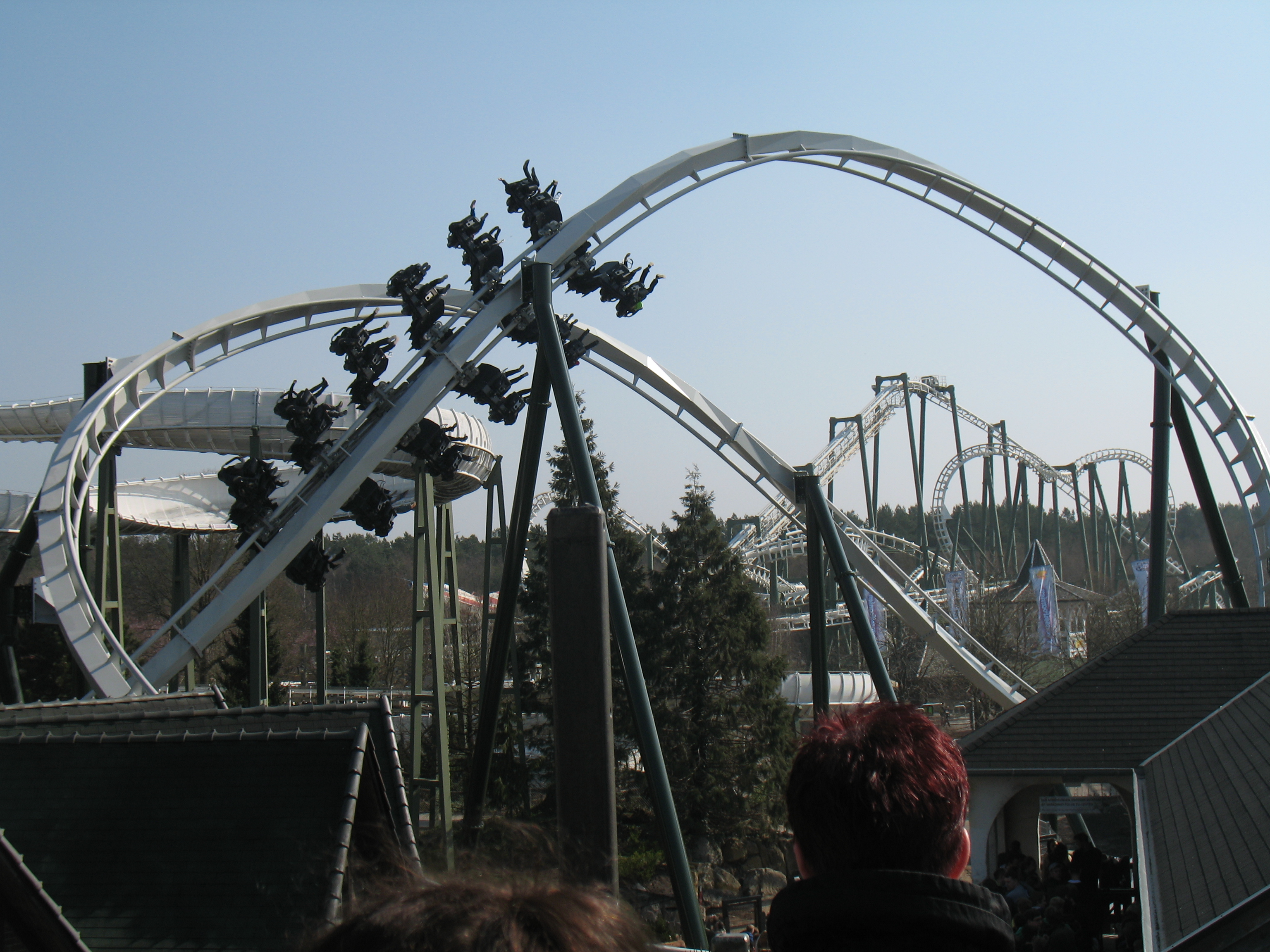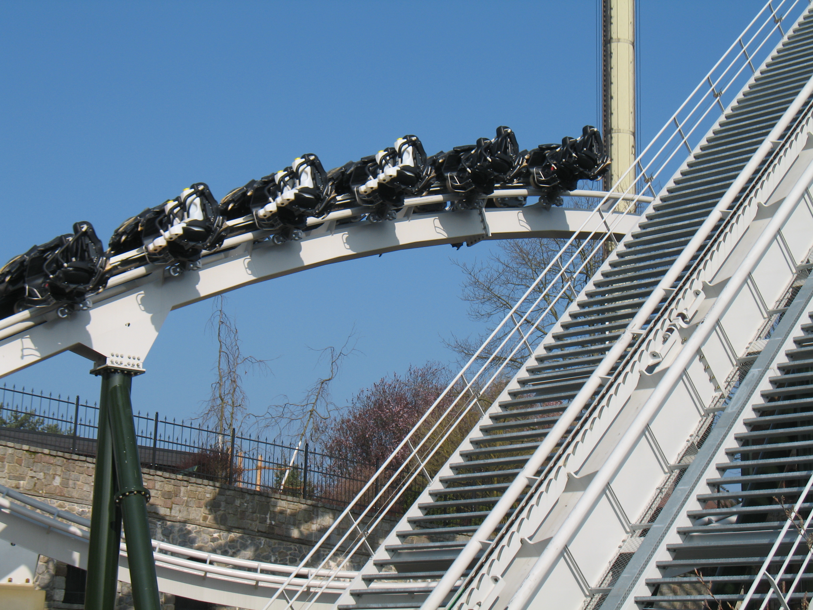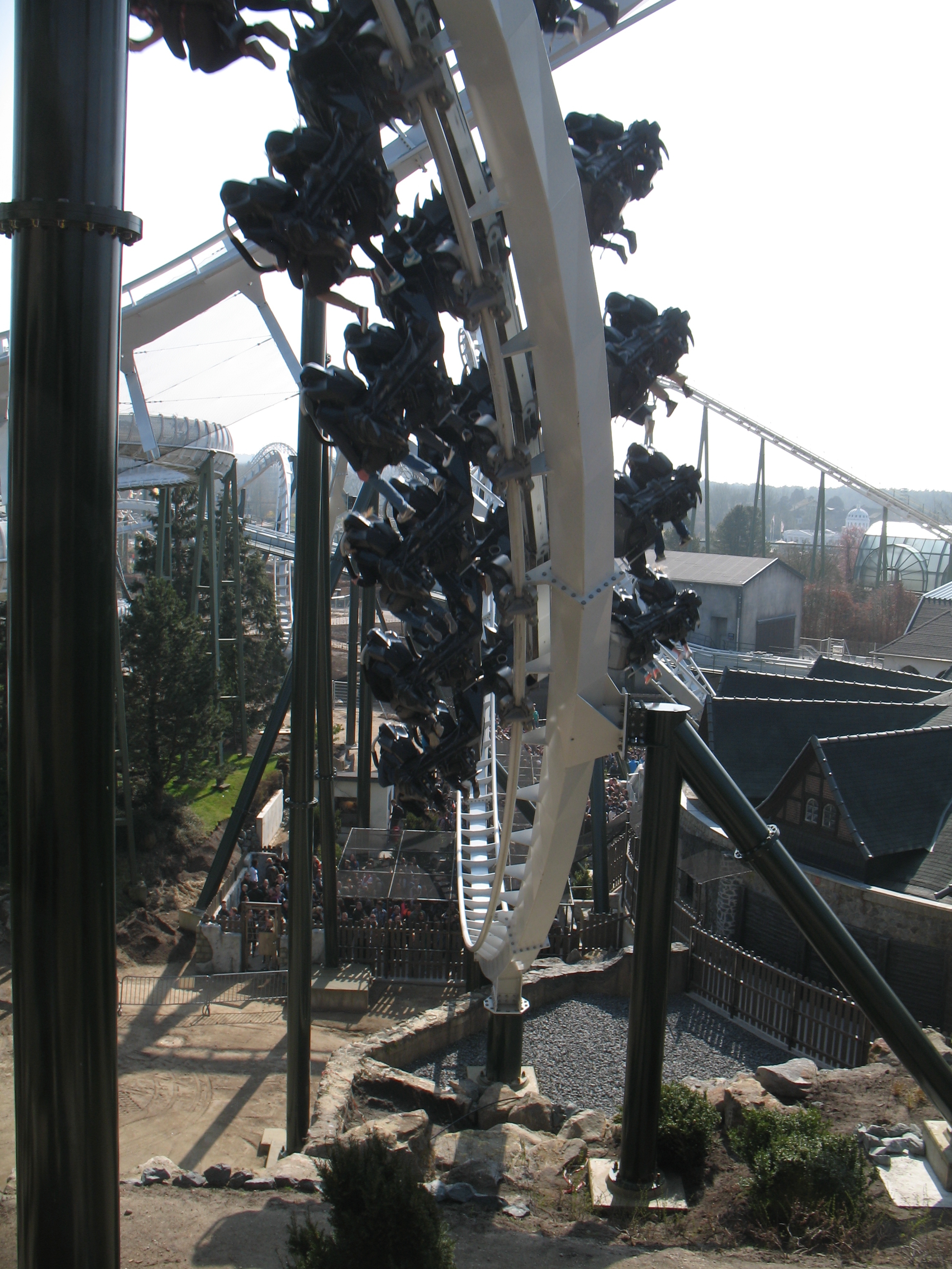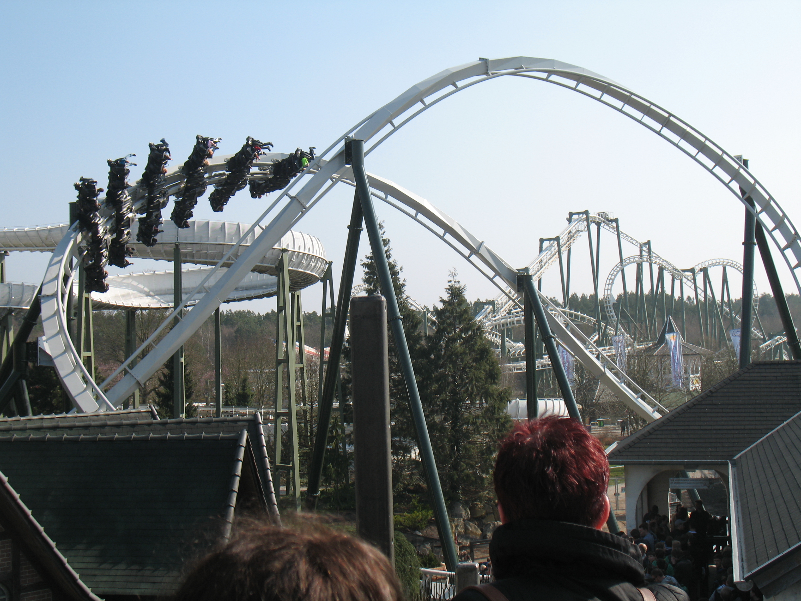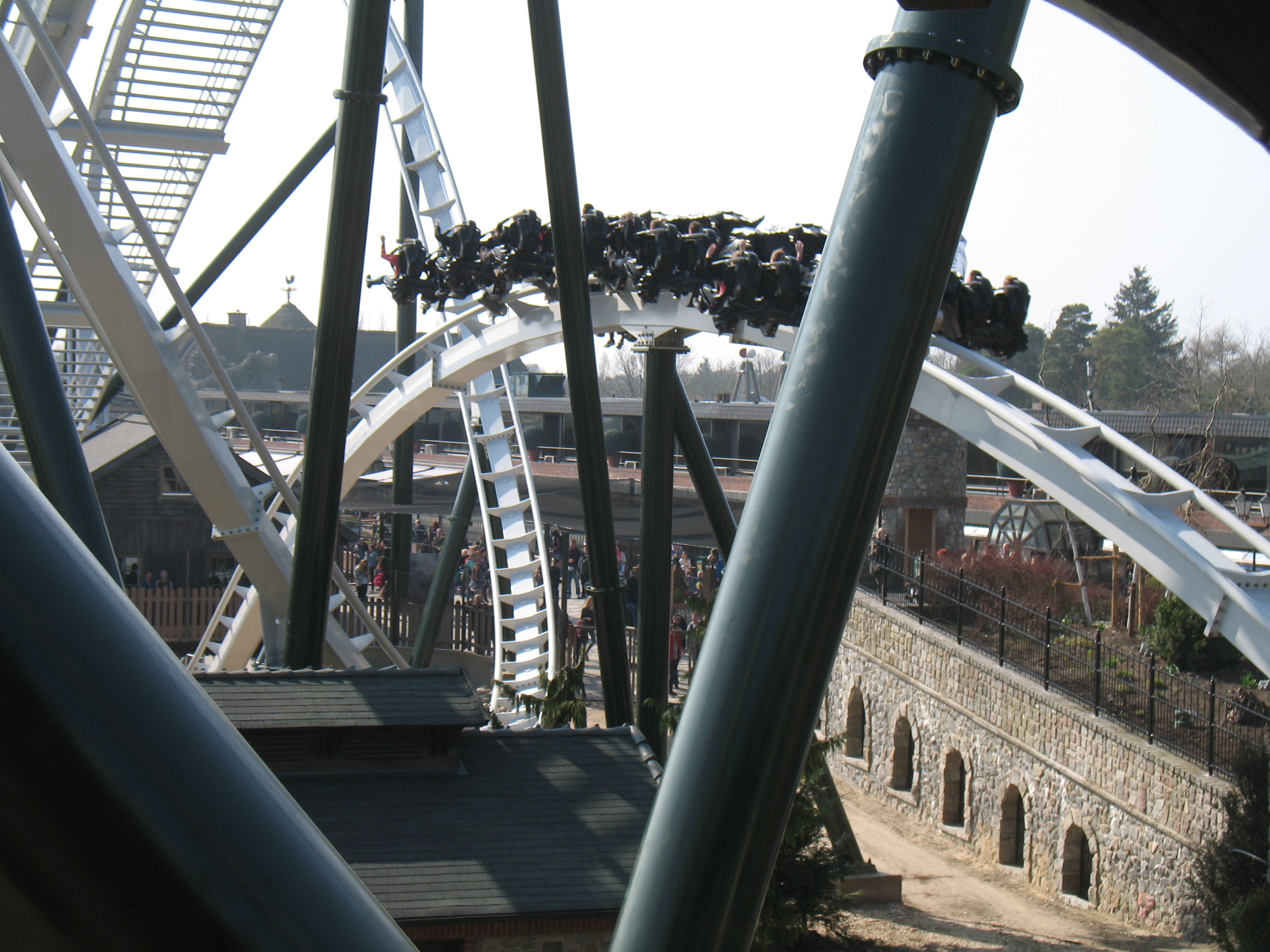 Immelmann, der einen sehr guten Blick der vorbeilaufenden Besucher auf den fahrenden Zug erlaubt. Mit viel Schwung (und wieder leichten Vibrationen) im Tal begonnen könnte es am höchsten Punkt mit etwas mehr Geschwindigkeit vorangehen, denn hier hat man zum ersten Mal etwas Hangtime. Nach der Ausfahrt geht es dann wieder mit dem Kopf nach oben unter dem