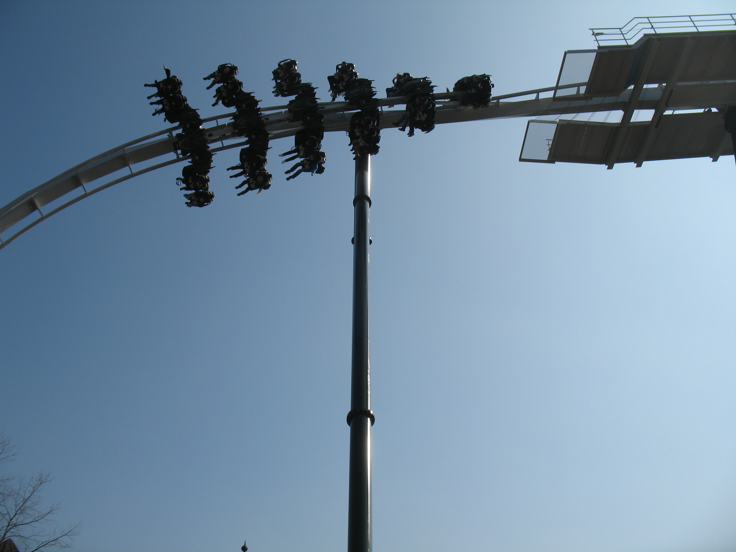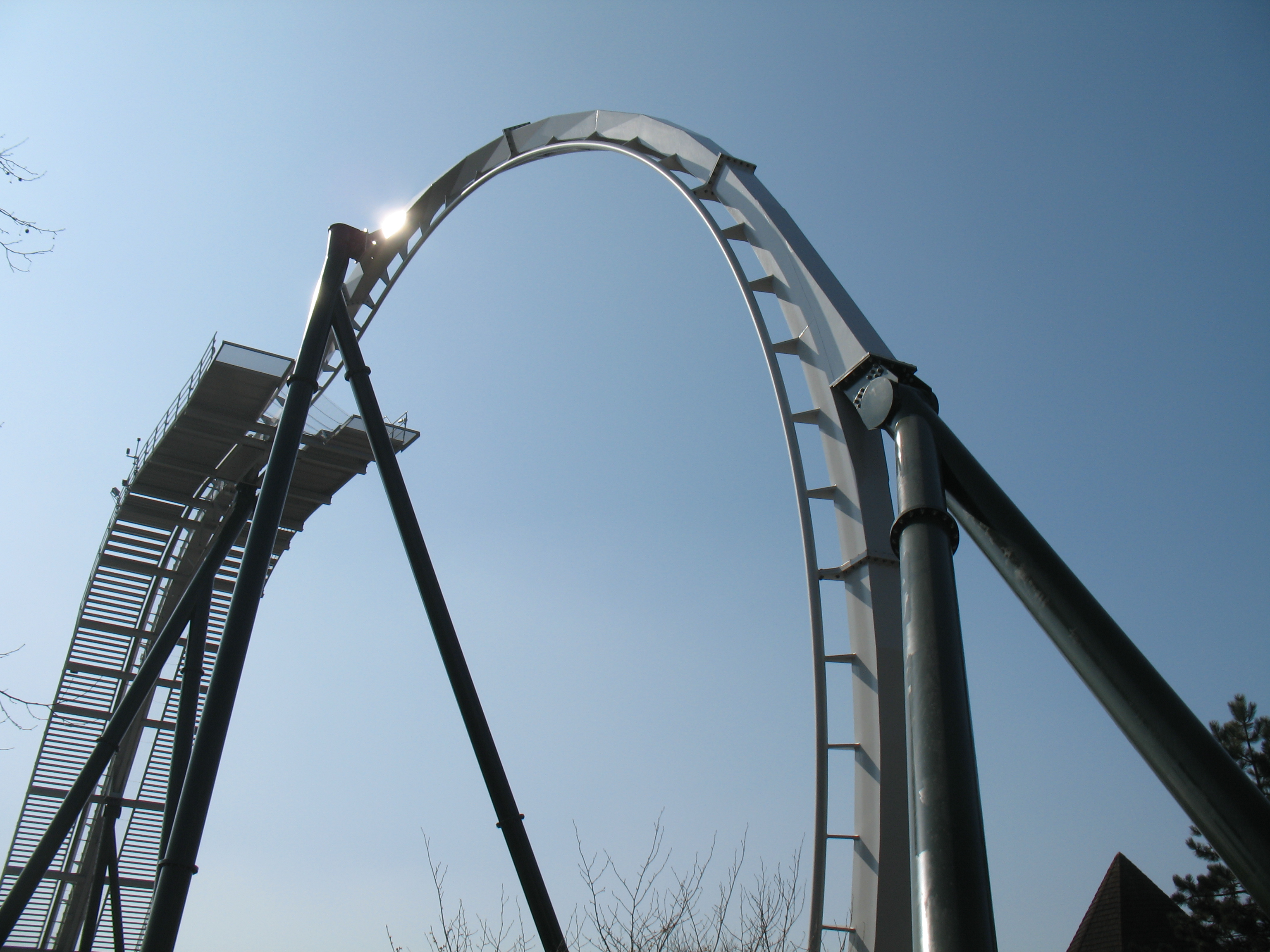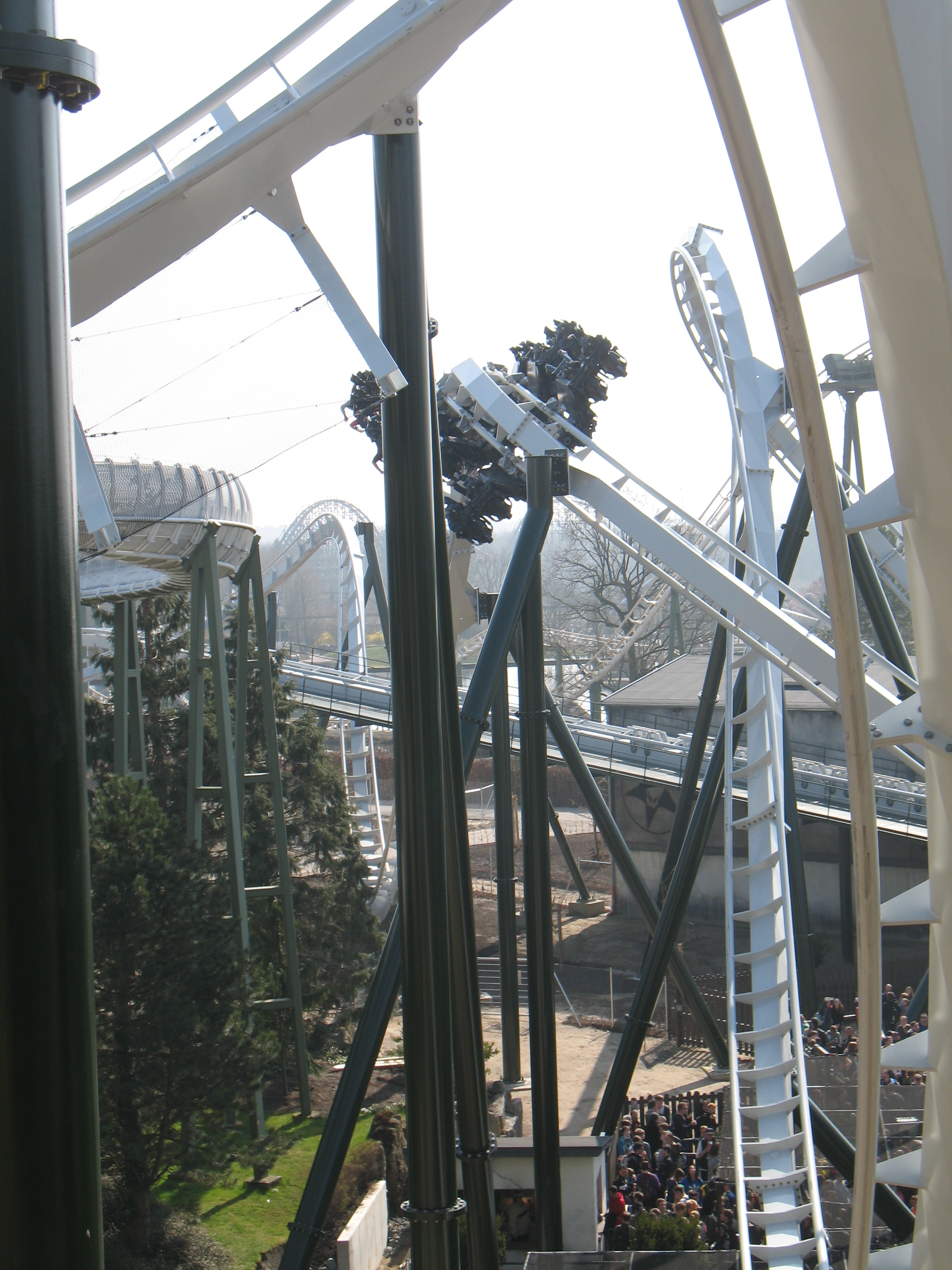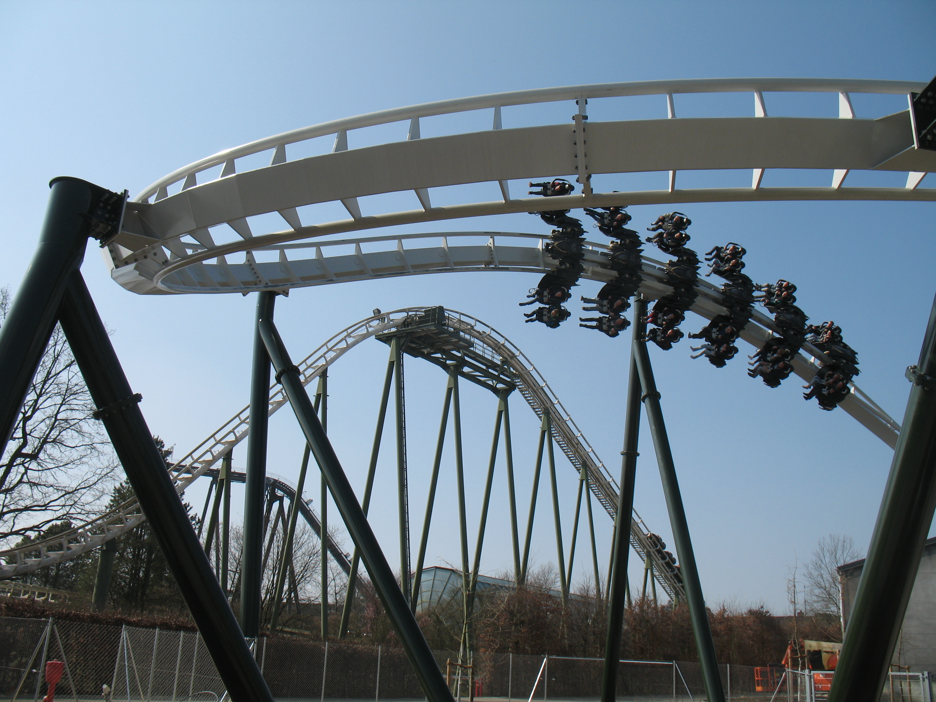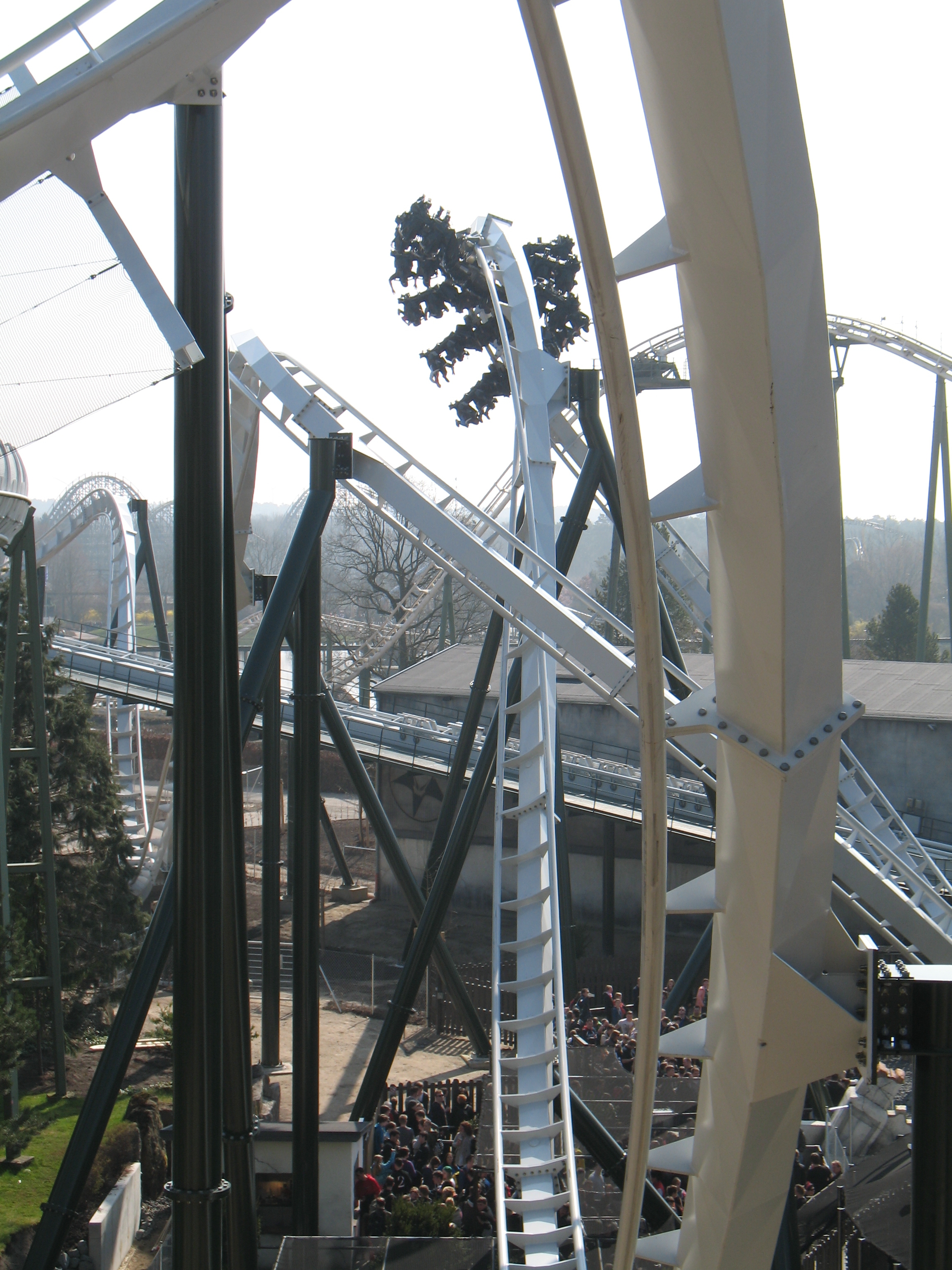 Immelmann, der einen sehr guten Blick der vorbeilaufenden Besucher auf den fahrenden Zug erlaubt. Mit viel Schwung (und wieder leichten Vibrationen) im Tal begonnen könnte es am höchsten Punkt mit etwas mehr Geschwindigkeit vorangehen, denn hier hat man zum ersten Mal etwas Hangtime. Nach der Ausfahrt geht es dann wieder mit dem Kopf nach oben unter dem