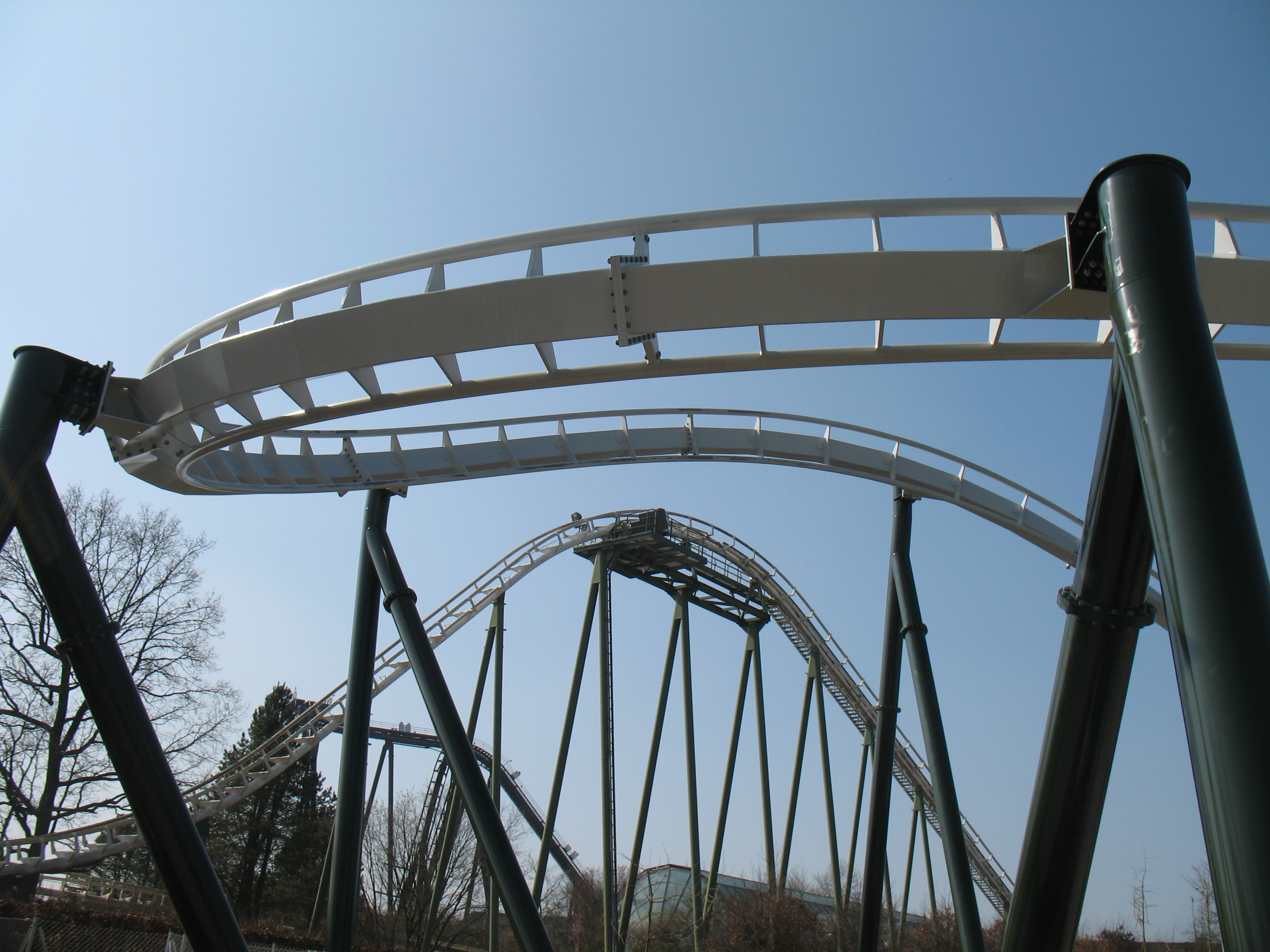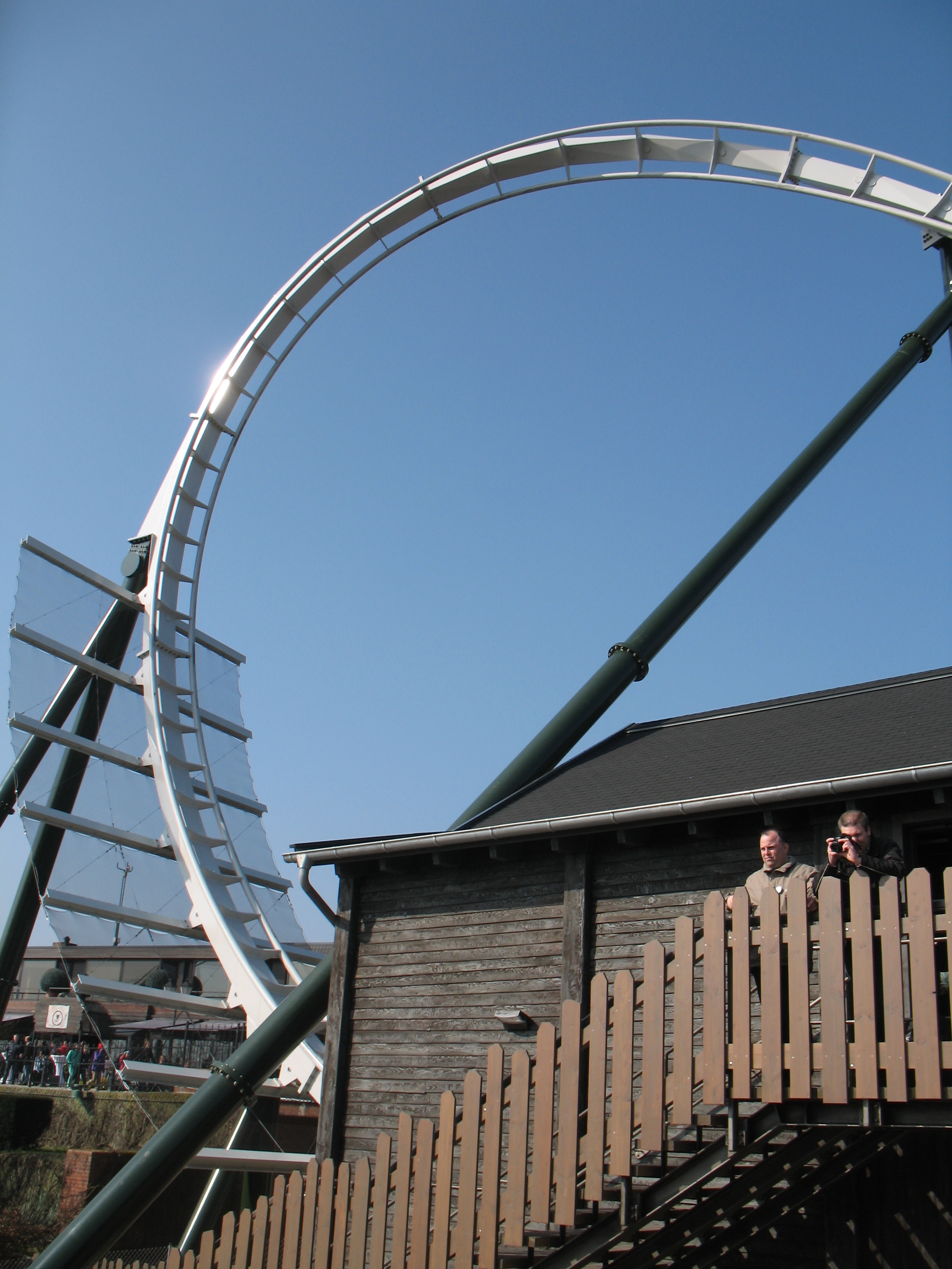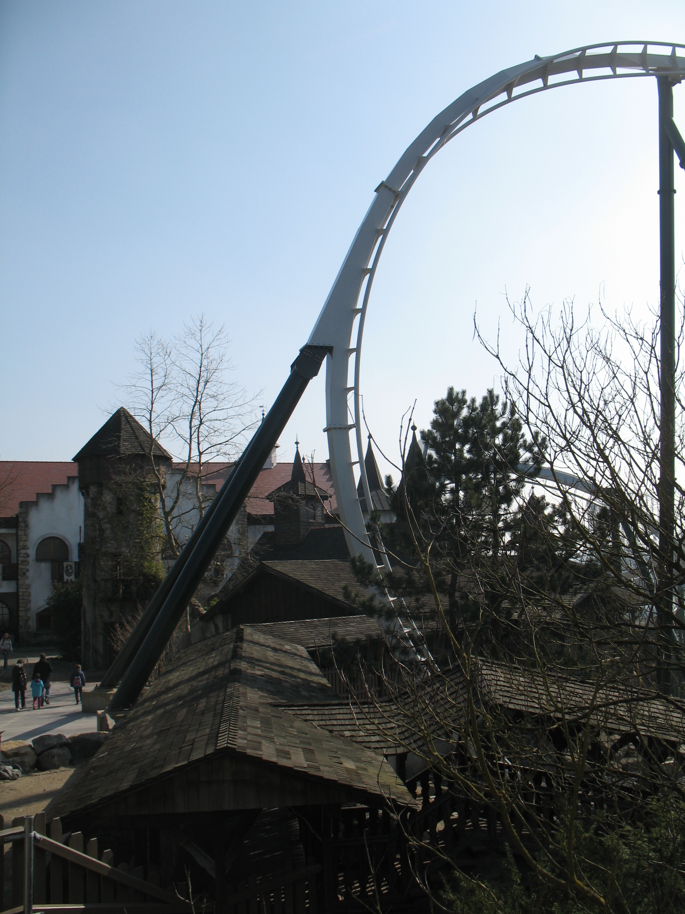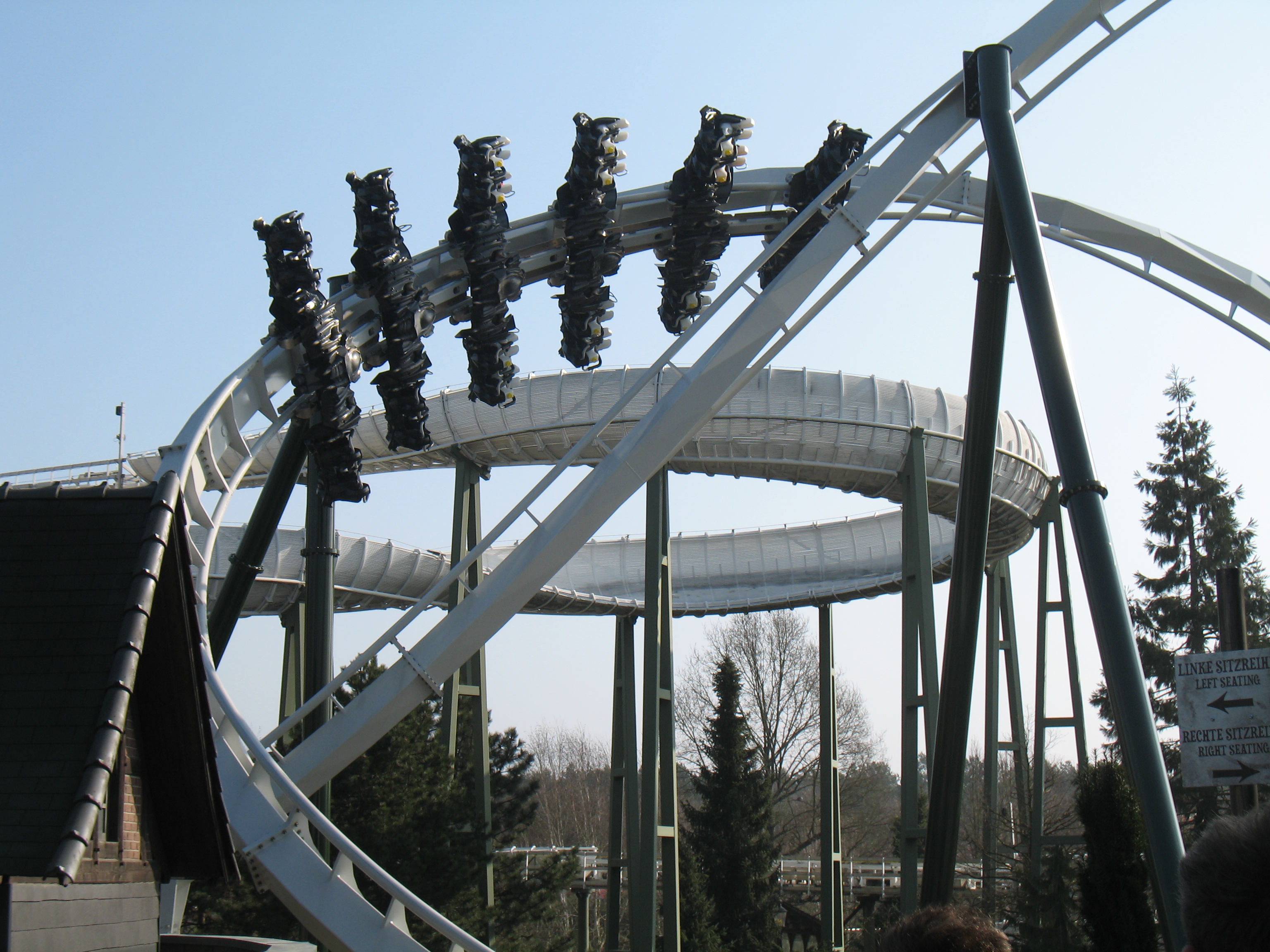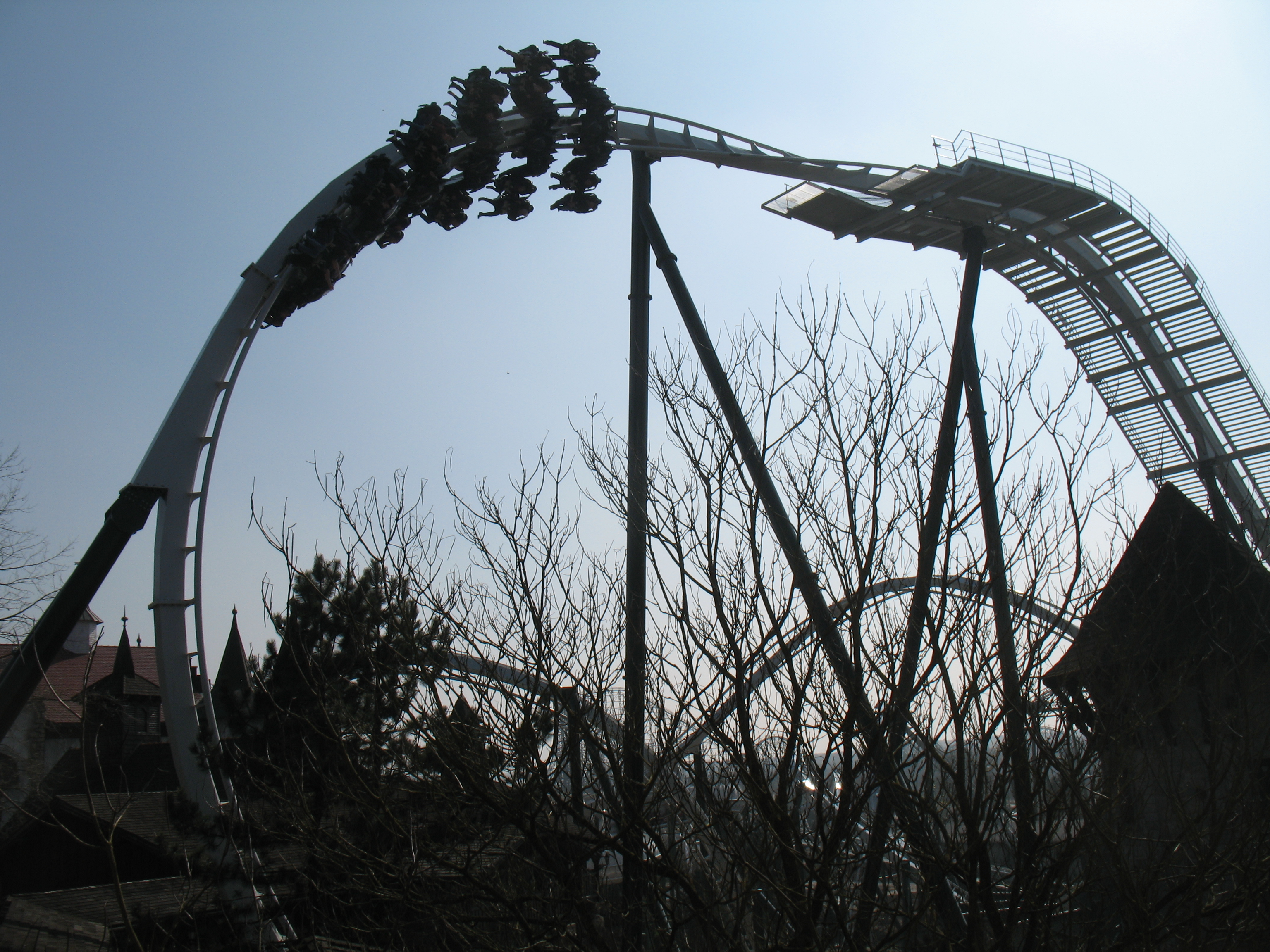 Immelmann, der einen sehr guten Blick der vorbeilaufenden Besucher auf den fahrenden Zug erlaubt. Mit viel Schwung (und wieder leichten Vibrationen) im Tal begonnen könnte es am höchsten Punkt mit etwas mehr Geschwindigkeit vorangehen, denn hier hat man zum ersten Mal etwas Hangtime. Nach der Ausfahrt geht es dann wieder mit dem Kopf nach oben unter dem