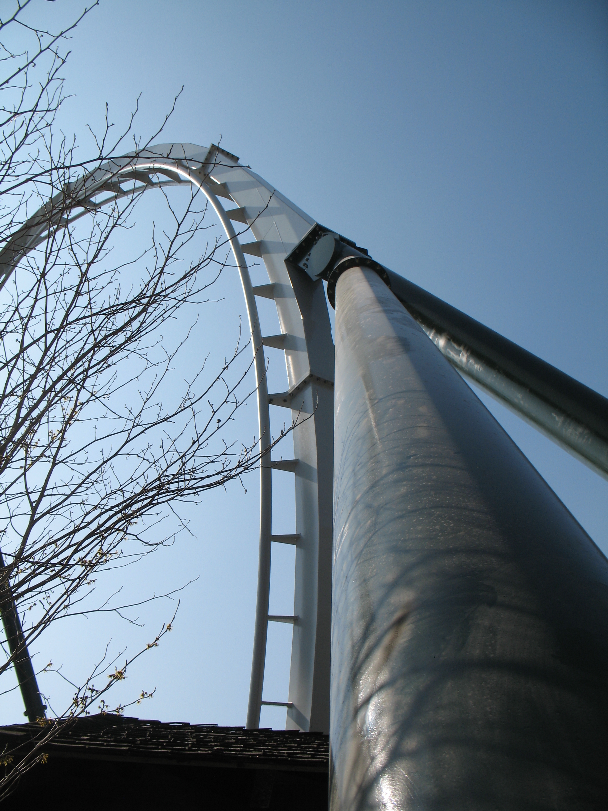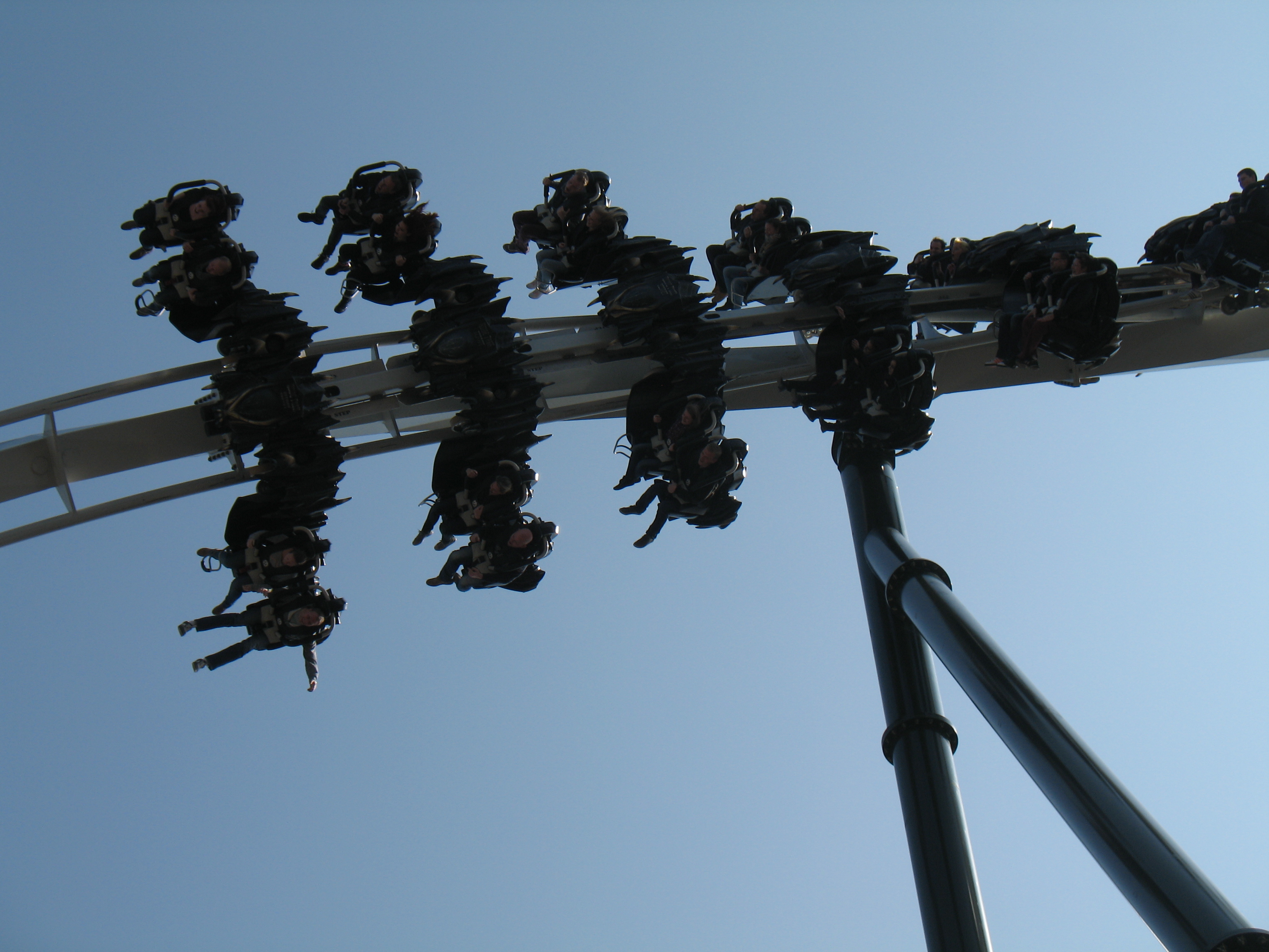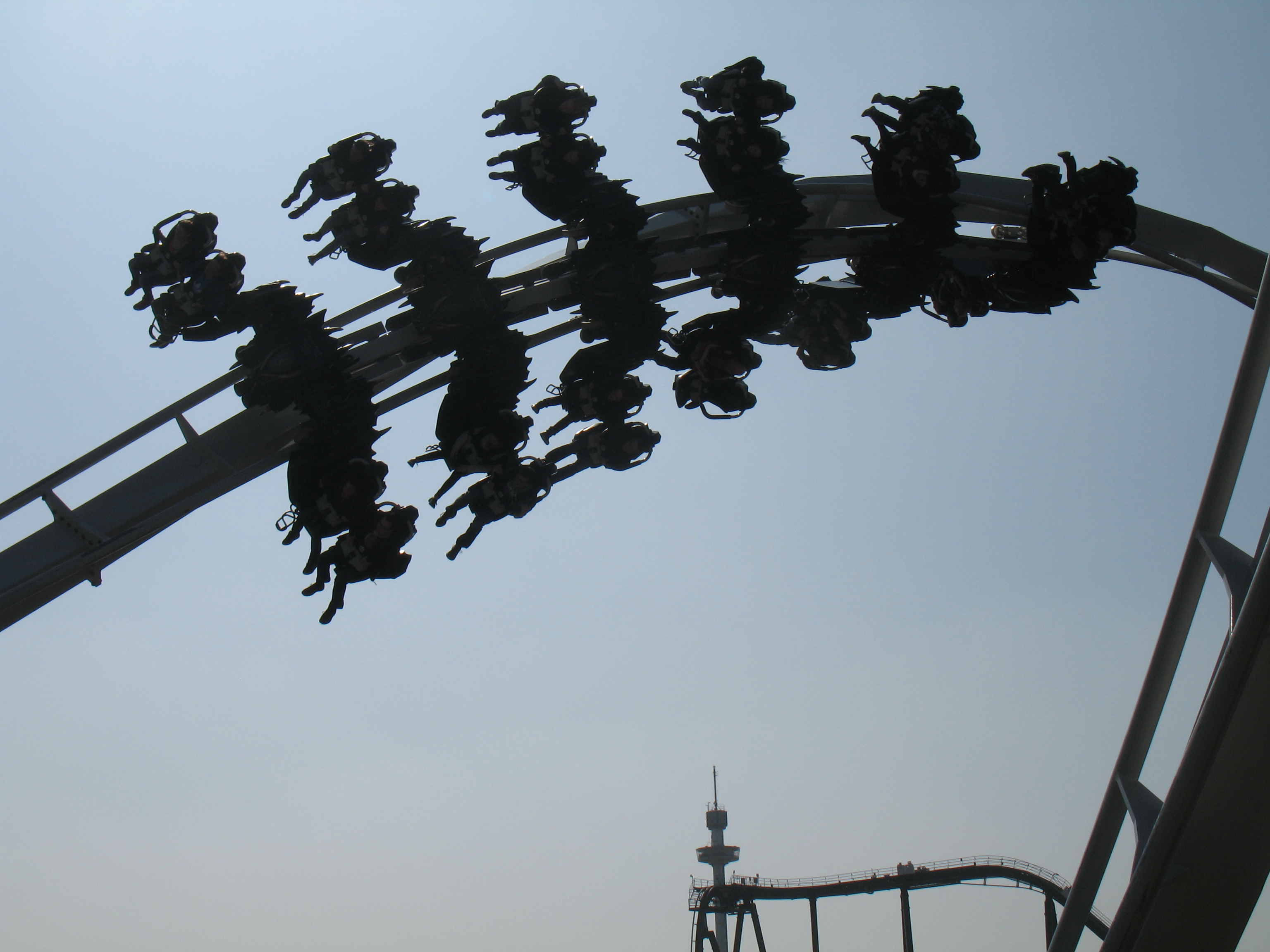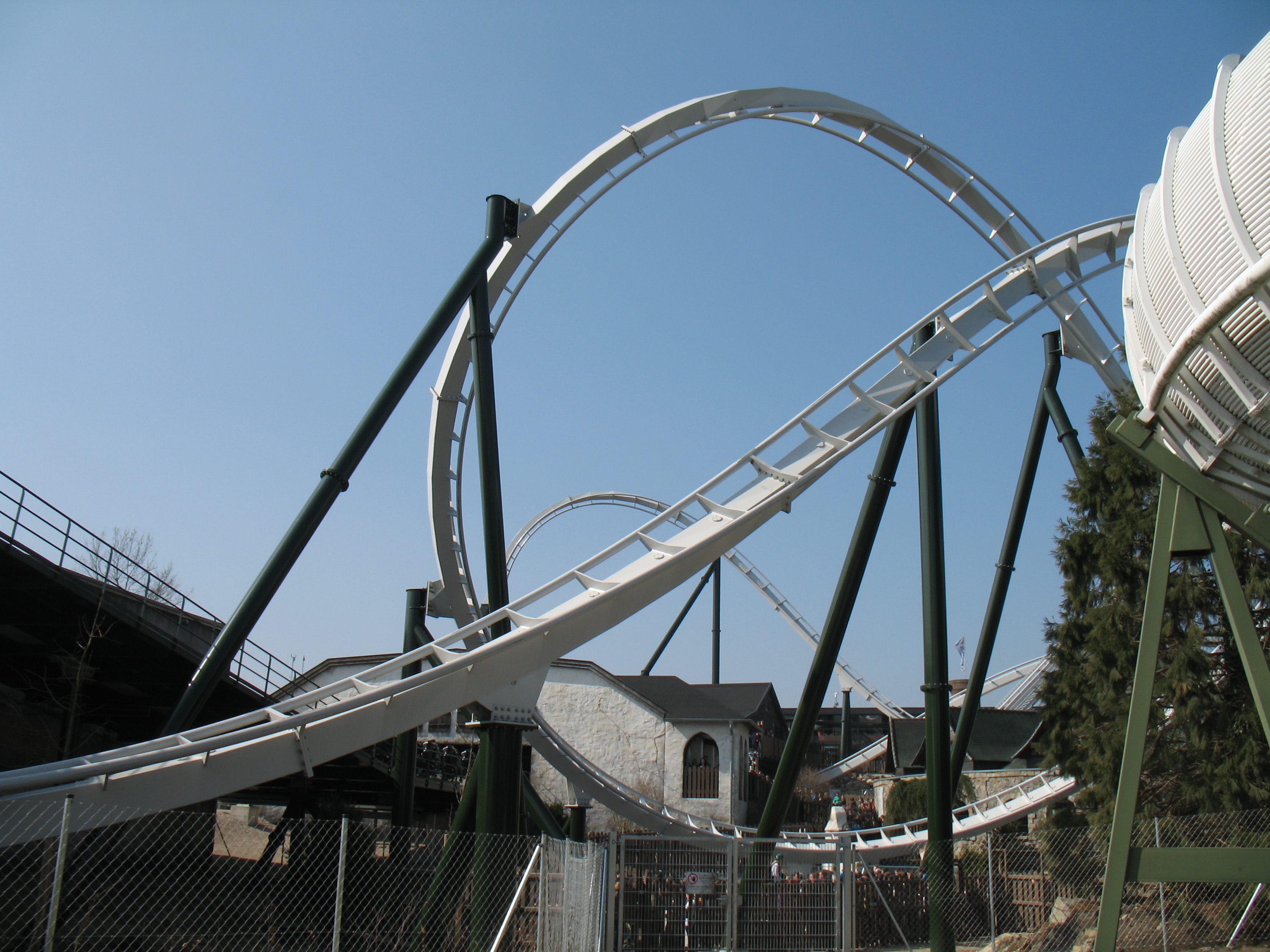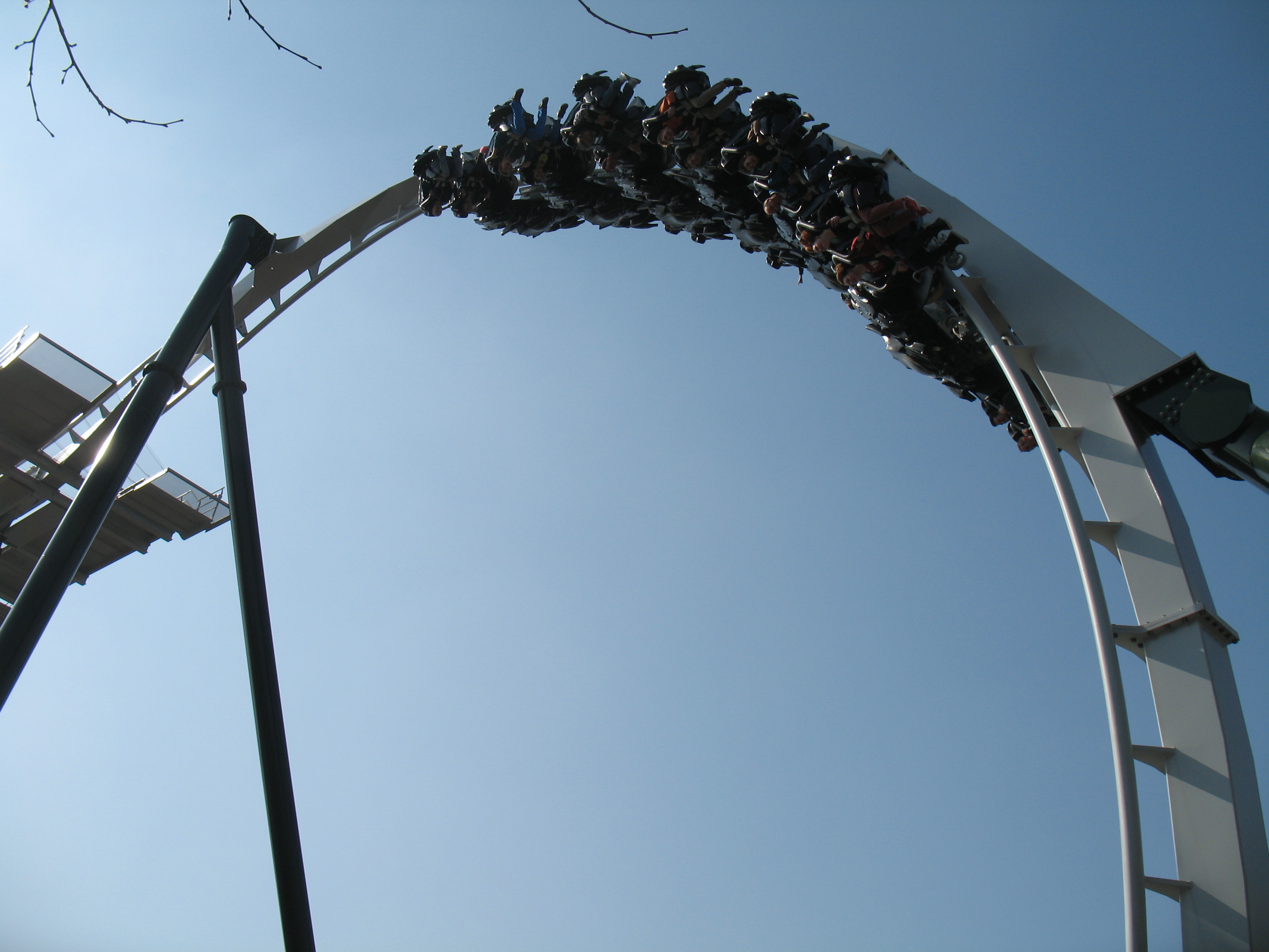 Immelmann, der einen sehr guten Blick der vorbeilaufenden Besucher auf den fahrenden Zug erlaubt. Mit viel Schwung (und wieder leichten Vibrationen) im Tal begonnen könnte es am höchsten Punkt mit etwas mehr Geschwindigkeit vorangehen, denn hier hat man zum ersten Mal etwas Hangtime. Nach der Ausfahrt geht es dann wieder mit dem Kopf nach oben unter dem