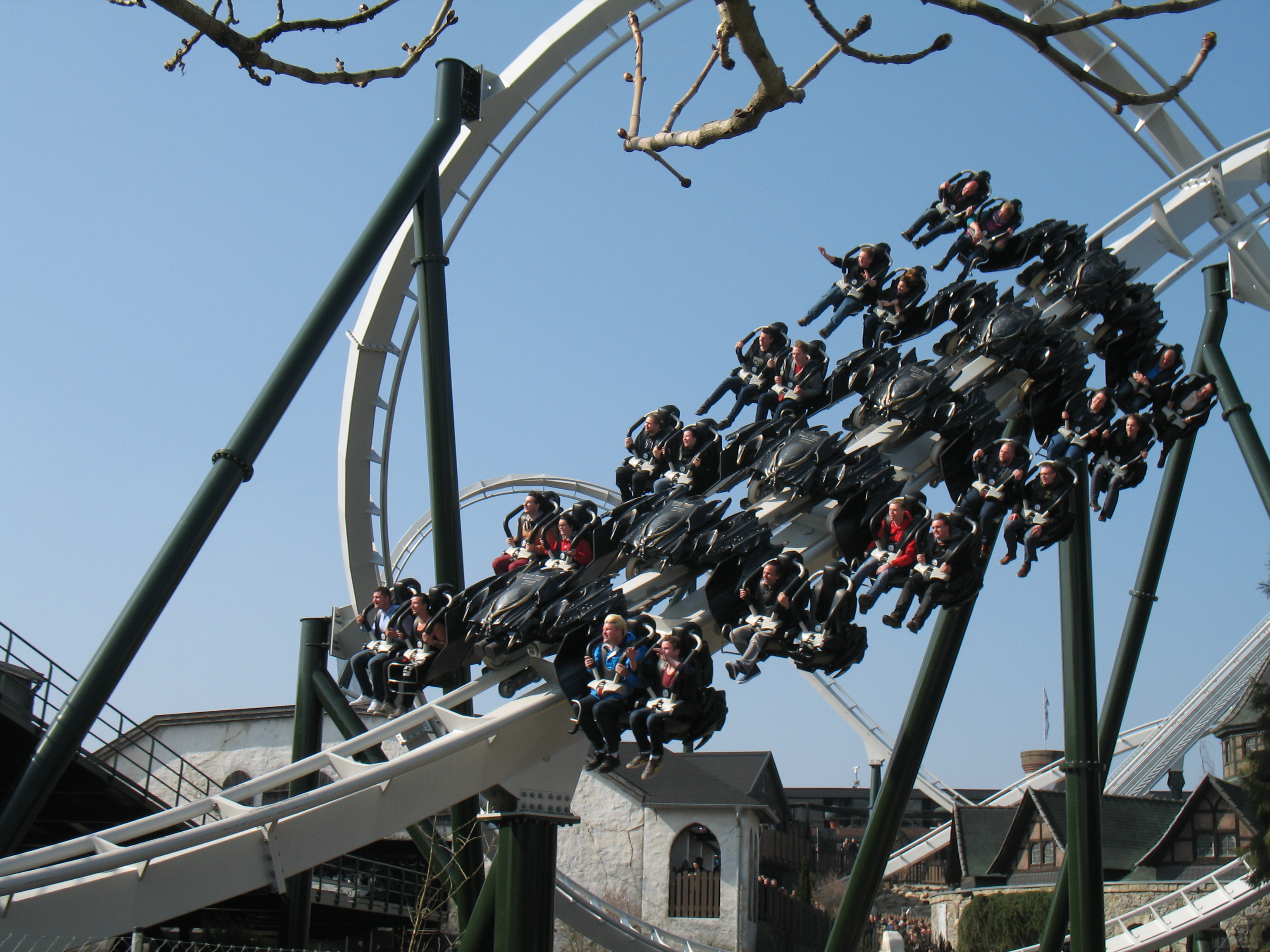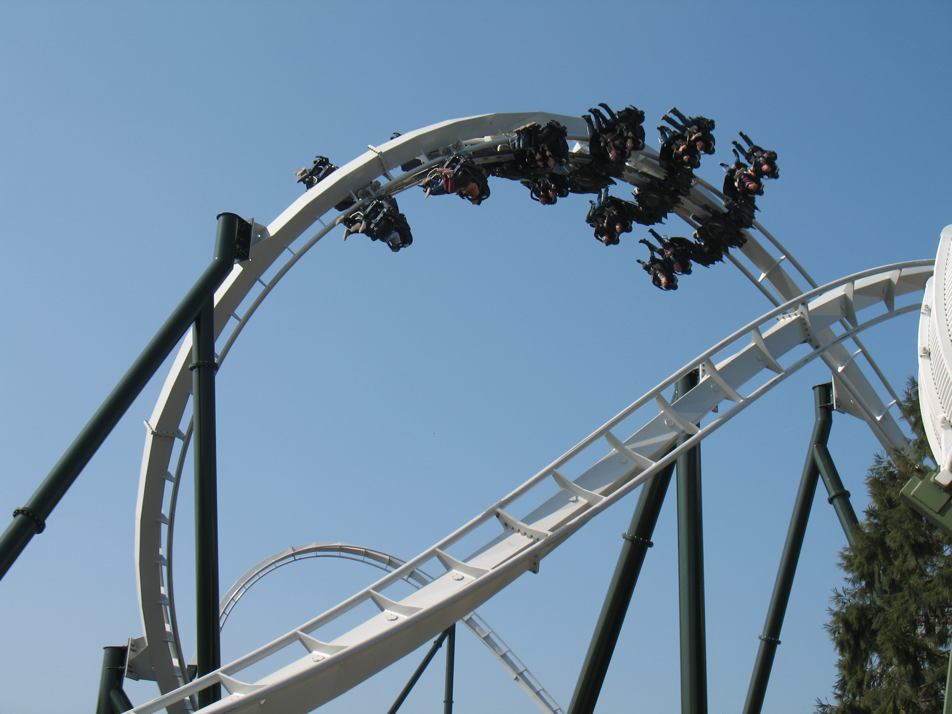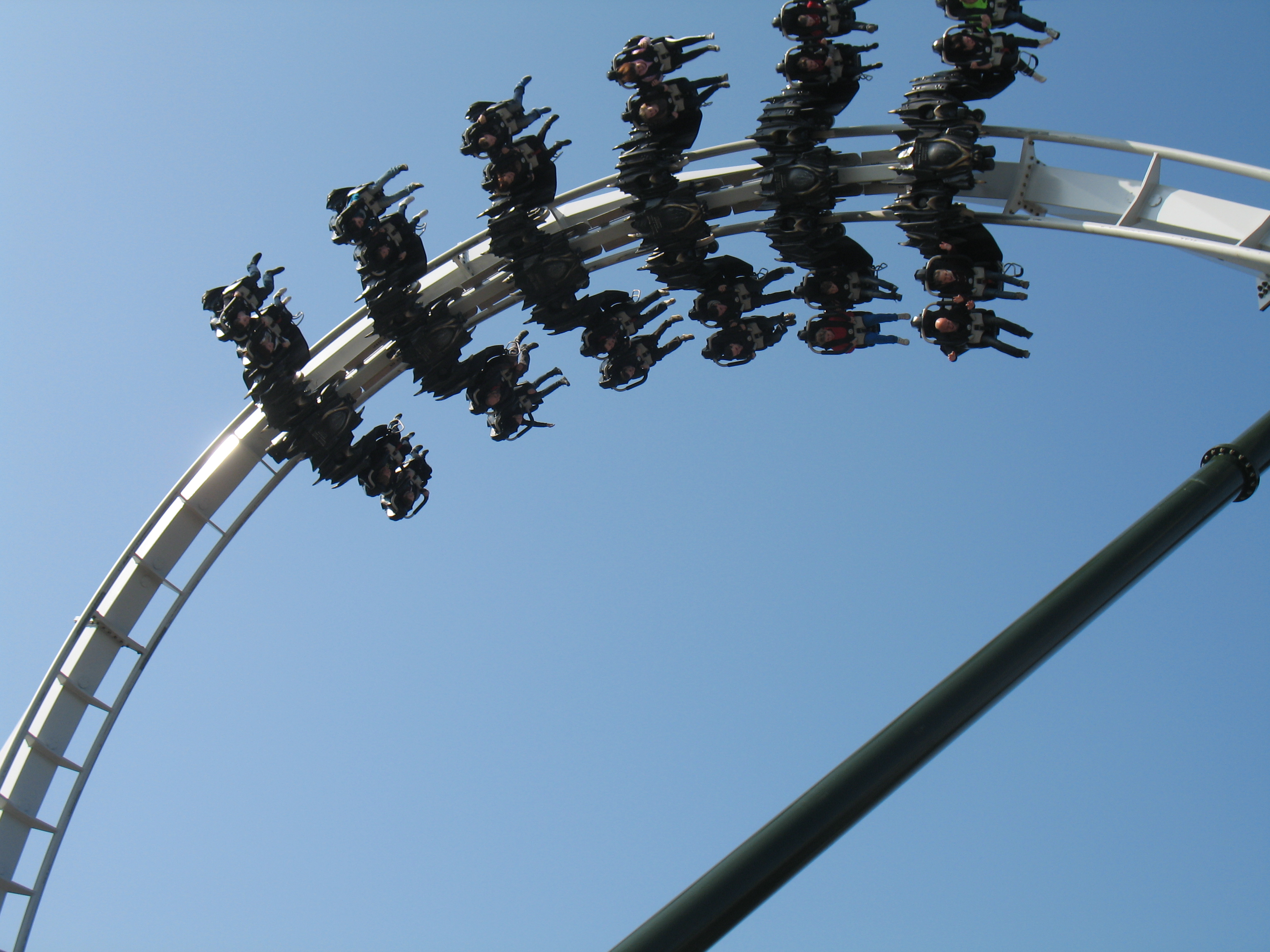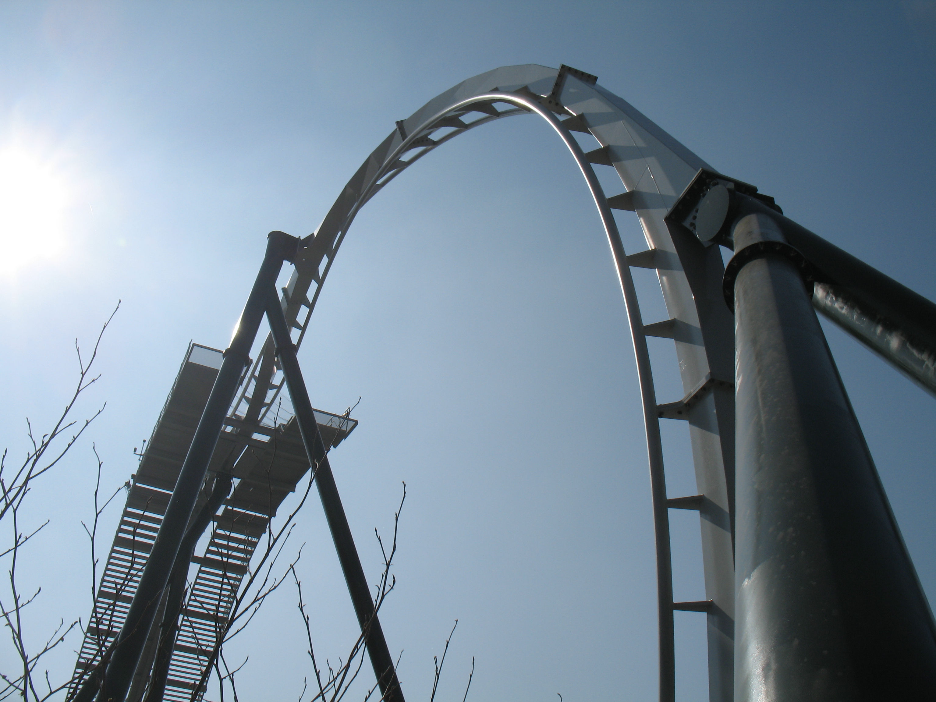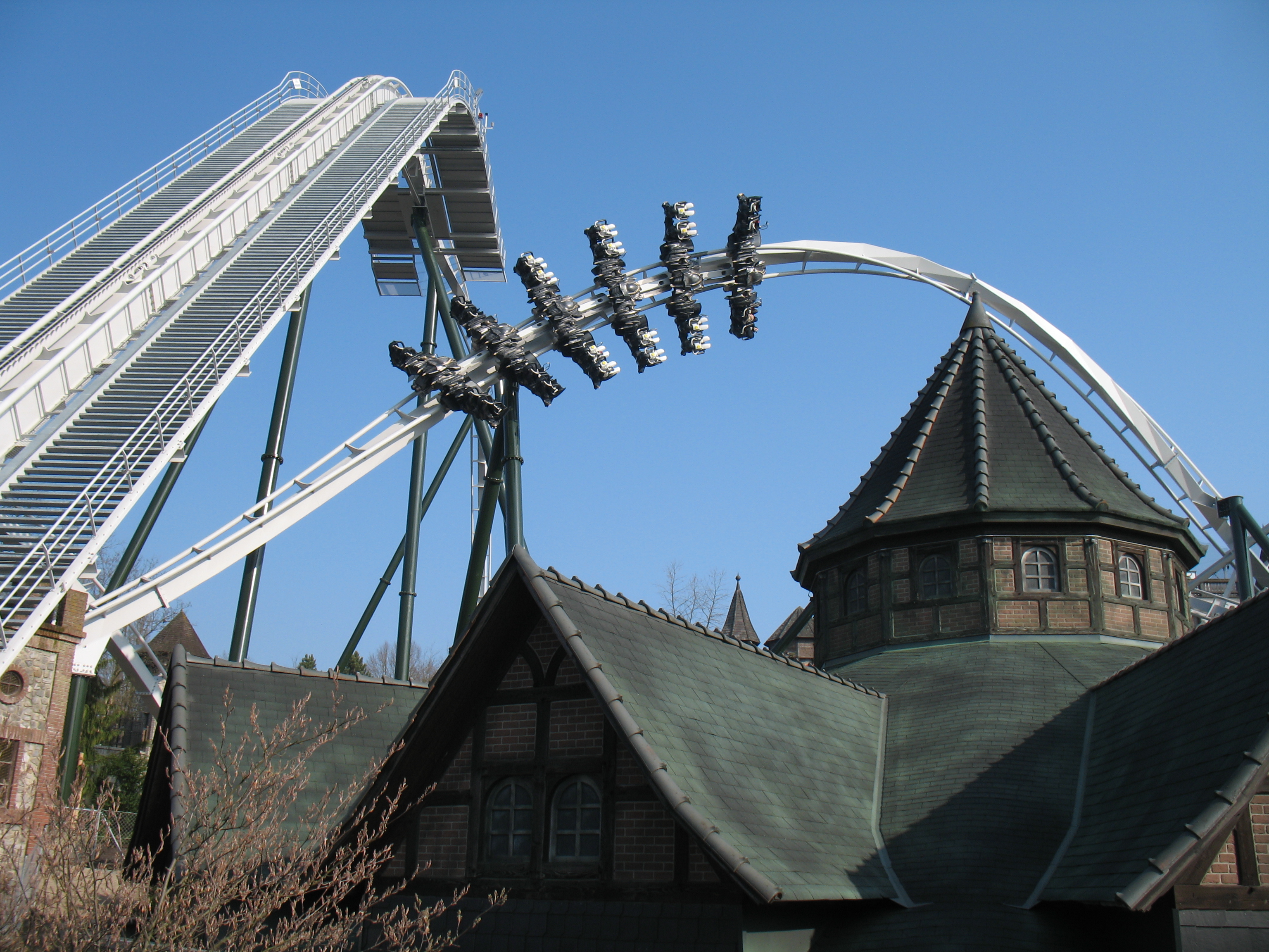 Immelmann, der einen sehr guten Blick der vorbeilaufenden Besucher auf den fahrenden Zug erlaubt. Mit viel Schwung (und wieder leichten Vibrationen) im Tal begonnen könnte es am höchsten Punkt mit etwas mehr Geschwindigkeit vorangehen, denn hier hat man zum ersten Mal etwas Hangtime. Nach der Ausfahrt geht es dann wieder mit dem Kopf nach oben unter dem