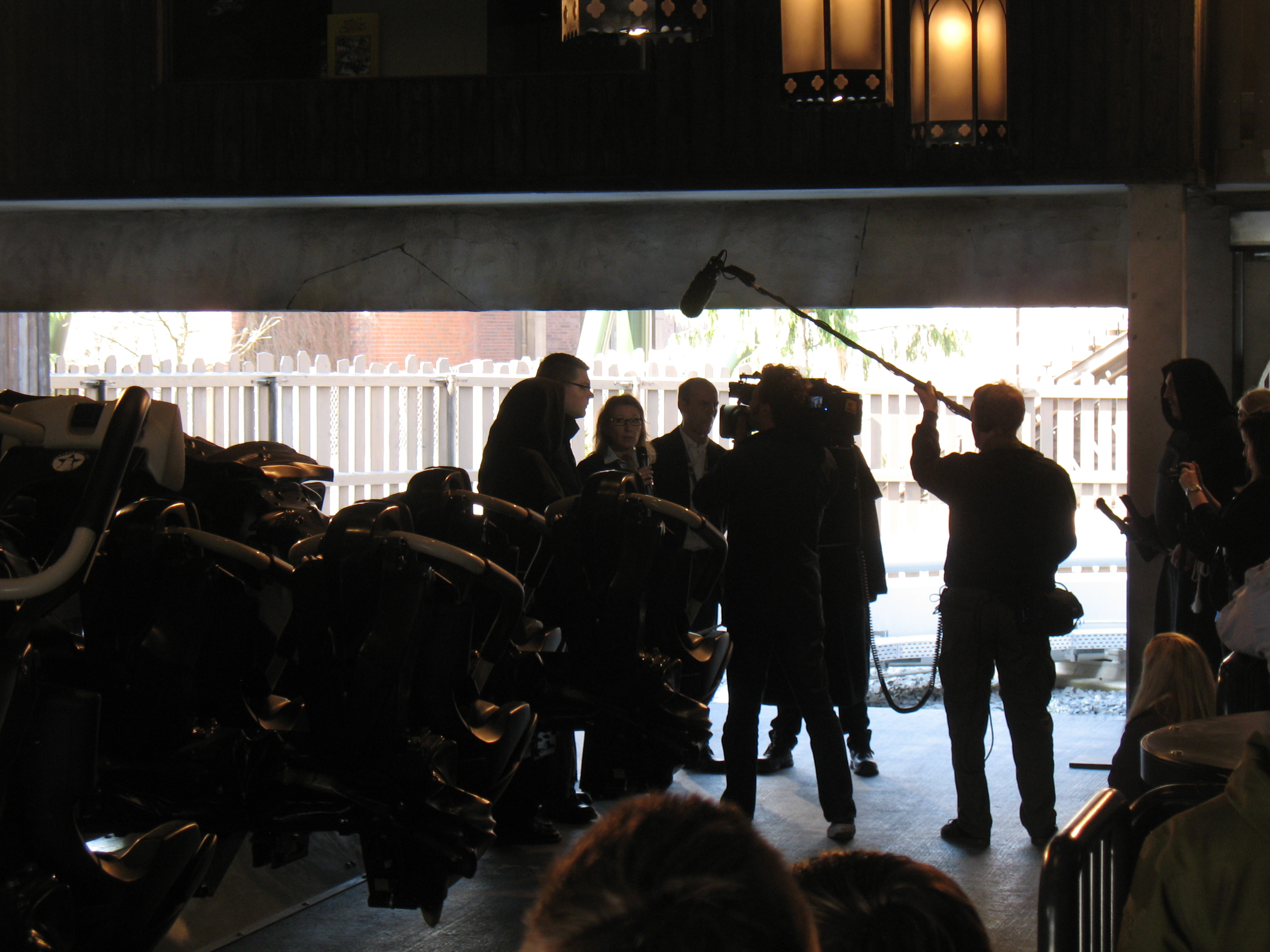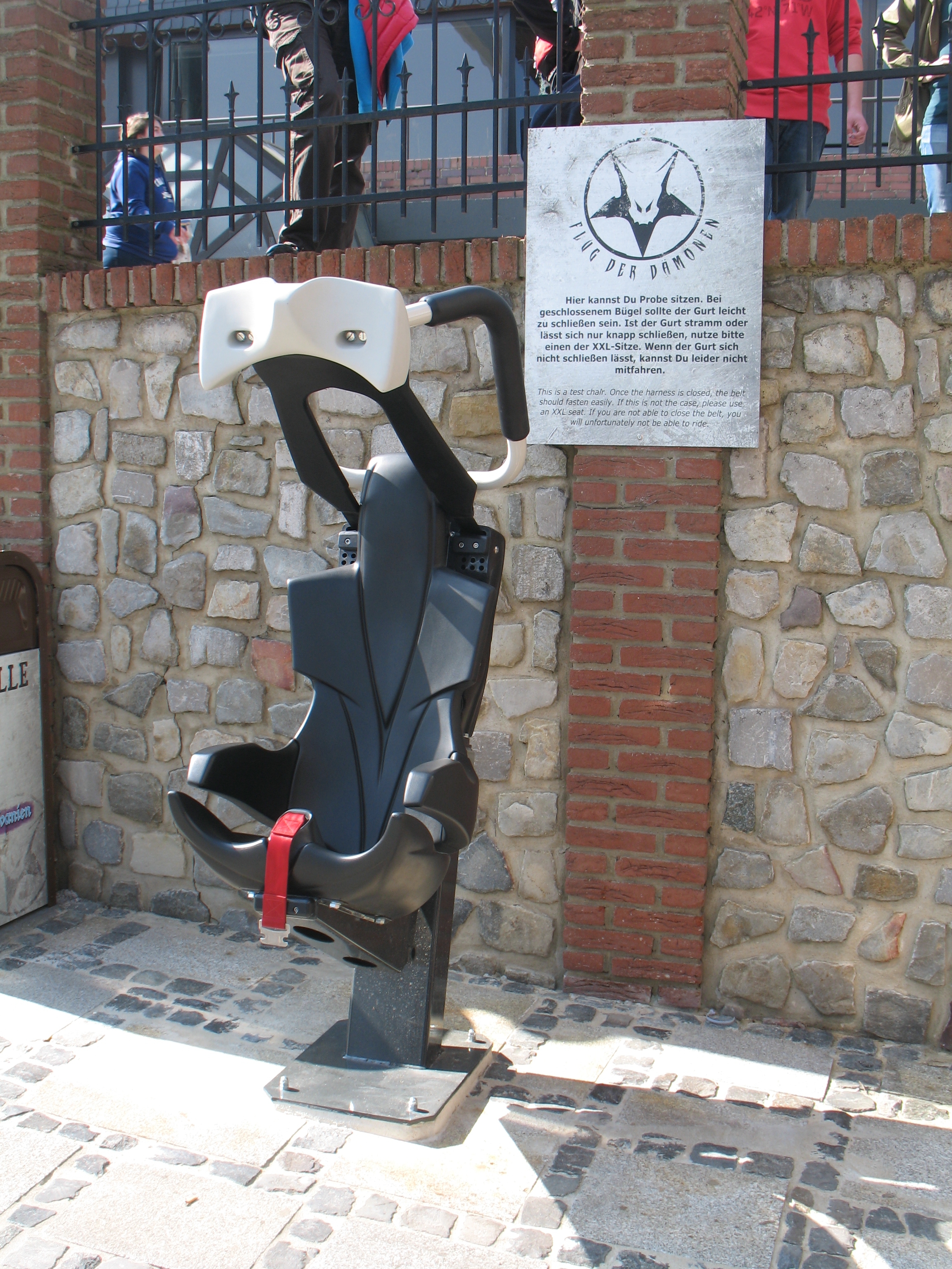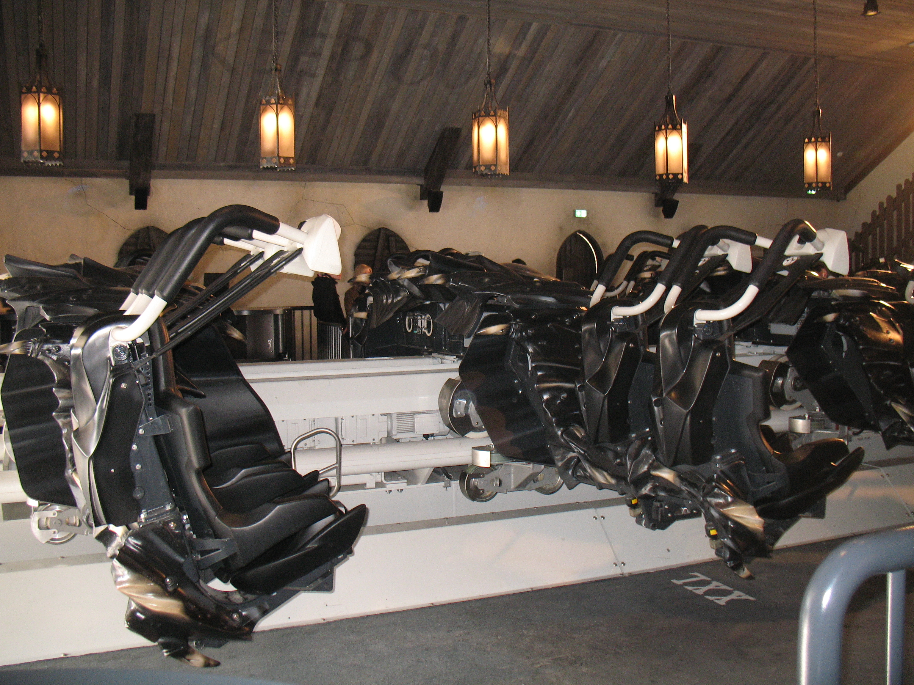 Im Zug Platz genommen (Mindestalter: 10 Jahre / Mindestgröße: 1,40 m / Maximalgröße: 1,95 m) stieg der Puls dann endgültig an. Den bequemen Westen-Bügel herangezogen und den Gurt eingesteckt, jetzt kann es losgehen. Fast, denn erst muss einer der vier Mitarbeiter (zwei pro Zugseite) die Bügel kontrollieren und sein Okay an den Fahrstand signalisieren. Obwohl man mit der Pre-Opening Woche, der ersten Presseeröffnung, den Promi-Fahrten und sicher den ein oder anderen Mitarbeiterfahrten schon ein wenig Erfahrung gesammelt haben sollte hat man es leider den gesamten Tag nicht geschafft einen Zug unter 3 Minuten abzufertigen, so dass der zweite Zug nach seiner ca. 1:55 Minuten langen Fahrt noch eine gute Minute in der Schlussbremse verweilen musste. Mal war das Ausgangstor nicht geschlossen, mal zeigte ein Bügel keine Freigabe, so dass noch einmal nachgeschaut werden musste. Noch keine optimale Leistung, aber vielleicht spielt sich das noch ein.