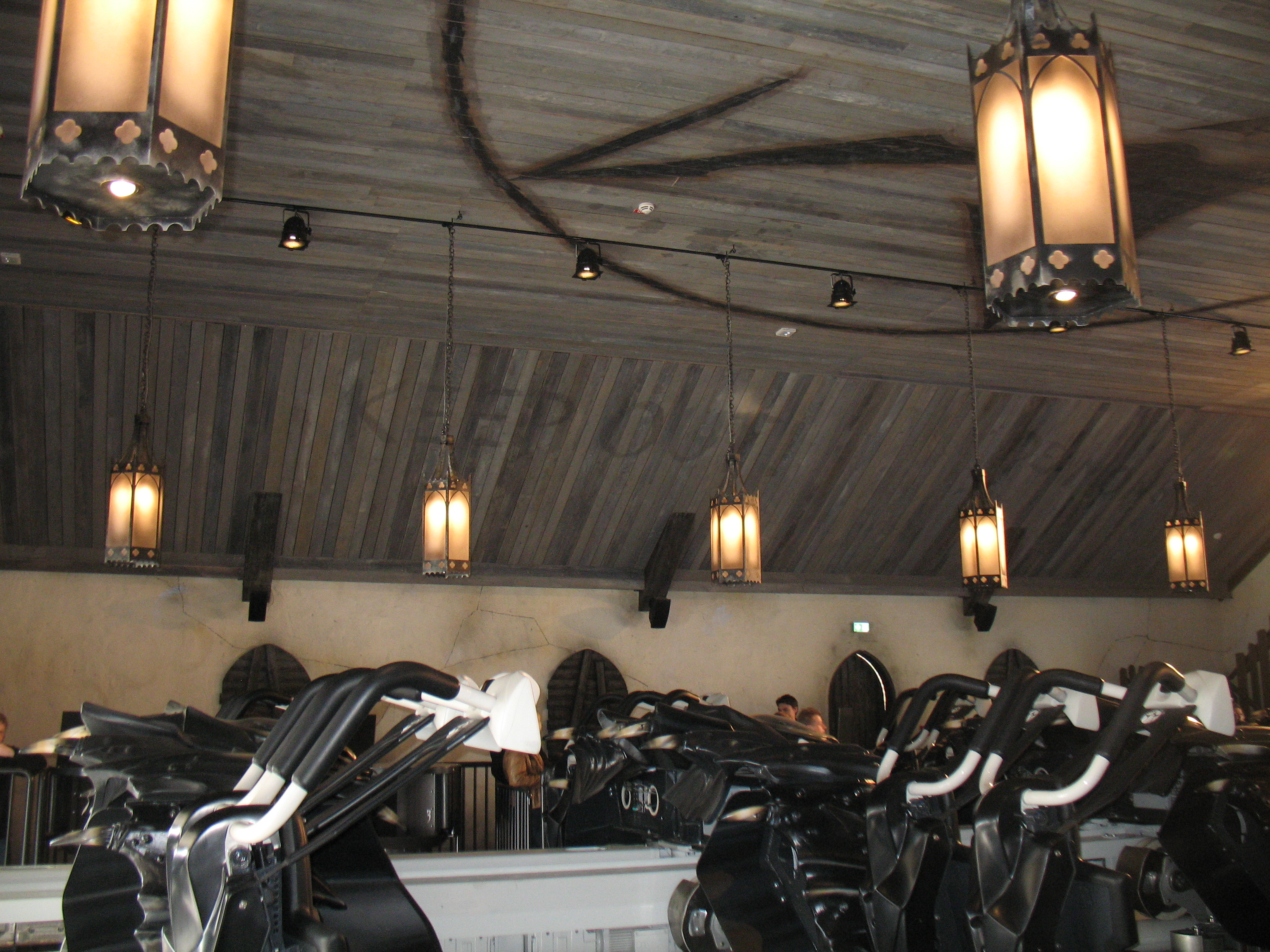 Die Station sieht von außen schon sehr gut gestaltet aus und auch von innen setzt sich der positive Eindruck fort. Die Station gefällt mir sehr gut mit den alten Wänden, der Holzdecke mit dem "eingebrannten" Logo, den unter Schwarzlicht zu sehenden Worten an den Wänden oder den antiken Lampen, da gibt es nichts zu meckern. Über die Einfahrtsöffnung des Zugs geht die Brücke für die Mitfahrer, die auf der linken Seite fahren möchten. Für die rechte Seite kann man ebenerdig die Station betreten. Über der Ausfahrtsöffnung befindet sich der fahrstand, in dem der Bediener von oben durch große Glasscheiben einen guten Überblick auf das geschehen in der Station besitzt. Leider hat die Station an der Ein- und Ausfahrt nur von Hand zu betätigende Falt-Schieb-Tore, die während des ganzen Tages geöffnet sind. Somit ist es leider nicht möglich die Station vor der Abfahrt zu verdunkeln und wie z.B. beim Fluch mit Licht und Spezialeffekten zu arbeiten oder die Spannung durch das Öffnen des Tors bei der Abfahrt aufzubauen. An dem jeweiligen Gatter angekommen legt man sein Gepäck und lose Gegenstände in das zwischen den Wartreihen integrierte Fach. Dieses dreht sich nach dem Öffnen der Tür weiter, so dass die Gegenstände zum Zug ausgerichtet sind und von den nächsten Wartenden nicht angefasst oder geklaut werden können. Sehr interessantes und praktisches System. Gut, zur Eröffnung klappte es noch nicht ganz reibungslos und manchmal drehte sich das Fach gar nicht oder zu weit, so dass man nach der Fahrt den Angestellten Bescheid geben musste, die dann das Fach manuell in die richtige Position beförderten. Aber das spielt sich sicher noch ein in den nächsten Wochen.
