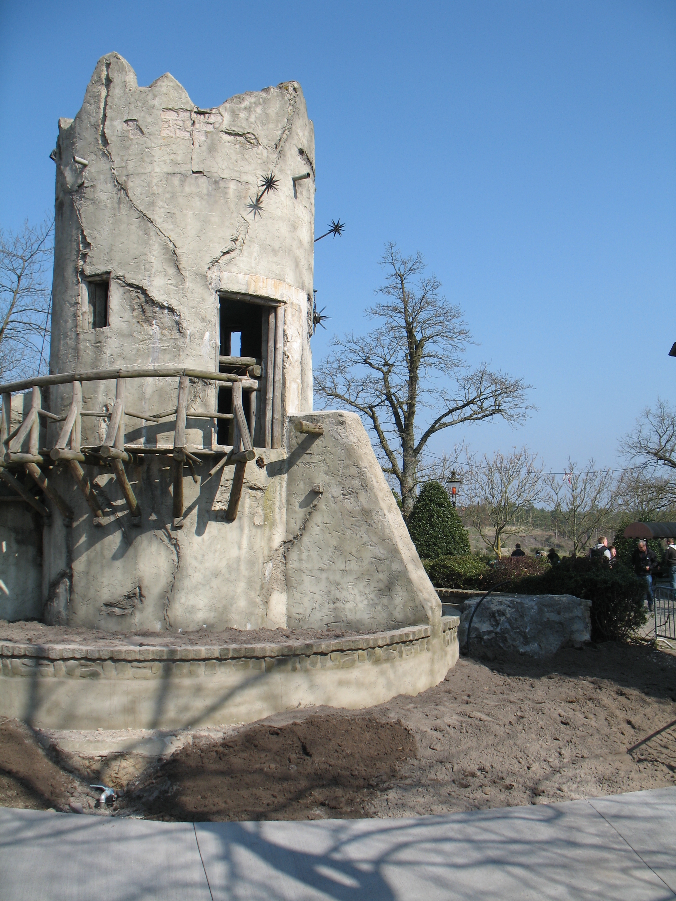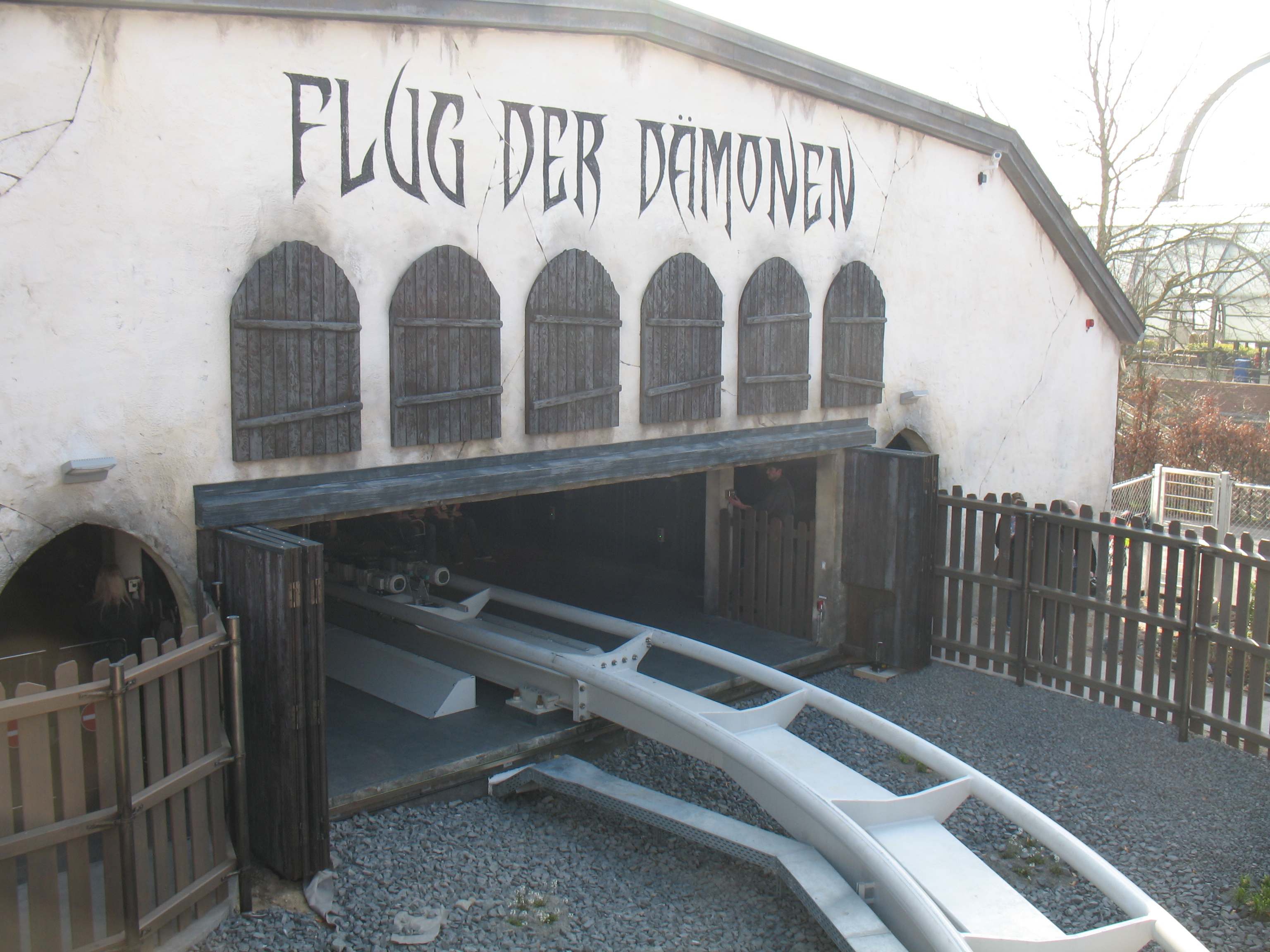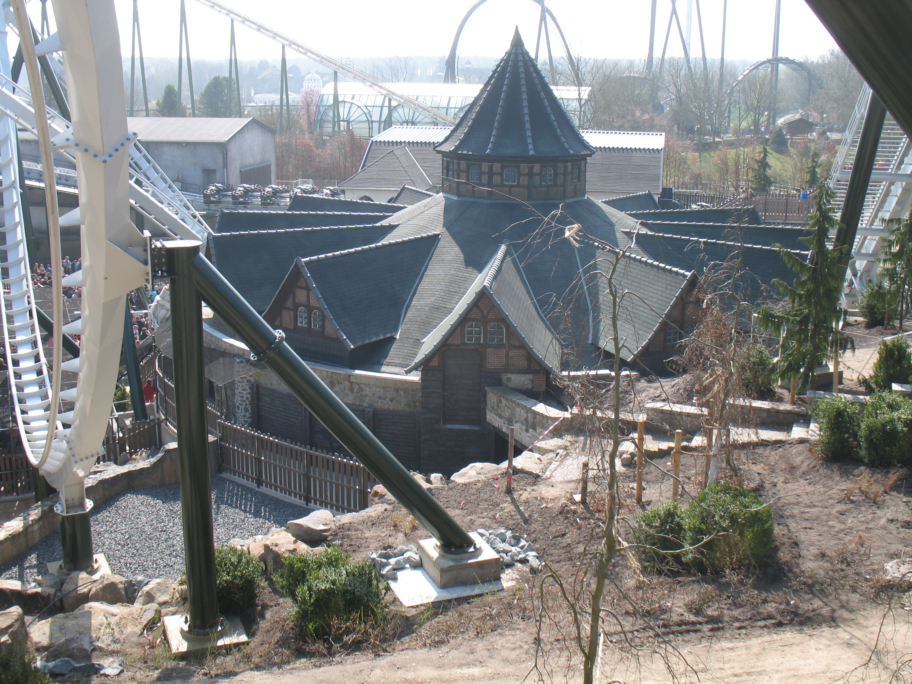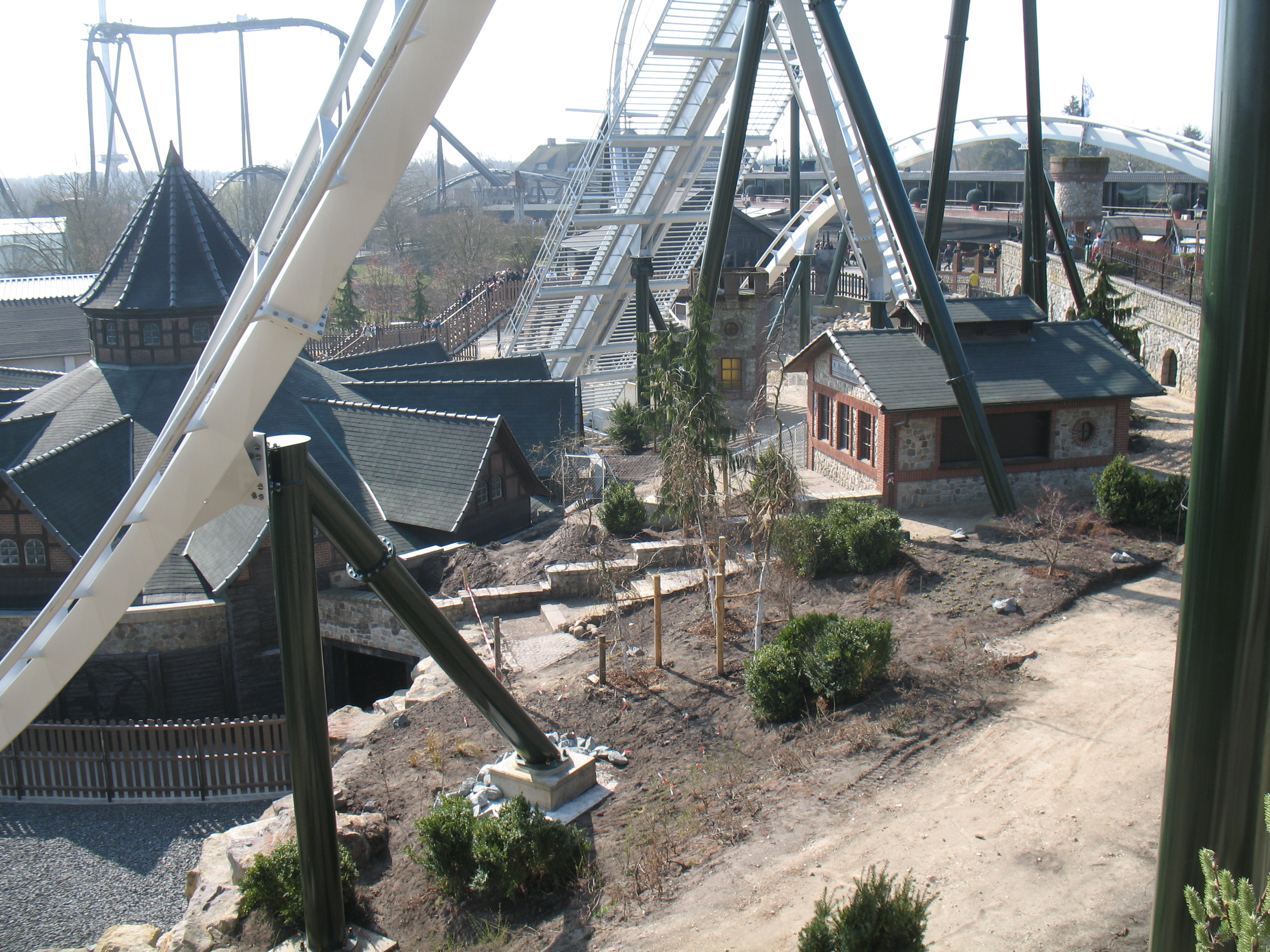Von dort aus geht es in das zweite Wartefeld, dass bis auf die fehlenden Sicherheitsnetze identisch aufgebaut ist. Dieses liegt praktisch neben dem mittleren Tal des Bretzel-Elements. Hier ist auch das von Baufotos aus dem letzten Jahr bekannte Near-Miss-Element, welches eine auf beiden Seiten der Schiene abbröckelnde Mauer darstellt, zu sehen. Aus diesem Bereich hat man einen wundervollen und beeindruckenden Blick auf den mehrmals durch das Bretzel-Element vorbeirauschenden Zug, welcher seine Drehungen und Überschläge zelebriert. An der Seite der Fläche gibt es den schon von Baubildern aus dem letzten Jahr bekannten Kiosk, in dem Eis, Getränke und Naschsachen angeboten werden. Weiter geht’s in den dritten Wartebereich, über den es aufgrund gleichen Aufbaus nicht viel zu sagen gibt. Dieser Außenbereich wirkt für mich leider ein wenig trist und eintönig. Ein paar Statuen, alte Gebäude als Ruinen, Fenster hinter denen Dorfbewohner die Besucher warnen oder von Dämonen bedroht werden könnten das Warten interessanter und thematisch dichter machen....