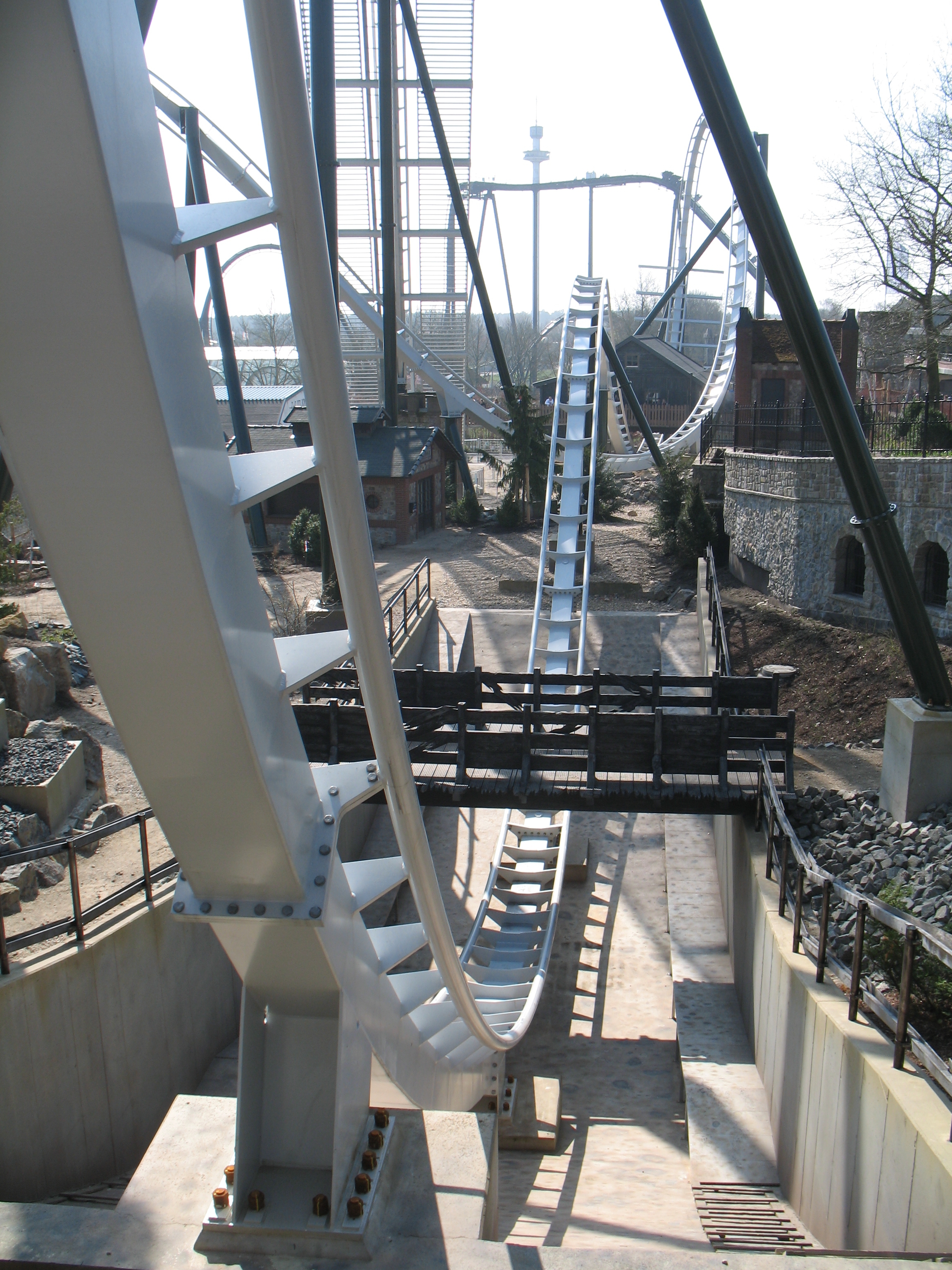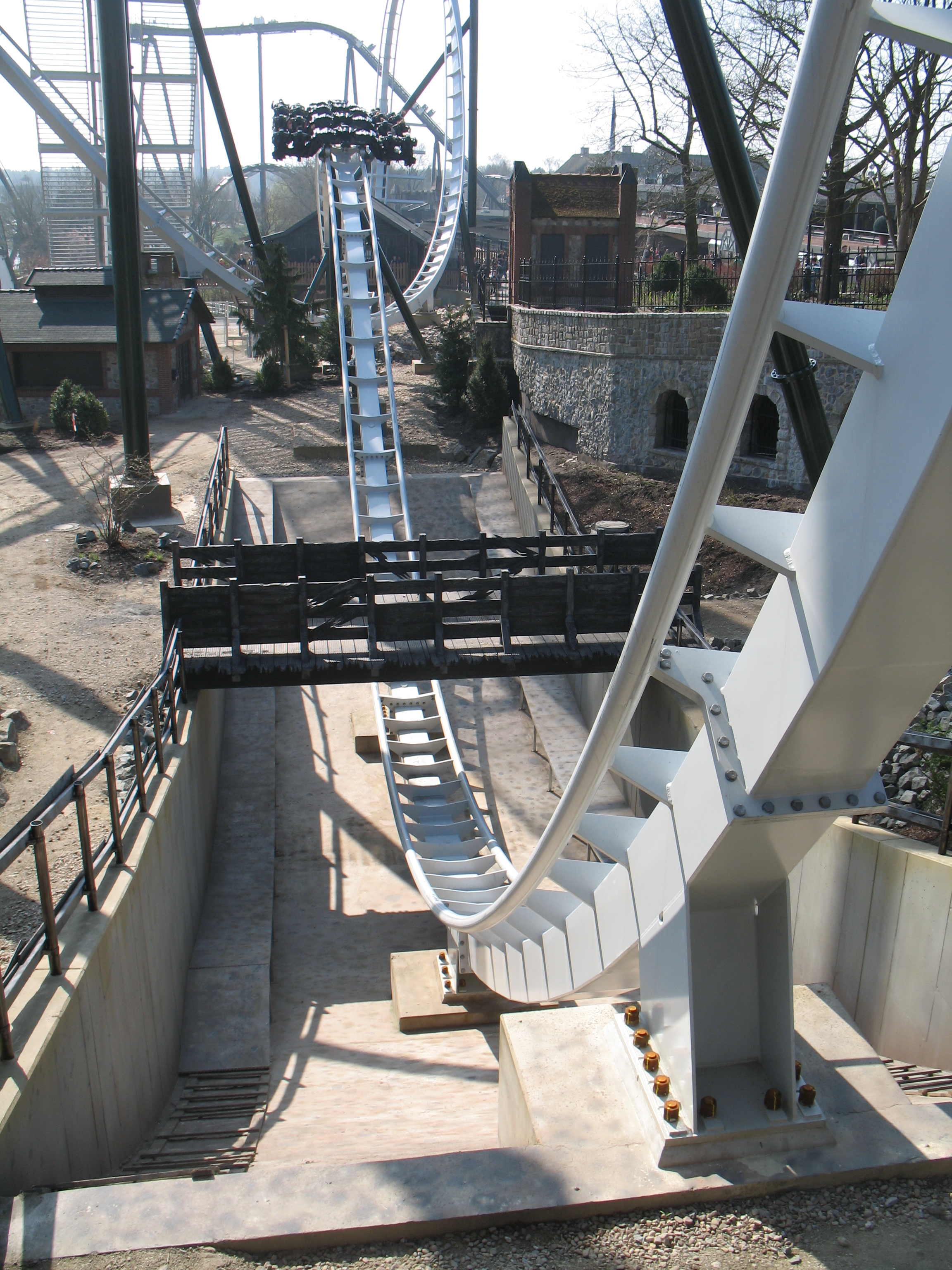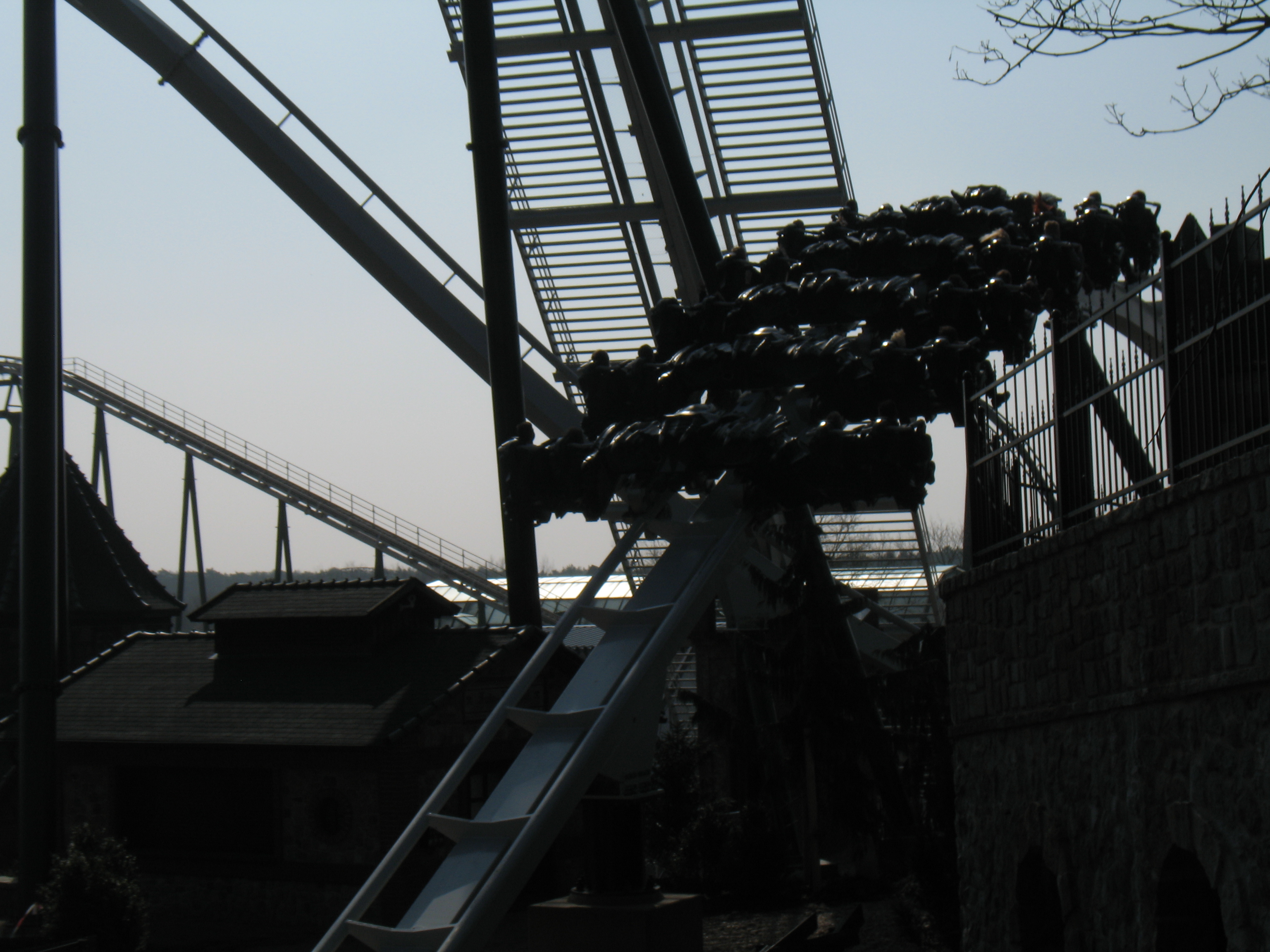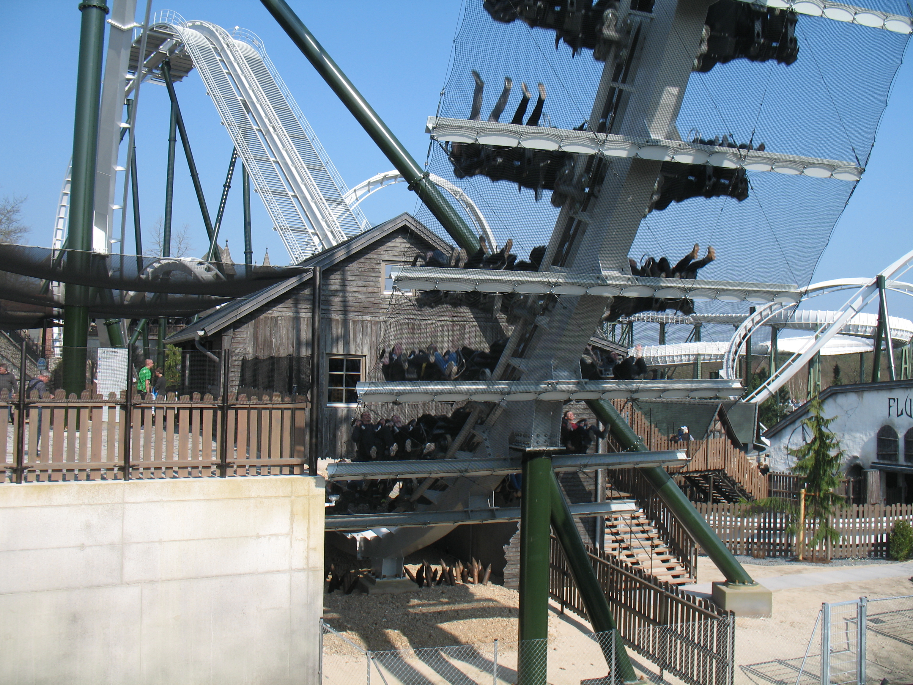 Wenn sich der Zug in Bewegung setzt und die Station verlassen hat geht es nach einer 90°-Rechtskurve gradewegs auf den Lift zu. Gewohnt sanft hängt sich der Zug in die Kette ein und wird in angemessenem Tempo den 40m hohen Lifthill hinaufgezogen. Je nachdem auf welcher Seite man sitzt hat man einen guten Überblick über einen Teil des Parks. Oben angekommen und wieder in der waagerechten geht es geradezu in die erste 180°-Linksdrehung, die einen kopfüber in den Dive-Drop übergibt. Gefühlt ist das Gefälle bei diesem Wing-Coaster vom Liftende bis zum Dive-Drop etwas steiler, so dass der Zug schneller in das Element startet, allerdings ist die Drehung aber auch erst wesentlich später im Dive-Drop zu enden. Bei "The Swarm" steht man praktisch schon vor der Abfahrt auf dem Kopf, hier erst etwas mehr als 90°. Dann geht es aber unaufhaltsam abwärts der Schlucht am Boden entgegen. Hier scheint man noch nicht fertig zu sein, denn die Rinne zeigt sich noch im unverkleideten Betongrau. Ein wenig alt aussehender Putz wie an den Stationswänden, modellierte Felssteine, solche Holzpflöcke aus dem Boden oder von der Seite wie bei der Shopunterdurchfahrt oder auf alt gemachtes Holz (siehe Brücke) würden an der Stelle schon meine Ansprüche erfüllen. Aber das ist noch ohne Probleme nachrüstbar. Angeblich liebäugelt man auch mit der Anschaffung einer großen Nebelmaschine, die den Kanal in dichten Nebel taucht. Die über dem Kanal gebaute Brücke, die wirklich klasse auf alt, verwittert und brüchig getrimmt wurde, vermittelt (besonders in der ersten Reihe) tatsächlich das Gefühl, dass es im Kopfbereich eng werden könnte. Ein gelungenes erstes Near-Miss-Element. Im Tal bei dort ca. 100km/h Geschwindigkeit merkt man das erste Mal eine leichte Vibration der Sitze, die aber nicht stört oder unangenehm ist und aufgrund der Geschwindigkeit und weiten Auslage der Sitze auch verzeihlich. Mit vollem Schwung geht es auf den anschließenden