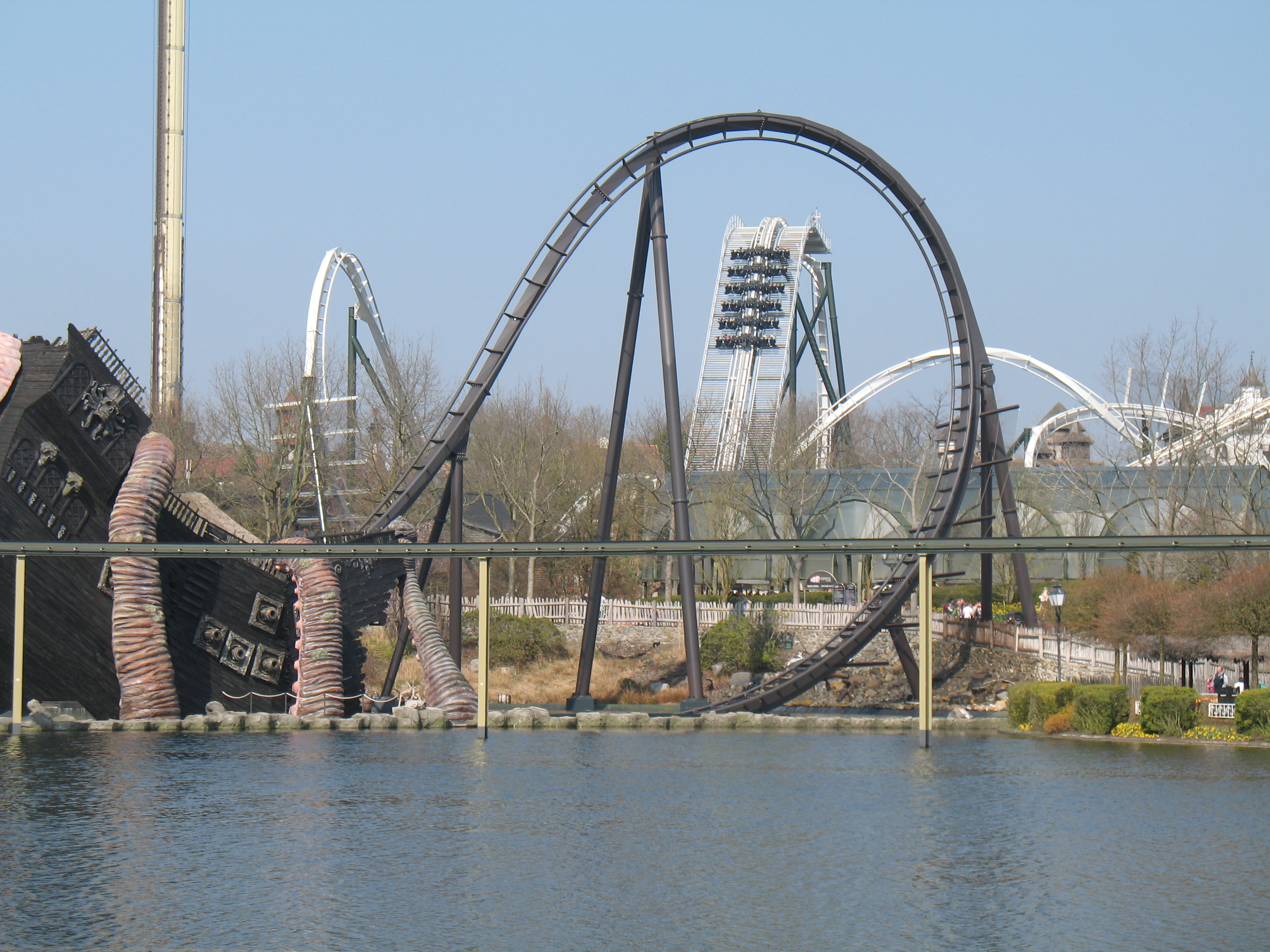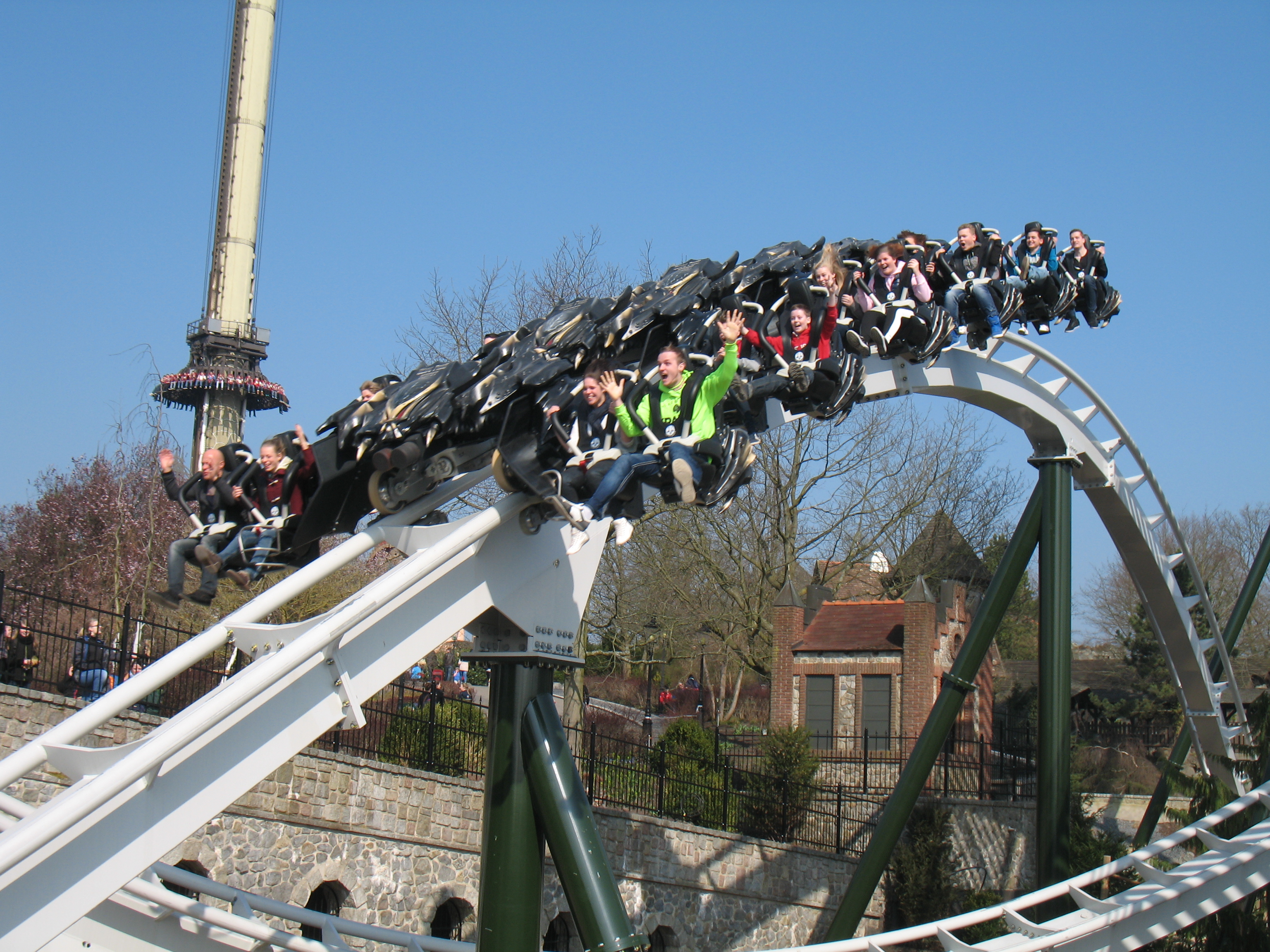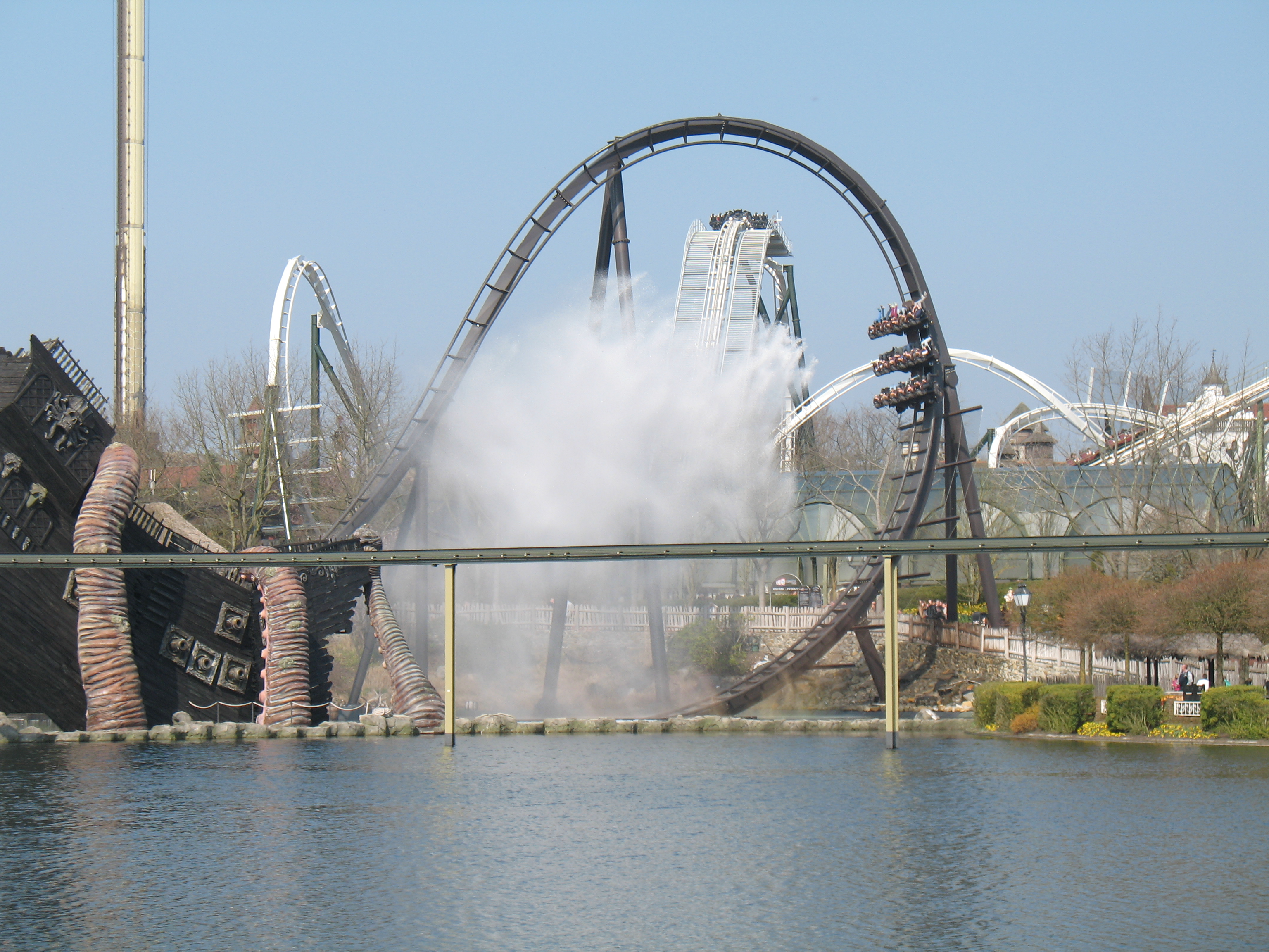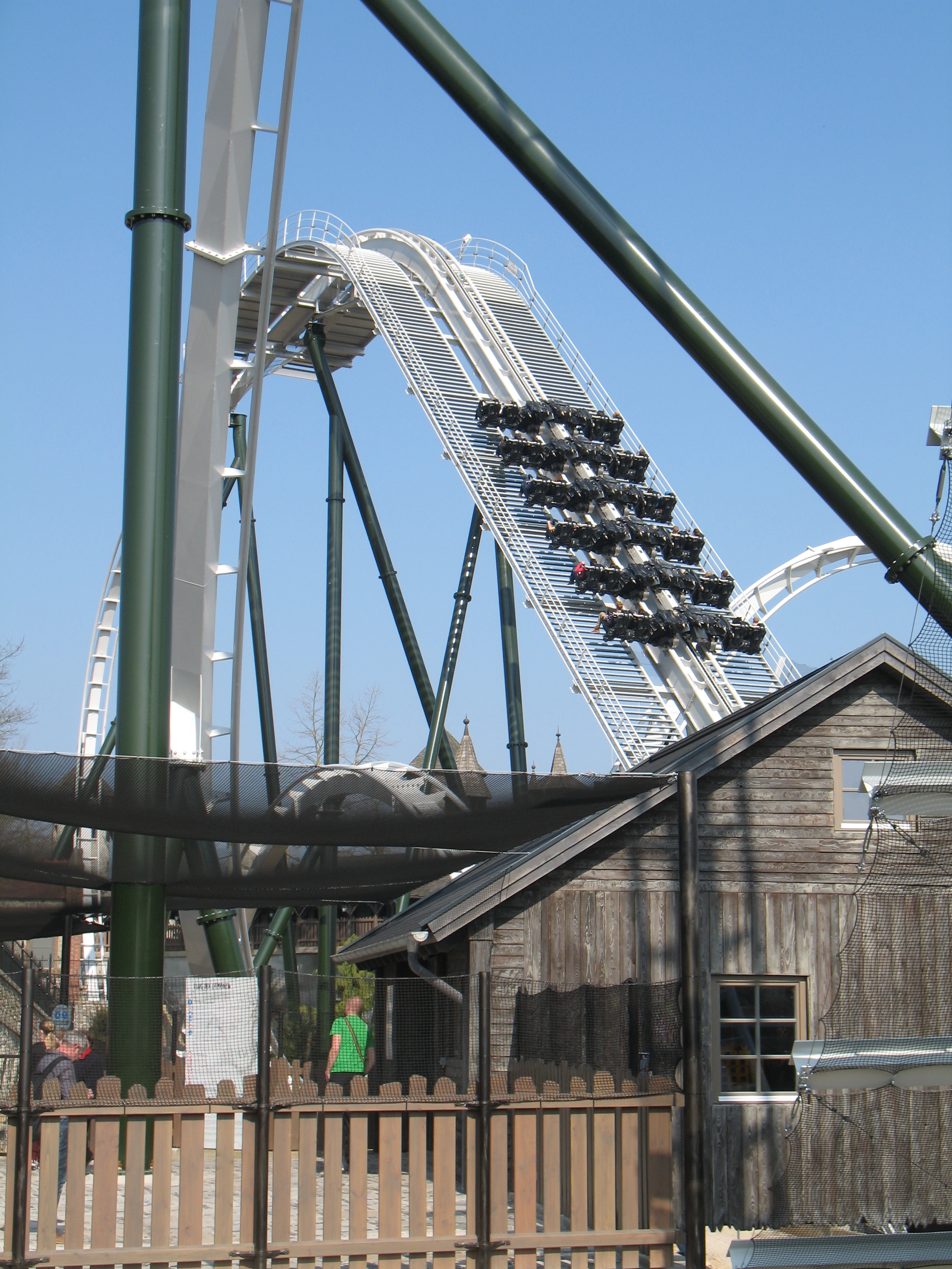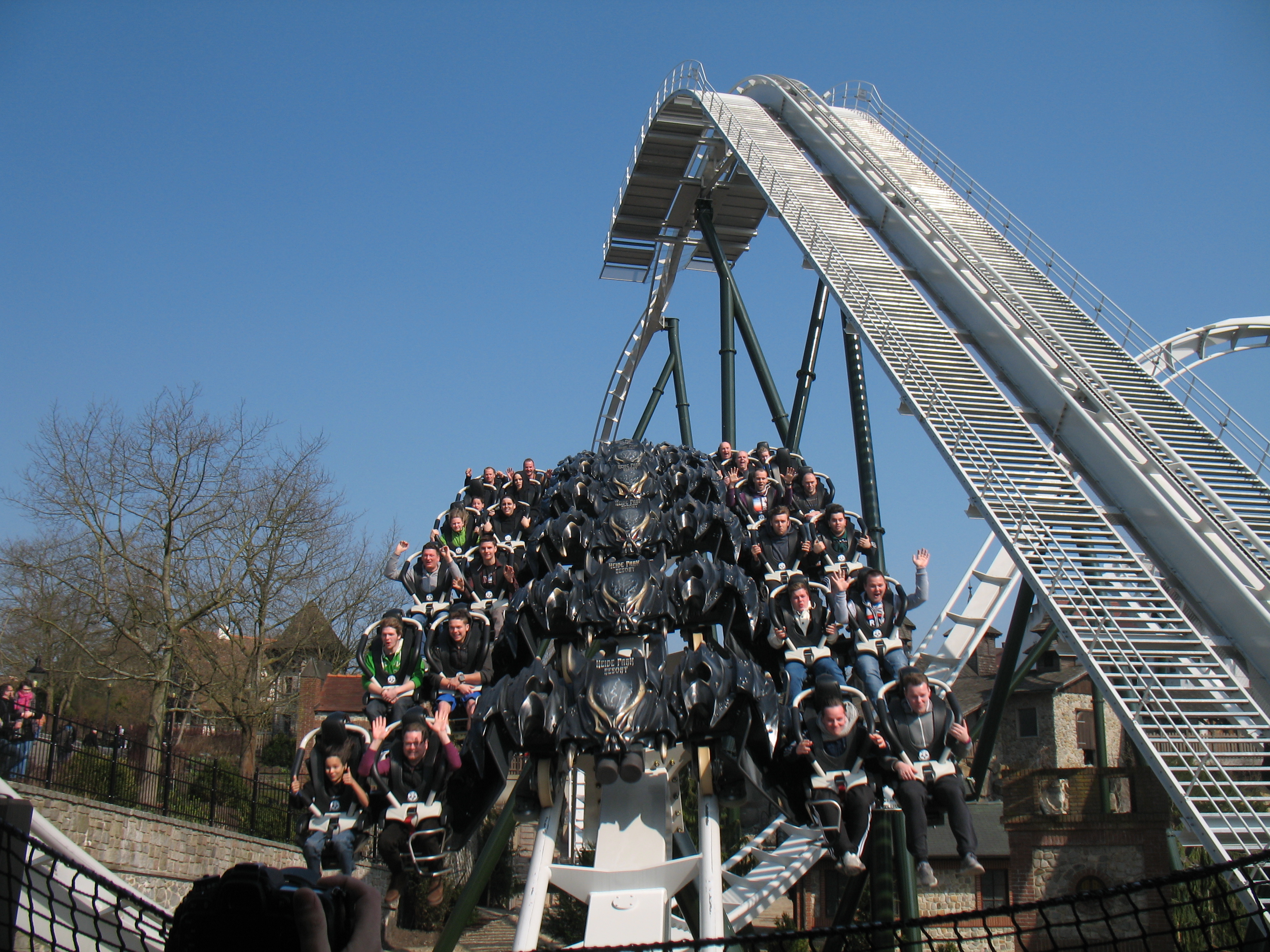 Wenn sich der Zug in Bewegung setzt und die Station verlassen hat geht es nach einer 90°-Rechtskurve gradewegs auf den Lift zu. Gewohnt sanft hängt sich der Zug in die Kette ein und wird in angemessenem Tempo den 40m hohen Lifthill hinaufgezogen. Je nachdem auf welcher Seite man sitzt hat man einen guten Überblick über einen Teil des Parks. Oben angekommen und wieder in der waagerechten geht es geradezu in die erste 180°-Linksdrehung, die einen kopfüber in den Dive-Drop übergibt. Gefühlt ist das Gefälle bei diesem Wing-Coaster vom Liftende bis zum Dive-Drop etwas steiler, so dass der Zug schneller in das Element startet, allerdings ist die Drehung aber auch erst wesentlich später im Dive-Drop zu enden. Bei "The Swarm" steht man praktisch schon vor der Abfahrt auf dem Kopf, hier erst etwas mehr als 90°. Dann geht es aber unaufhaltsam abwärts der Schlucht am Boden entgegen. Hier scheint man noch nicht fertig zu sein, denn die Rinne zeigt sich noch im unverkleideten Betongrau. Ein wenig alt aussehender Putz wie an den Stationswänden, modellierte Felssteine, solche Holzpflöcke aus dem Boden oder von der Seite wie bei der Shopunterdurchfahrt oder auf alt gemachtes Holz (siehe Brücke) würden an der Stelle schon meine Ansprüche erfüllen. Aber das ist noch ohne Probleme nachrüstbar. Angeblich liebäugelt man auch mit der Anschaffung einer großen Nebelmaschine, die den Kanal in dichten Nebel taucht. Die über dem Kanal gebaute Brücke, die wirklich klasse auf alt, verwittert und brüchig getrimmt wurde, vermittelt (besonders in der ersten Reihe) tatsächlich das Gefühl, dass es im Kopfbereich eng werden könnte. Ein gelungenes erstes Near-Miss-Element. Im Tal bei dort ca. 100km/h Geschwindigkeit merkt man das erste Mal eine leichte Vibration der Sitze, die aber nicht stört oder unangenehm ist und aufgrund der Geschwindigkeit und weiten Auslage der Sitze auch verzeihlich. Mit vollem Schwung geht es auf den anschließenden