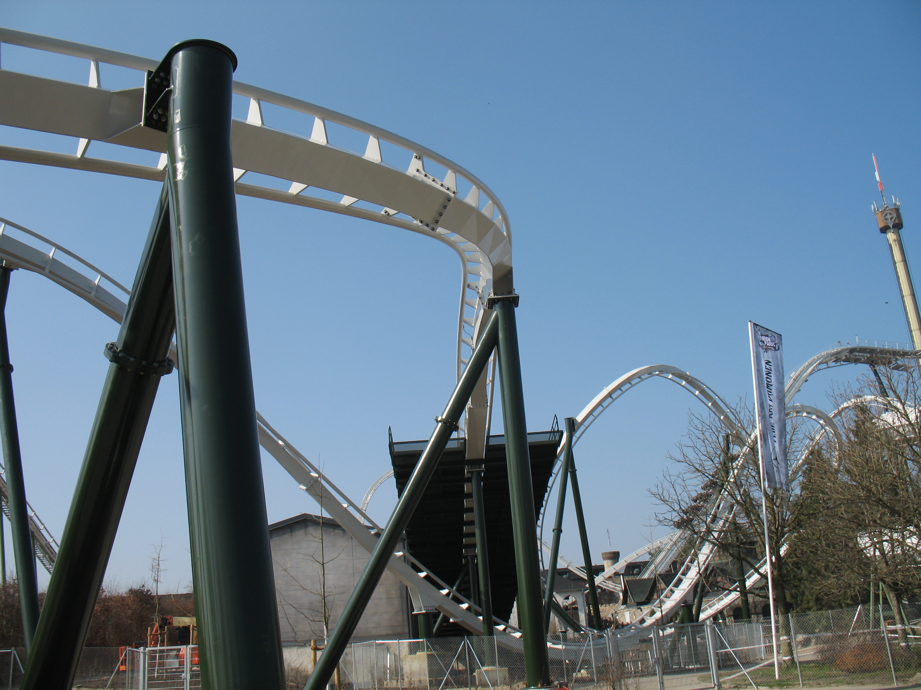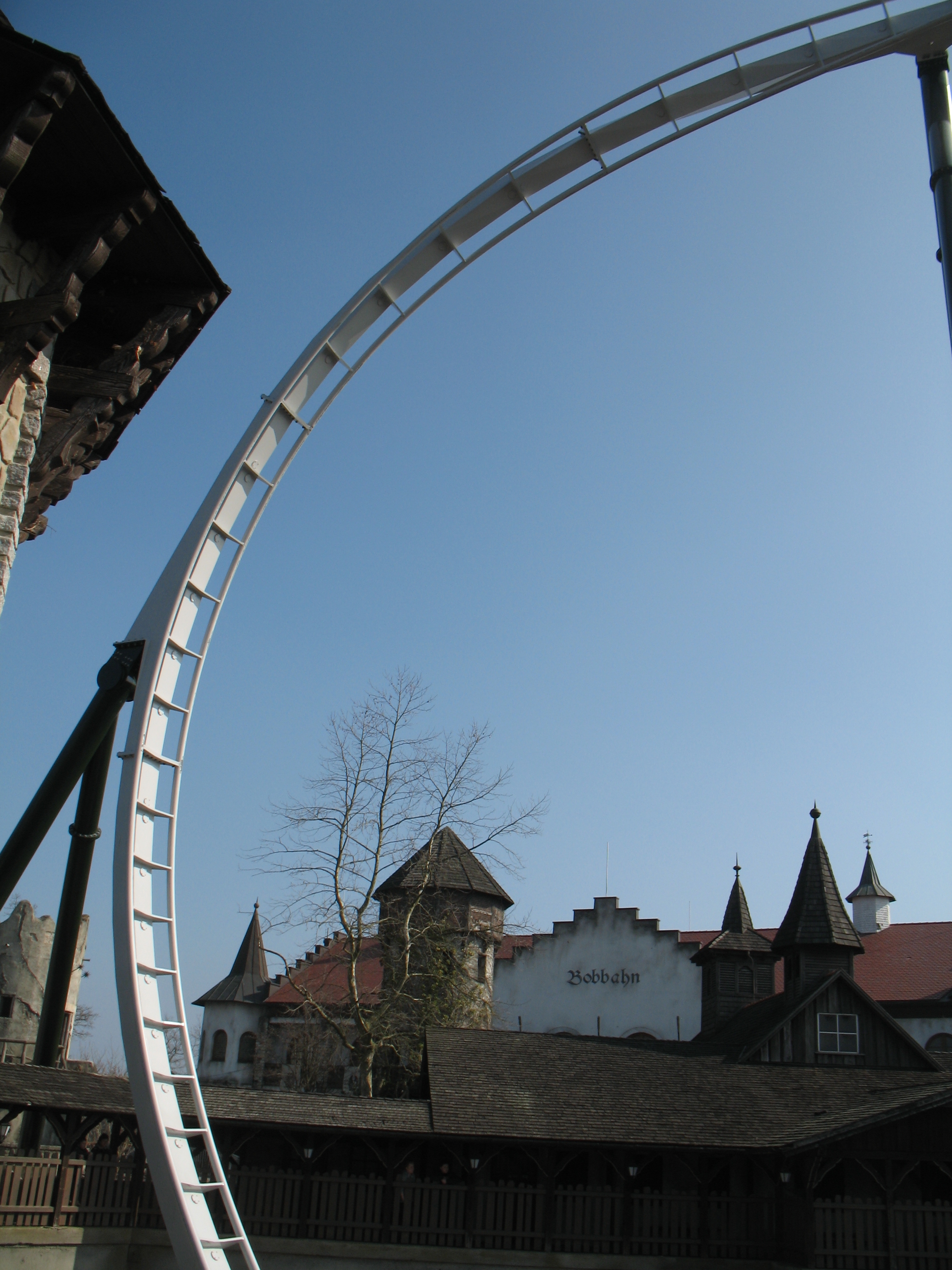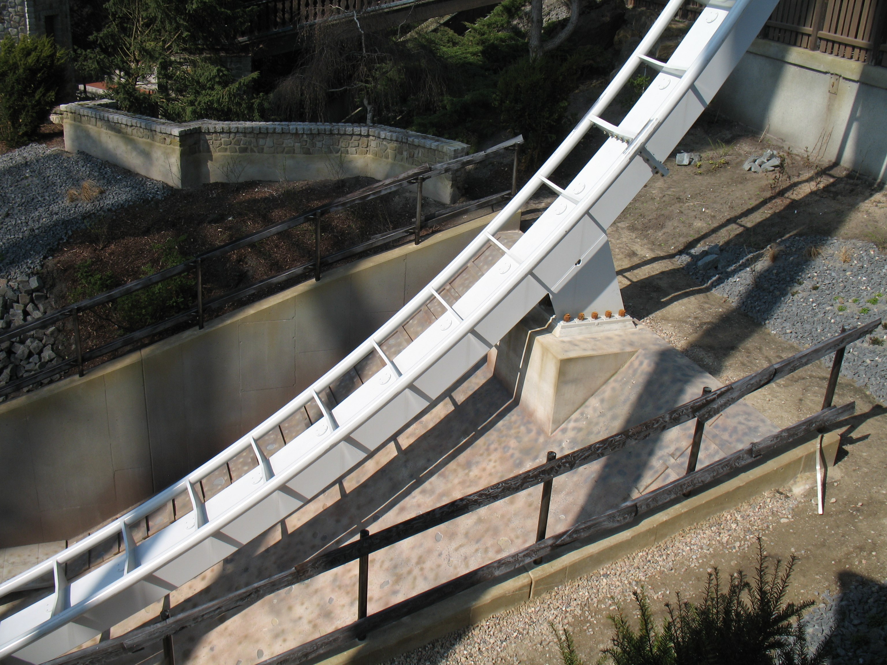 Corkscrew, welcher sehr geschmeidig durchfahren wird, sowohl optisch von außen als auch vom Fahrgefühl wenn man im Zug sitzt. Nur etwas mehr Geschwindigkeit hätte auch hier nicht geschadet, da wieder Ansätze von Hangtime zu spüren waren. Jetzt kommt etwas Zeit zum Verschnaufen, denn es geht in die "Panoramakurve", die in einer Linksdrehung an der Wand der Bobbahnstation entlangführt. Was von außen relativ eng aussieht, bekommt man eigentlich nur vorne links mit. Von daher auch kein wirklich für alle geltendes Near-Miss-Element. Jetzt geht es in eine relativ hohe und parallel zur ehemaligen letzten Abfahrt der Wildwasserbahn angelegten Abfahrt, deren Tal kurz vor dem ersten Wartebereich angeordnet ist. Auch hier hat der Zug wieder eine gute Geschwindigkeit drauf, was wieder durch leichte Vibrationen angezeigt wird. Kaum unten angekommen geht es wieder aufwärts in die erste Hälfte des Bretzel-Elements. Der Zug dreht sich nach links und den obersten Punkt des Elements durchfährt man kopfüber. Weitergedreht geht es dann wieder mit den Füßen zur Erde gerichtet dem Boden entgegen, wobei man in umgekehrter Richtung fliegt, in der man das Element betreten hat. Im Tal des Bretzels befindet sich die schon bekannte bröckelnde Mauer auf beiden Seiten des Zugs. Sie umschließt den Zug nicht vollkommen, sondern ist seitlich und von unten angelegt. Würde ich aber als Near-Miss-Element gelten lassen. Hier kommt dann wieder eine Überraschung, allerdings eine negative. Im Tal erfährt der Zug neben den schon bekannten Vibrationen, die übrigends in den höher gelegenen und damit langsameren Passagen nicht auftreten, einen sehr merkbaren Doppelschlag, als wenn er aus irgendeinem Grund plötzlich angehoben und sofort wieder nach unten gezwungen wird. Ob es am Schienenübergang liegt kann ich nicht sagen, obwohl davon relativ viele nachgearbeitet wurden, wie man an der abgeschliffenen und mit grau übergestrichenen Farbe erkennt. Nach dem Tal geht es in einer weiteren Rechtskurve wieder nach oben, wo man zum fünften und letzten Mal auf den Kopf gestellt wird. Wie auch bei dem vorherigen Überschlag fehlt mir wieder die Geschwindigkeit. In der Richtung, in der man die Bretzel angefahren ist, geht es auch wieder hinaus. Ein letztes Tal, das unter der Schlußbremse hindurchführt, optisch aber genügend Platz bietet, folgt der steile Anstieg in den Overbanked-Turn, der in Form einer 270°-Linkskurve in die Schlußbremse mündet. Geschafft! Nach 772 Metern wird man sanft abgebremst, rollt an der Seite der Wartungshalle vorbei, die etwas funktionaler gestaltet und nicht so detailreich thematisiert ist wie die Station, und gelangt über das Verschiebegleis wieder in die Station. Diese verlässt man nach dem Öffnen der Bügel und dem Entgegennehmen der persönlichen abgelegten Sachen jeweils an der Stirnseite der Station durch die Ausgangstür. In beiden Fällen geht es über ein kleines Stück Weg, welcher durch einen hohen Holzzaun von der Anfangskurve der Bahn abgetrennt ist zu einer Treppe, die zum höher gelegenen Ausgangsshop führt. Die rechte Seite teilt sich die etwas breitere Treppe mit den dort entgegenkommenden Express-Butler und Single-Rider Fahrern, die an der Seite des Shopgebäudes über einen Balkon zur Station gelangen. Der Balkon ist mit einem Netz in Richtung des