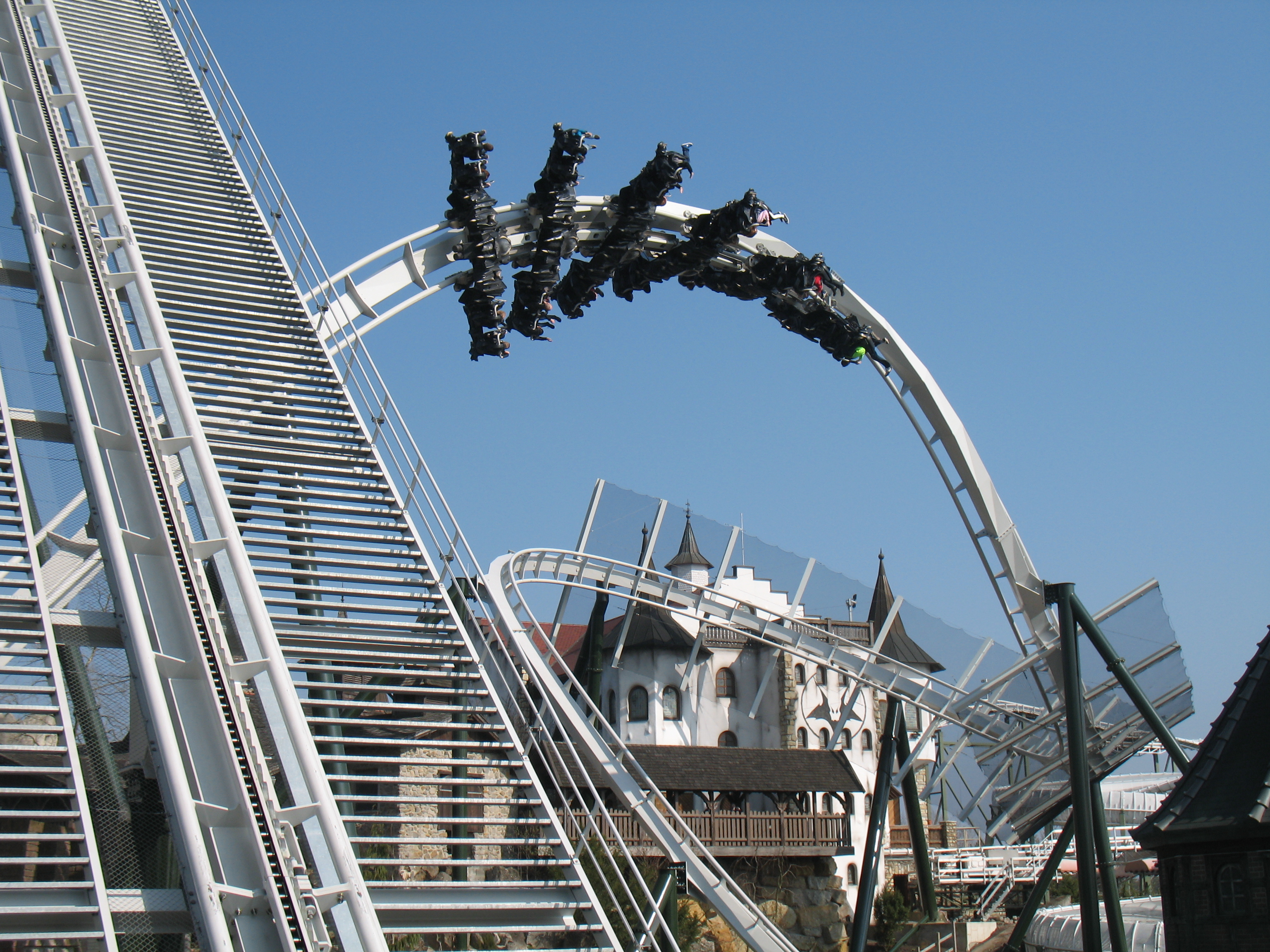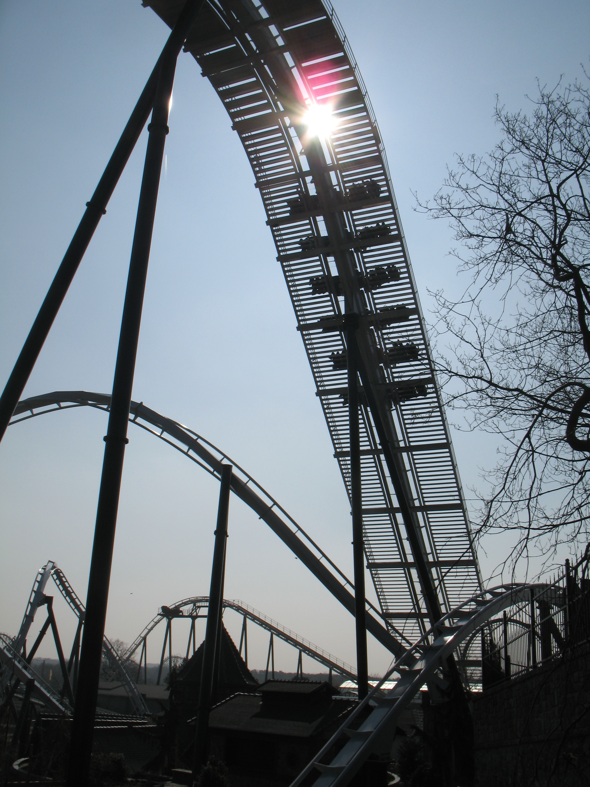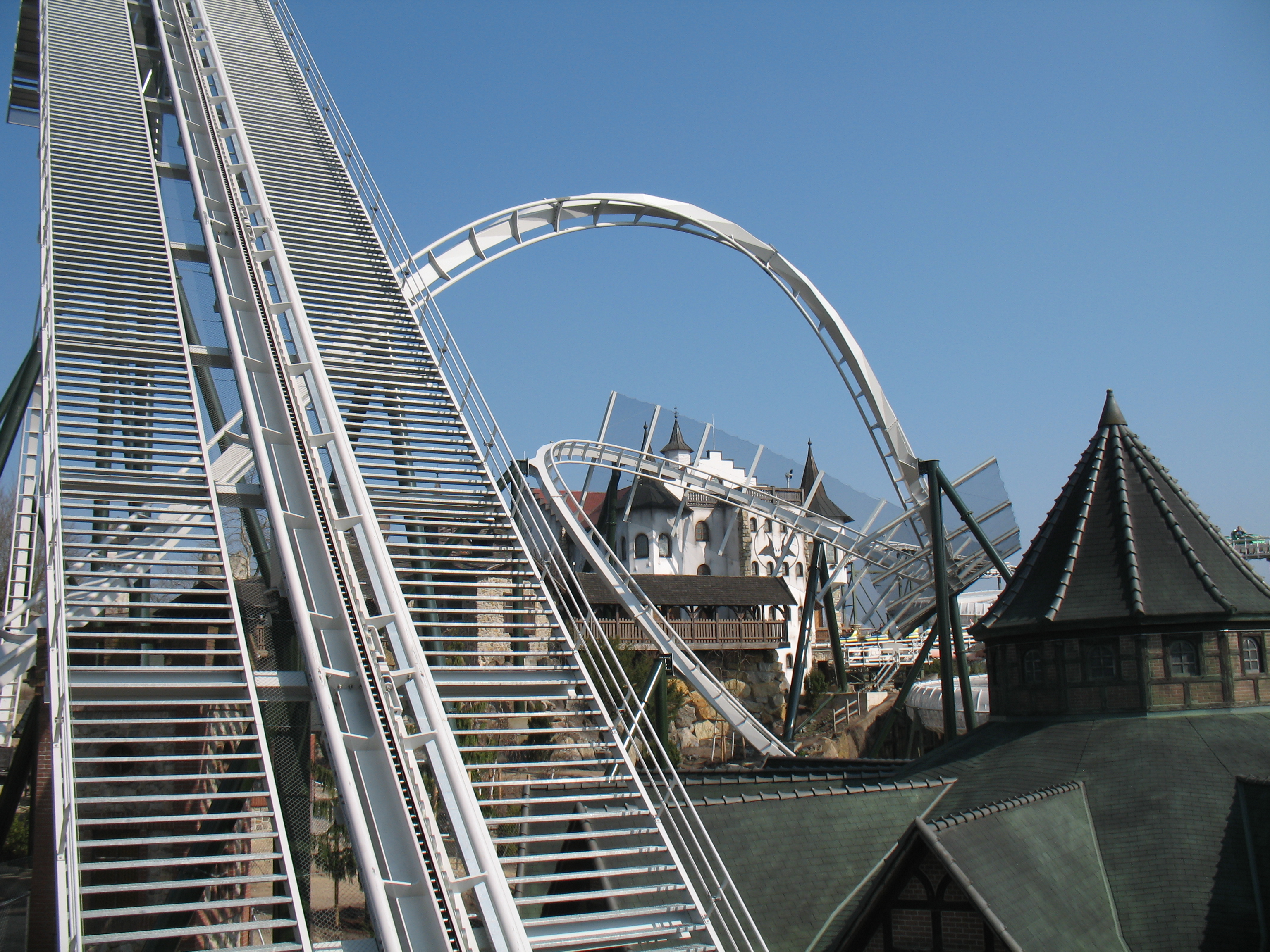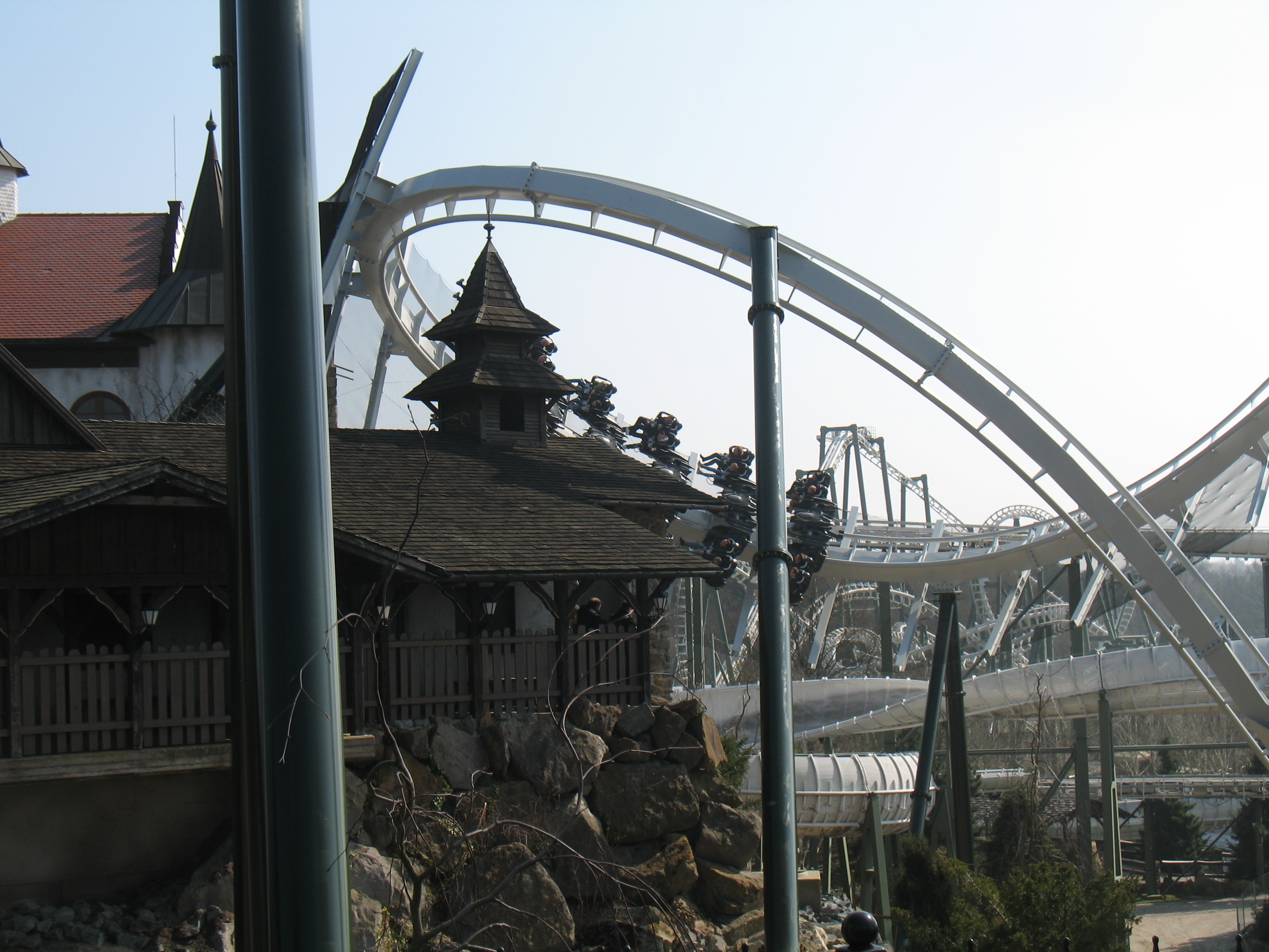 Corkscrew, welcher sehr geschmeidig durchfahren wird, sowohl optisch von außen als auch vom Fahrgefühl wenn man im Zug sitzt. Nur etwas mehr Geschwindigkeit hätte auch hier nicht geschadet, da wieder Ansätze von Hangtime zu spüren waren. Jetzt kommt etwas Zeit zum Verschnaufen, denn es geht in die "Panoramakurve", die in einer Linksdrehung an der Wand der Bobbahnstation entlangführt. Was von außen relativ eng aussieht, bekommt man eigentlich nur vorne links mit. Von daher auch kein wirklich für alle geltendes Near-Miss-Element. Jetzt geht es in eine relativ hohe und parallel zur ehemaligen letzten Abfahrt der Wildwasserbahn angelegten Abfahrt, deren Tal kurz vor dem ersten Wartebereich angeordnet ist. Auch hier hat der Zug wieder eine gute Geschwindigkeit drauf, was wieder durch leichte Vibrationen angezeigt wird. Kaum unten angekommen geht es wieder aufwärts in die erste Hälfte des Bretzel-Elements. Der Zug dreht sich nach links und den obersten Punkt des Elements durchfährt man kopfüber. Weitergedreht geht es dann wieder mit den Füßen zur Erde gerichtet dem Boden entgegen, wobei man in umgekehrter Richtung fliegt, in der man das Element betreten hat. Im Tal des Bretzels befindet sich die schon bekannte bröckelnde Mauer auf beiden Seiten des Zugs. Sie umschließt den Zug nicht vollkommen, sondern ist seitlich und von unten angelegt. Würde ich aber als Near-Miss-Element gelten lassen. Hier kommt dann wieder eine Überraschung, allerdings eine negative. Im Tal erfährt der Zug neben den schon bekannten Vibrationen, die übrigends in den höher gelegenen und damit langsameren Passagen nicht auftreten, einen sehr merkbaren Doppelschlag, als wenn er aus irgendeinem Grund plötzlich angehoben und sofort wieder nach unten gezwungen wird. Ob es am Schienenübergang liegt kann ich nicht sagen, obwohl davon relativ viele nachgearbeitet wurden, wie man an der abgeschliffenen und mit grau übergestrichenen Farbe erkennt. Nach dem Tal geht es in einer weiteren Rechtskurve wieder nach oben, wo man zum fünften und letzten Mal auf den Kopf gestellt wird. Wie auch bei dem vorherigen Überschlag fehlt mir wieder die Geschwindigkeit. In der Richtung, in der man die Bretzel angefahren ist, geht es auch wieder hinaus. Ein letztes Tal, das unter der Schlußbremse hindurchführt, optisch aber genügend Platz bietet, folgt der steile Anstieg in den Overbanked-Turn, der in Form einer 270°-Linkskurve in die Schlußbremse mündet. Geschafft! Nach 772 Metern wird man sanft abgebremst, rollt an der Seite der Wartungshalle vorbei, die etwas funktionaler gestaltet und nicht so detailreich thematisiert ist wie die Station, und gelangt über das Verschiebegleis wieder in die Station. Diese verlässt man nach dem Öffnen der Bügel und dem Entgegennehmen der persönlichen abgelegten Sachen jeweils an der Stirnseite der Station durch die Ausgangstür. In beiden Fällen geht es über ein kleines Stück Weg, welcher durch einen hohen Holzzaun von der Anfangskurve der Bahn abgetrennt ist zu einer Treppe, die zum höher gelegenen Ausgangsshop führt. Die rechte Seite teilt sich die etwas breitere Treppe mit den dort entgegenkommenden Express-Butler und Single-Rider Fahrern, die an der Seite des Shopgebäudes über einen Balkon zur Station gelangen. Der Balkon ist mit einem Netz in Richtung des