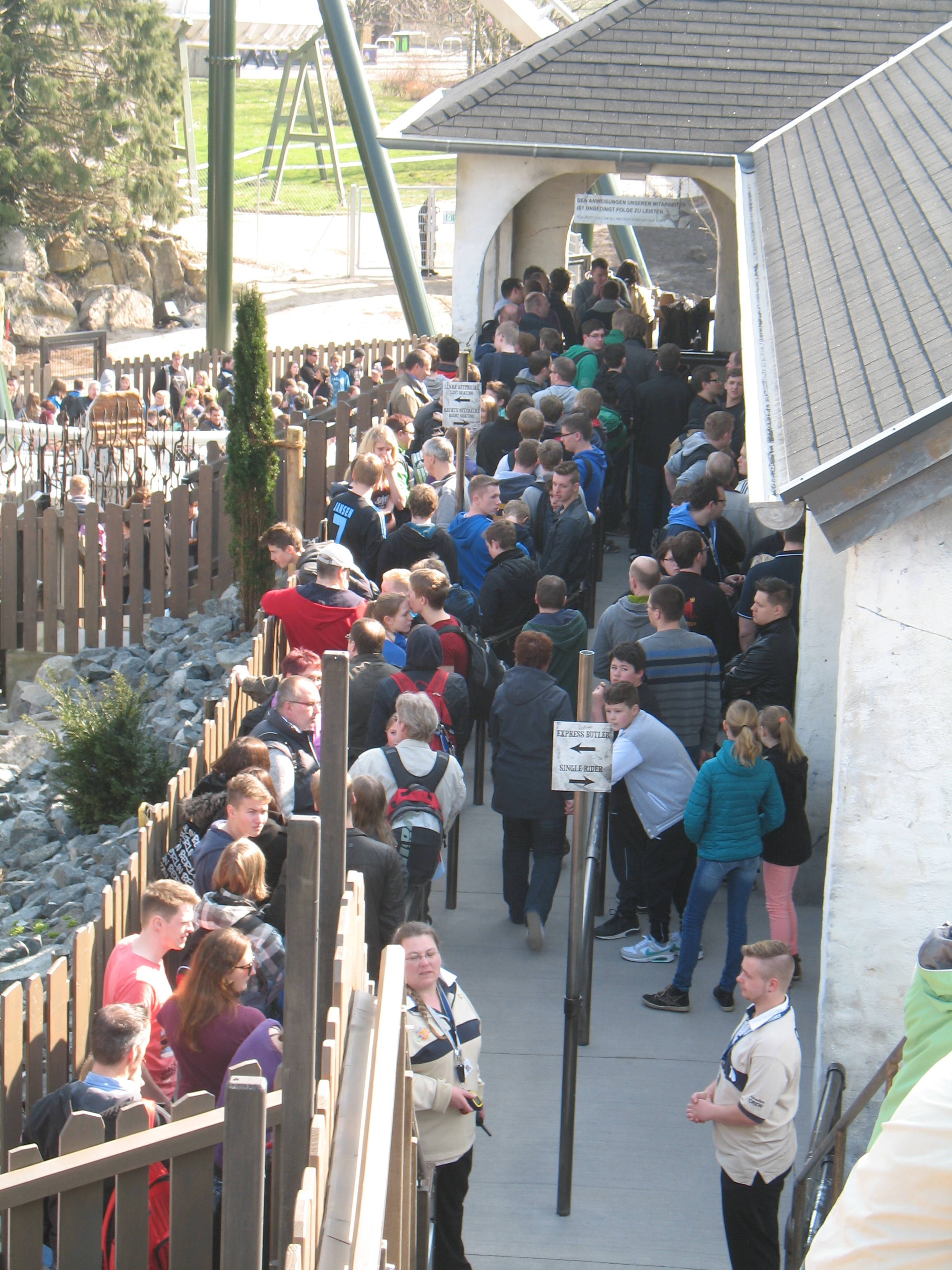 Wenn man das dritte Feld verlässt führt ein Weg zwischen der Station und dem Wildwasserbahnrondell in Richtung Verwaltung den Berg hinauf. Am Ende des Wegs ist man auf Höhe der Station angekommen und macht eine 180°-Kurve nach links. Jetzt trifft man auf den Warteschlangenzugang für die Express-Butler und Single-Rider. Parallel geht es entlang der Stationsseite Richtung Stationseingang. Die normale Warteschlange teilt sich nach der Kurve auf in die linke und rechte Zugseite, welche man frei wählen kann. Der Express-Butler und Single-Rider Zugang wird auch in jeweils eine Warteschlange getrennt, so dass vier Anstehreihen parallel Verlaufen. Am Ende der Schlangen steht ein Mitarbeiter, der aus den beiden normalen Warteschlangen jeweils 12 Personen auf jede Seite der Station lässt. Sollten Express-Butler Besitzer anstehen, so werden diese zuerst genommen und aus der normalen Warteschlange aufgefüllt. Sollte eine ungerade Anzahl Personen vorhanden sein, so werden der oder die Plätze mit den Single-Ridern aufgefüllt. Leider führt das Konzept dazu, dass man sich seine Sitzreihe nicht aussuchen kann. Ich persönlich finde es nicht so gut, da ich lieber die Wahl habe, aber das ist persönlicher Geschmack. Eine separate Ansehmöglichkeit für die erste Reihe wäre aber auf jeden Fall sinnvoll gewesen, da diese am beliebtesten ist.
