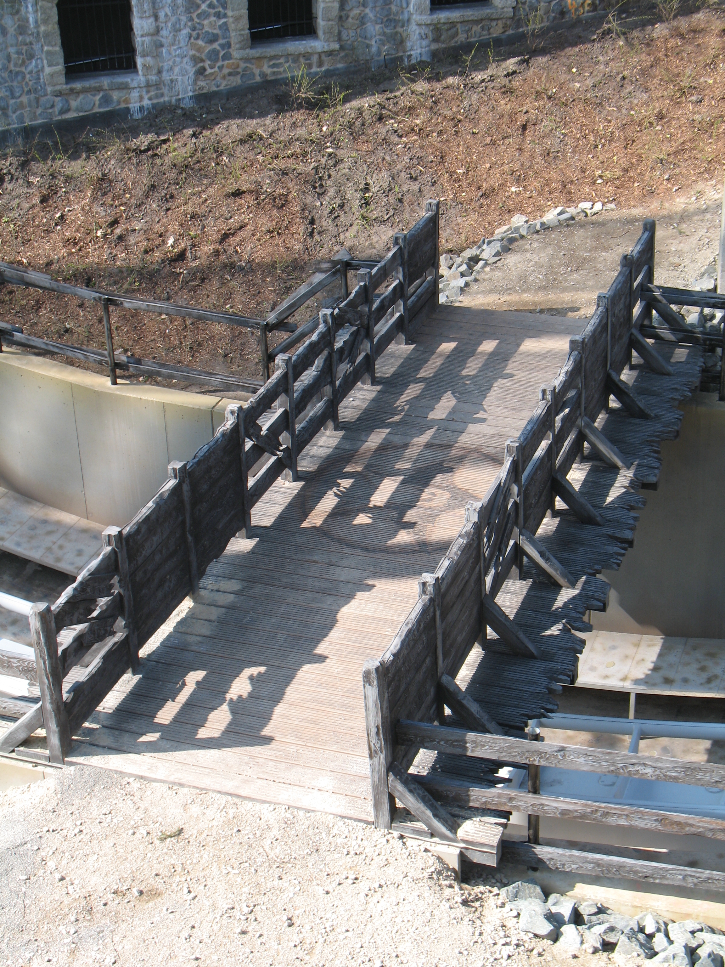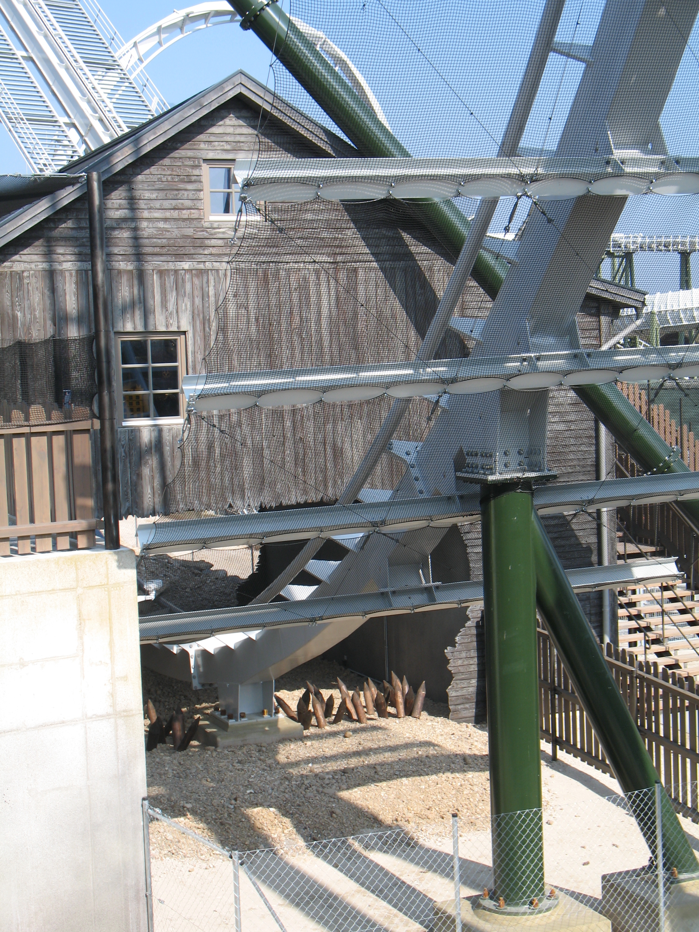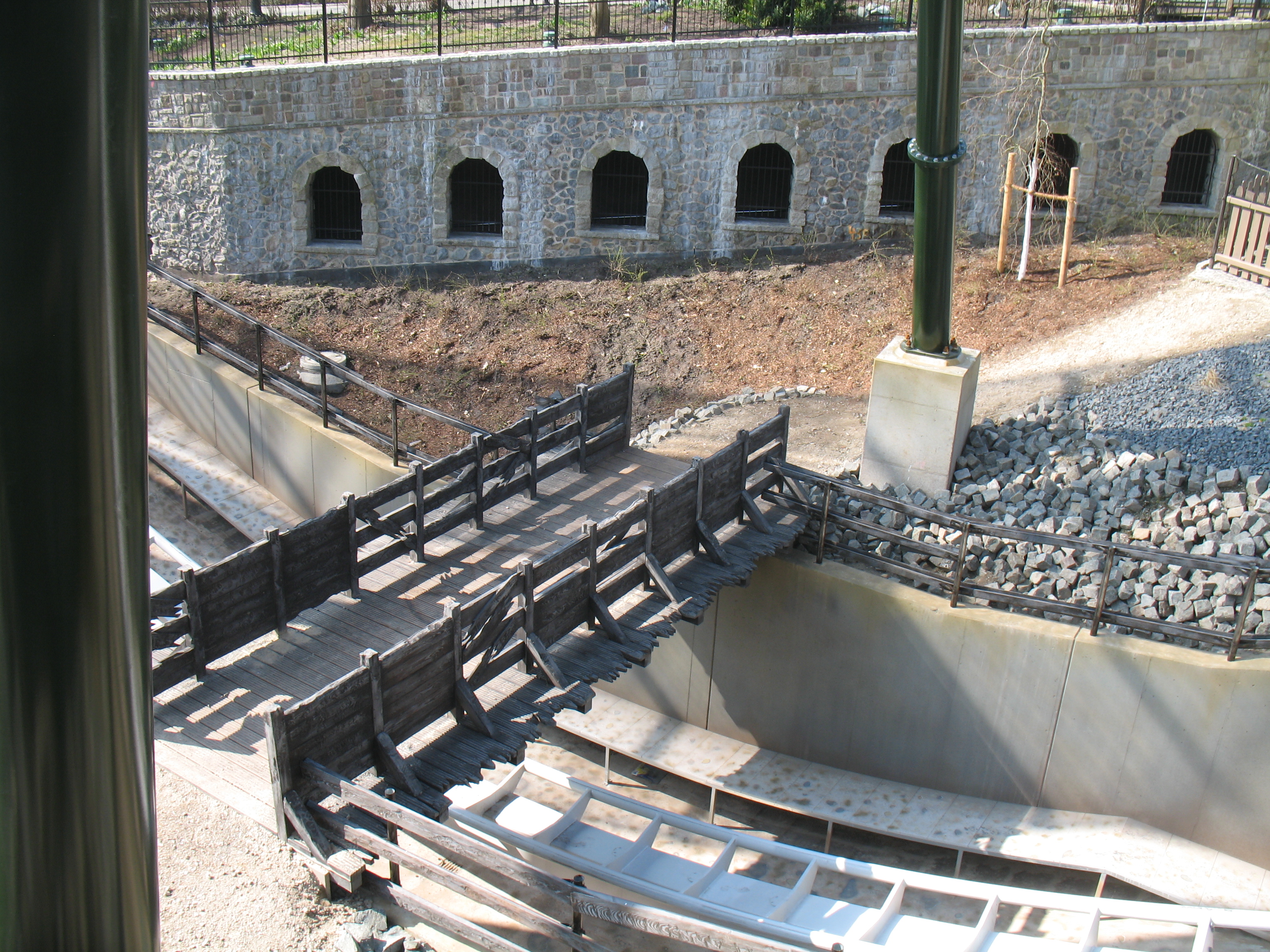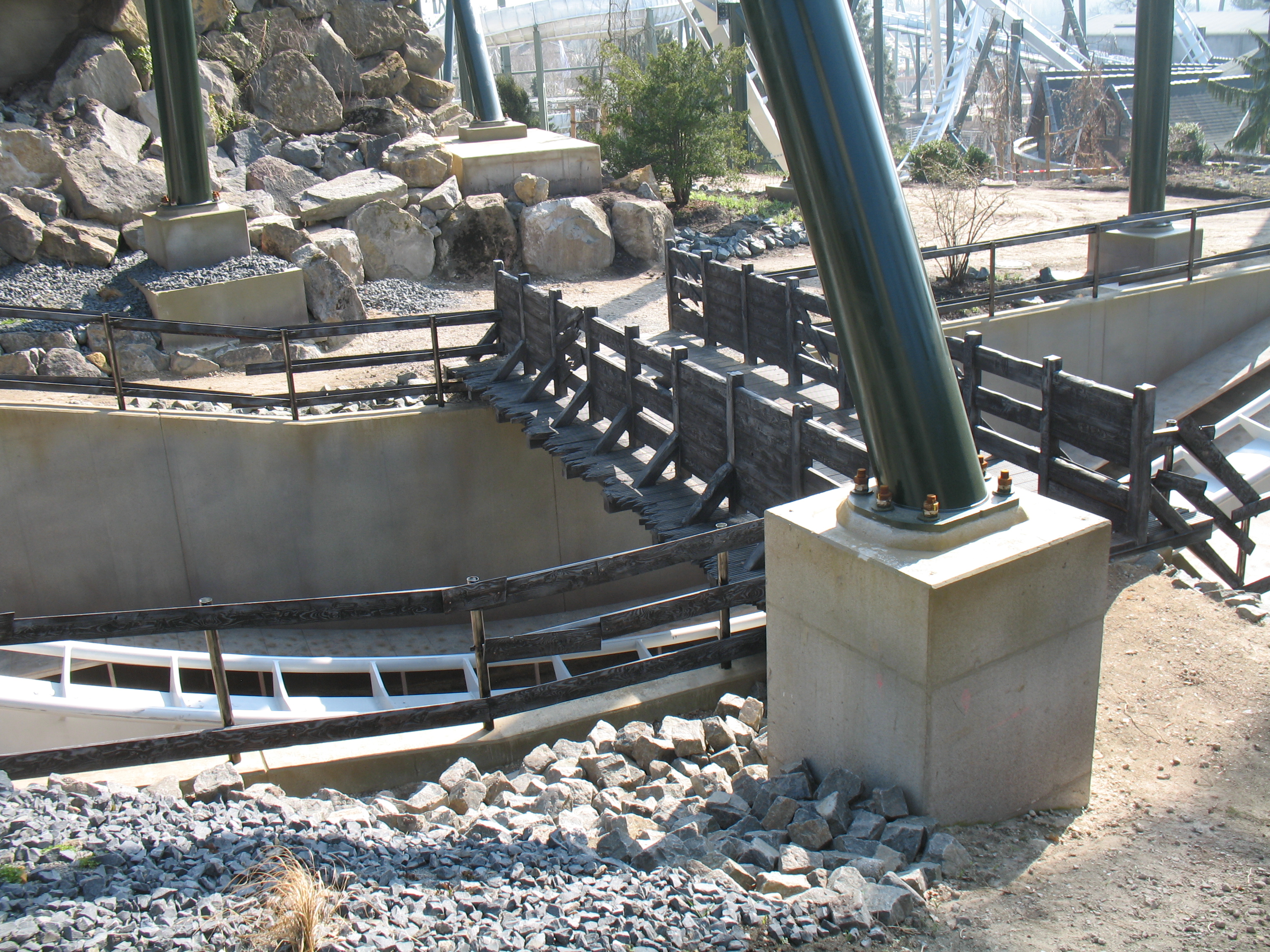 Lichtraumprofil mit Holz verkleidet. Hier hat man eigentlich auf allen Plätzen einen guten Near-Miss-Effekt, welcher der zweite ist. In der Ausfahrt wurden am Boden noch Steine aufgeschüttet, aus denen viele angespitzte Holzpflöcke in Richtung der Füße der Mitfahrer ragen. Netter Einfall, der aber leider nur der ersten Reihe wirklich auffällt, da man dahinter im Vorwege keine Sicht darauf hat und es bei der hohen Geschwindigkeit kaum wahrnimmt. Das wäre aber bei jeder Bahn so, da kann man dem Park keinen Vorwurf machen. Unter der Station befinden sich auch die Onride-Kameras, die Bilder von den Fahrgästen machen, welche im darüber liegenden Shop erworben werden können. Über die Qualität kann ich nichts sagen, da die Anlage am Eröffnungstag nicht betriebsbereit war. Leider wurden auch die linke und rechte Wand sowie die Decke unter dem Shop im Rohzustand gelassen genau wie die linke Stützwand nach der Shopdurchfahrt. Aber auch das kann ja noch nachgebessert werden.