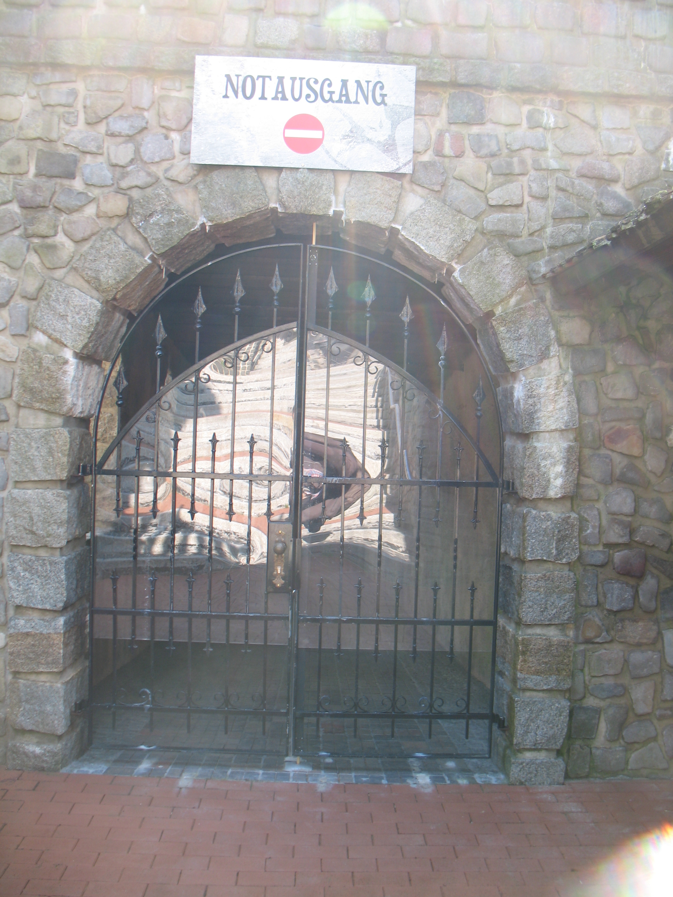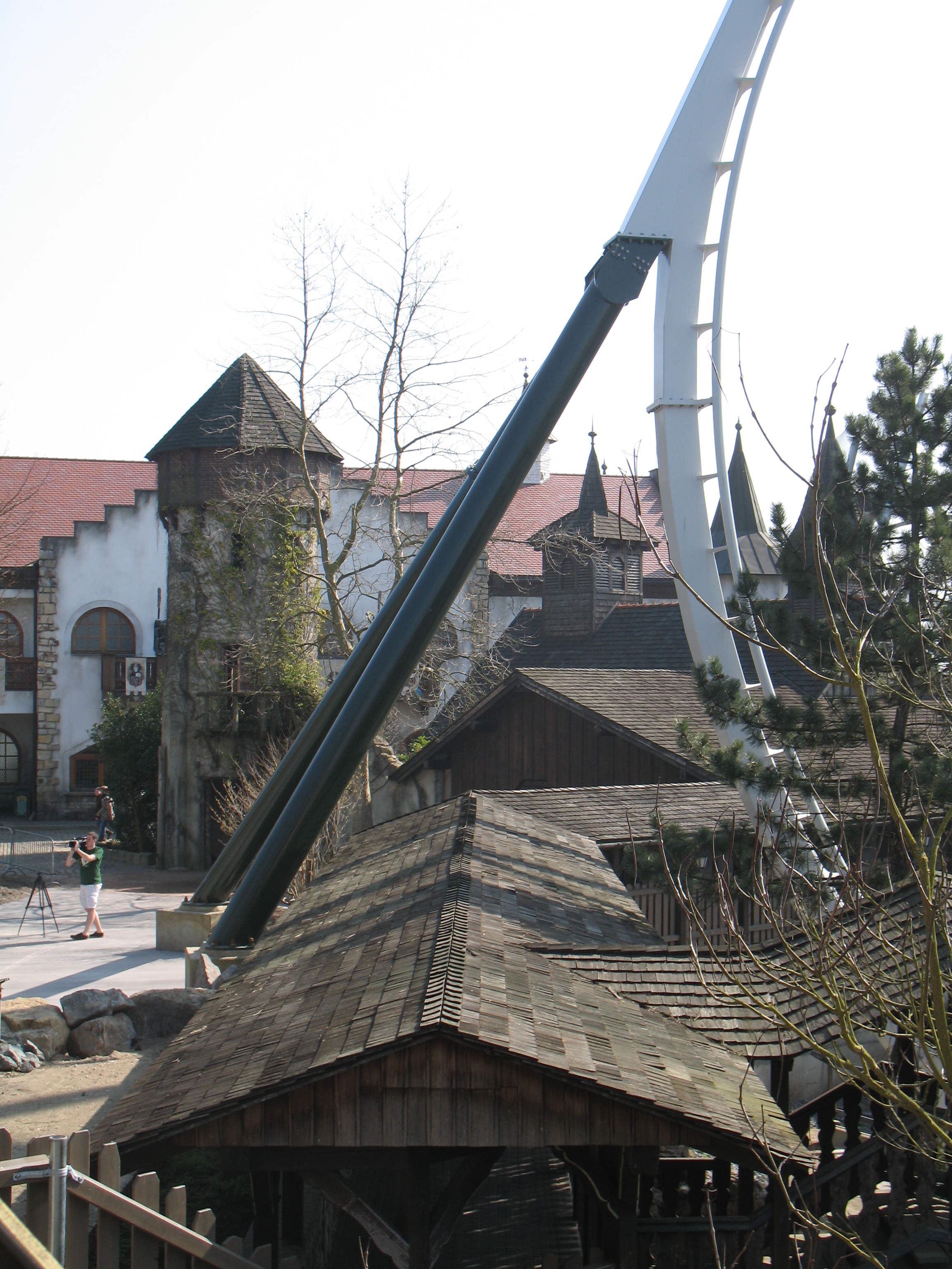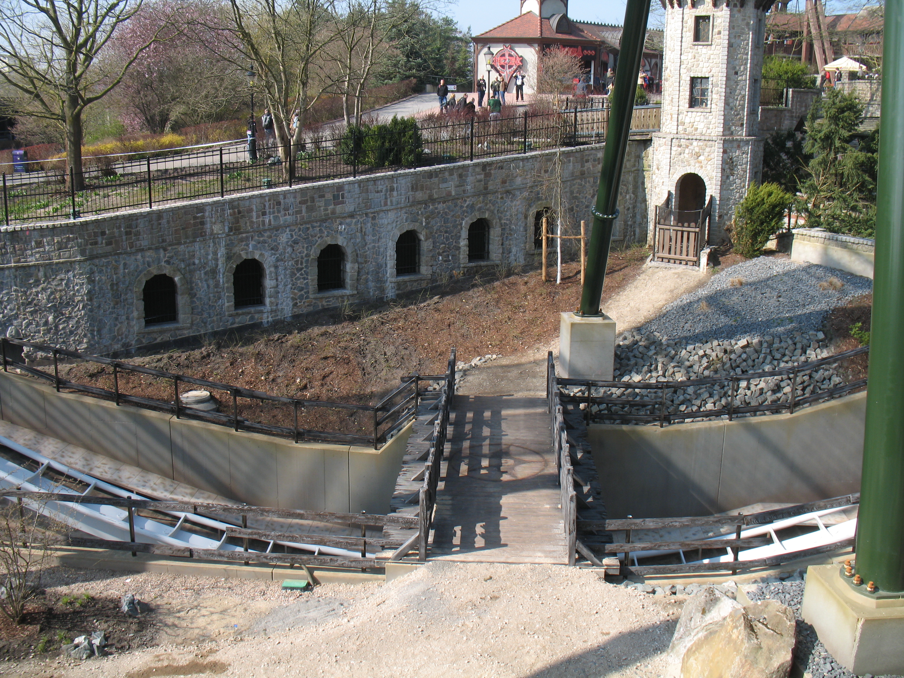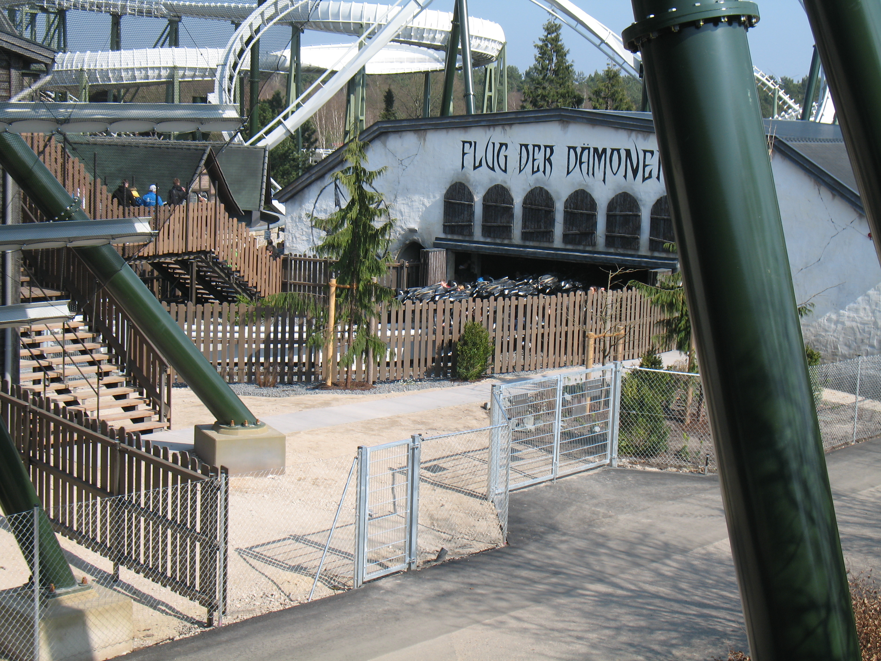 Am Ende des Gangs geht es dann links ab wieder an die frische Luft durch einen neu geschaffenen Mauerdurchbruch. Der ehemalige Weg in das Rondell wurde mir einer Bretterwand geschlossen. Auf einer leicht abfallenden neu angelegten Rampe geht es "beschützt" durch einen linksseitigen personenhohen Holzzaun an der Außenwand des Rondells entlang. Durch die Fenster des Rondells kann man in dessen Innere schauen. Die ehemals auf einer Holzempore umlaufende Warteschlange der Wildwasserbahn wurde bis auf einige noch an den Deckenträgern aufgehängte Balken entfernt. Auch alle Bretter der Einstiegsdrehscheibe sind verschwunden, so dass man deren Metallunterbau einsehen kann. Der Kanal der Wildwasserbahn ist noch vorhanden. Ein etwas wehmütiger Anblick, den man durch abgehängte Fenster vermeiden könnte. Eine Baustelle schaut sich niemand gerne an, gerade wenn dort Erinnerungen an eine tolle Attraktion dran hängen. Die Rampe macht dann eine 180°-Wende und führt weiter abfallend zurück. Jetzt hat man einen tollen Blick auf die Panoramakurve, die sich an die Station der Bobbahn anschmiegt, welche übrigens noch immer außen ein weißes Erscheinungsbild trägt, während innen schon letztes Jahr die Ritterrüstungen und Folterwerkzeuge passend zum Transsilvanien-Thema Einzug gehalten haben. Man hat allerdings in der Winterpause auf die zum Coaster zeigende Seite ein großes schwarzes Bahnlogo aufgemalt. Neben dem Blick auf die Bahn kann man jetzt auch die erste von drei Flächen sehen, die mit einer einfachen Zick-Zack-Warteschlange belegt ist. Die Geländer sind die bekannten Edelstahlrohrkonstruktionen, wie man sie auch bei Colossos, Desert-Race oder der Krake findet. Hier hat man sich aber die Mühe gemacht die silber-glänzende Oberfläche anzumalen, was sehr lobenswert ist und zumindest ein wenig von der modernen Optik, die nicht zur laut Geschichte darzustellenden alten Dorfatmosphäre passt, zu eliminieren. Leider muss man feststellen, dass die Farbe stellenweise am ersten Eröffnungstag schon wieder Auflösungserscheinungen zeigt und abgekratzt ist, so dass das silberne Metall wieder zu sehen ist. Nach ein paar Pre-Opening-Tagen sollte das eigentlich nicht der Fall sein. Bleibt zu hoffen, dass hier noch mal nach anderer Farbe oder besseren Lösungen gesucht wird, sonst dürfte davon am Ende der Saison nicht mehr viel übrig sein. Auch spannt sich über den Bereich wieder komplett ein Sicherheitsnetz. Zwei Seiten sind mit einer auf alt getrimmten Mauer eingefasst, die sehr gut aussieht.