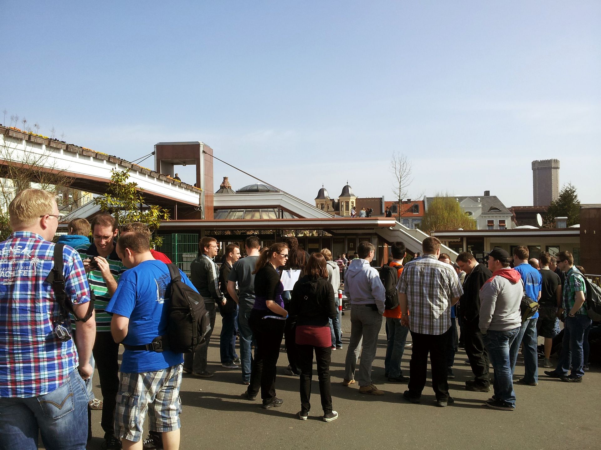 Nachdem wir vollzählig waren und die Namensschilder verteilt waren, überquerten wir die Straße, um uns anzumelden. Dazu waren vor dem Eingang verschiedene Tische aufgestellt, an denen sich die entsprechenden Gruppierungen melden sollten. Es staute sich aber ziemlich, sodass wir nicht direkt zu unserem Tisch vorkamen - abgesehen von ein paar Schlauköpfen, die sich vorne an der Meute vorbeigeschoben hatten. Irgendwas mussten wir noch unterschreiben (hat das eigentlich jemand gelesen, nicht dass demnächst ne neue Waschmaschine geliefert wird