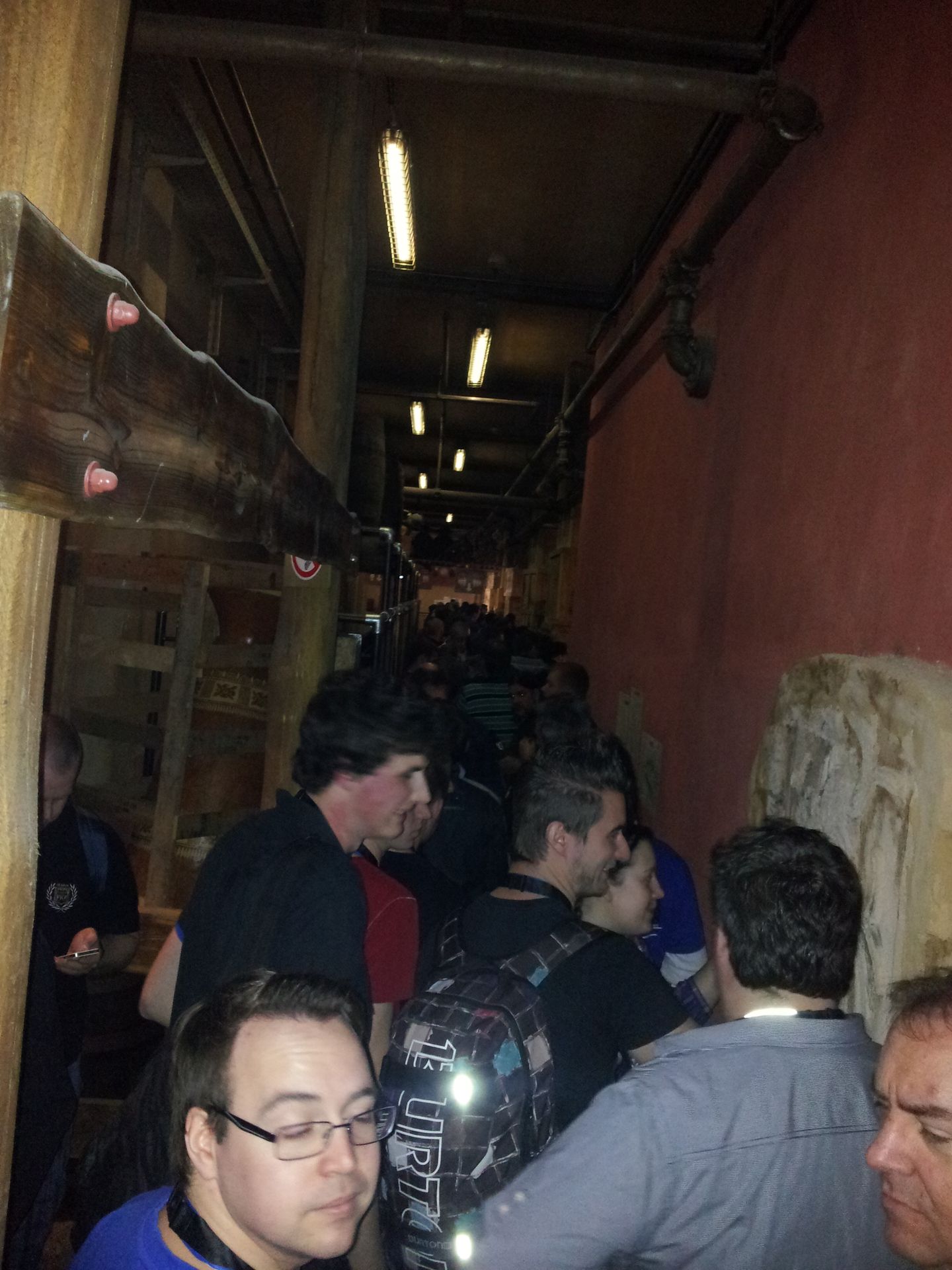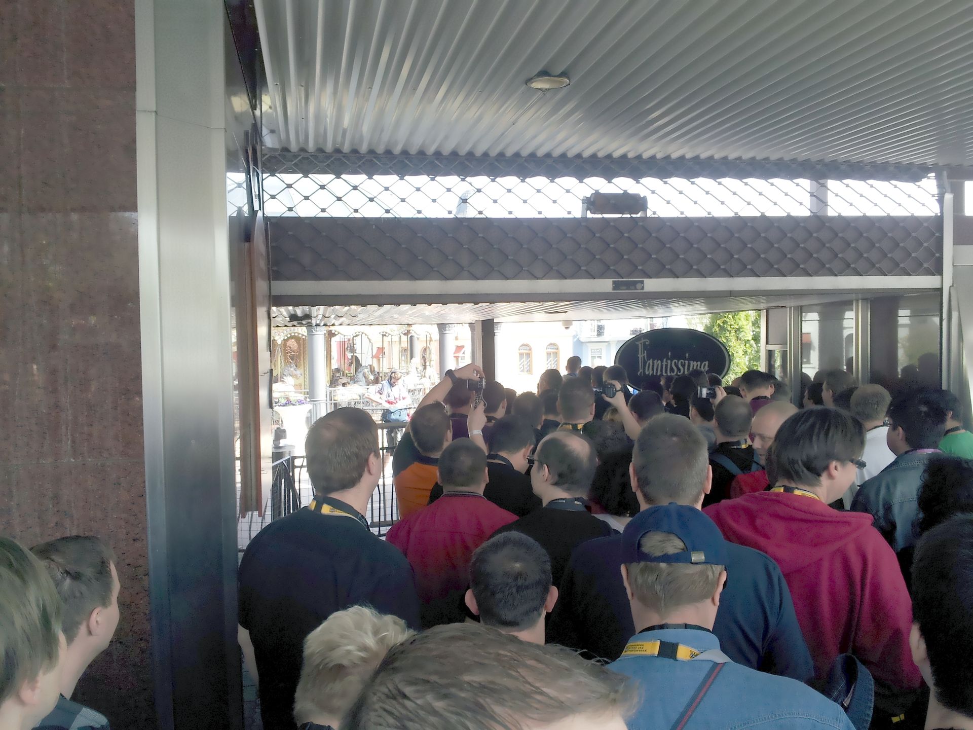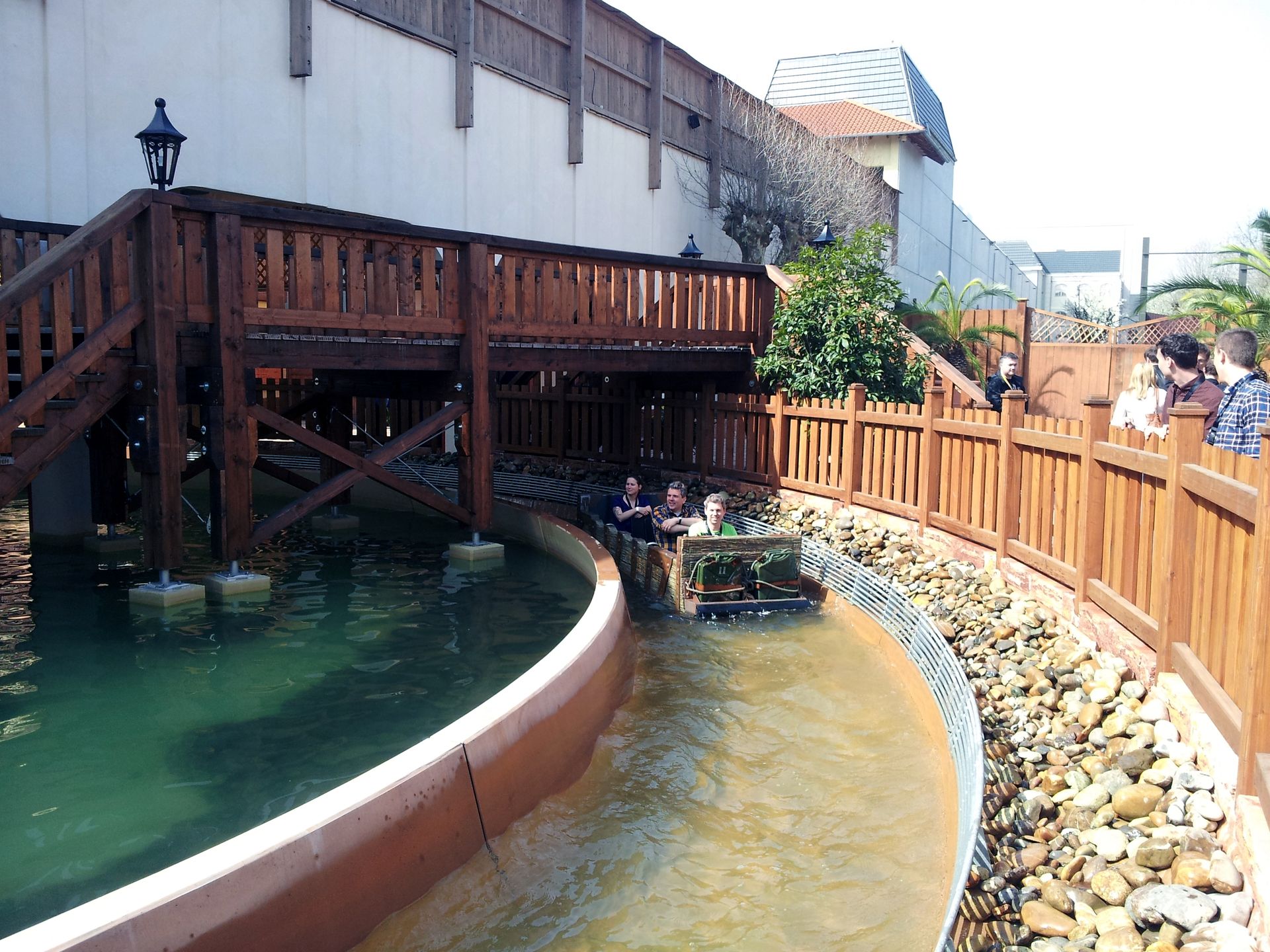 Es gab nur ein Problem: Seit mehreren Minuten stand ein Boot oben am letzten Drop. Es schien eine technische Störung zu geben. Wir versuchten trotzdem unser Glück, doch in der Station angekommen wurden wir gleich durch den Notausgang wieder rausgeschickt. Unterdessen hatte man offenbar begonnen, die auf der Strecke verteilten Boote zu evakuieren. Außerdem war der Wartebereich nun geschlossen worden. Offizielles Ende der Veranstaltung war um 16:00 Uhr. Da es bereits viertel vor war, machten sich viele bereits auf den Heimweg, glaubten sie wohl nicht an eine nochmalige Öffnung der Bahn.